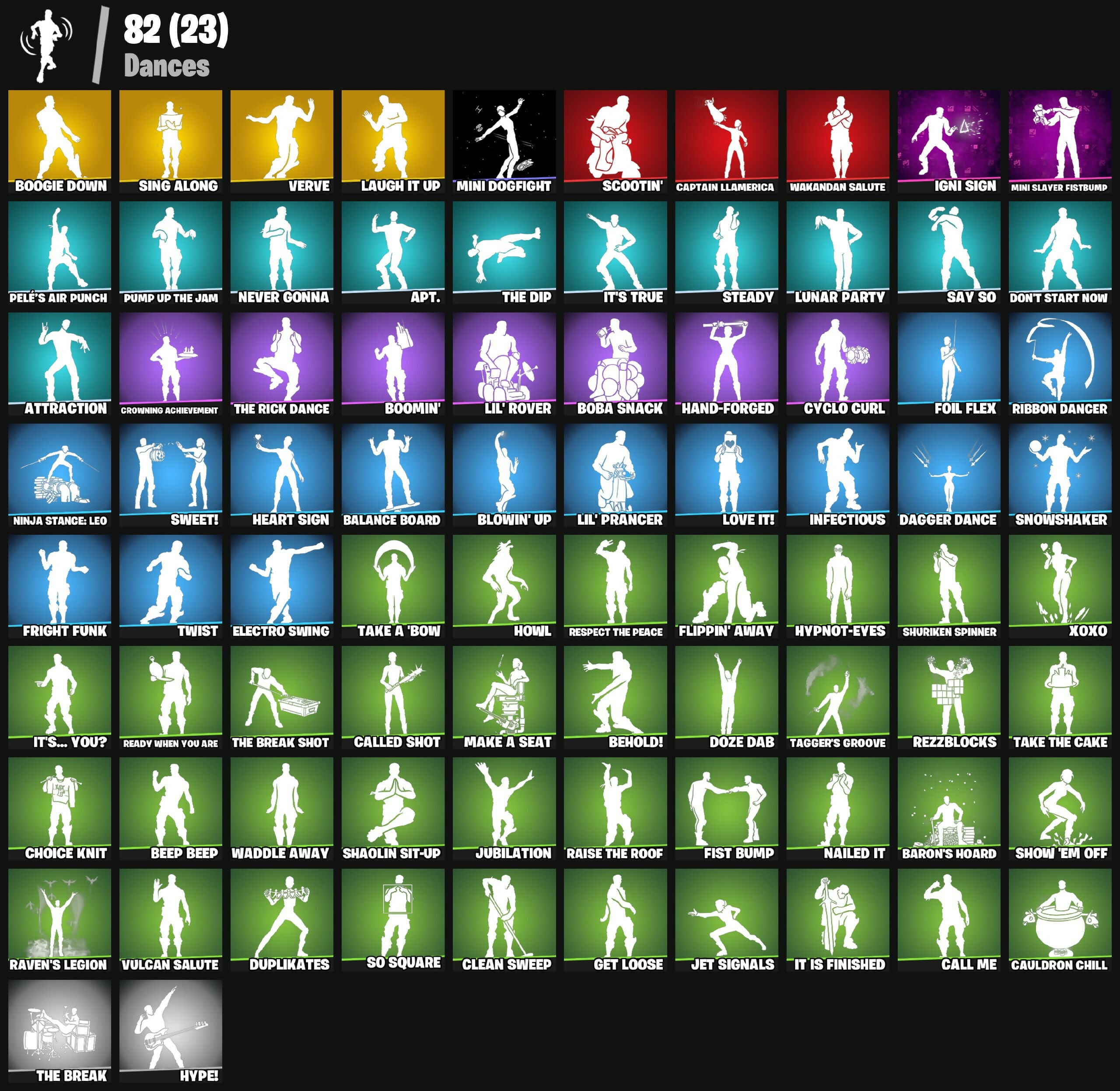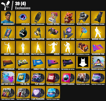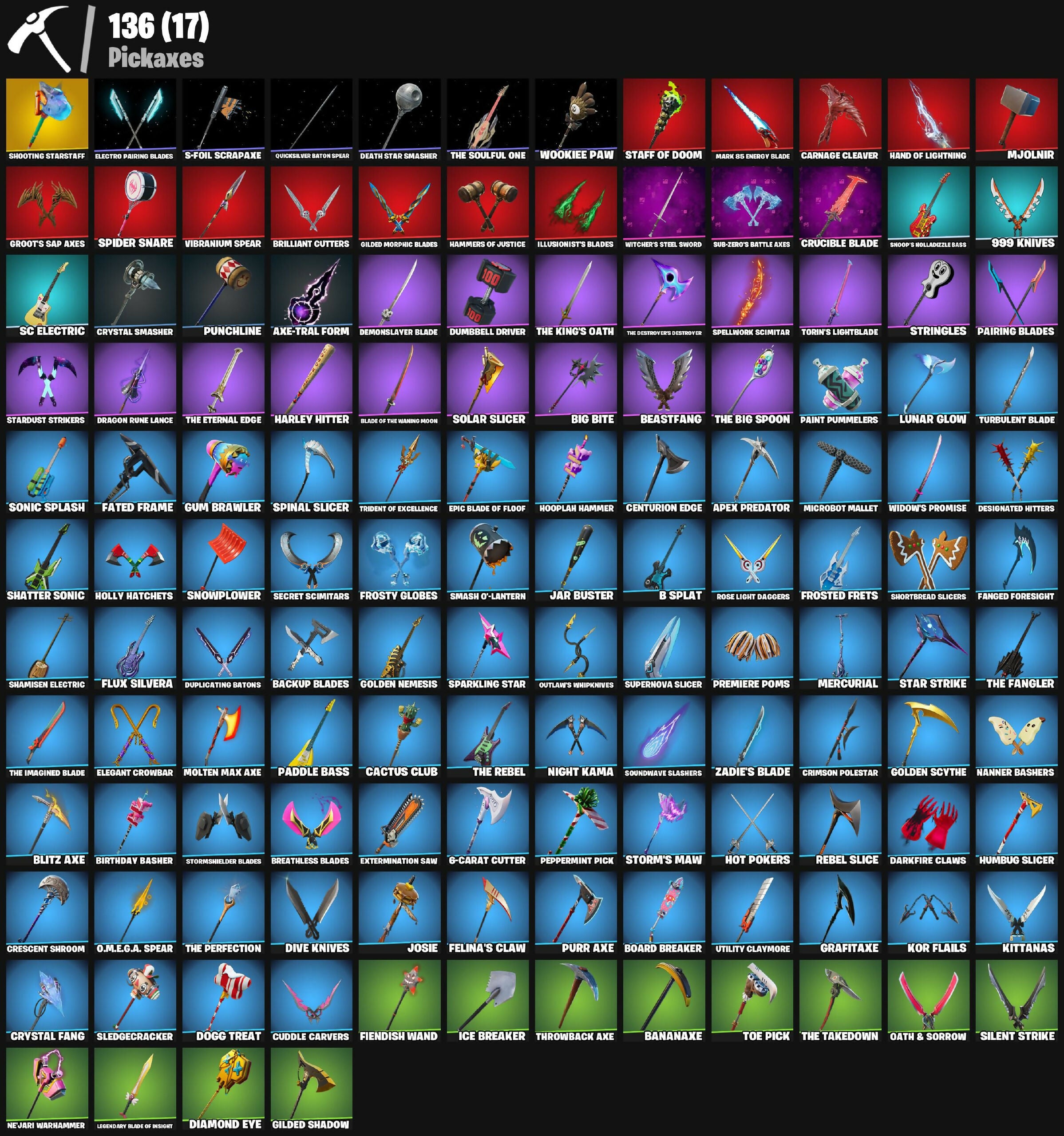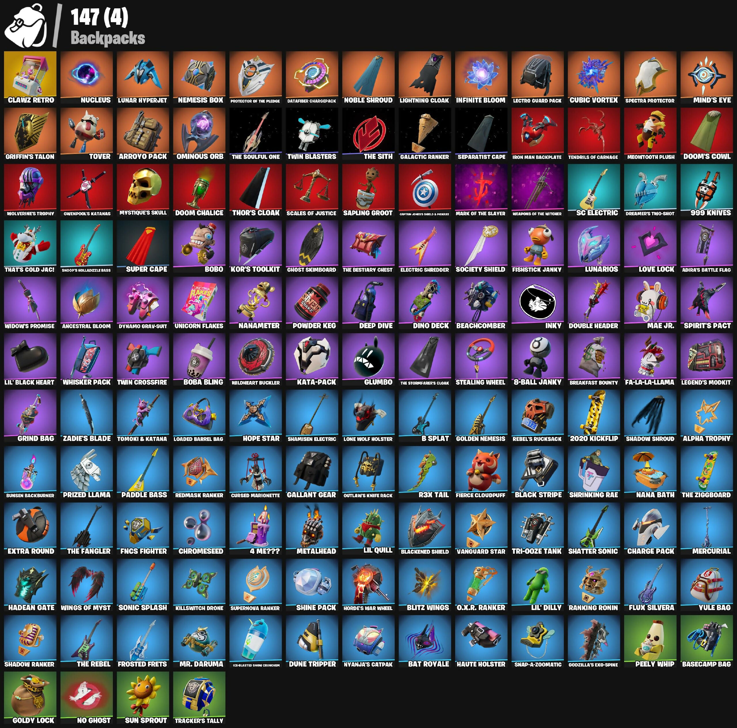 'Arroyo Pack, 2020 Kickflip, 4 Me???, 6-Carat Cutter, 8-Ball Janky, 999 Knives, Adira, Adira's Battle Flag, Afterparty, Alpha Trophy, Ancestral Bloom, Apex Predator, Apt., Arctic Adeline, Astroworld Cyclone, Athleisure Assassin, Attraction, Aura, Axe-Tral Form, B Splat, Backup Blades, Balance Board, Bananaxe, Baron's Hoard, Basecamp Bag, Bat Royale, Batman, Beachcomber, Beastfang, Beep Beep, Behold!, Big Bite, Birthday Basher, Black Stripe, Blackened Shield, Blade of the Waning Moon, Blitz Axe, Blitz Wings, Blowin' Up, Board Breaker, Boba Bling, Boba Snack, Bobo, Boogie Down, Boomin', Boxy, Breakaway, Breakfast Bounty, Breathless Blades, Brilliant Cutters, Bunsen Backburner, Cactus Club, Call Me, Called Shot, Captain Jones's Shield & Pickaxe, Captain Llamerica, Carnage, Carnage Cleaver, Cauldron Chill, Centurion, Centurion Edge, Chapter 3 Island Theme, Chapter 4 Island Theme, Chapter 5 Island Theme, Charge Pack, Charlotte, Choice Knit, Chromeseed, Clawz Retro, Clean Sweep, Collision Course, Crescent Shroom, Crimson Elite, Crimson Polestar, Crowning Achievement, Crucible Blade, Crystal Fang, Crystal Smasher, Cubic Vortex, Cuddle Carvers, Cursed Marionette, Cyclo Curl, Dagger Dance, Darkfire Claws, Datafiber Chargepack, Death Star Smasher, Deep Dive, Demonslayer Blade, Desert Dominator, Designated Hitters, Diamond Diva, Diamond Eye, Dino Deck, Dive Knives, Dizzie, Doctor Doom, Dogg Treat, Don't Start Now, Doom Chalice, Doom Slayer, Doom's Cowl, Double Header, Doze Dab, Dragon Rune Lance, Dreamer's Two-Shot, Dumbbell Driver, Dune Tripper, Dupli-Kate, Duplicating Batons, Duplikates, Dusk Knight, Dusty, Dynamo Grav-Suit, Electric Shredder, Electro Pairing Blades, Electro Swing, Elegant Crowbar, Epic Blade of Floof, Evie, Extermination Saw, Extra Round, FNCS Fighter, Fa-La-La-Llama, Fabio Sparklemane, Fanged Foresight, Fate, Fated Frame, Felina, Felina's Claw, Fiendish Wand, Fierce Cloudpuff, Fishstick Janky, Fist Bump, Flip Reset, Flippin' Away, Flux Silvera, Foil Flex, Fright Funk, Frosted Frets, Frosty Globes, Fryangles, Galactic Ranker, Galaxy Scout, Gallant Gear, Geralt Of Rivia, Get Loose, Ghost Skimboard, Gilded Morphic Blades, Gilded Shadow, Glumbo, Godzilla's Exo-Spine, Golden Nemesis, Golden Scythe, Goldy Lock, Grafitaxe, Griffin's Talon, Grimey, Grind Bag, Groot, Groot's Sap Axes, Gum Brawler, Gumbo, Gwenpool's Katanas, Hadean Gate, Hammers of Justice, Hand of Lightning, Hand-Forged, Harley Hitter, Harley Quinn, Haute Holster, Heart Sign, Helsie, Holly Hatchets, Hooplah Hammer, Hop And A Wink, Hope Star, Horde's War Wheel, Hot Pokers, Howl, Humbug Slicer, Hush, Hype!, Hypnot-Eyes, I Am Fearless, Ice Breaker, Ice-Blasted Snow Crunchiem, Igni Sign, Illusionist's Blades, Infectious, Infinite Bloom, Inky, Iron Man Backplate, It Is Finished, It's True, It's... You?, J.B. Chimpanski, Jar Buster, Jennifer Walters, Jet Signals, Josie, Jubilation, Kata-Pack, Killswitch Drone, Kittanas, Kondor, Kor, Kor Flails, Kor's Toolkit, Krisabelle, Laugh It Up, Lectro Guard Pack, Legend's Modkit, Legendary Blade of Insight, Lego Fortnite Theme, Lightning Cloak, Lil Quill, Lil' Black Heart, Lil' Dilly, Lil' Prancer, Lil' Rover, Loaded Barrel Bag, Lobby Classic, Lone Wolf Holster, Love It!, Love Lock, Lunar Glow, Lunar Hyperjet, Lunar Party, Lunarios, Mae Jr., Make A Seat, Malik, Mancake, Mandalorian, Mark 85 Energy Blade, Mark Of The Slayer, Massai, Mave, Meowtooth Plush, Mercurial, Metalhead, Microbot Mallet, Midsummer Midas, Mind's Eye, Mini Dogfight, Mini Slaver Fistbump, Mjolnir, Molten Max Axe, Mr. Daruma, Mystique, Mystique's Skull, Nailed It, Nana Bath, Nanameter, Nanner Bashers, Nejari Warhammer, Nemesis Box, Never Gonna, Nezumi, Night Kama, Ninja Stance: Leo, No Ghost, Noble Shroud, Nucleus, Nyanja's Catpak, O.M.E.G.A. Spear, O.X.R. Ranker, Oath & Sorrow, Ominous Orb, Outlaw's Knife Rack, Outlaw's Whipknives, Paddle Bass, Paint Pummels, Pairing Blades, Peely Whip, Pelé's Air Punch, Peppermint Pick, Per Aspera Ad Astra, Polar Peely, Powder Keg, Predator, Premiere Poms, Prized Llama, Protector Of The Pledge, Pump Up The Jam, Punchline, Purr Axe, Quicksilver Baton Spear, R3X Tail, Racer's Instincts, Rainbow Fog, Raise The Roof, Ranking Ronin, Raven's Legion, Razor, Ready When You Are, Rebel Slice, Rebel's Rucksack, Redmask Ranker, Reese, Respect The Peace, Reverberate, Rezzblocks, Ribbon Dancer, Rocket Racing Theme, Rose Light Daggers, S-Foil Scrapaxe, SC Electric, Sabina, Santa Dogg, Sapling Groot, Say So, Scales Of Justice, Scimitar, Scootin', Secret Scimitars, Selene, Separatist Cape, Shadow Ranker, Shadow Shroud, Shamisen Electric, Shaolin Sit-Up, Shatter Sonic, Shine Pack, Shooting Starstaff, Shore Leave, Shortbread Slicers, Show 'Em Off, Shrinking Rae, Shuriken Spinner, Silent Strike, Sing Along, Slayer Juice Wrld, Sled Ready Guff, Sledgecracker, Smash O'-Lantern, Snap, Snap-A-Zoomatic, Snoop's Holladazzle Bass, Snoop's Holladizzle Bass, Snowplower, Snowshaker, So Square, Society Shield, Solar Slicer, Sonic Splash, Soundwave Slashers, Sparkling Star, Spectra Protector, Spellwork Scimitar, Spider Snare, Spinal Slicer, Spirit's Pact, Staff of Doom, Star Strike, Stardust Strikers, Steady, Stealing Wheel, Storm, Storm's Maw, Stormfarer, Stormshielder Blades, Stringles, Sub-Zero's Battle Axes, Sun Sprout, Super Cape, Supernova Ranker, Supernova Slicer, Sweat-Free, Sweet!, Tagger's Groove, Take A 'Bow, Take The Cake, Tempest, Tendrils Of Carnage, That's Cold Jac!, The Ageless, The Bestiary Chest, The Big Spoon, The Brat, The Break, The Break Shot, The Cube Queen, The Destroyer's Destroyer, The Dip, The Eternal Edge, The Fangler, The Imagined Blade, The King's Oath, The Perfection, The Re-OG, The Rebel, The Rick Dance, The Sith, The Soulful One, The Stormjaker's Cloak, The Takedown, The Ziggboard, Thor, Thor's Cloak, Throwback Axe, Toe Pick, Tomoki & Katana, Tony Stark, Toona Fish, Torin, Torin's Lightblade, Tover, Tracker's Tally, Tri-ooze Tank, Trident of Excellence, Turbulent Blade, Twin Blaster