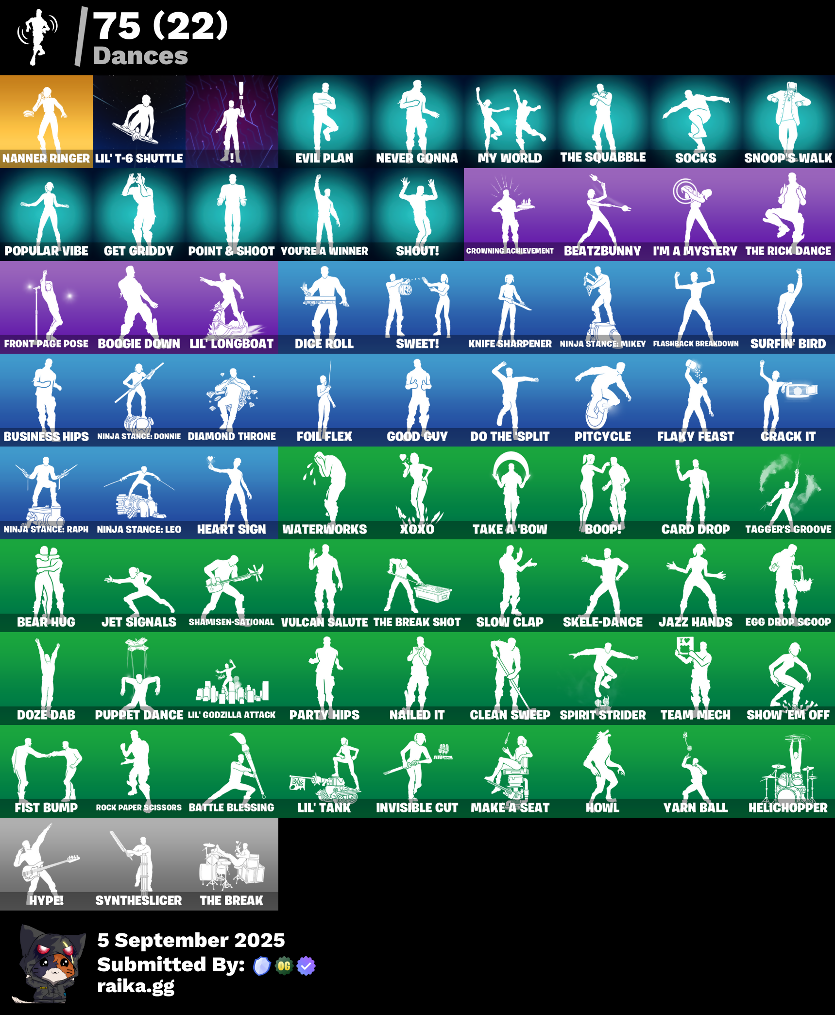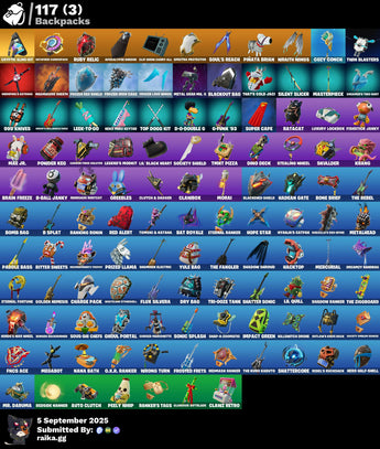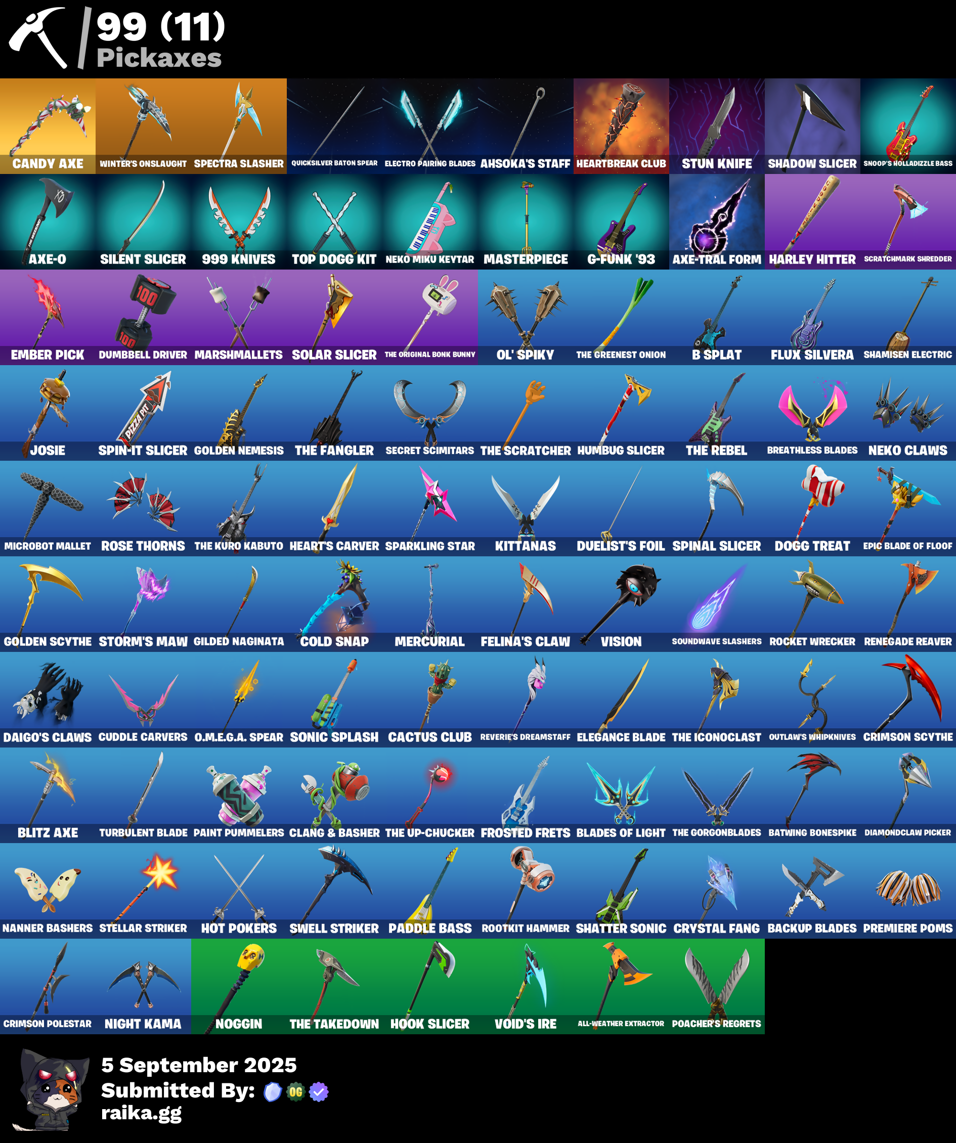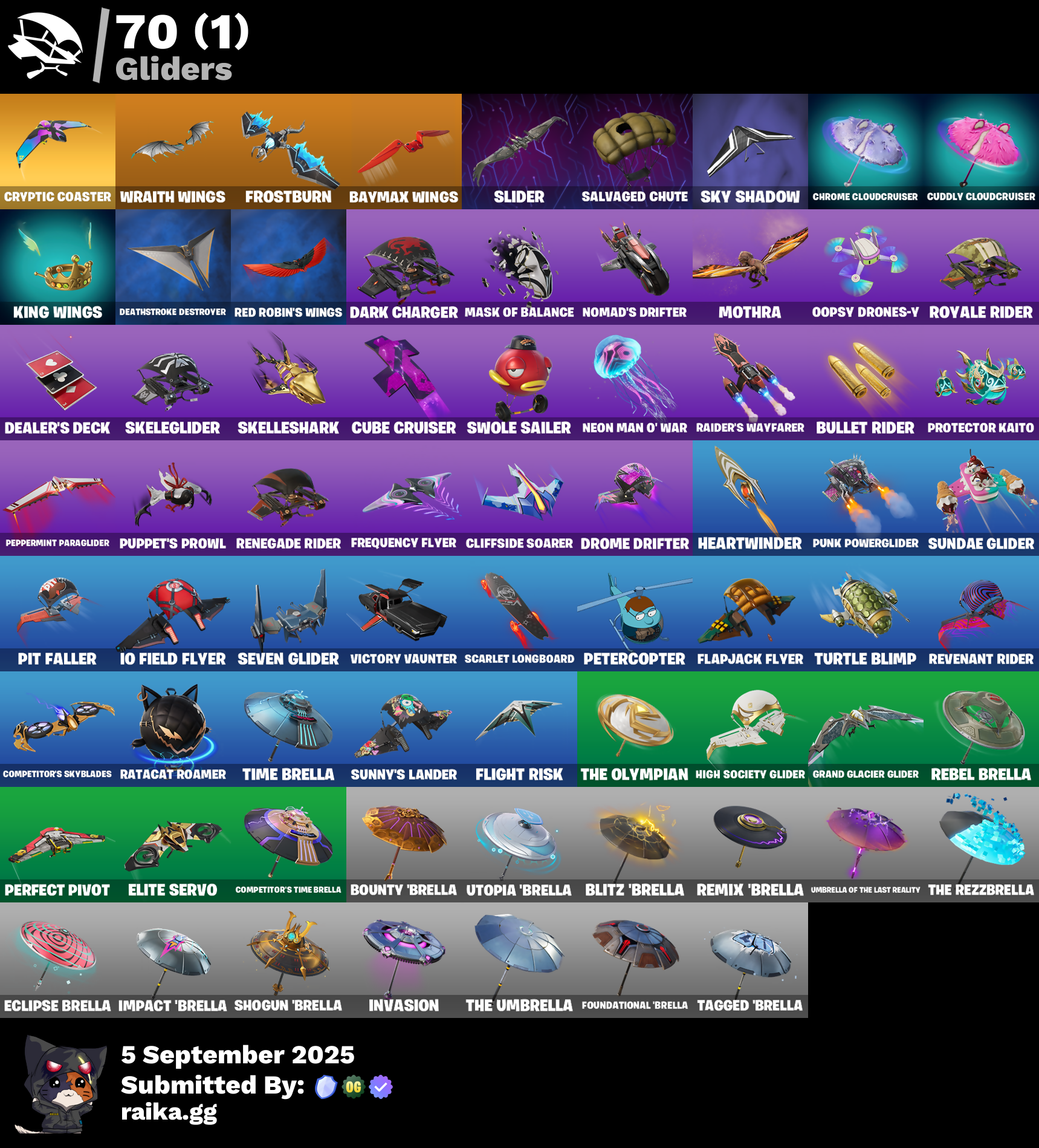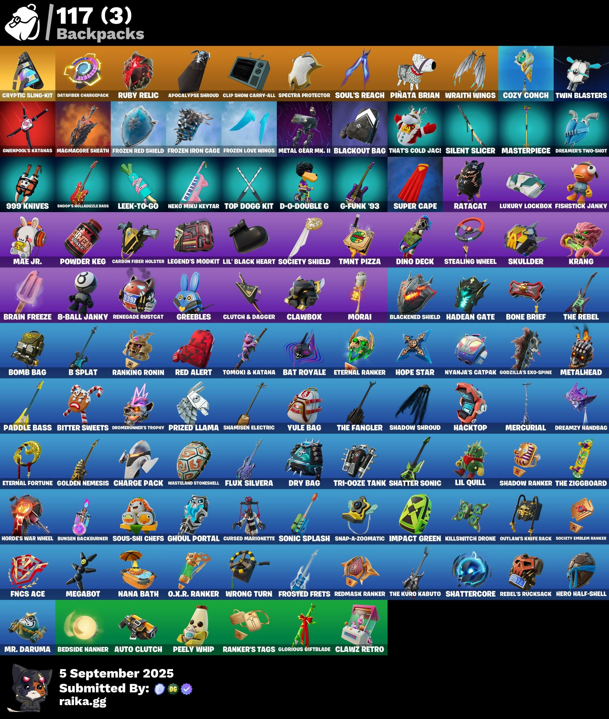 8-Ball Janky, 999 Knives, Aerial Assault Captain, Ahsoka Tano, Ahsoka's Staff, All-Weather Extractor, Antonia, Apocalypse Shroud, Aura, Auto Clutch, Axe-O, Axe-Tral Form, B Splat, Backup Blades, Bat Royale, Battle Blessing, Batwing Bonespike, Baymax Wings, Bear Hug, Beatzbunny, Bedside Nanner, Bitter Sweets, Blackened Shield, Blackout Bag, Blades Of Light, Blitz 'Brella, Blitz Axe, Bomb Bag, Bone Brief, Boogie Down, Boop!, Bounty 'Brella, Brain Freeze, Breathless Blades, Bullet Rider, Bunsen Backburner, Burning Ambition Valeria, Business Hips, Cactus Club, Candy Axe, Carbon Fiber Holster, Card Drop, Charge Pack, Chrome Cloudcruiser, Clang & Basher, Clawbox, Clawz Retro, Clean Sweep, Cliffside Soarer, Clip Show Carry-All, Clutch & Dagger, Cold Snap, Collector Kado Thorne, Competitor's Skyblades, Competitor's Time Brella, Cozy Conch, Crack It, Crimson Polestar, Crimson Scythe, Crowning Achievement, Cryptic Coaster, Cryptic Sling-Kit, Crystal Fang, Cube Cruiser, Cuddle Carvers, Cuddly Cloudcruiser, Cursed Marionette, D-O-Double G, Daigo's Claws, Dark Charger, Dark Doggo, Datafiber Chargepack, Dawn Duelist Nisha, Dealer's Deck, Deathstoke Destroyer, Demon Hunter Hope, Diamond Throne, Diamondclaw Picker, Dice Roll, Dino Deck, Do The Split, Dogg Treat, Doze Dab, Dreamer's Two-Shot, Dreamzy Handbag, Drome Drifter, Dromerunner's Trophy, Dry Bag, Duelist's Foil, Dumbbell Driver, Dummy, Durrr Taisho, Dusk Knight, Eclipse Brella, Egg Drop Scoop, Electro Pairing Blades, Elegance Blade, Elite Servo, Ember Pick, Energized Godzilla, Epic Blade Of Floof, Eternal Fortune, Eternal Ranker, Evil Plan, Explorer Emilie, FNCS Ace, Fancy Peter Griffin, Felina, Felina's Claw, Fishstick Janky, Fist Bump, Flaky Feast, Flapjack Flyer, Flashback Breakdown, Flight Risk, Flux Silvera, Foil Flex, Foundational 'Brella, Frequency Flyer, Front Page Pose, Frostburn, Frosted Frets, Frozen Iron Cage, Frozen Love Ranger, Frozen Love Wings, Frozen Raven, Frozen Red Knight, Frozen Red Shield, G-Funk '93, Get Griddy, Ghoul Portal, Gilded Naginata, Gingerbread Raider, Glorious Giftblade, Godzilla's Exo-Spine, Golden Nemesis, Golden Scythe, Good Guy, Grand Glacier Glider, Greebles, Guardian Jade, Gwenpool's Katanas, Hacktop, Hadean Gate, Harbinger Armor Omegarok, Harley Hitter, HaxSaur, Heart Sign, Heart's Carver, Heartbreak Club, Heartbreak Ranger, Heartwinder, Helichopper, Hero Half-Shell, High Society Glider, Holiday Boxy, Hook Slicer, Hope, Hope Star, Horde's War Wheel, Hot Pokers, Howl, Humbug Slicer, Hype!, I'm A Mystery, IO Field Flyer, Impact 'Brella, Impact Green, Inferno, Invasion, Invisible Cut, Jazz Hands, Jet Signals, Joltara, Josie, Killswitch Drone, King Wings, Kintsugi Daigo, Kittanas, Knife Sharpener, Krang, Kyra, Lady Of Cranes, Lbc '93 Dogg, Leek-To-Go, Legend's Modkit, Lil Quill, Lil' Black Heart, Lil' Godzilla Attack, Lil' Longboat, Lil' T-6 Shuttle, Lil' Tank, Lucky Nyanja, Luxury Lockbox, Mae, Mae Jr., Magmacore Sheath, Make A Seat, Marshmallets, Mask of Balance, Masterpiece, Megabot, Mercurial, Metal Gear Mk. II, Metalhead, Microbot Mallet, Morai, Mothra, Mr. Dappermint, Mr. Daruma, My World, Nailed It, Nana Bath, Nanner Bashers, Nanner Ringer, Neko Claws, Neko Hatsune Miku, Neko Miku Keytar, Neon Man O' War, Never Gonna, Night Kama, Ninja Stance: Donnie, Ninja Stance: Leo, Ninja Stance: Mikey, Ninja Stance: Raph, Noggin, Nolan Chance, Nomad's Drifter, Nyanja's Catpak, O.M.E.G.A. Spear, O.X.R. Ranker, Ol' Spiky, Old Snake, Oopsy Drones-V, Outlaw's Knife Rack, Outlaw's Whipknives, Paddle Bass, Paint Pummelers, Par Patroller, Party Hips, Peely Whip, Peppermint Paraglider, Perfect Pivot, Petercopter, Piper Pace, Pit Faller, Pitcycle, Piñata Brian, Poacher's Regrets, Point & Shoot, Popular Vibe, Powder Keg, Premiere Poms, Prized Llama, Protector Kaito, Punk Powerglider, Puppet Dance, Puppet's Prowl, Quicksilver Baton Spear, Racer Kendo, Raider's Wayfarer, Ranker's Tags, Ranking Ronin, Ratacat, Ratacat Roamer, Raven Team Syd, Rebel Brella, Rebel's Rucksack, Recon Expert, Red Alert, Red Robin's Wings, Redmask Ranker, Reef Cake Fish Thicc, Remix 'Brella, Renegade Racer, Renegade Raider, Renegade Reaver, Renegade Rider, Renegade Rustcat, Revenant Rider, Reverie, Reverie's Dreamstaff, Rock Paper Scissors, Rocket Wrecker, Rootkit Hammer, Rose Thorns, Rough Cut Montague, Royale Rider, Ruby, Ruby Relic, Ruby Shadows, Runway Racer, Salvaged Chute, Samurai Baymax, Santa Dogg, Scarlet Longboard, Scratchmark Shredder, Secret Scimitars, Seven Glider, Shadow Ranker, Shadow Shroud, Shadow Slicer, Shamisen Electric, Shamisen-Sational, Shatter Sonic, Shattercore, Shock Brawler Oscar, Shogun 'Brella, Shout!, Show 'Em Off, Silent Slicer, Skele-Dance, Skeleglider, Skelleshark, Skull Ranger, Skullder, Sky Shadow, Slaver Juice Wrld, Slider, Slow Clap, Snap-A-Zoomatic, Snoop's Holladizzle Bass, Snoop's Walk, Society Emblem Ranker, Society Shield, Socks, Solar Slicer, Sonic Splash, Soul's Reach, Soundwave Slashers, Sous-Shi Chefs, Sparkling Star, Spectra Knight, Spectra Protector, Spectra Slasher, Spin-It Slicer, Spinal Slicer, Spirit Strider, Stealing Wheel, Stellar Striker, Storm's Maw, Stun Knife, Subzero Cryptic, Sundae Glider, Sunny's Lander, Super Cape, Surfin' Bird, Sweet!, Swell Striker, Swole Sailer, Syntheslicer, TMNT Pizza, Tagged 'Brella, Tagger's Groove, Take A 'Bow, Team Mech, That's Cold Jac!, The Break, The Break Shot, The Fangler, The Gorgonblades, The Greenest Onion, The Iconoclast, The Kuro Kabuto, The Night Rose, The Olympian, The Original Bonk Bunny, The Rebel, The Rezzbrella, The Rick Dance, The Scratcher, The Squabble, The Takedown, The Umbrella, The Up-Chucker, The Ziggboard, Time Breaker Lil Split, Time Breaker Renegade Lynx, Time Brella, Tomoki & Katana, Top Dogg Kit, Traditional Khaby, Tri-Ooze Tank, Turbulent Blade, Turtle Blimp, Twin Blasters, Umbrella of the Last Reality, Underground Jones, Utopia 'Brella, Victory Vaunter, Vision, Void Warrior Absenz, Void's Ire, Vulcan Salute, Wasteland Stoneshell, Wate