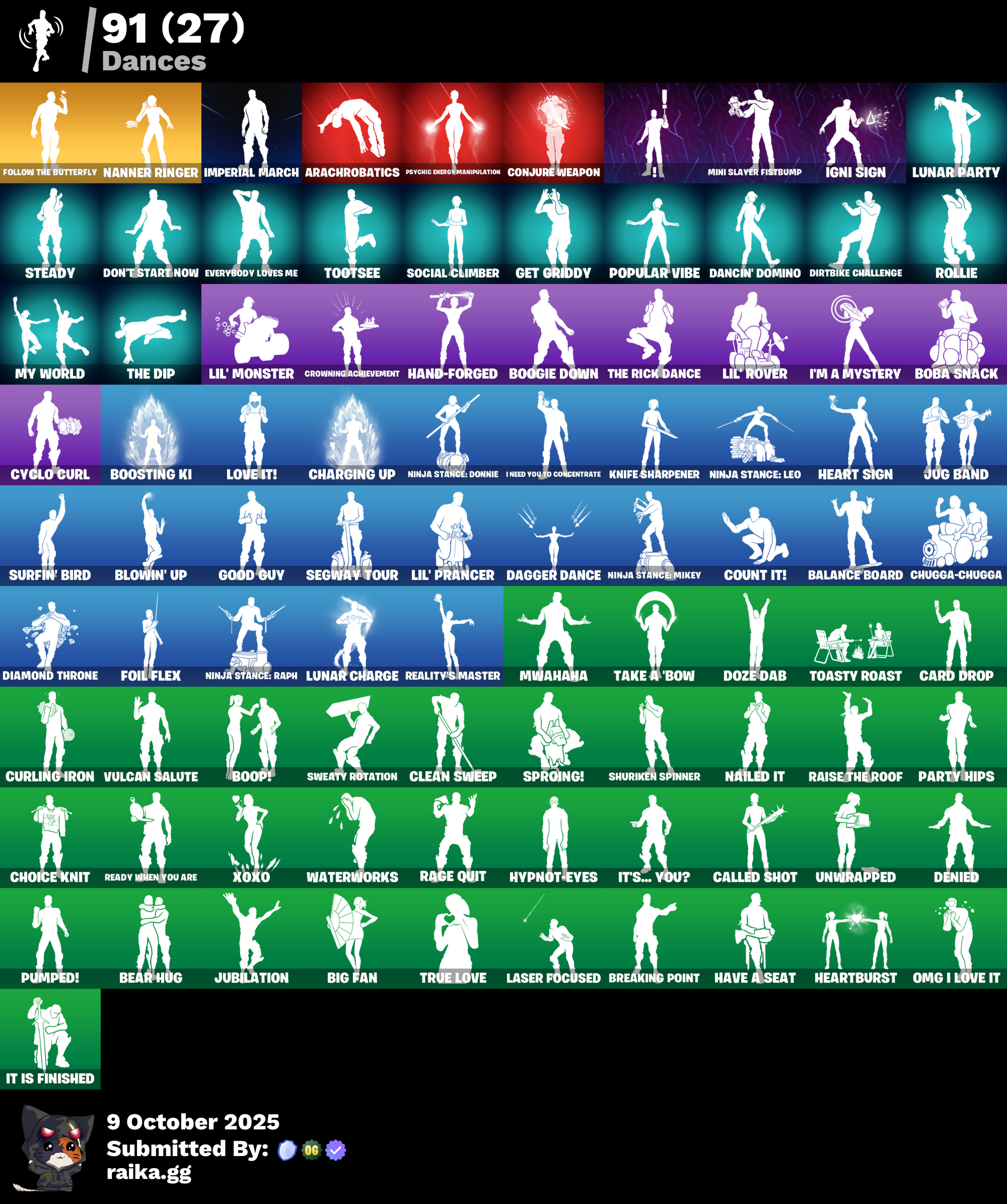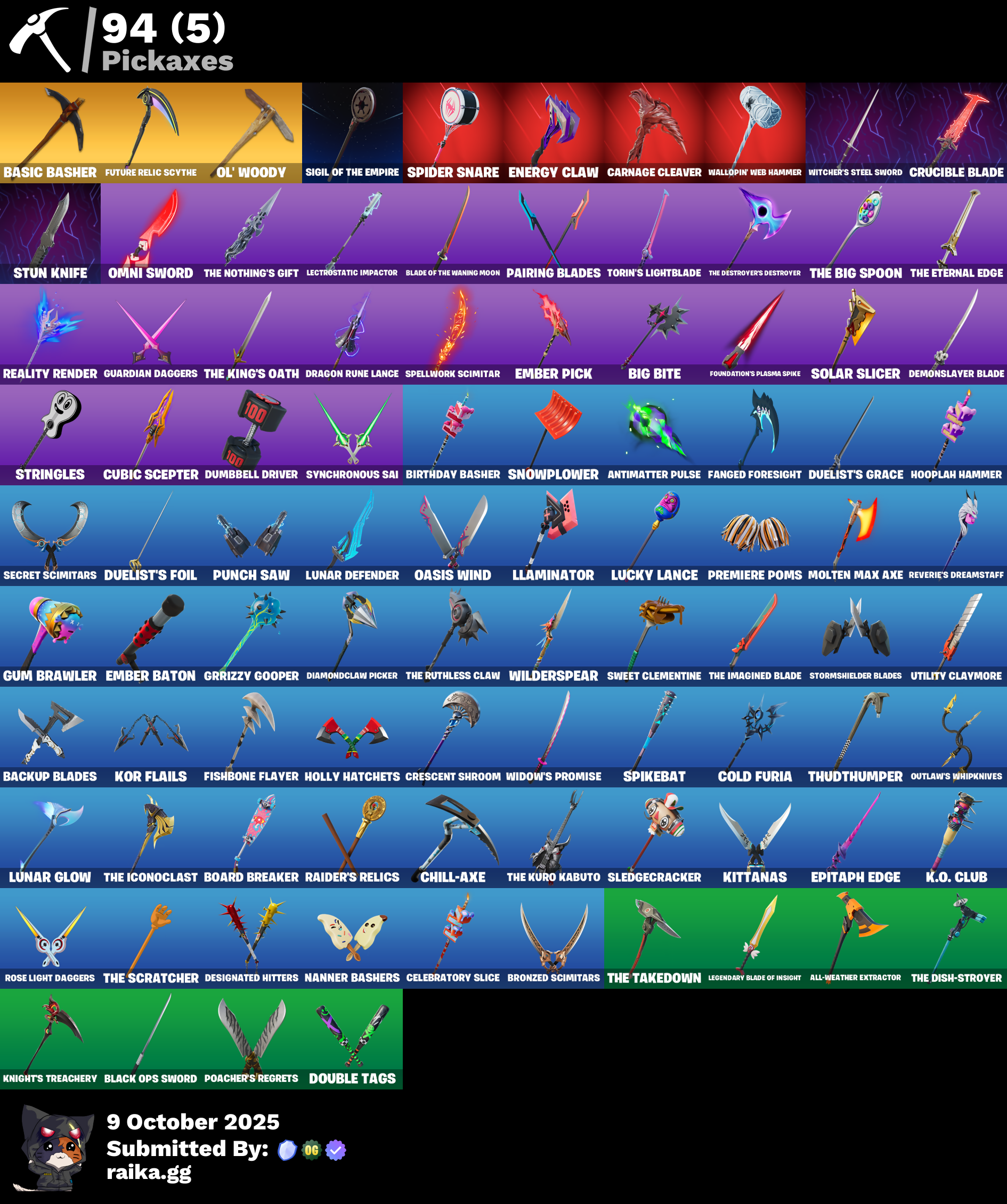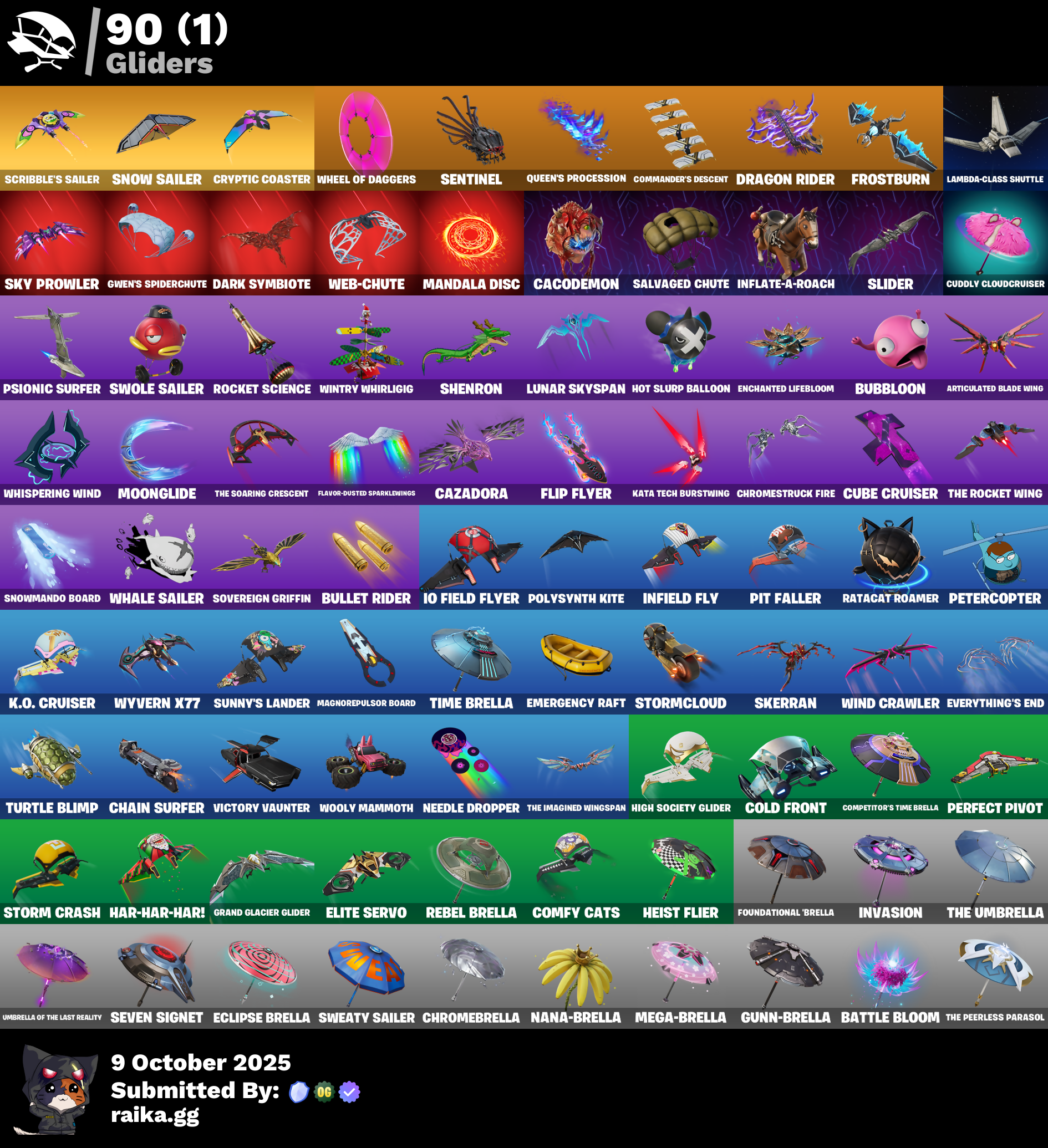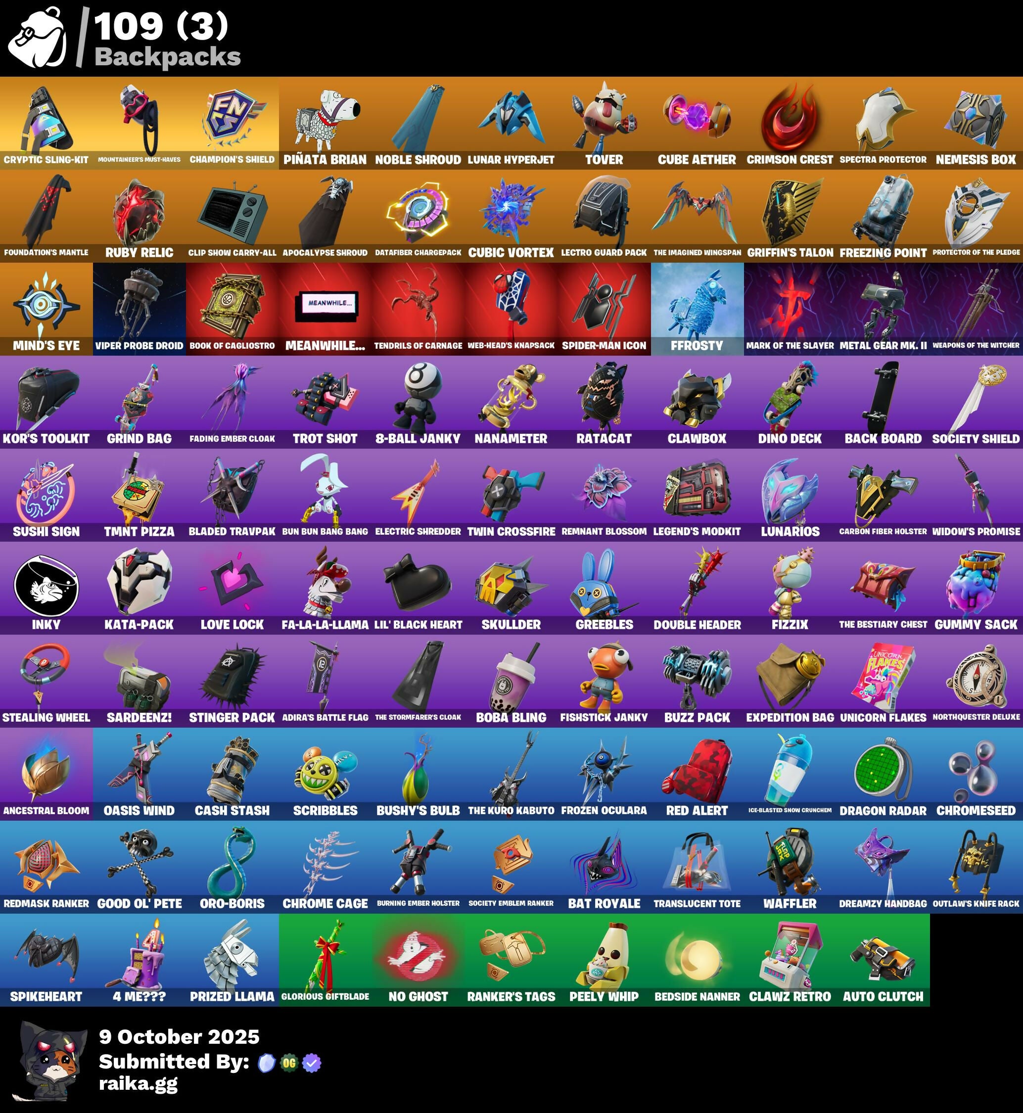 4 Me???, 8-Ball Janky, Adira (Battle Mask), Adira's Battle Flag, All-Weather Extractor, Ancestral Bloom, Antimatter Pulse, Apocalypse Shroud, Arachrobatics, Arctic Adeline, Articulated Blade Wing, Ascension Nezumi, Astro Armor, Aura, Auto Clutch, Back Board, Backlash, Backup Blades, Balance Board, Basic Basher, Bat Royale, Battle Bloom, Bear Hug, Bedside Nanner, Big Bite, Big Fan, Birthday Basher, Black Ops Sword, Blade of the Waning Moon, Bladed Travpak, Blizzard Bomber, Blowin' Up, Board Breaker, Boardwalk Ruby, Boba Bling, Boba Snack, Boogie Down, Book Of Cagliostro, Boop!, Boosting Ki, Breaking Point, Bronzed Scimitars, Bubbloon, Bullet Rider, Bullpen Brawler Dusty, Bun Bun Bang Bang, Burning Ambition Valeria, Burning Ember Holster, Bushy's Bulb, Buzz Pack, Bytes (Lone Traveler), Cacodemon, Called Shot, Carbon Fiber Holster, Card Drop, Carnage (Maximum), Carnage Cleaver, Cash Stash, Cazadora, Celebratory Slice, Chain Surfer, Champion's Shield, Charging Up, Charlotte, Chill-Axe, Choice Knit, Chrome Cage, Chrome Punk, Chromebrella, Chromeseed, Chromestruck Fire, Chugga-Chugga, Clawbox, Clawz Retro, Clean Sweep, Clip Show Carry-All, Club President Helsie, Cold Front, Cold Furia, Comfy Cats, Commander's Descent, Competitor's Time Brella, Conjure Weapon, Count It!, Crescent Shroom, Crimson Crest, Crowning Achievement, Crucible Blade, Cryptic Coaster, Cryptic Sling-Kit, Cube Aether, Cube Cruiser, Cubic Scepter, Cubic Vortex, Cuddly Cloudcruiser, Curling Iron, Cyclo Curl, Dagger Dance, Dancin' Domino, Dark Symbiote, Darth Vader, Datafiber Chargepack, Demonslayer Blade, Denied, Designated Hitters, Diamond Throne, Diamondclaw Picker, Dino Deck, Dirtbike Challenge, Doctor Strange, Don't Start Now, Double Header, Double Tags, Doze Dab, Dragon Radar, Dragon Rider, Dragon Rune Lance, Dreamzy Handbag, Duelist's Foil, Duelist's Grace, Dumbbell Driver, Eclipse Brella, Electric Shredder, Elite Servo, Ember Baton, Ember Pick, Emergency Raft, Enchanted Lifebloom, Energy Claw, Epitaph Edge, Erisa, Everybody Loves Me, Everything's End, Evie (Summer Strider), Expedition Bag, Explorer Emilie, Fa-La-La-Llama, Fabio Sparklemane, Fading Ember Cloak, Fancy Peter Griffin, Fanged Foresight, Ffrosty, Fishbone Flayer, Fishstick Janky, Fizzix, Flavor-Dusted Sparklewings, Flip Flyer, Foil Flex, Follow The Butterfly, Foundation's Mantle, Foundation's Plasma Spike, Foundational 'Brella, Freezing Point, Frostbite, Frostburn, Frozen Oculara, Future Relic Scythe, Get Griddy, Glorious Giftblade, Good Guy, Good Ol' Pete, Grand Glacier Glider, Greebles, Griffin's Talon, Grind Bag, Grizz (Wild Beary Grizz), Grrizzy Gooper, Guardian Daggers, Guff Gringle, Gum Brawler, Gumbo (Sour), Gummy Sack, Gunn-Brella, Gunnar, Gwen's Spiderchute, Hand-Forged, Har-Har-Har!, Harlowe (Helmet), Have A Seat, Haven, Heart Sign, Heartburst, Heist Flier, High Society Glider, Holiday Boxy, Holly Hatchets, Hooplah Hammer, Hope, Hot Slurp Balloon, Hypnot-Eyes, I Need You To Concentrate, I'm a Mystery, IO Field Flyer, Ice-Blasted Snow Crunchem, Igni Sign, Imperial March, Indiana Jones (Temple Explorer), Infield Fly, Inflate-A-Roach, Inky, Invasion, It Is Finished, It's... You?, J.B. Chimpanski (Helmet), Jubilation, Jug Band, Jun-Hwan, K.O. Club, K.O. Cruiser, Kata Tech Burstwing, Kata-Pack, Kiara K.O. (Captain's Bomber), Kittanas, Knife Sharpener, Knights Treachery, Kor (Trenchcoat), Kor Flails, Kor's Toolkit, Krisabelle, Lambda-Class Shuttle, Laser Focused, Lectro Guard Pack, Lectrostatic Impactor, Legend's Modkit, Legendary Blade of Insight, Lennox Rose, Lil' Black Heart, Lil' Monster, Lil' Prancer, Lil' Rover, Llaminator, Love It!, Love Lock, Lt. John Llama, Lucky Lance, Lunar Charge, Lunar Defender, Lunar Glow, Lunar Hyperjet, Lunar Party, Lunar Skyspan, Lunarios, Magnorepulsor Board, Major Mancake, Malik (Solitary Defender), Mandala Disc, Mark Of The Slayer, Meanwhile..., Mega-Brella, Meow Skulls, Metal Gear Mk. II, Mina Park, Mind's Eye, Mini Slayer Fistbump, Molten Max Axe, Moonglide, Mountaineer's Must-Haves, Mwahaha, My World, Nailed It, Nana-Brella, Nanameter, Nanner Bashers, Nanner Ringer, Needle Dropper, Nemesis Box, Ninja Stance: Donnie, Ninja Stance: Leo, Ninja Stance: Mikey, Ninja Stance: Raph, Nisha, No Ghost, Noble Shroud, Northquester Deluxe, Oasis Wind, Ol' Woody, Old Snake, Omg I Love It, Omni Sword, Oro-Boris, Outlaw's Knife Rack, Outlaw's Whipknives, Pairing Blades, Paradigm (Aurelian), Party Hips, Peely Whip, Perfect Pivot, Petercopter, Pit Faller, Piñata Brian, Poacher's Regrets, Polar Peely, Polysynth Kite, Popular Vibe, Premiere Poms, Prized Llama, Protector Of The Pledge, Prowler, Psionic Surfer, Psychic Energy Manipulation, Pumped!, Punch Saw, Queen's Procession, Rage Quit, Raider's Relics, Raise The Roof, Ranker's Tags, Ratacat, Ratacat Roamer, Ready When You Are, Reality Render, Reality's Master, Rebel Brella, Red Alert, Red Jade, Redmask Ranker, Remnant Blossom, Reverie, Reverie's Dreamstaff, Rocket Science, Rollie, Ronin (Cape), Rose Light Daggers, Rough Cut Montague, Ruby, Ruby Relic, Runway Racer, Sabina (Ponytail), Salvaged Chute, Sardeenz!, Scribble's Sailer, Scribbles, Secret Scimitars, Segway Tour, Sentinel, Seven Signet, Shanta (Headpiece), Shenron, Shock Brawler Oscar, Shuriken Spinner, Sigil of the Empire, Skerran, Skullder, Sky Prowler, Sled Ready Guff, Sledgecracker, Slider, Snap, Snow Sailer, Snowmando Board, Snowplower, Social Climber, Society Emblem Ranker, Society Shield, Solar Slicer, Sovereign Griffin, Spectra Protector, Spellwork Scimitar, Spider Snare, Spider-Gwen (Gwen Stacy), Spider-Man, Spider-Man (No Way Home), Spider-Man Icon, Spikebat, Spikeheart, Sproing!, Stash'd, Steady, Stealing Wheel, Stinger Pack, Storm Crash, Stormcloud, Stormfarer (Storm Brawler), Stormshielder Blades, Stringles, Stun Knife, Subzero Cryptic, Sunlit Selene, Sunny's Lander, Surfin' Bird, Sushi Sign, Sweaty Rotation, Sweaty Sailer, Sweet Clementine, Swole Sailer, Synchronous Sai, TMNT Pizza, Take A 'Bow, Tendrils Of Carna