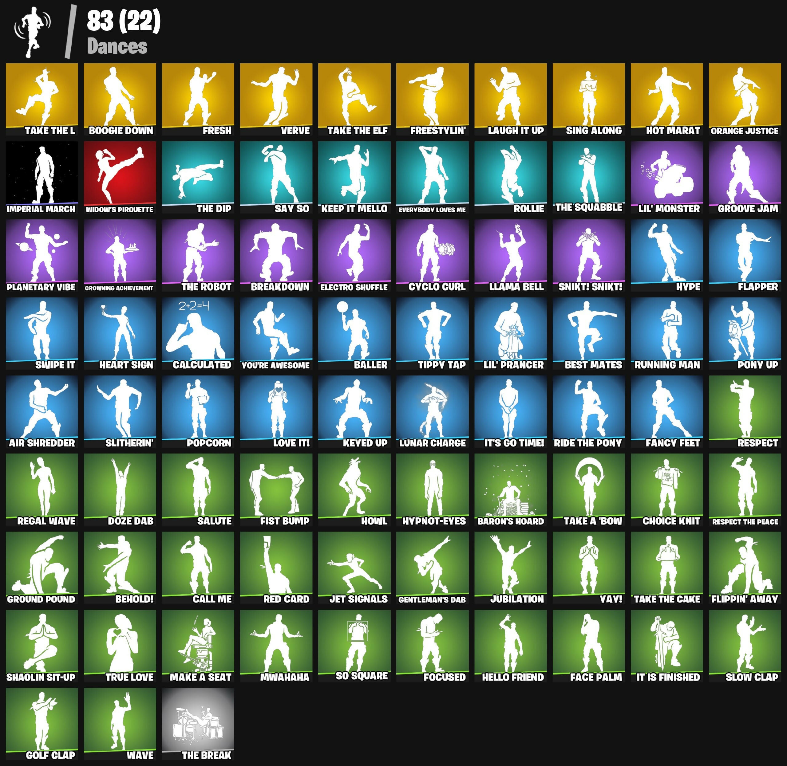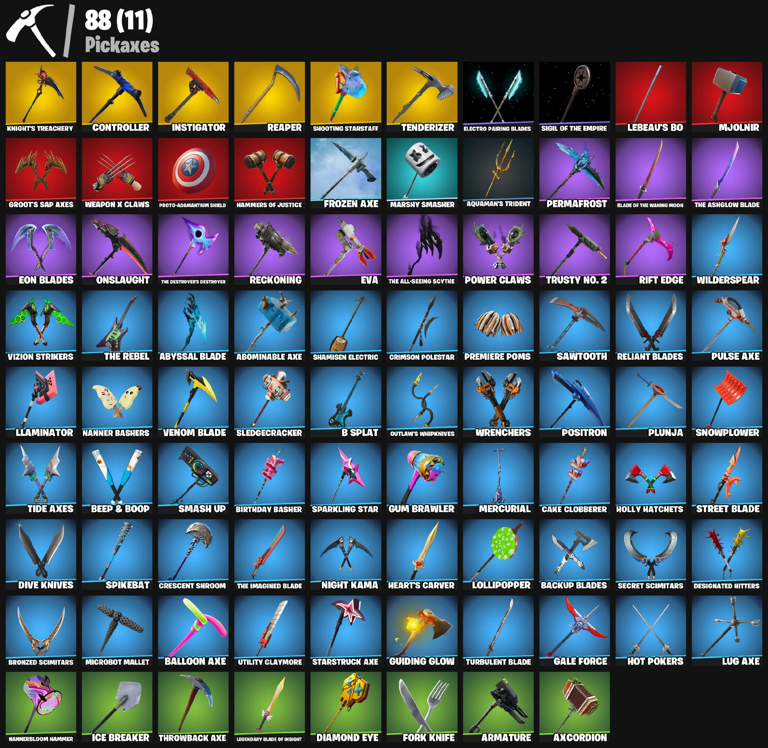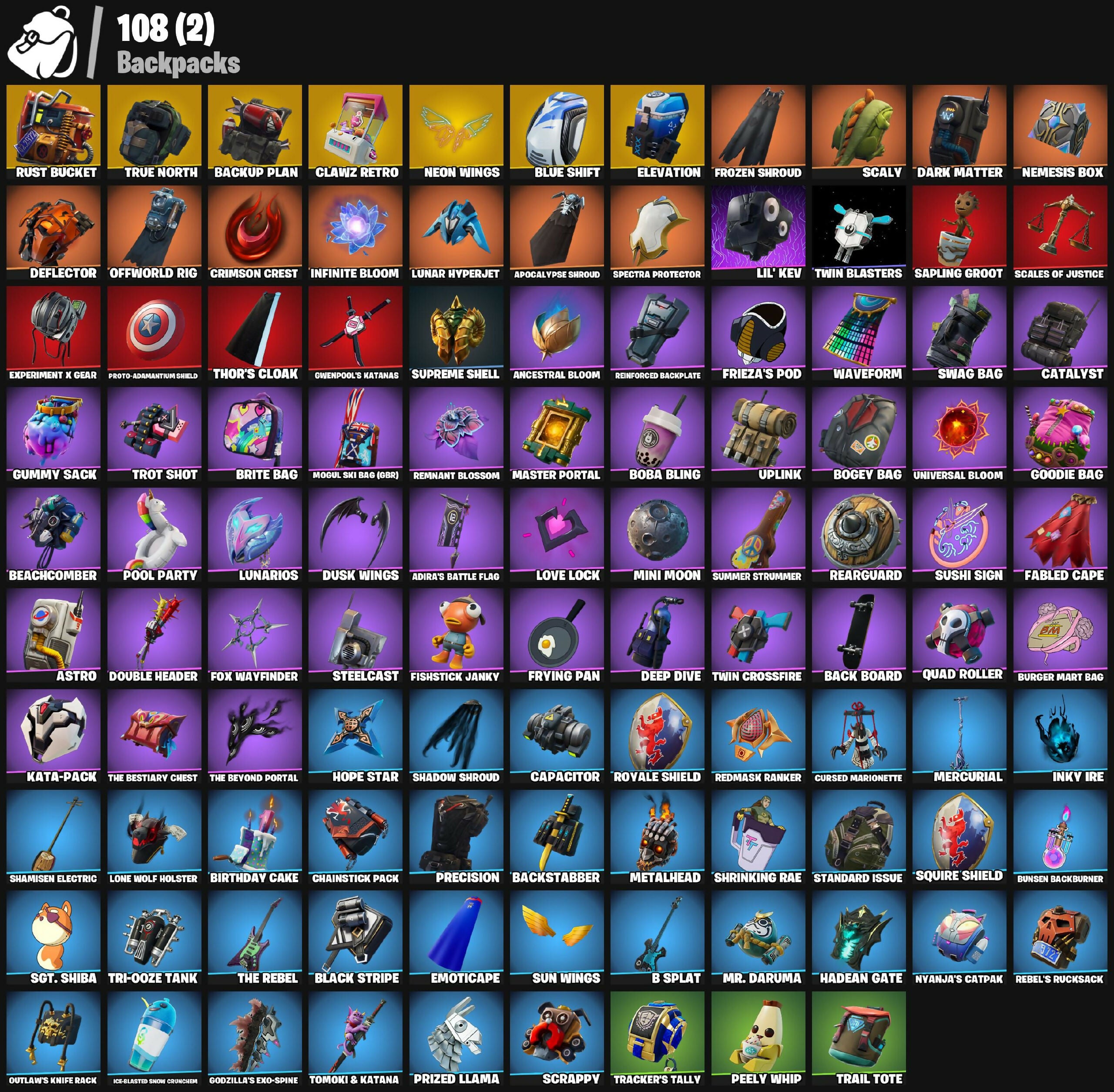 Abominable Axe, Absenz, Abyssal Blade, Adira's Battle Flag, Afterparty, Air Shredder, Ancestral Bloom, Apocalypse Shroud, Aquaman, Aquaman's Trident, Armature, Astro, Aura, Axcordion, B Splat, Back Board, Backstabber, Backup Blades, Backup Plan, Baller, Balloon Axe, Baron's Hoard, Battlehawk, Beachcomber, Beep & Boop, Behold!, Best Mates, Birthday Basher, Birthday Cake, Black Stripe, Blade Of The Waning Moon, Blue Cyclo, Blue Shift, Blue Squire, Blue Streak, Blue Striker, Blue Team Leader, Boba Bling, Bogey Bag, Boogie Down, Brawler, Breakdown, Brite Bag, Brite Bomber, Brite Gunner, Bronzed Scimitars, Bullseye, Bunsen Backburner, Burger Mart Bag, Burning Dragon, Cake Clobberer, Calamity, Calculated, Call Me, Capacitor, Captain America, Carbide, Catalyst, Chainstick Pack, Chapter 3 Island Theme, Chapter 4 Island Theme, Chapter 5 Island Theme, Choice Knit, Clawz Retro, Cloud Striker, Cobalt, Controller, Crescent Shroom, Crimson Crest, Crimson Polestar, Crowning Achievement, Cuddle Hearts, Cursed Marionette, Cyclo Curl, DJ Yonder, Dark Matter, Dark Voyager, Deep Dive, Deflector, Derby Dynamo, Designated Hitters, Diamond Eye, Dive Knives, Double Header, Doze Dab, Drift, Dusk, Dusk Wings, Electro Pairing Blades, Electro Shuffle, Elevation, Elite Agent, Emoticape, Eon Blades, Eva, Everybody Loves Me, Experiment X Gear, Fable, Fabled Cape, Face Palm, Fade, Fancy Feet, Far Out Man, Fishstick Janky, Fist Bump, Flapper, Flappy, Flip Reset, Flippin' Away, Focused, Fork Knife, Fox Wayfinder, Freestylin', Fresh, Frieza, Frieza's Pod, Frozen Axe, Frozen Shroud, Fryangles, Frying Pan, Gale Force, Gentleman's Dab, Giddy-Up, Godzilla's Exo-Spine, Golf Clap, Goodie Bag, Groot, Groots Sap Axes, Groove Jam, Ground Pound, Guiding Glow, Gum Brawler, Gumbo, Gummy Sack, Gwenpool's Katanas, Hadean Gate, Hammers Of Justice, Haven, Havoc, Heart Sign, Heart's Carver, Hello Friend, Holly Hatchets, Hop and a Wink, Hope Star, Hot Marat, Hot Pokers, Howl, Huntress, Hush, Hype, Hypnot-Eyes, I Am Fearless, IG-11, Ice Breaker, Ice-Blasted Snow Cruncher, Imperial March, Infinite Bloom, Inky Ire, Instigator, Invincible, It Is Finished, It's Go Time!, Jackal, Jaguar, Jennifer Walters, Jet Signals, Jubilation, Jules, Jungle Scout, Kata-Pack, Keep It Mello, Keyed Up, Kit, Knight's Treachery, Knights Treachery, Krisabelle, Laugh It Up, Lebeau's Bo, Legendary Blade Of Insight, Lego Fortnite Theme, Lil' Kev, Lil' Monster, Lil' Prancer, Lion, Llama Bell, Llaminator, Lobby Classic, Lollipopper, Lone Wolf Holster, Love It!, Love Lock, Lt. John Llama, Lug Axe, Lunar Charge, Lunar Hyperjet, Lunarios, Make A Seat, Marshmello, Marshy Smasher, Master Portal, Mercurial, Metalhead, Microbot Mallet, Mini Moon, Mission Specialist, Mjolnir, Mogul Master (GBR), Mogul Ski Bag (GBR), Moonwalker, Mr. Daruma, Mwahaha, Nanner Bashers, Nannerbloom Hammer, Nemesis Box, Neon Wings, Night Kama, Nyanja's Catpak, Ocean, Offworld Rig, Omega, Onslaught, Orange Justice, Outlaw's Knife Rack, Outlaw's Whipknives, Peely Whip, Per Aspera Ad Astra, Permafrost, Phantasm, Planetary Vibe, Plunja, Polar Peely, Pony Up, Pool Party, Popcorn, Positron, Power Claws, Precision, Premiere Poms, Prized Llama, Proto-Adamantium Shield, Pulse Axe, Quad Roller, Ragnarok, Reaper, Rearguard, Rebel's Rucksack, Reckoning, Red Card, Redline, Redmask Ranker, Regal Wave, Reinforced Backplate, Reliant Blades, Remnant Blossom, Respect, Respect The Peace, Rex, Rhino, Ride The Pony, Rift Edge, Rivet, Rocket Racing Theme, Rogue Agent, Rollie, Ronin, Rook, Royale Knight, Royale Shield, Running Man, Rust Bucket, Rust Lord, Salute, Sapling Groot, Sawtooth, Say So, Scales of Justice, Scaly, Scarlet Defender, Scrappy, Scuba Jonesy, Secret Scimitars, Seeker, Sgt. Shiba, Shadow Shroud, Shamisen Electric, Shanta, Shaolin Sit-Up, Shooting Starstaff, Shrinking Rae, Sigil Of The Empire, Sing Along, Siona, Skerran, Sledgecracker, Sledgehammer, Slipstream, Slitherin', Slow Clap, Smash Up, Snikt! Snikt!, Snowflake, Snowplower, So Square, Sparkling Star, Sparkplug, Spectra Protector, Spikebat, Squad Leader, Squire Shield, Standard Issue, Starflare, Starstruck Axe, Steelcast, Steelsight, Storm, Street Blade, Sub Commander, Summer Strummer, Sun Strider, Sun Wings, Sunbird, Supreme Shell, Survival Specialist, Sushi Sign, Swag Bag, Swipe It, Tactics Officer, Take A 'Bow, Take The Cake, Take The Elf, Take The L, Tech Ops, Teknique, Tenderizer, The Ace, The All-Seeing Scythe, The Ashglow Blade, The Bestiary Chest, The Beyond Portal, The Break, The Destroyer's Destroyer, The Dip, The Foundation, The Giant Chicken, The Imagined Blade, The Re-Og, The Reaper, The Rebel, The Robot, The Squabble, The Visitor, Thor, Thor's Cloak, Throwback Axe, Tide Axes, Tippy Tap, Tomoki & Katana, Tracker's Tally, Trail Tote, Trailblazer, Tri-Ooze Tank, Trot Shot, True Love, True North, Trusty No. 2, Turbulent Blade, Twin Blasters, Twin Crossfire, Universal Bloom, Uplink, Utility Claymore, Valor, Vanguard Banshee, Venom Blade, Verge, Vertex, Verve, Vizion Strikers, Wave, Waveform, Weapon X, Weapon X Claws, Widow's Pirouette, Wilderspear, Wingman, Wrenchers, Yay!, Yellowjacket, You're Awesome, Yuletide Ranger, Zoe Clash, Zoey