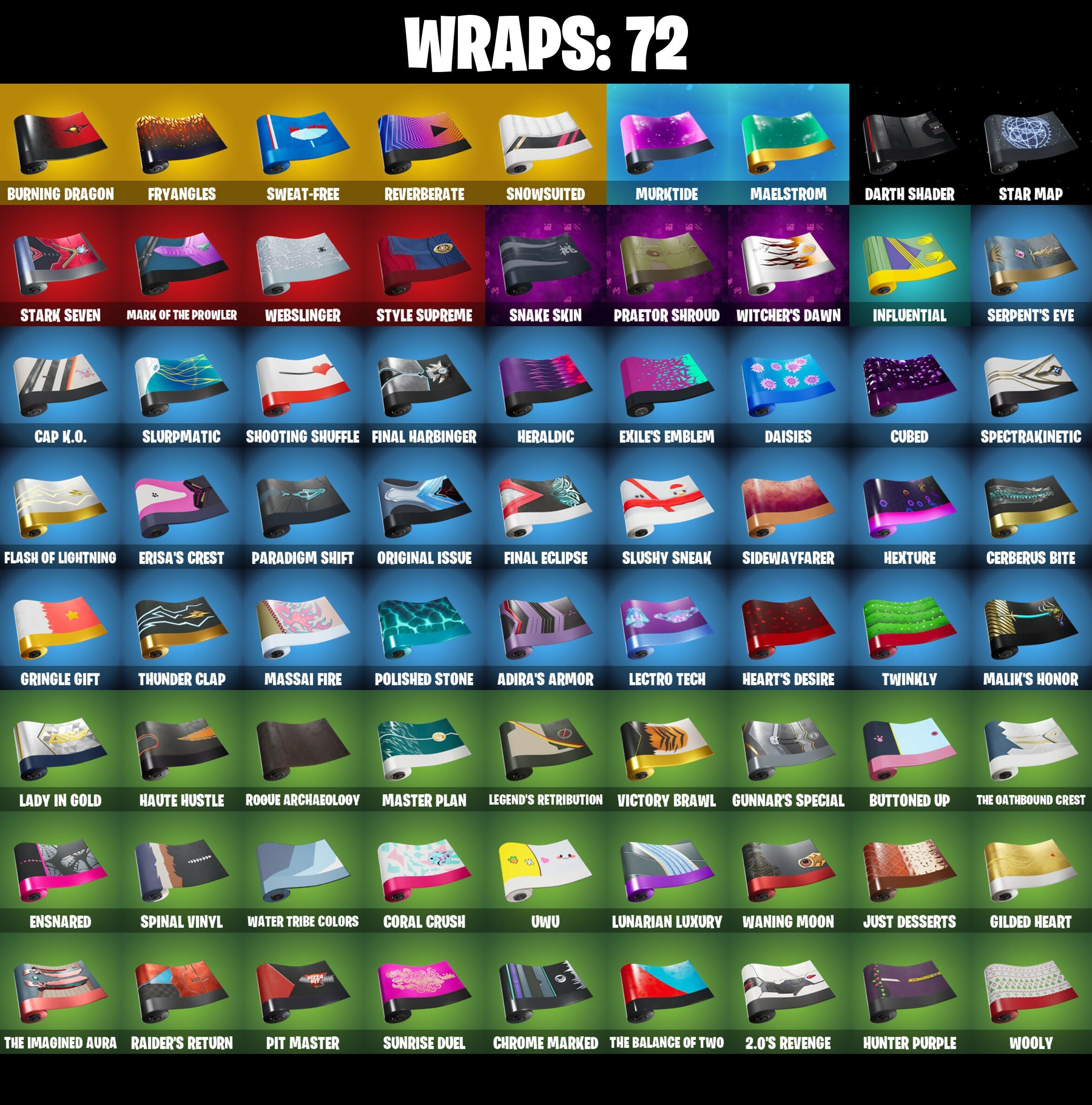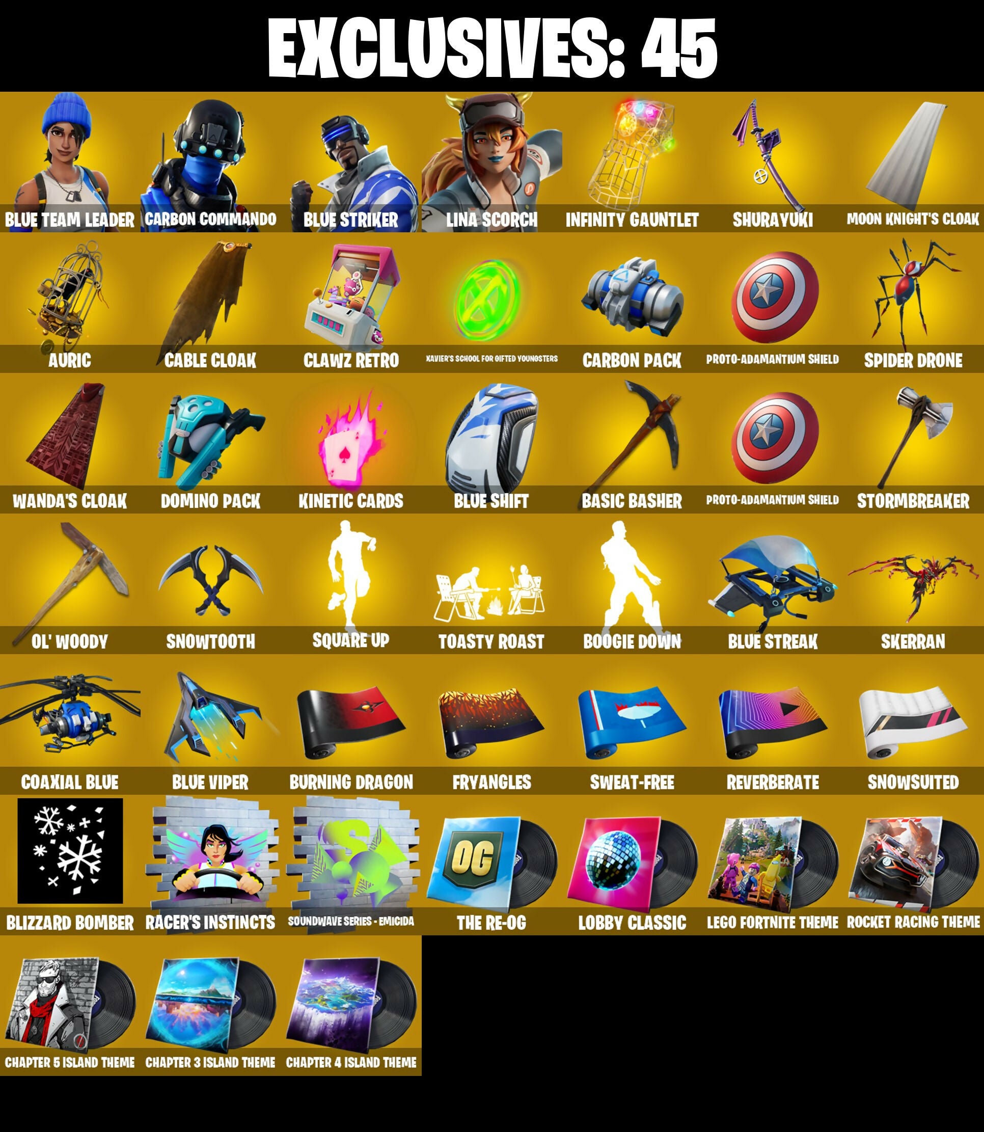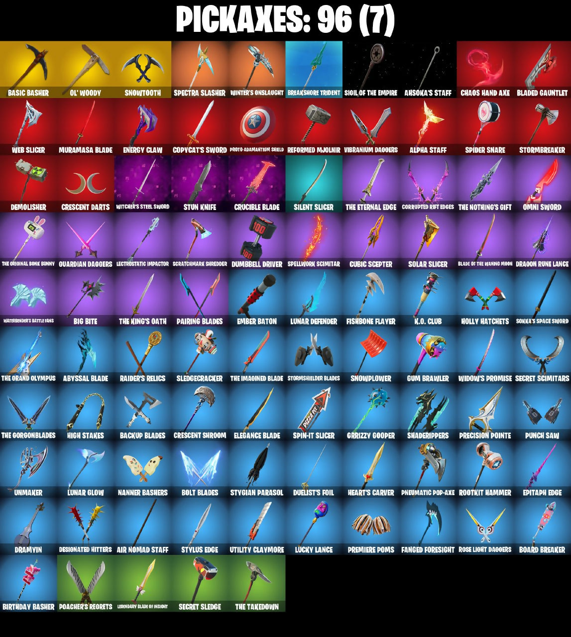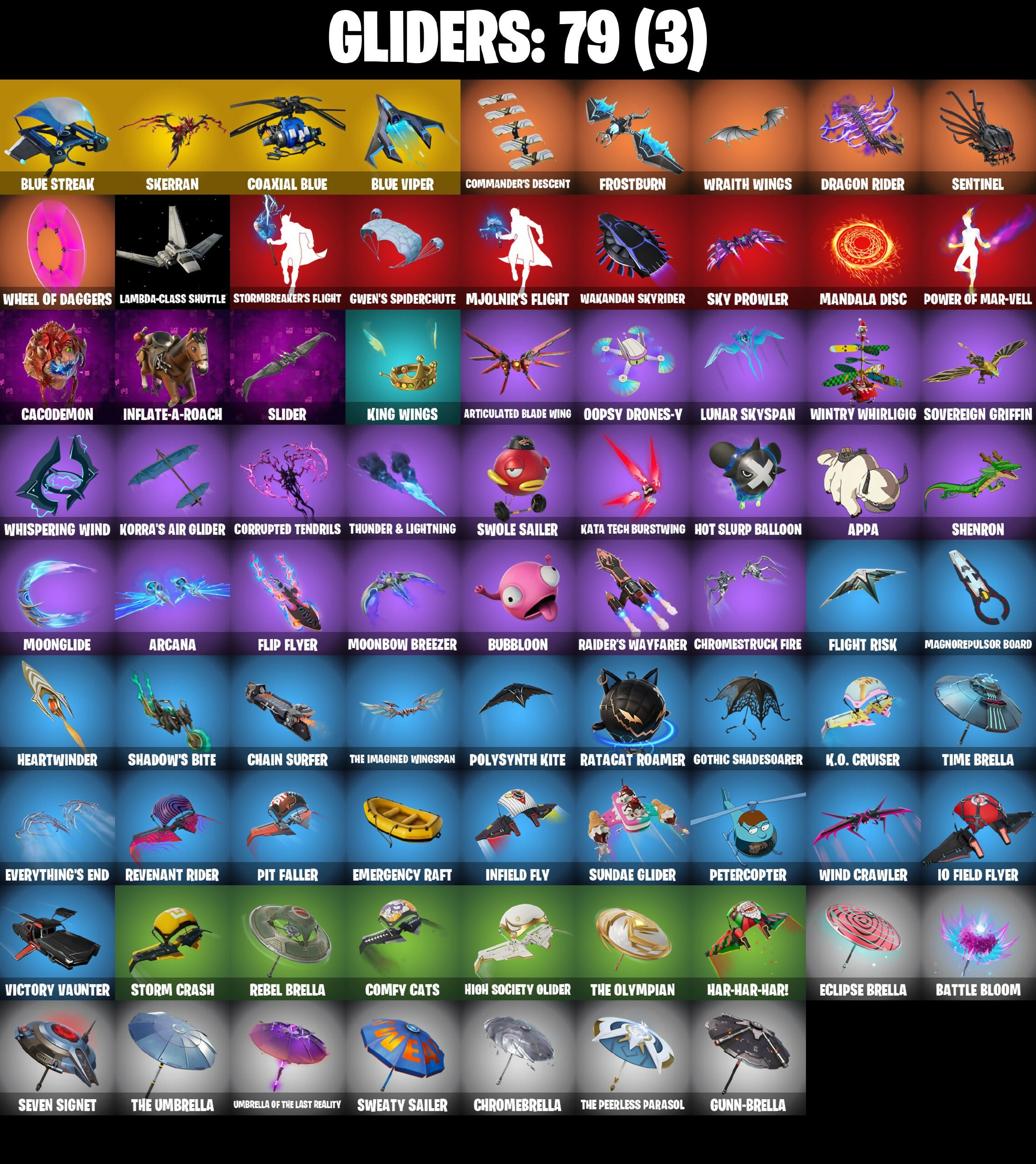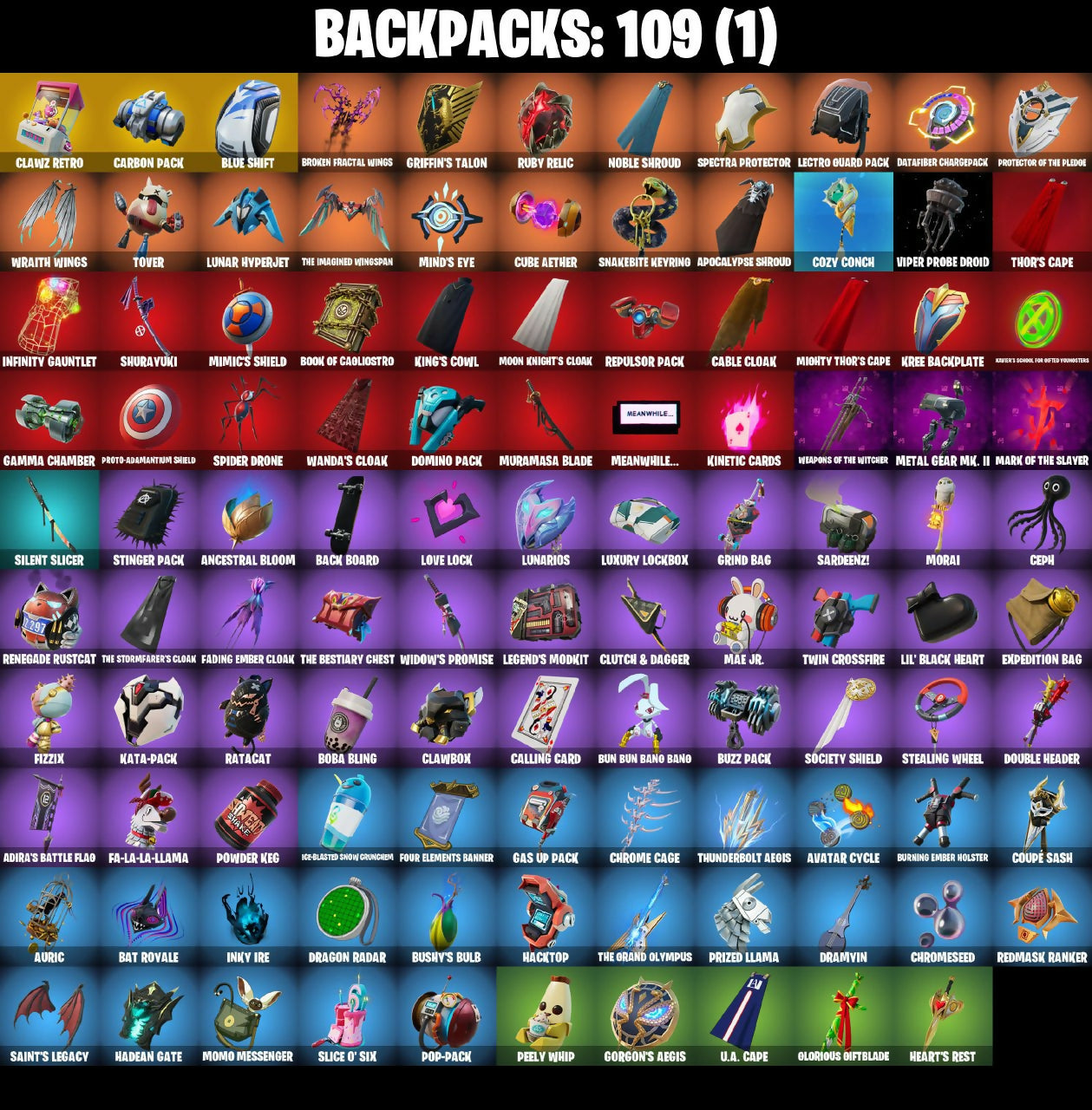 2.0's Revenge, Aang, Aang's Air Sphere, Absenz, Abyssal Blade, Adira (Battle Mask), Adira's Armor, Adira's Battle Flag, Ahsoka Tano, Ahsoka's Staff, Air Nomad Staff, Alfred, Alpha Staff, Anantotta Raid King, Ancestral Bloom, Anti Fade Mask, Antonia, Aphrodite, Apocalypse Shroud, Apocalypse Zero, Appa, Arachrobatics, Arcana, Arclcerboticks, Arctic Adeline, Ark Nomad Staff, Aron's Battle Flag, Articulated Blade Wing, Ascension Nezumi, Ascension Skin Nezumi, Astro Armor, Astro Assassin, Aubroma's Staff, Auric, Avatar Cycle, Avatar State Aang, Avatar's Flourish, Baba Vaga, Baba Yaga, Back Board, Backbud Blades, Backup Blades, Baffled Along, Balance Board, Balanced, Balanced Board, Basic Basher, Bat Royale, Battle Bloom, Battle of the Slayer, Beatz Bunny, Beatzbunny, Behoiled Majuder, Big Bite, Birthday Basher, Blaawie, Black Panther, Blade Of The Waning Moon, Blade of the Epoch, Blade's Gauntlet, Bladed Gauntlet, Blazing Fire Cerberus, Blazing Red Cerberus, Blizzard Bomber, Blowin' Up, Blue Shift, Blue Streak, Blue Striker, Blue Team Leader, Blue Viper, Blue Wiper, Board Brasier, Board Breaker, Boba Bling, Boba Sheck, Boba Snack, Boba The Boba, Bolt Blades, Bonus Heart, Boogie Down, Book Of Caoliostro, Book of Cauldron, Book of the OG, Boosting Ki, Boosting WI, Brauny Bunny, Breakbone Trident, Breakshore Trident, Broad Drone Lance, Broken Fractal Wings, Brown Faction Ninja, Bubblion, Bubbloon, Bubby's Bub, Bulma's Magic, Bun Bun Band Band, Bun Bun Bang Bang, Burning Dragon, Burning Ember Glaive, Burning Ember Holster, Bushy's Bulb, Buttoned Up, Buzz Pack, Bytes (Lone Traveler), CYCLO CUR, Cable, Cable Cloak, Cacodemon, Called Shot, Calling Card, Cap K.O., Captain America, Captain Marvel, Capture & Build Theme, Carbon Commando, Carbon Pack, Ceph, Cerberus Bite, Chain Surfer, Chaos Hand Axe, Chapter 3 Island Theme, Chapter 4 Island Theme, Chapter 5 Island Theme, Charge!, Charging Strike, Charging Up, Choice Knit, Choice Vent, Chrome Cage, Chrome Marked, Chrome Punk, Chromebrella, Chromeforce Riot, Chromeseed, Chromestruck Fire, Chromopulsar, Chromospeed, Clara, Clashmeister 3000, Clavez Bistro, Claw Through, Clawbox, Claws Hand Axe, Clawz Retro, Club President Helsie, Clutch & Dagger, Coaxial Blue, Collector Kado Thorne, Comfy Cats, Commander's Descent, Commanders Descent, Conch Call, Conjure Empowerment, Conjure Weapon, Copycat's Sword, Coral Crush, Corrupted Rift Edges, Corrupted Tendrils, Cosmic Space Gloves, Could A Beast, Coupe Sash, Coupé Seas, Cozy Coach, Cozy Conch, Crack It, Crailster Capetown, Crakle It, Crescent Darts, Crescent Shroom, Crescent Staff Edges, Crime Doll, Crocodile Blade, Crowning Achievement, Crucible Blade, Cube Aether, Cubed, Cubic Aether, Cubic Scepter, Cupid, Cyber Smoodo, Cyclo Curl, Dagger Dance, Daisies, Dameborn Deathshine, Dark Duck Duck, Dartfire Challenge, Darth Shader, Darth Vader, Datafiber Chargepack, Dawn Duelist Nisha, Dawn Golden's Mask, Demolisher, Dengar Baton, Designated Hitters, Desmon Atritters, Dev'O Glove, Dice Roll, DingRay, Dirtbike Challenge, Distressed, Do The 'Split, Doctor Jones, Doctor Strange, Dodger Dance, Dodo Calicom, Domino, Domino Pack, Doom Bangle, Double Header, Double Headers, Doza'Lab, Doze Dab, Dragon Radar, Dragon Rider, Dragoon Rune Lance, Dramvin, Dramyin, Drift-Walker, Driftwalker, Dualies, Duelist's Foil, Duklet's Foil, Dumbbell Driver, Dusty, Ebunny Bot, Eclipse Brella, Eclipse Scroll, ElectroStatic Spear, Elegance Blade, Ember Baton, Emergency Raft, Energy Claw, Ensnared, Epitaph Edge, Erisa, Erisa's Crest, Eternal Knight, Everything's End, Evie (Summer Strider), Exile's Emblem, Expedition Bag, Eye of the Twelve, Fa-La-La-Llama, Fading Ember Cloak, Fairy Flast, Fanged Foreshight, Fanged Foresight, Fashion Flayer, Figure Skating Skeleton, Final Eclipse, Final Harbinger, Finnish Line, Fishbone Flayer, Fishy Flex, Fizzix, Fizzle, Flaky Feast, Flash Of Lightning, Flashback Breakdown, Flight Risk, Flip Flyer, Foil Flex, Forge Elements Banner, Four Elements Banner, Freyanges, Frostburn, Fryangles, GG, Gambit, Gamma Chamber, Gas Up Pack, Gilded Heart, Glorious Giftblade, Gogo Leafy, Gordon's Ankus, Gorgon's Aegis, Gothic Saddler, Gothic Shadesoarer, Green Light, Griffin's Talon, Grind Bag, Gringle Gift, Grozzy Cooper, Grrizzy Gooper, Guardian Daggers, Gum Brawler, Gum-Baller, Gunn-Brella, Gunnar, Gunnar's Special, Gwen's Spiderchute, Gwent's Spidercrat, Hacktop, Hadean Gate, Happy Heart, Har-Har-Har!, Harbinger Armor Омегавок, Haute Hustle, HaxsaUR, Haxseoul, Headband Gate, Headstrong Comb, Hear-Bar-Hard, Heart's Carver, Heart's Desire, Heart's Rest, Hearth's Rest, Heartwinder, Hearty Wonder, Heraldic, Hexture, Hi, Hidandsu Skydrider, Hide and Seekblade Shield, High Slayi Rhino, High Society Glider, High Stakes, Hodgsons of the Flame, Hodin Knights Cloak, Holly Hatchets, Hope, Horned Heart, Hot Slug Balloon, Hot Slurp Balloon, Hulk, Hulk (Silently Devouring), Hulk Smash!, Hunter Purple, Hypnot-Eyes, I'm A Mystery, I.O Field Flyer, IO Field Flyer, Ice Smile, Ice-Blasted Snow Grinch Gem, Igni Sign, Ignin Sign, Imperial March, Imperial Marsh, In Love, Indiana Jones (Temple Explorer), Indy IRK, Infaltra-X Roach, Inferno, Infidel Bay, Infield Fly, Infinity Gauntlet, Inflate-A-Roach, Influential, Inky Ire, Iron Doggy Guide, Iron Man 2020, Iron Man Zero, It Is Finished, It's Litzz, It's... You?, Joker, Jon-Reav-2, Jun-Hwan, Junkbot Approved, Just Desserts, K.O. Club, K.O. Cruiser, Kata Tech Burstwing, Kata-Pack, Kay, Keata-Pack, Kiara K.O. (Captain's Bomber), Killed It, Kinetic Cards, King Wings, King's Covel, King's Cowl, Kitao Tech Sunglasses, Koma'a Air Glider, Korra's Air Glider, Kree Backplate, Krisabelle, Kulka, Lady In Gold, Lambda-Class Shuttle, Lampida-Class Sentinel, Lasanar Topia, Laser Focused, Lectro Guard Pack, Lectro Tech, Lectrostatic Impactor, Legend's Modkit, Legend's Retribution, Legendary Blade Of Insight, Legends Moonlit, Lego Fortnite Theme, Lennox Rose, License Slayer, Lichguard Page, Lil' Black Heart,