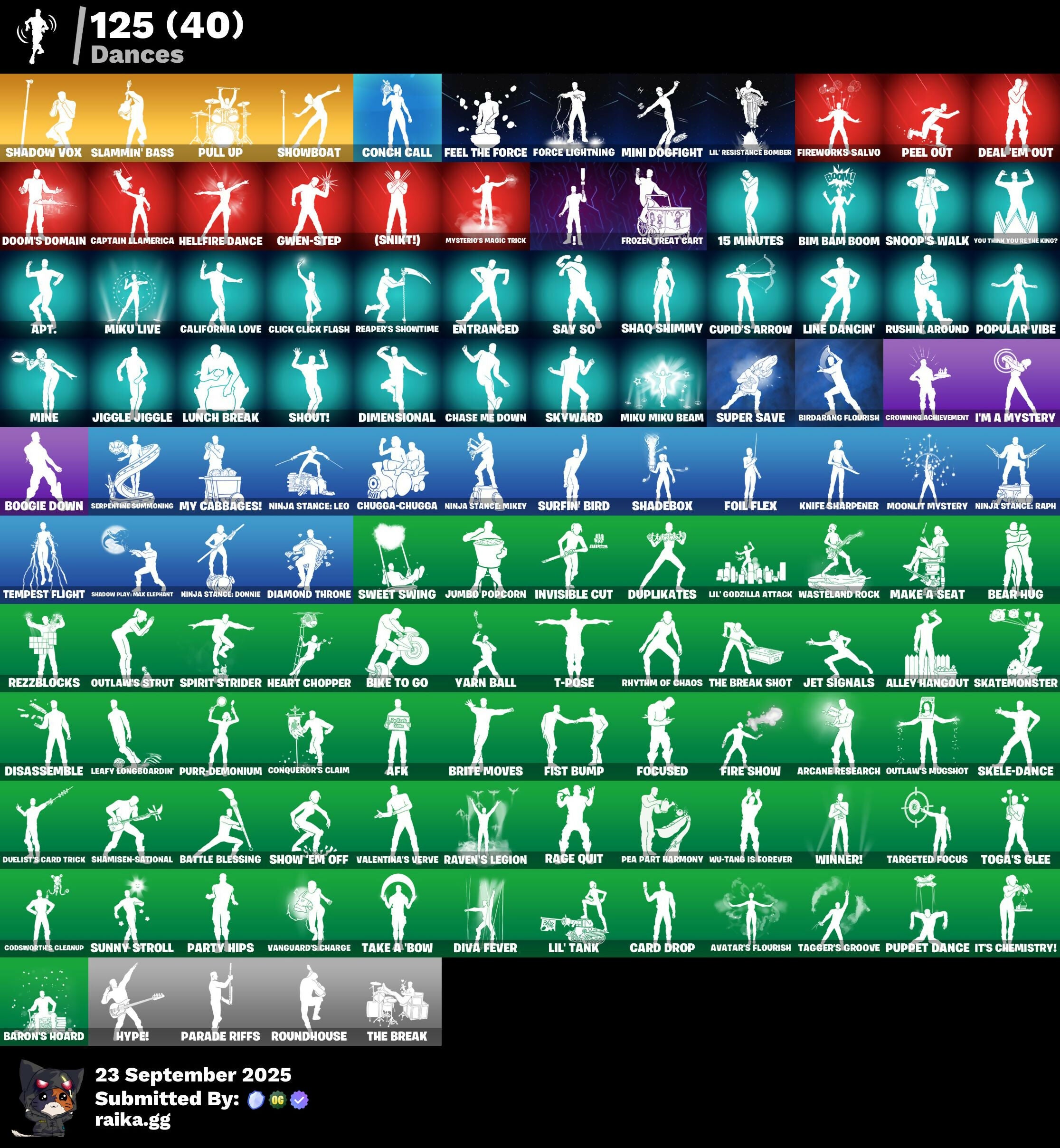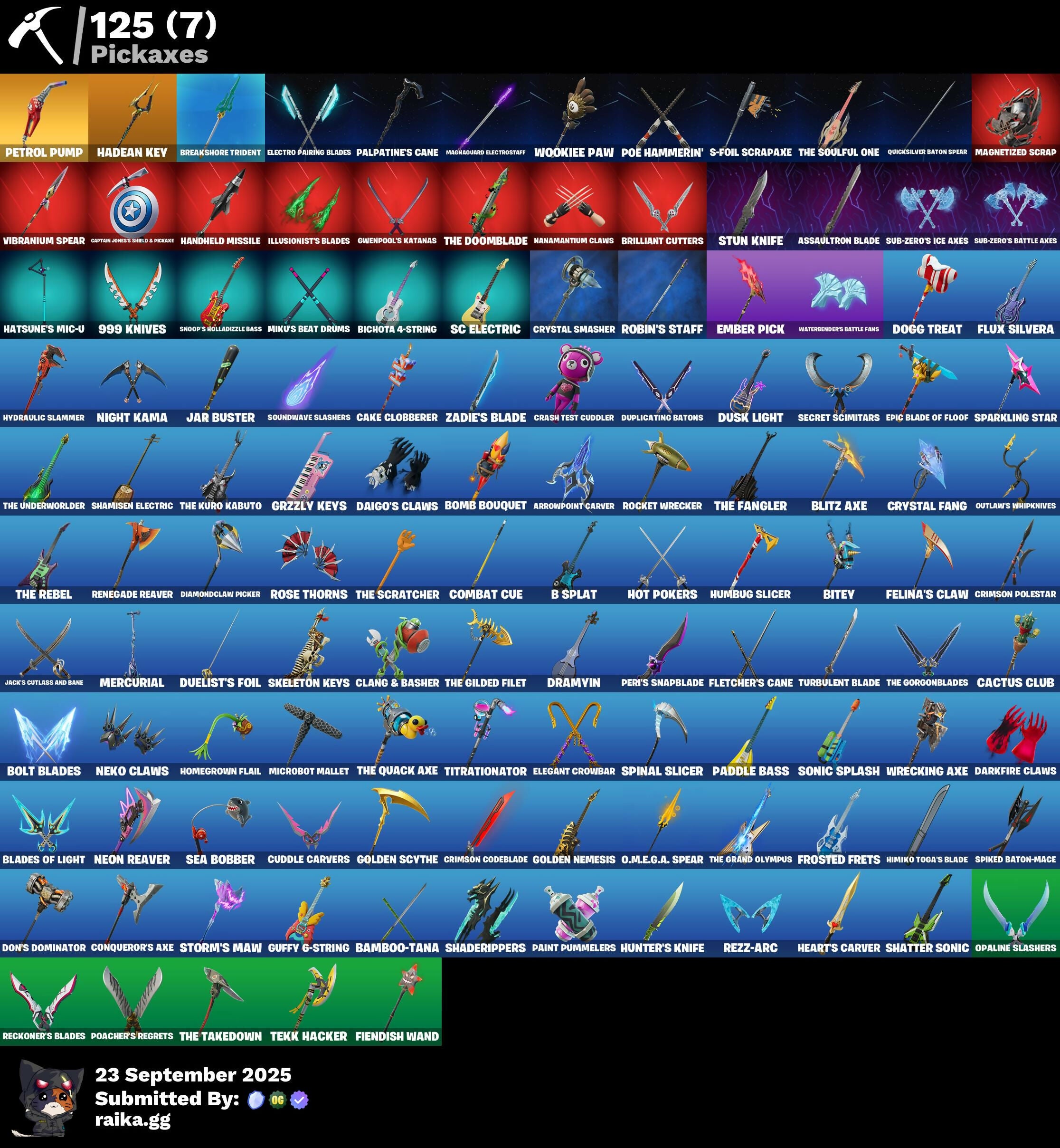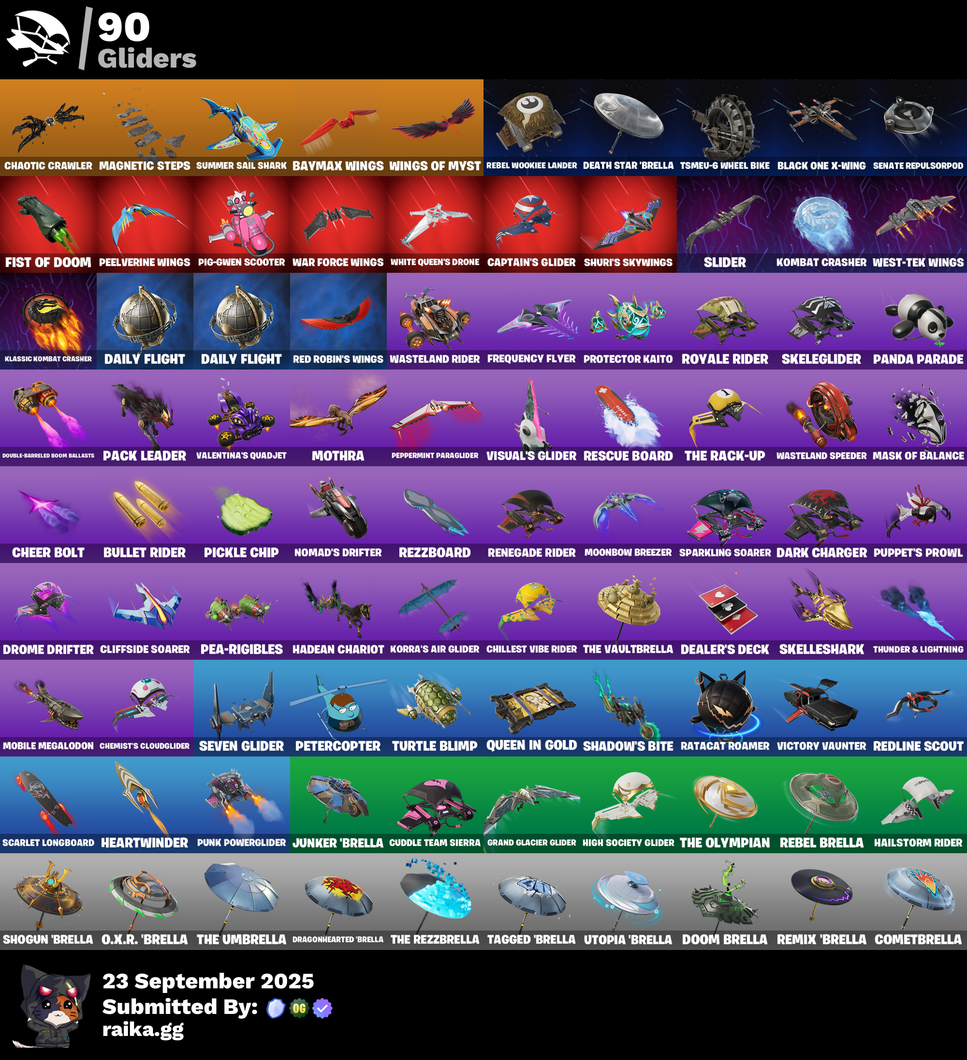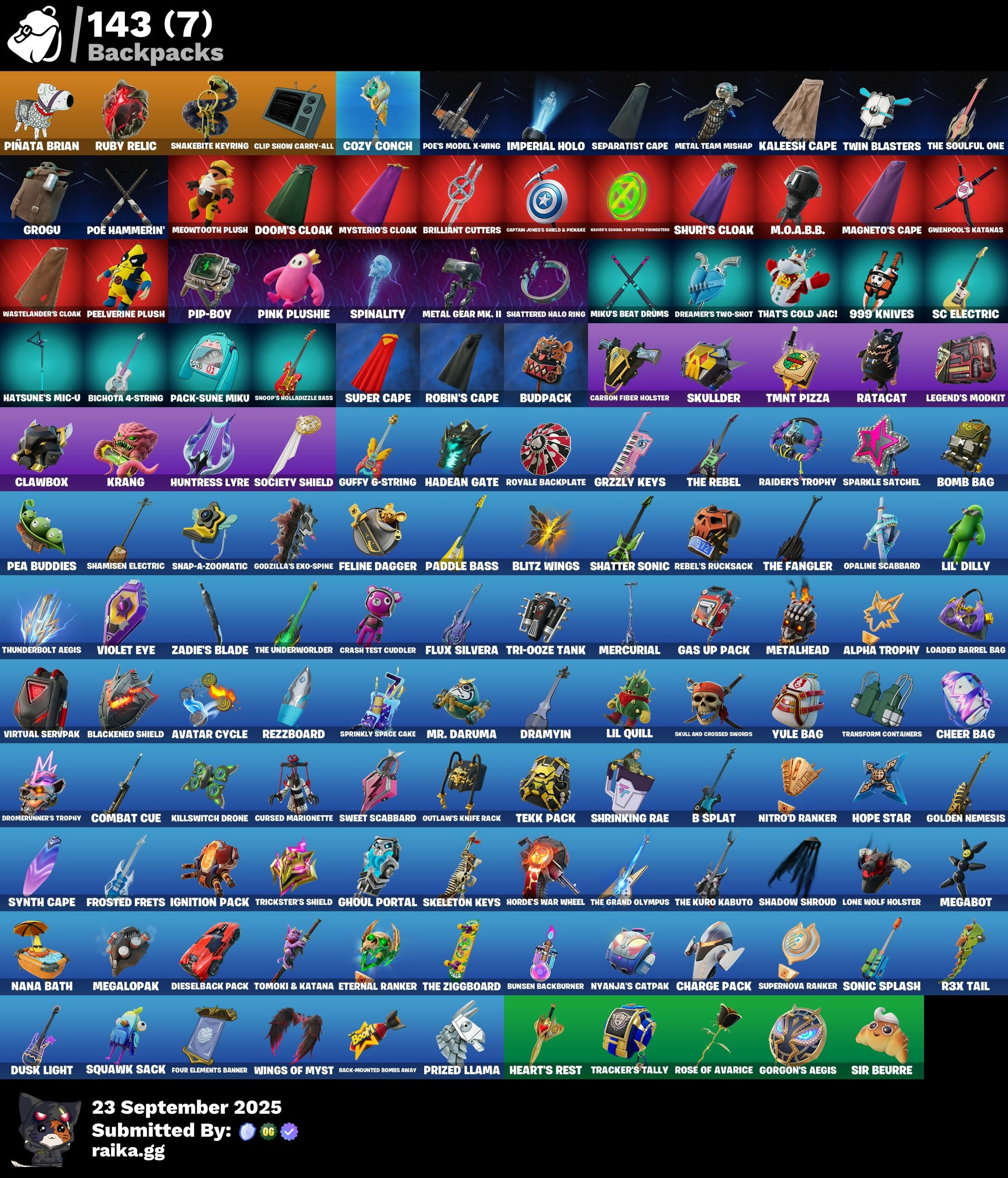 !Hype!, (Snikt!), 15 Minutes, 999 Knives, AFK, Aerial Assault Captain, Alley Hangout, Alpha Trophy, Aphrodite, Apprentice Evie, Apt., Arcane Research, Arrowpoint Carver, Artemis, Assaultron Blade, Avatar Cycle, Avatar's Flourish, B Splat, Back-Mounted Bombs Away, Balanced, Bamboo-Tana, Baron's Hoard, Battle Blessing, Baymax Wings, Bear Hug, Bi-Han, Bichota 4-String, Bike To Go, Bim Bam Boom, Birdarang Flourish, Bitey, Black Knight T-60 Power Armor, Black One X-Wing, Black Panther (Shuri), Black Queen, Blackened Shield, Blades Of Light, Blazing Fire Cerberus, Blitz Axe, Blitz Wings, Bolt Blades, Bomb Bag, Bomb Bouquet, Boogie Down, Breakshore Trident, Brilliant Cutters, Brite Moves, Budge, Budpack, Bullet Rider, Bunsen Backburner, Burning Ambition Valeria, Cactus Club, Cake Clobberer, California Love, Camo War Machine, Captain Jones, Captain Jones's Shield & Pickaxe, Captain Llamerica, Captain's Glider, Carbon Fiber Holster, Card Drop, Cassidy Quinn, Chalked Up 1-Ball, Chaotic Crawler, Charge Pack, Chase Me Down, Cheer Bag, Cheer Bolt, Chemist's Cloudglider, Chill Challenger, Chillest Vibe Rider, Chugga-Chugga, Clang & Basher, Classic Peelverine, Clawbox, Click Click Flash, Cliffside Soarer, Clip Show Carry-All, Codsworth's Cleanup, Combat Cue, Cometbrella, Conch Call, Conqueror's Axe, Conqueror's Claim, Cozy Conch, Crash Test Cuddler, Crimson Codeblade, Crimson Polestar, Crowning Achievement, Crystal Fang, Crystal Smasher, Cuddle Carvers, Cuddle Team Sierra, Cupid's Arrow, Cursed Marionette, Daigo's Claws, Daily Flight, Dancefloor Diva, Dark Charger, Dark Gwenpool, Darkfire Claws, Darklands Brite Raider, Dawn Duelist Nisha, Deal 'Em Out, Dealer's Deck, Death Star 'Brella, Demon Hunter Hope, Diamond Throne, Diamondclaw Picker, Dieselback Pack, Dillinger The Gherk, Dimensional, Disassemble, Diva Fever, Dogg Treat, Don's Dominator, Doom Brella, Doom's Cloak, Doom's Domain, Double-Barreled Boom Ballasts, Dragonhearted 'Brella, Dramvin, Dramyin, Dreamer's Two-Shot, Drome Drifter, Dromerunner's Trophy, Duelist's Card Trick, Duelist's Foil, Dupli-kate, Duplicating Batons, Duplikates, Dusk Knight, Dusk Light, Dynamo Tntoon-A, Electro Pairing Blades, Elegant Crowbar, Ember Pick, Emperor Palpatine, Energized Godzilla, Entranced, Epic Blade Of Floof, Eternal Ranker, Fancy Peter Griffin, Feel The Force, Felina, Felina's Claw, Feline Dagger, Fiendish Wand, Fire Show, Fireworks Salvo, Fist Bump, Fist Of Doom, Fletcher's Cane, Flux Silvera, Focused, Foil Flex, Force Lightning, Four Elements Banner, Frequency Flyer, Frosted Frets, Frozen Treat Cart, Full Moon Fletcher Kane, Games Manager, Gas Up Pack, General Grievous, Ghoul Portal, Glam Gunner, Glass Bridge Survivor, Godzilla's Exo-Spine, Golden Conqueror, Golden Nemesis, Golden Scythe, Gorgon's Aegis, Grand Glacier Glider, Grizzly Keys, Grogu, Grzzly Keys, Guardian Jade, Guffy 6-String, Gunslinger Outlaw Midas, Gwen-Step, Gwenpool's Katanas, Hadean Chariot, Hadean Gate, Hadean Key, Hailstorm Rider, Handheld Missile, Hatsune Miku, Hatsune's Mic-U, Haylee Skye, Heart Chopper, Heart's Carver, Heart's Rest, Heartwinder, Hellfire Dance, High Society Glider, Himiko Toga, Himiko Toga's Blade, Homegrown Flail, Hope, Hope Star, Horde's War Wheel, Hot Pokers, Humbug Slicer, Hunter's Knife, Huntress Lyre, Hydraulic Slammer, I'm A Mystery, Ignition Pack, Illusionist's Blades, Illusory Mysterio, Immortal Form, Imperial Holo, Invisible Cut, It's Chemistry!, Jack's Cutlass And Bane, Jackie, Jar Buster, Jet Signals, Jiggle Jiggle, Jumbo Popcorn, Junker 'Brella, Kaleesh Cape, Karuta Harley Quinn, Killswitch, Killswitch Drone, Kintsugi Daigo, Klassic Kombat Crasher, Knife Sharpener, Kombat Crasher, Korra's Air Glider, Krang, Leafy Longboardin', Legend's Modkit, Lightrider, Lil Quill, Lil' Dilly, Lil' Godzilla Attack, Lil' Resistance Bomber, Lil' Tank, Lina Scorch, Line Dancin', Loaded Barrel Bag, Lone Wolf Holster, Lucky Nyanja, Lunch Break, M.O.A.B.B., Magmatic Poseidon, Magnaguard Electrostaff, Magnetic Steps, Magnetized Scrap, Magneto, Magneto's Cape, Make A Seat, Mask Of Balance, Medusa, Megabot, Megalopak, Meowtooth Plush, Mercurial, Metal Gear Mk. II, Metal Team Mishap, Metalhead, Microbot Mallet, Midnight Skye, Miku Live, Miku Miku Beam, Miku's Beat Drums, Mine, Mini Dogfight, Mobile Megalodon, Moonbow Breezer, Moonlit Mystery, Morgan Myst, Mothra, Mr. Daruma, My Cabbages!, Mysterio's Cloak, Mysterio's Magic Trick, Nana Bath, Nanamantium Claws, Neko Claws, Neon Reaver, Night Hunter Scarr, Night Kama, Ninja Stance: Donnie, Ninja Stance: Leo, Ninja Stance: Mikey, Ninja Stance: Raph, Nitro Flare Machinist, Nitro Fusion Megalo Don, Nitro'd Ranker, Nomad's Drifter, Nyanja's Catpak, O.M.E.G.A. Spear, O.X.R. 'Brella, Old Snake, Opaline Scabbard, Opaline Slashers, Outlaw's Knife Rack, Outlaw's Mugshot, Outlaw's Strut, Outlaw's Whipknives, Oxide Rust, Pack Leader, Pack-Sune Miku, Paddle Bass, Paint Pummellers, Palpatine's Cane, Panda Parade, Pandora's Armor Doom, Parade Riffs, Party Hips, Pea Buddies, Pea Part Harmony, Pea-Rigibles, Peel Out, Peelverine Plush, Peelverine Wings, Peppermint Paraglider, Peri, Peri's Snapblade, Petercopter, Petrol Pump, Phthalo Blue Joss, Pickle Chip, Pig-Gwen Scooter, Pinata Brian, Pink Plushie, Pip-Boy, Poacher's Regrets, Poe Dameron, Poe Hammerin', Poe's Model X-Wing, Polar Team Specialist, Popular Vibe, Prized Llama, Protector Kaito, Pull Up, Punk Powerglider, Puppet Dance, Puppet's Prowl, Purr-Demonium, Queen In Gold, Quicksilver Baton Spear, R3X Tail, Racer Kendo, Rage Quit, Raider's Trophy, Ratacat, Ratacat Roamer, Raven Team Syd, Raven's Legion, Reaper's Showtime, Rebel Brella, Rebel Wookiee Lander, Rebel's Rucksack, Reckoner's Blades, Red Robin's Wings, Redline Scout, Relaxed Runner, Remix 'Brella, Renegade Racer, Renegade Reaver, Renegade Rider, Rescue Board, Restored Night Rose, Rezz-Arc, Rezzblocks, Rezzboard, Rhythm Of Chaos, Robin, Robin's Cape, Robin's Staff, Rocket Wrecker, Rogue, Rose Thorns, Rose of Avarice, Rough Cut Monta