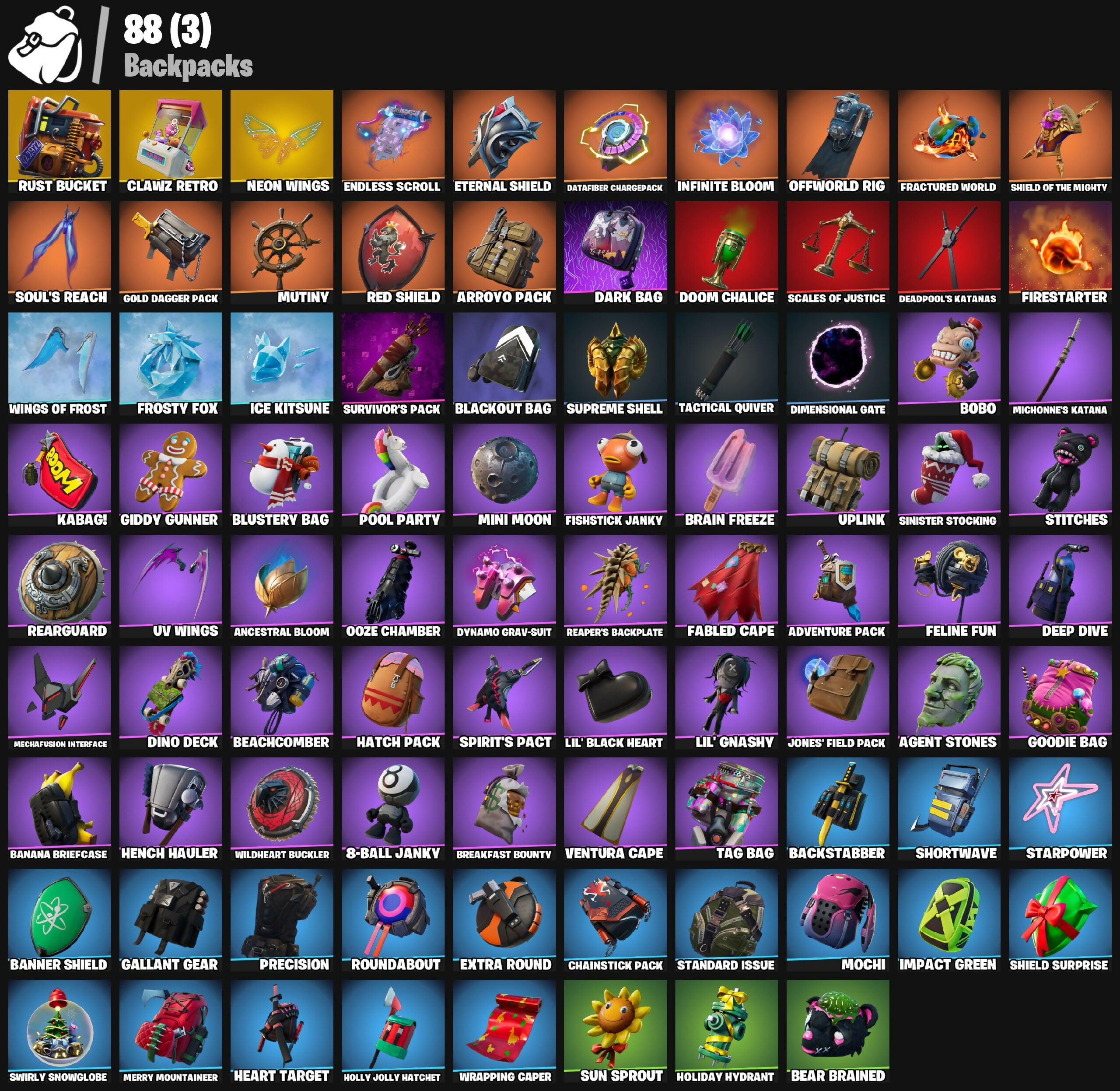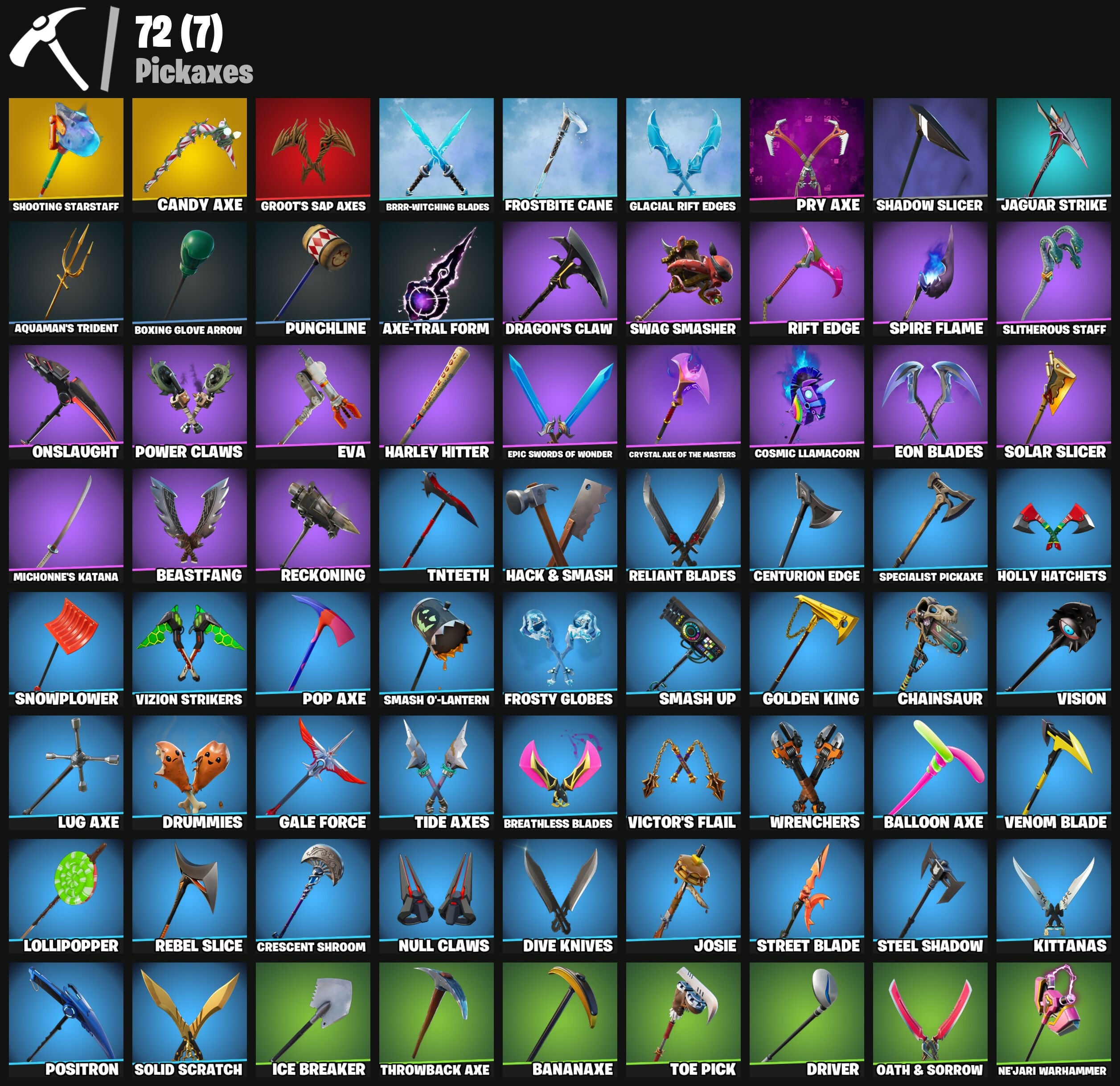 8-Ball Janky, A Warrior Prepares, Abstrakt, Adventure Pack, Afterparty, Agent Jones, Agent Peely, Agent Stones, Air Shredder, Ancestral Bloom, Aquaman, Aquaman's Trident, Arroyo Pack, Aura, Axe-Tral Form, Azarath Metrion Zinthos!, Bachii, Backstabber, Balloon Axe, Banana Briefcase, Bananaxe, Banner Shield, Battlehawk, Beachcomber, Bean Bag, Bear Brained, Beastfang, Beep Beep, Blackheart, Blackout Bag, Blaze, Blinky, Blustery Bag, Bobo, Boogie Down, Boomin', Boots 'N' Cats, Boxing Glove Arrow, Brain Freeze, Breakfast Bounty, Breathless Blades, Brrr-Witching Blades, Brutus, Build Up, Burpee, Calamity, Calculated, Call Me, Candy Axe, Carbide, Cardistry, Centurion, Centurion Edge, Chainsaur, Chainstick Pack, Chaos Agent, Chapter 3 Island Theme, Chapter 4 Island Theme, Chapter 5 Island Theme, Choice Knit, Clawz Retro, Clean Sweep, Cluck, Coin Flip, Cosmic Llamacorn, Crescent Shroom, Crystal, Crystal Axe of the Masters, DJ Yonder, Dark Bag, Dark Bomber, Datafiber Chargepack, Deadpool, Deadpool's Katanas, Deep Dive, Dimensional Gate, Dino Deck, Dive Knives, Dizzie, Doom Chalice, Dragon Stance, Dragon's Claw, Drift, Driver, Drummies, Dynamo Grav-Suit, Electro Swing, Endless Scroll, Eon Blades, Epic Swords of Wonder, Eternal Knight, Eternal Shield, Eva, Evasive Maneuvers, Extra Round, Fabled Cape, Fade, Feline Fun, Firestarter, Fishstick Janky, Flip Reset, Flippin' Away, Fractured World, Frost Broker, Frost Squad, Frostbite Cane, Frosted Flurry, Frosty Fox, Frosty Globes, Fryangles, Galaxia, Gale Force, Gallant Gear, Gangnam Style, Gear Specialist Maya, Gentleman's Dab, Get Loose, Ghoul Trooper, Giddy Gunner, Ginger Gunner, Glacial Rift Edges, Gnash, Gold Dagger Pack, Gold Midas, Golden King, Goodie Bag, Grave, Green Arrow, Groot's Sap Axes, Groove Jam, Hack & Smash, Hang Loose Celebration, Harley Hitter, Harley Quinn, Hatch Pack, Have A Seat, Heart Target, Heart-Stopper, Hench Hauler, Holiday Hydrant, Holly Hatchets, Holly Jolly Hatchet, Holly Striker, Huntress, Hybrid, Hype, I Sits, I'm Diamond, Ice Breaker, Ice Kitsune, Impact Green, Infinite Bloom, Iris, It's Dynamite!, Jabba Switchway, Jaguar Strike, Jolly Jammer, Jones' Field Pack, Josie, Jubilation, Jules, Kabag!, Karve, Keyed Up, Kit, Kittanas, Kondor, Krisabelle, Kyra, Lace, Lara Croft, Last Forever, Lego Fortnite Theme, Lexa, Lil' Black Heart, Lil' Gnashy, Living Large, Lobby Classic, Lollipopper, Lug Axe, Lyra, Mancake, Mandalorian, Mashed Potato, Mave, Mechafusion Interface, Members Only, Menace, Meowscles, Merry Mountaineer, Michonne, Michonne's Katana, Michonnes Katana, Mini Moon, Mochi, Mutiny, My World, Nailed It, Ne'Jari Warhammer, Neon Wings, Never Gonna, Neymar Jr, Nog Ops, Null Claws, Oath & Sorrow, Ocean, Offworld Rig, Omega, Onslaught, Ooze Chamber, Orange Justice, Out West, Out With The Old, Pandemonium, Par Patroller, Paws & Claws, Pirouette, Planetary Vibe, Polar Peely, Pool Party, Pop Axe, Popcorn, Positron, Power Claws, Precision, Predator, Pry Axe, Punchline, Rage Quit, Raise The Roof, Raz, Reaper's Backplate, Rearguard, Rebel Slice, Rebirth Raven, Reckoning, Recon Ranger, Red Knight, Red Shield, Red-Nosed Raider, Redline, Reese, Regal Wave, Reliant Blades, Respect, Rift Edge, Ring It On, Roundabout, Ruby Shadows, Rust Bucket, Salute, Sasquatchin', Savage, Scales Of Justice, Scarlet Commander, Scuba Jonesy, Seeker, Shadow Slicer, Shield Of The Mighty, Shield Surprise, Shooting Starstaff, Shortwave, Side Hustle, Sing Along, Sinister Stocking, Siona, Sky Shadow, Skye, Sledgehammer, Slitherous Staff, Smash O'-Lantern, Smash Up, Snow Drift, Snowheart, Snowmando, Snowplower, So Square, Solar Slicer, Solid Scratch, Soul's Reach, Specialist Pickaxe, Spire Assassin, Spire Flame, Spirit's Pact, Springy, Squad Leader, Staff Stand, Standard Issue, Star-Spangled Ranger, Starpower, Steel Shadow, Stitches, Stormy, Street Blade, Sun Sprout, Sun Strider, Supreme Shell, Surf Rider, Surf Witch, Survivor's Pack, Swag Smasher, Swipe It, Swirly Snowglobe, Tactical Quiver, Tag Bag, Take A 'Bow, Tarana, Teknique, The Renegade, The Rick Dance, The Silencer, The Visitor, Throwback Axe, Tide Axes, Tippy Tap, Tnteeth, Tntina, Toe Pick, Toosie Slide, UV Wings, Uplink, Valor, Venom Blade, Ventura, Ventura Cape, Verve, Victor's Flail, Violet, Vision, Vizion Strikers, Vulcan Salute, Wakandan Salute, Wave, Wild, Wildheart Buckler, Wings of Frost, Wrapping Caper, Wrenchers, Yellowjacket, You're Awesome, Yule Trooper, Zoey