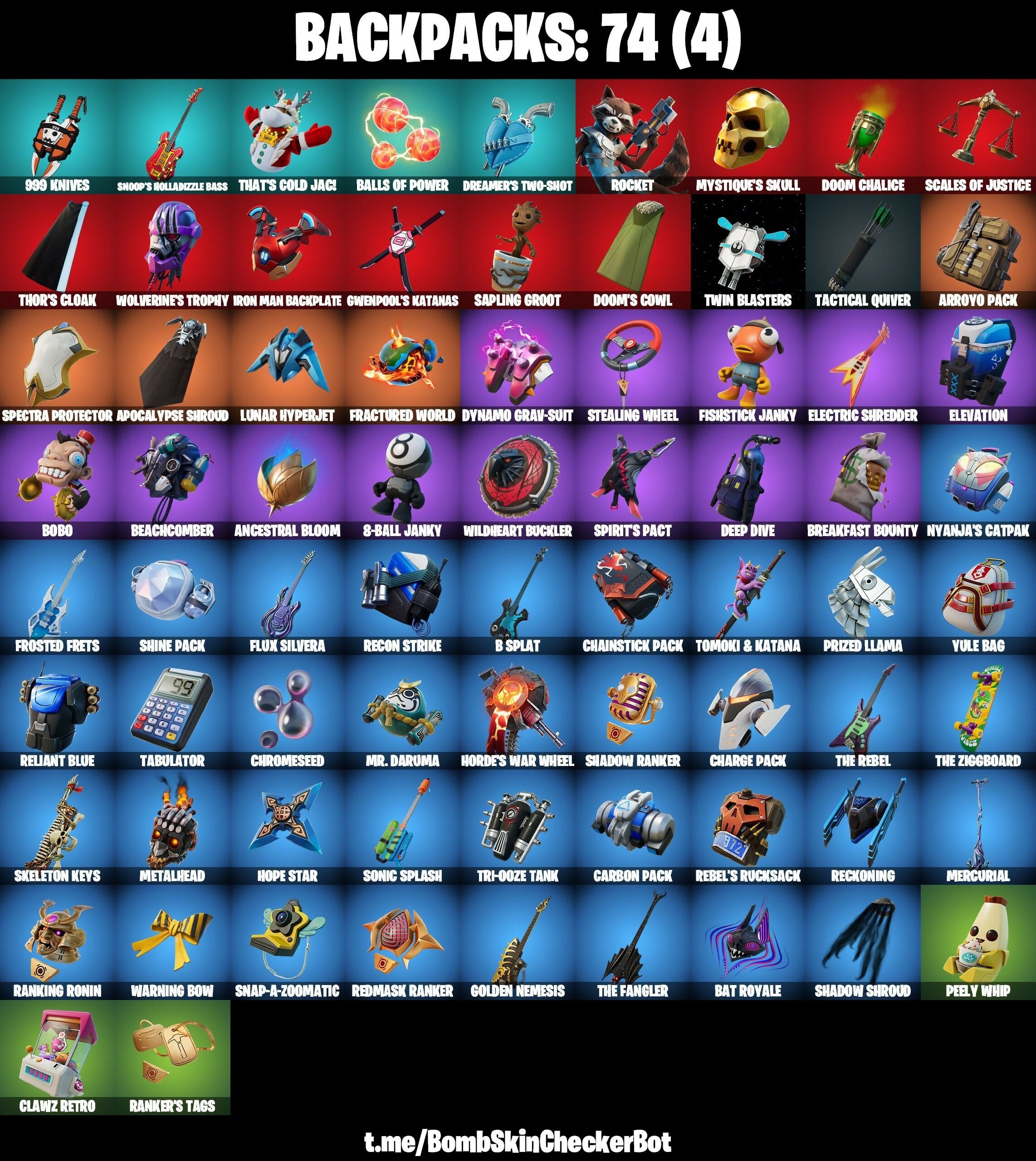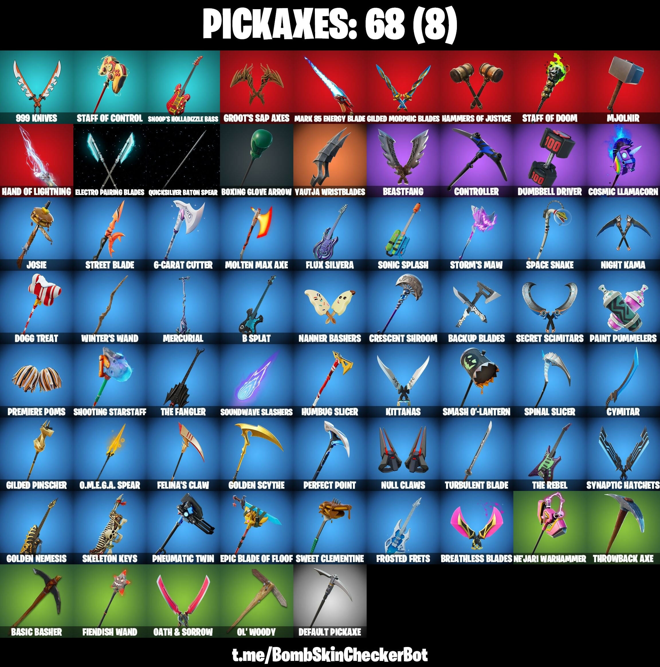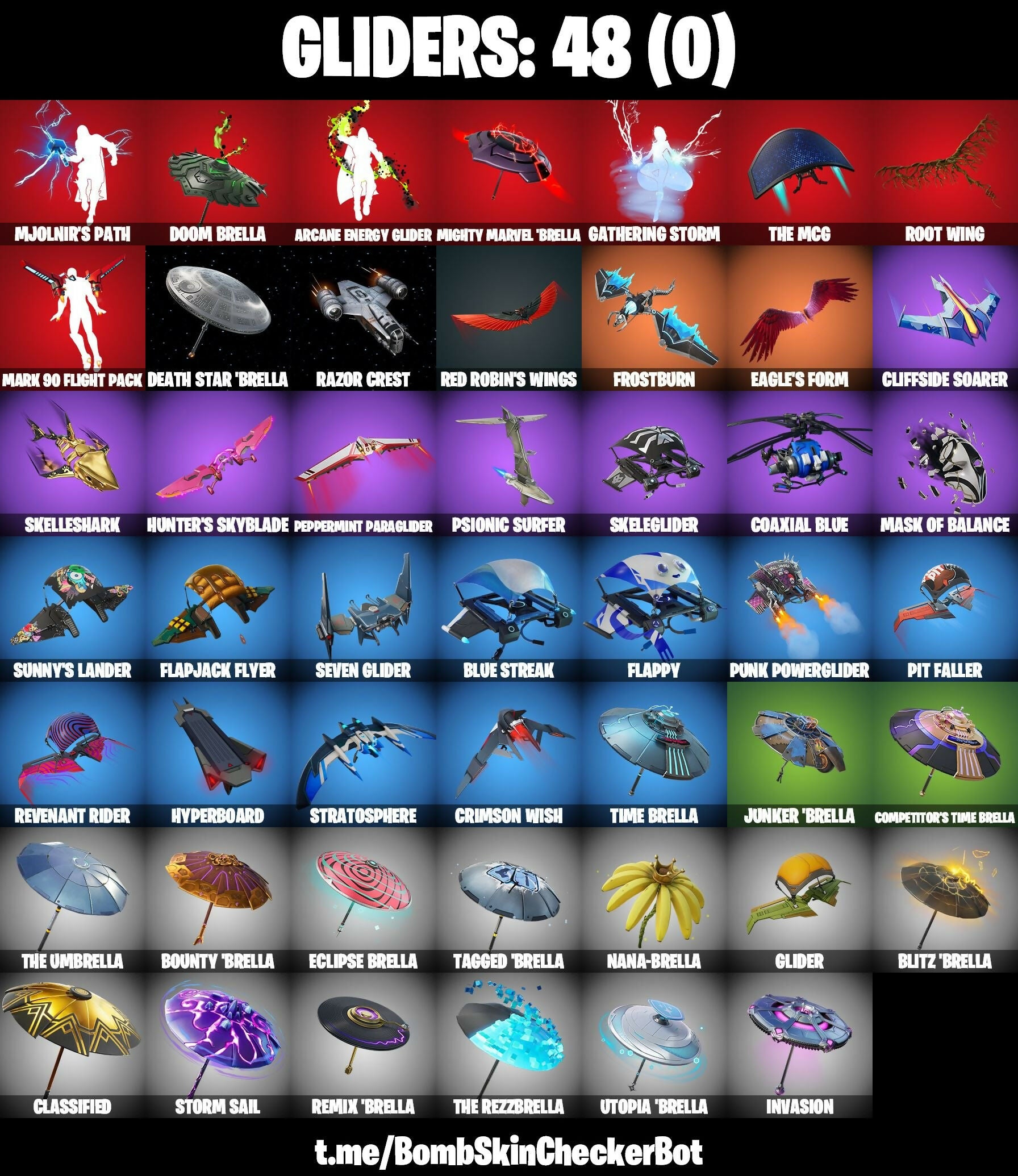 6-Carat Cutter, 8-Ball Janky, 999 Knives, Ancestral Bloom, Apocalypse Shroud, Arcane Energy Glider, Arroyo Pack, B Splat, Backup Blades, Balls Of Power, Basic Basher, Bat Royale, Battle Call, Beachcomber, Beastfang, Blitz 'Brella, Blitz Knight, Blue Streak, Blue Team Leader, Bobo, Boogie Down, Boomin', Bounty 'Brella, Boxing Glove Arrow, Breakfast Bounty, Breaking Point, Breathless Blades, Call Me, Carbon Commando, Carbon Pack, Cauldron Chill, Chainstick Pack, Charge Pack, Chromeseed, Classified, Clawz Retro, Clean Sweep, Cliffside Soarer, Cloud Striker, Coaxial Blue, Competitor's Time Brella, Controller, Controller Crew, Cosmic Llamacorn, Crescent Shroom, Crimson Wish, Crowning Achievement, Cymitar, Dance Moves, Death Star 'Brella, Deep Dive, Default Pickaxe, Diamond Diva, Doctor Doom, Dogg Treat, Doom Brella, Doom Chalice, Doom's Cowl, Doze Dab, Dreamer's Two-Shot, Drop The Bass, Dumbbell Driver, Dynamo Grav-Suit, Eagle's Form, Eclipse Brella, Electric Shredder, Electro Pairing Blades, Elevation, Epic Blade of Floof, Felina, Felina's Claw, Fiendish Wand, Fishstick Janky, Fist Bump, Fixer, Flapjack Flyer, Flappy, Flippin' Away, Flux Silvera, Fractured World, Frostburn, Frosted Frets, Galaxia, Gathering Storm, Gentleman's Dab, Gilded Morphic Blades, Gilded Pinscher, Glider, Golden Nemesis, Golden Scythe, Green Arrow, Groot, Groot's Sap Axes, Gwenpool's Katanas, Hammers of Justice, Hand of Lightning, Have A Seat, Hope Star, Horde's War Wheel, Humbug Slicer, Hunter's Skyblade, Hyperboard, Introducing..., Invasion, Iron Man Backplate, Jennifer Walters, Jet Signals, Josie, Junker 'Brella, Kittanas, Kondor, Last Forever, Lexa, Lunar Hyperjet, M-Jolnir, Make A Seat, Mancake, Mandalorian, Mark 85 Energy Blade, Mark 90 Flight Pack, Mask Of Balance, Mave, Members Only, Mercurial, Metal Team Leader, Metalhead, Midas' Shadow, Mighty Marvel 'Brella, Mjolnir's Path, Molten Max Axe, Mr. Daruma, Mystique, Mystique's Skull, Nana-Brella, Nanner Bashers, Ne'Jari Warhammer, Night Kama, Null Claws, Nyanja's Catpak, O.M.E.G.A. Spear, Oath & Sorrow, Ol' Woody, Paint Pummelers, Peely Whip, Peppermint Paraglider, Perfect Point, Pit Faller, Pneumatic Twin, Point Patroller, Polar Peely, Predator, Premiere Poms, Prized Llama, Prodigy, Psionic Surfer, Punk Powerglider, Quicksilver Baton Spear, Ranker's Tags, Ranking Ronin, Razor Crest, Rebel's Rucksack, Reckoning, Recon Strike, Red Robin's Wings, Redmask Ranker, Reese, Regal Wave, Reliant Blue, Remix 'Brella, Respect The Peace, Revenant Rider, Rocket, Rollie, Root Wing, Santa Dogg, Sapling Groot, Scales Of Justice, Scootin', Scorecard, Secret Scimitars, Seeker, Seven Glider, Shadow Ranker, Shadow Shroud, Shine Pack, Shooting Starstaff, Sing Along, Skeleglider, Skeleton Keys, Skellshark, Slayer Juice Wrld, Smash O'-Lantern, Snap-A-Zoomatic, Snoop's Holladizzle Bass, Sonic Splash, Soundwave Slashers, Space Snake, Spectra Protector, Spinal Slicer, Spirits Pact, Staff of Control, Staff of Doom, Stand Surfer, Stealing Wheel, Storm, Storm Sail, Storm's Maw, Stratosphere, Street Blade, Sultura, Sunny's Lander, Sweet Clementine, Sweet!, Synaptic Hatchets, Tabulator, Tactical Quiver, Tagged 'Brella, Tagger's Groove, Take A 'Bow, Take The Cake, That's Cold Jac!, The Break Shot, The Fangler, The Mcg, The Rebel, The Rezzbrella, The Rick Dance, The Umbrella, The Ziggboard, TheGrefg, Thor, Thor's Cloak, Throwback Axe, Time Brella, Tomoki & Katana, Tony Stark, Tri-Ooze Tank, Trilogy, Turbulent Blade, Twin Blasters, Utopia 'Brella, Vulcan Salute, Warning Bow, Wildheart Buckler, Winter's Wand, Wolverine, Wolverine's Trophy, Yautja Wristblades, Yule Bag, Yulejacket