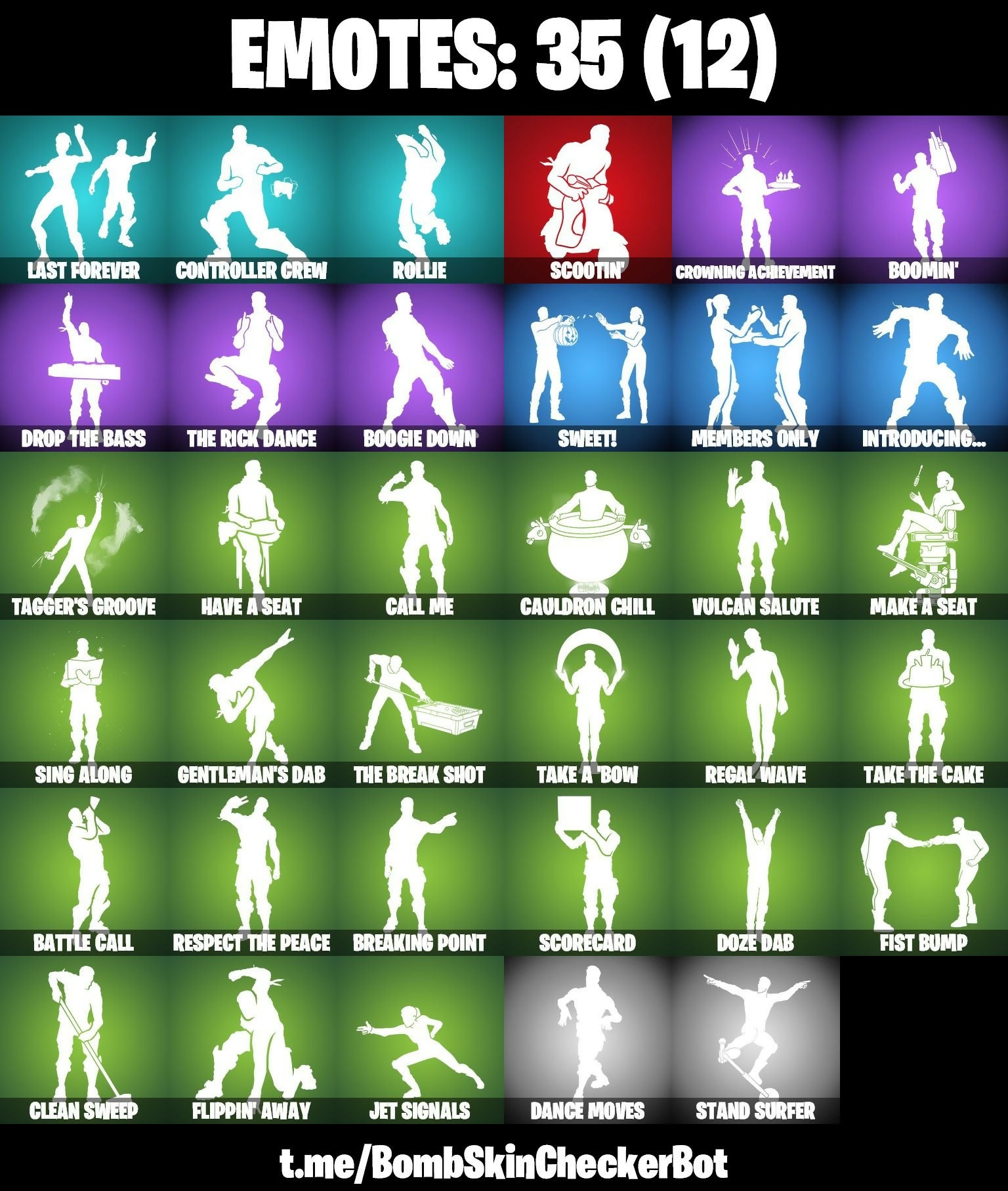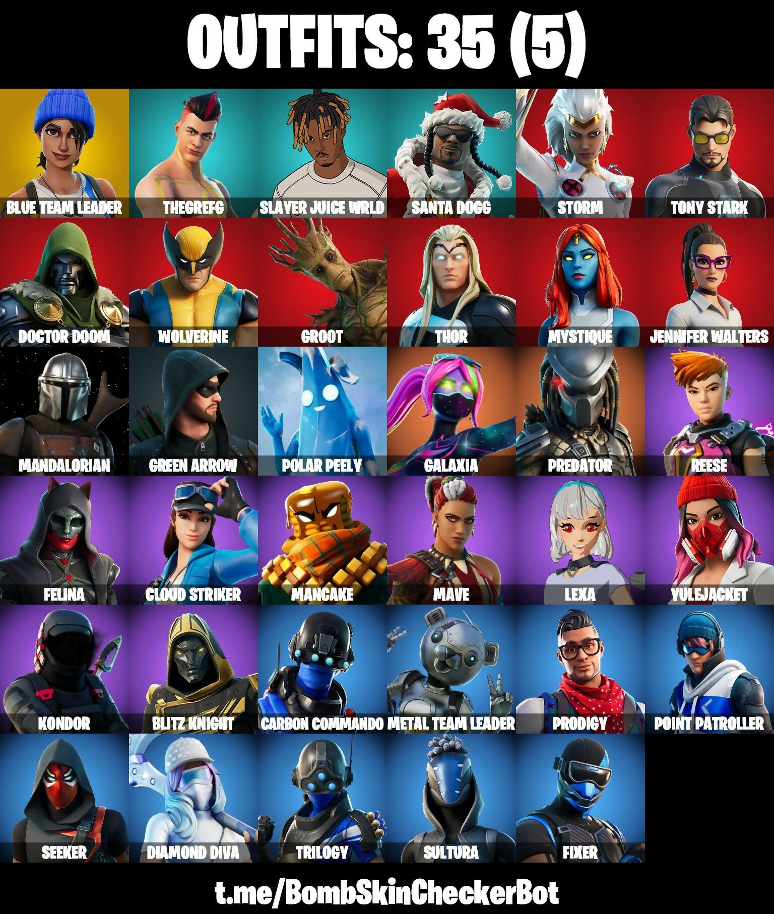 Blue Team Leader, TheGrefg, Slayer Juice WRLD, Santa Dogg, Storm, Tony Stark, Doctor Doom, Wolverine, Groot, Thor, Mystique, Jennifer Walters, Mandalorian, Green Arrow, Polar Peely, Galaxia, Predator, Reese, Felina, Cloud Striker, Mancake, Mave, Lexa, Yulejacket, Kondor, Blitz Knight, Carbon Commando, Metal Team Leader, Prodigy, Point Patroller, Seeker, Diamond Diva, Trilogy, Sultura, Fixer.