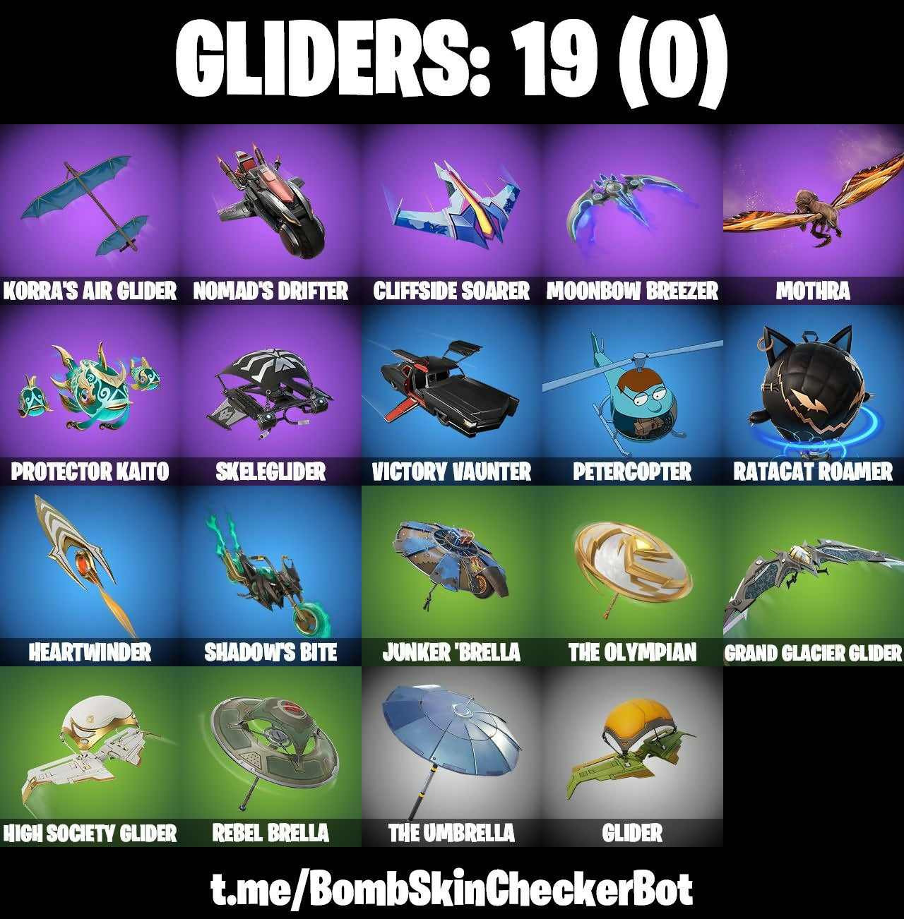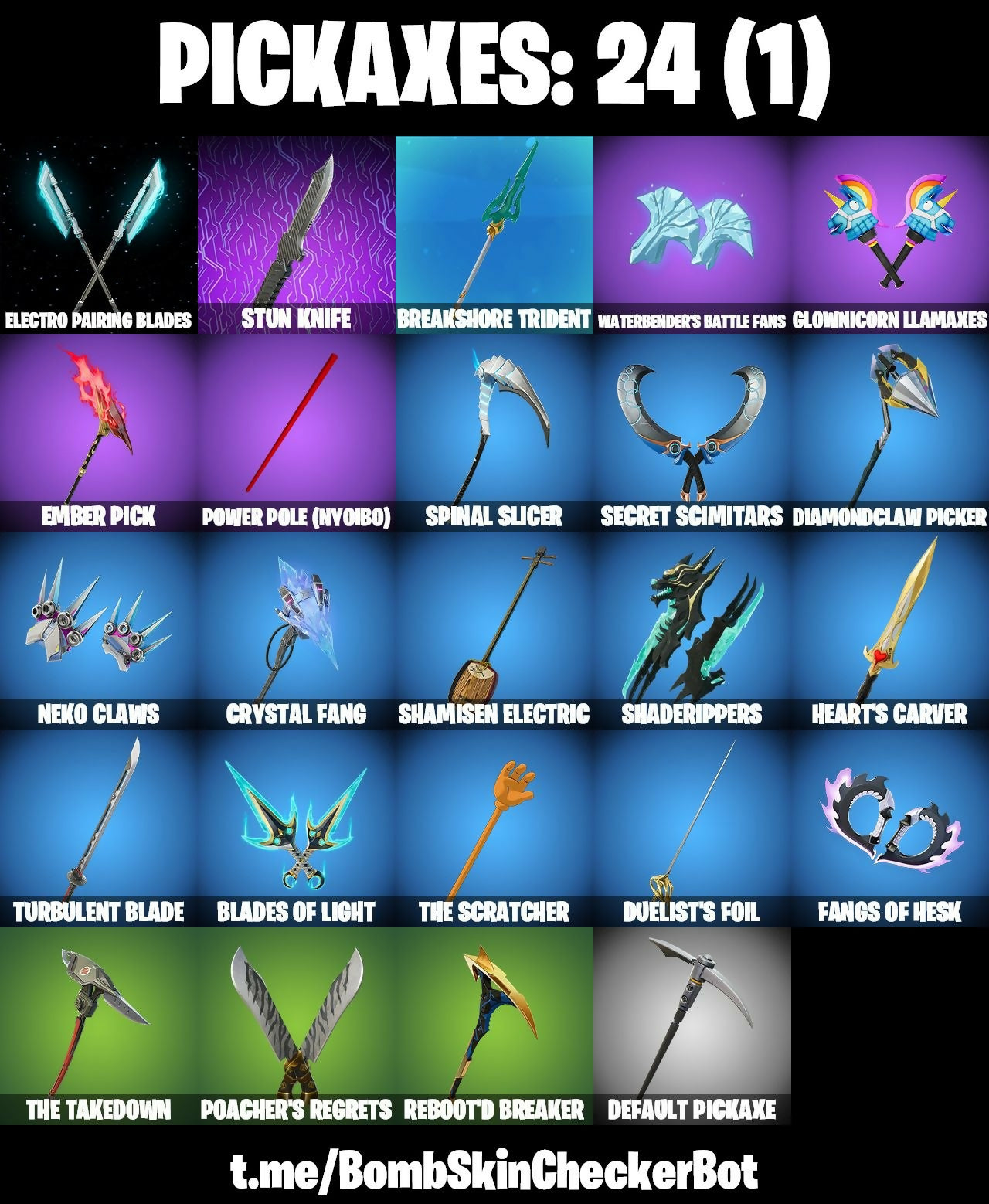 Aphrodite, Avatar's Flourish, Blades Of Light, Boogie Down, Breakshore Trident, Carbon Fiber Holster, Cerberus, Clawbox, Cliffside Soarer, Conch Call, Cozy Conch, Crowning Achievement, Crystal Fang, Dance Moves, Default Pickaxe, Diamond Throne, Diamondclaw Picker, Dieselback Pack, Duelist's Foil, Electro Pairing Blades, Ember Pick, Eternal Ranker, Fangs Of Hesk, Foil Flex, Fusion! Hah!!, Glider, Glownicorn Llamaxes, Godzilla Evolved, Godzilla's Exo-Spine, Grand Glacier Glider, Hadean Gate, Heart's Carver, Heart's Rest, Heartwinder, High Society Glider, Holo-Boot Pack, Hope, I'm A Mystery, Invisible Cut, Jackie, Jade, Jet Signals, Junker 'Brella, Kendo, Knife Sharpener, Korra, Korra's Air Glider, Lana Ilane, Legend's Modkit, Lil' Godzilla Attack, Llamaphonic Blaster, Make A Seat, Metalhead, Montague, Moonbow Breezer, Mothra, Mr. Daruma, Neko Claws, Nisha, Nomad's Drifter, Nyanja, Nyanja's Catpak, Oscar, Peter Griffin, Petercopter, Piñata Brian, Poacher's Regrets, Poseidon, Power Pole (Nyoibo), Prized Llama, Protector Kaito, Ratacat, Ratacat Roamer, Rebel Brella, Rebel's Rucksack, Reboot'd Breaker, Ruby Relic, Secret Scimitars, Shadebox, Shaderippers, Shadow's Bite, Shamisen Electric, Shamisen-sational, Silas Hesk, Sir Beurre, Skeleglider, Society Emblem Ranker, Society Shield, Son Goku, Spinal Slicer, Stun Knife, Sweet Swing, The Break, The Olympian, The Scratcher, The Serpentine, The Takedown, The Umbrella, Tomoki & Katana, Turbulent Blade, Valeria, Vengeance Jones, Victory Vaunter, Waterbender's Battle Fans, Yarn Ball