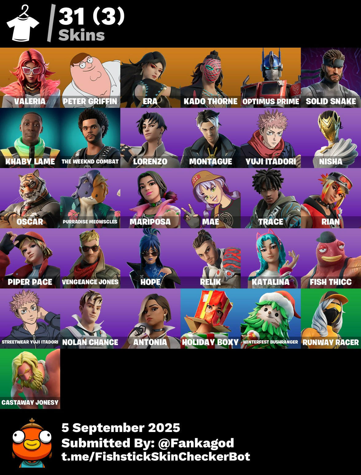 The Weeknd Combat | Khaby Lame | Solid Snake | Valeria | Optimus Prime | Peter Griffin | Era | Kado Thorne | Antonia | Vengeance Jones | Trace | Hope | Lorenzo | Streetwear Yuji Itadori | Purradise Meowscles | Oscar | Relik | Fish Thicc | Katalina | Yuji Itadori | Nolan Chance | Mariposa | Nisha | Montague | Mae | Rian | Piper Pace | Holiday Boxy | Winterfest Bushranger | Castaway Jonesy | Runway Racer