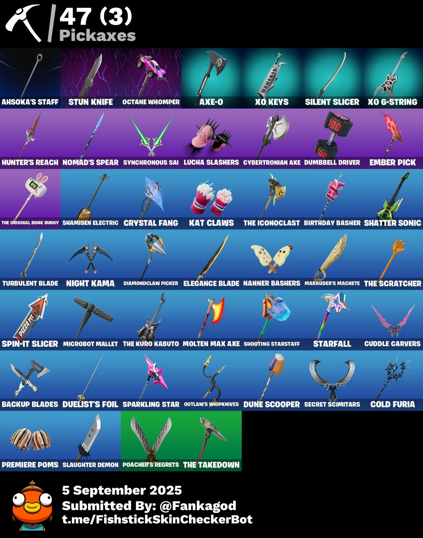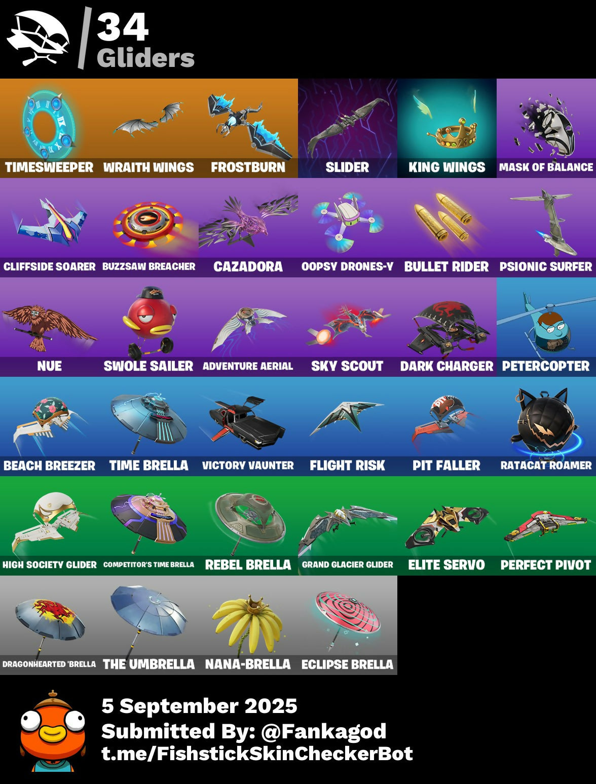 Adventure Aerial, Ahsoka's Staff, Antonia, Apocalypse Shroud, Auto Clutch, Autobot Emblem, Axe-O, Backup Blades, Bat Royale, Beach Breezer, Beach-Blasted Shark's Tank, Beacon Glass, Bedside Nanner, Big Fan, Birthday Basher, Blackened Shield, Boogie Down, Bullet Rider, Buzzsaw Breacher, Calico-Conut, Call Me, Carbon Fiber Holster, Castaway Jonesy, Cazadora, Cazadora Wings, Chronos Lock, Clawbox, Clawz Retro, Cliffside Soarer, Clutch & Dagger, Cold Furia, Competitor's Time Brella, Count It!, Crack It, Crowning Achievement, Crystal Fang, Cuddle Carvers, Culture Festival Dance, Cursed Energy, Cybertronian Axe, Dark Charger, Diamond Throne, Diamondclaw Picker, Dice Roll, Doze Dab, Dragonhearted 'Brella, Dramatic Flares, Duelist's Foil, Dumbbell Driver, Dune Scooper, Eclipse Brella, Electric Shredder, Elegance Blade, Elite Servo, Ember Pick, Era, Fang Dance, Fish Thicc, Fist Bump, Flaky Feast, Flight Risk, Flippin' Away, Foil Flex, Frostburn, Get Griddy, Get Out Of Your Mind, Glorious Giftblade, Godzilla's Exo-Spine, Grand Glacier Glider, Gwenpool's Katanas, Heartburst, High Society Glider, Holiday Boxy, Hope, Hope Star, Hunter's Reach, I'm A Mystery, Kado Thorne, Kat Claws, Katalina, Katalina's Kit Bag, Khaby Lame, King Wings, Legend's Modkit, Lil' T-6 Shuttle, Lorenzo, Lucha Slashers, Luxury Lockbox, Mae, Mae Jr., Marauder's Machete, Mariposa, Mask of Balance, Metal Gear Mk. II, Microbot Mallet, Molten Max Axe, Montague, Mr. Daruma, Nana-Brella, Nanner Bashers, Nanner Ringer, Night Kama, Ninja Stance: Donnie, Ninja Stance: Leo, Nisha, Nolan Chance, Nomad's Spear, Northquester Deluxe, Nue, Nyanja's Catpak, Octane Cruiser, Octane Whomper, Oopsy Drones-Y, Optimus Prime, Oscar, Outlaw's Knife Rack, Outlaw's Whipknives, Peely Whip, Perfect Pivot, Peter Griffin, Petercopter, Piper Pace, Pit Faller, Pitcycle, Piñata Brian, Poacher's Regrets, Point & Shoot, Popular Vibe, Powder Keg, Premiere Poms, Prized Llama, Psionic Surfer, Purradise Meowscles, Ranker's Tags, Ratacat, Ratacat Roamer, Rebel Brella, Redmask Ranker, Relik, Rian, Ruby Relic, Runway Racer, Secret Scimitars, Shadow Play: Toad, Shadow Shroud, Shamisen Electric, Shatter Sonic, Shooting Starstaff, Show 'Em Off, Sigil Of The Alliance War, Signal Tracer, Silent Slicer, Sky Scout, Slaughter Demon, Slice O' Six, Slider, Society Emblem Ranker, Society Shield, Solid Snake, Sparkling Star, Spectra Protector, Spin-It Slicer, Starfall, Stealing Wheel, Streetwear Yuji Itadori, Stun Knife, Sunny Stroll, Sweet!, Swole Sailer, Synchronous Sai, TMNT Pizza, Take A 'Bow, The Break, The Dip, The Iconoclast, The Kuro Kabuto, The Original Bonk Bunny, The Scratcher, The Takedown, The Umbrella, The Weeknd Combat, This Is Fine, Time Brella, Timesweeper, Tomoki & Katana, Trace, Tsukamoto Bear, Turbulent Blade, Valeria, Vengeance Jones, Victory Vaunter, Winged Toad Summon, Winterfest Bushranger, Wraith Wings, Xo, Xo 6-String, Xo Keys, Yuji Itadori