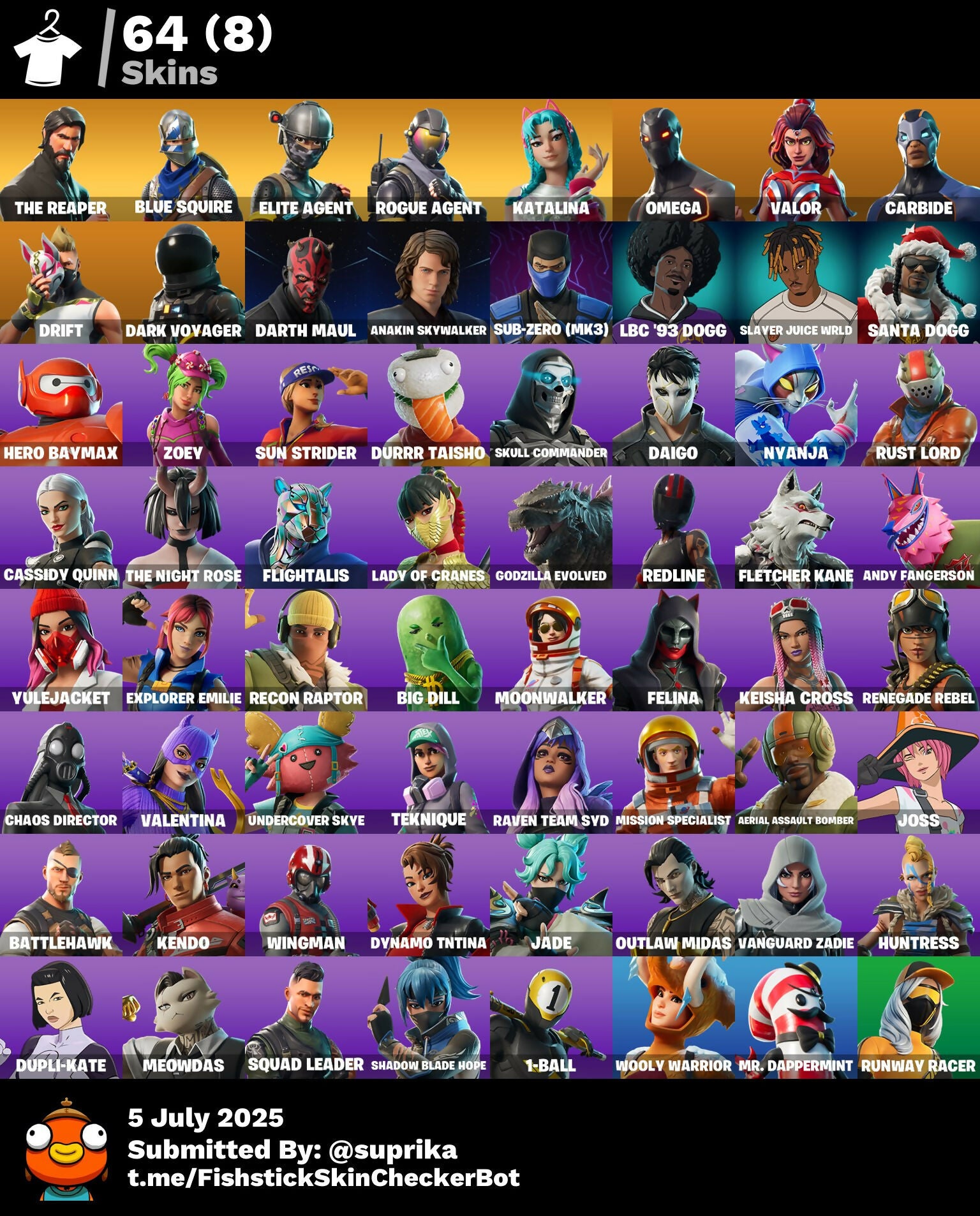 The Reaper | Blue Squire | Elite Agent | Drift | LBC '93 Dogg | Santa Dogg | Slayer Juice WRLD | Anakin Skywalker | Darth Maul | Sub-Zero (MK3) | Omega | Valor | Dark Voyager | Carbide | Kendo | Redline | Cassidy Quinn | Chaos Director | Rust Lord | Big Dill | Felina | Shadow Blade Hope | Explorer Emilie | Valentina | Fletcher Kane | Wingman | Sun Strider | Raven Team Syd | Keisha Cross | Teknique | Squad Leader | Outlaw Midas | Rogue Agent | Lady of Cranes | Mission Specialist | Aerial Assault Bomber | Nyanja | Moonwalker | Recon Raptor | Katalina | Andy Fangerson | Renegade Rebel | Jade | Dupli-Kate | Yulejacket | Vanguard Zadie | Flightalis | Hero Baymax | Godzilla Evolved | Skull Commander | 1-Ball | Meowdas | Huntress | Battlehawk | The Night Rose | Daigo | Dynamo TNTina | Zoey | Undercover Skye | Joss | Durrr Taisho | Mr. Dappermint | Wooly Warrior | Runway Racer