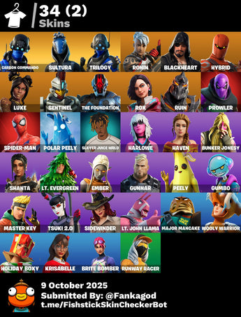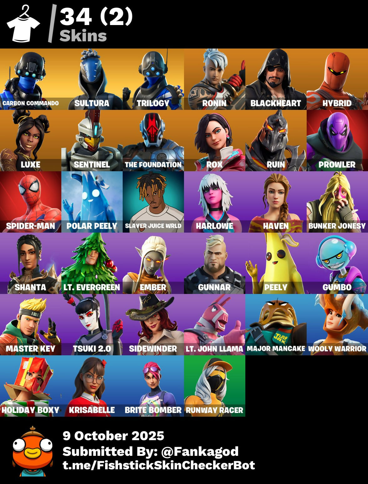 Slayer Juice WRLD | Prowler | Spider-Man | Polar Peely | The Foundation | Luxe | Blackheart | Ruin | Sentinel | Hybrid | Rox | Ronin | Harlowe | Lt. Evergreen | Tsuki 2.0 | Peely | Gunnar | Haven | Sidewinder | Shanta | Lt. John Llama | Ember | Gumbo | Bunker Jonesy | Master Key | Krisabelle | Carbon Commando | Wooly Warrior | Major Mancake | Brite Bomber | Sultura | Holiday Boxy | Trilogy | Runway Racer