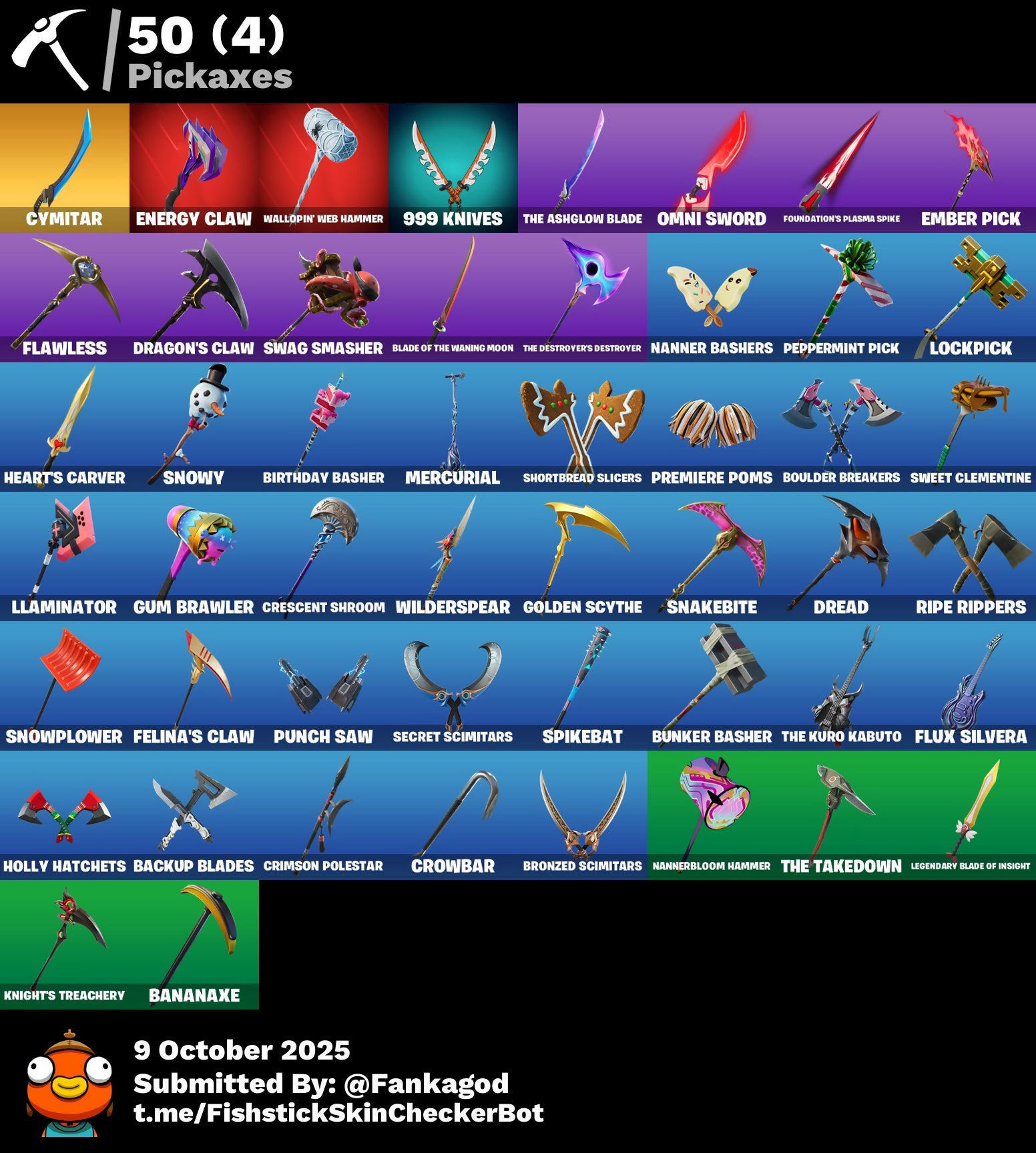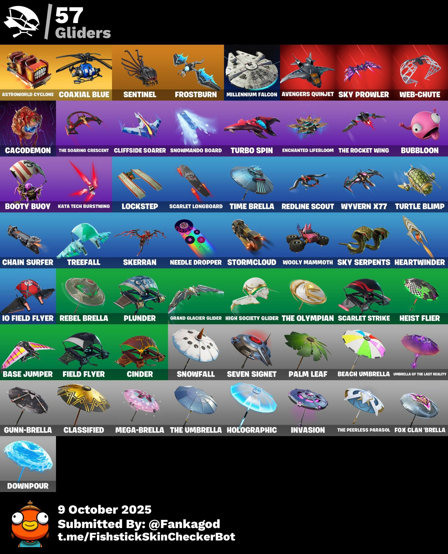 2020 Kickflip, 999 Knives, Ancestral Bloom, Apocalypse Shroud, Arroyo Pack, Astroworld Cyclone, Auto Clutch, Avengers Quinjet, Backup Blades, Bananaxe, Base Jumper, Basecamp Bag, Beach Umbrella, Birthday Basher, Blackheart, Blade Of The Waning Moon, Bladed Travpak, Boobytrapped, Booty Buoy, Boulder Breakers, Brite Bomber, Bronzed Scimitars, Bubbloon, Bunker Basher, Bunker Jonesy, Buzz Pack, Cacodemon, Call Me, Carbon Commando, Carbon Pack, Chain Surfer, Choice Knit, Cinder, Classified, Clawz Retro, Cliffside Soarer, Cluck Strut, Coaxial Blue, Cobra, Conga, Cozy Conch, Crescent Shroom, Crimson Crest, Crimson Polestar, Crowbar, Crowning Achievement, Crystal Llama, Cyclo Curl, Cymitar, Downpour, Doze Dab, Dragon Stance, Dragon's Claw, Dread, Dying Light, Ember, Ember Pick, Enchanted Lifebloom, Energy Claw, Felina's Claw, Field Flyer, Fierce, Fishstick Janky, Flawless, Flippin' Away, Flux Silvera, Foil Flex, Foundation's Mantle, Foundation's Plasma Spike, Fox Clan 'Brella, Fox Wayfinder, Frostburn, Gentleman's Dab, Glorious Giftblade, Golden Scythe, Golf Clap, Grand Glacier Glider, Gum Brawler, Gumbo, Gummy Sack, Gunn-Brella, Gunnar, Gwenpool's Katanas, Hadean Gate, Harlowe, Haven, Heart's Carver, Heartwinder, Heist Flier, Hello Friend, High Caliber, High Society Glider, Holiday Boxy, Holly Hatchets, Holographic, Hoop Master, Hot Wings, Hybrid, IO Field Flyer, Infectious, Invasion, It's... You?, Kata Tech Burstwing, Kata-Pack, Knight's Treachery, Krang, Krisabelle, Legend's Modkit, Legendary Blade Of Insight, Lil' Black Heart, Lil' Monster, Llaminator, Lockpick, Lockstep, Love It!, Lt. Evergreen, Lt. John Llama, Lunar Charge, Lunarios, Luxe, Major Mancake, Make A Seat, Master Key, Master Portal, Mega-Brella, Mercurial, Millennium Falcon, Mutiny, MwahaHa, Nailed It, Nana Nana, Nanner Bashers, Nannerbloom Hammer, Needle Dropper, Nemesis Box, Neon Menagerie, Ninja Stance: Donnie, Ninja Stance: Leo, Ninja Stance: Mikey, Ninja Stance: Raph, Nyanja's Catpak, Omni Sword, Palm Leaf, Peace Out, Peely, Peely Whip, Peppermint Pick, Piñata Brian, Plunder, Polar Peely, Premiere Poms, Prized Llama, Prowler, Punch Saw, Re-Gifter, Rebel Brella, Rebel's Rucksack, Redline Scout, Redmask Ranker, Reliant Blue, Remnant Blossom, Respect The Peace, Ripe Rippers, Ronin, Rox, Ruby Relic, Ruin, Runway Racer, Scarlet Longboard, Scarlet Strike, Secret Scimitars, Sentinel, Seven Signet, Shanta, Shaolin Sip, Sharpshooter, Shortbread Slicers, Sidewinder, Skerran, Sky Prowler, Sky Serpents, Slayer Juice Wrld, Snakebite, Snap-A-Zoomatic, Snoozefest, Snowfall, Snowmando Board, Snowplower, Snowshaker, Snowy, Society Shield, Spectra Protector, Spider-Man, Spikebat, Standing Bow, Stormcloud, Sultura, Sushi Sign, Swag Smasher, Sweet Clementine, TMNT Pizza, The Ashglow Blade, The Bestiary Chest, The Break Shot, The Destroyer's Destroyer, The Foundation, The Kuro Kabuto, The Olympian, The Peerless Parasol, The Rocket Wing, The Sith, The Soaring Crescent, The Takedown, The Umbrella, Time Brella, Trail Tote, Treefall, Tri-Ooze Tank, Trilogy, Trot Shot, Tsuki 2.0, Turbo Spin, Turtle Blimp, Umbrella Of The Last Reality, Waffler, Wallopin' Web Hammer, Web-Chute, Web-Head's Knapsack, Wilderspear, Wooly Mammoth, Wooly Warrior, Wyvern X77, Yay!