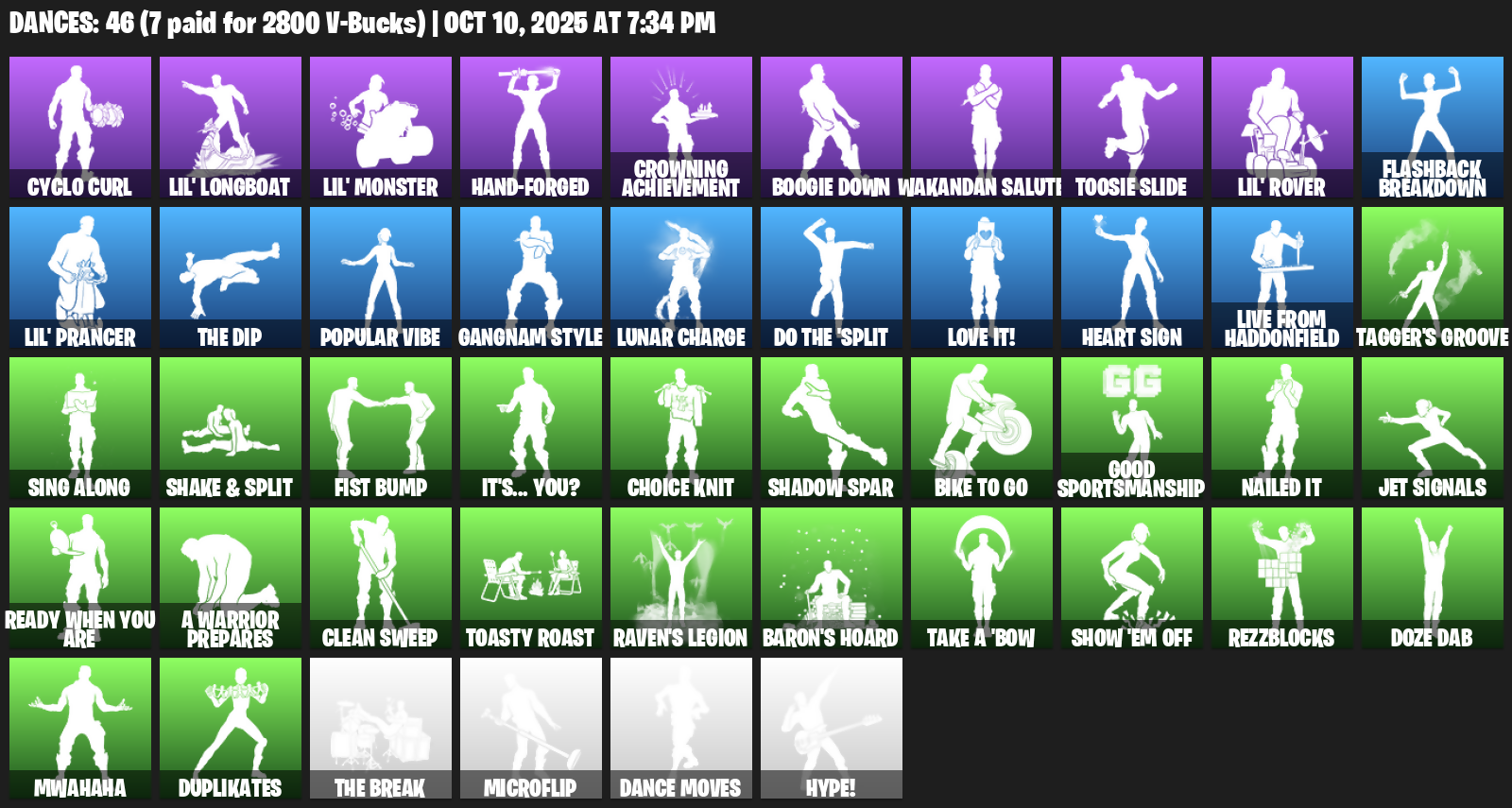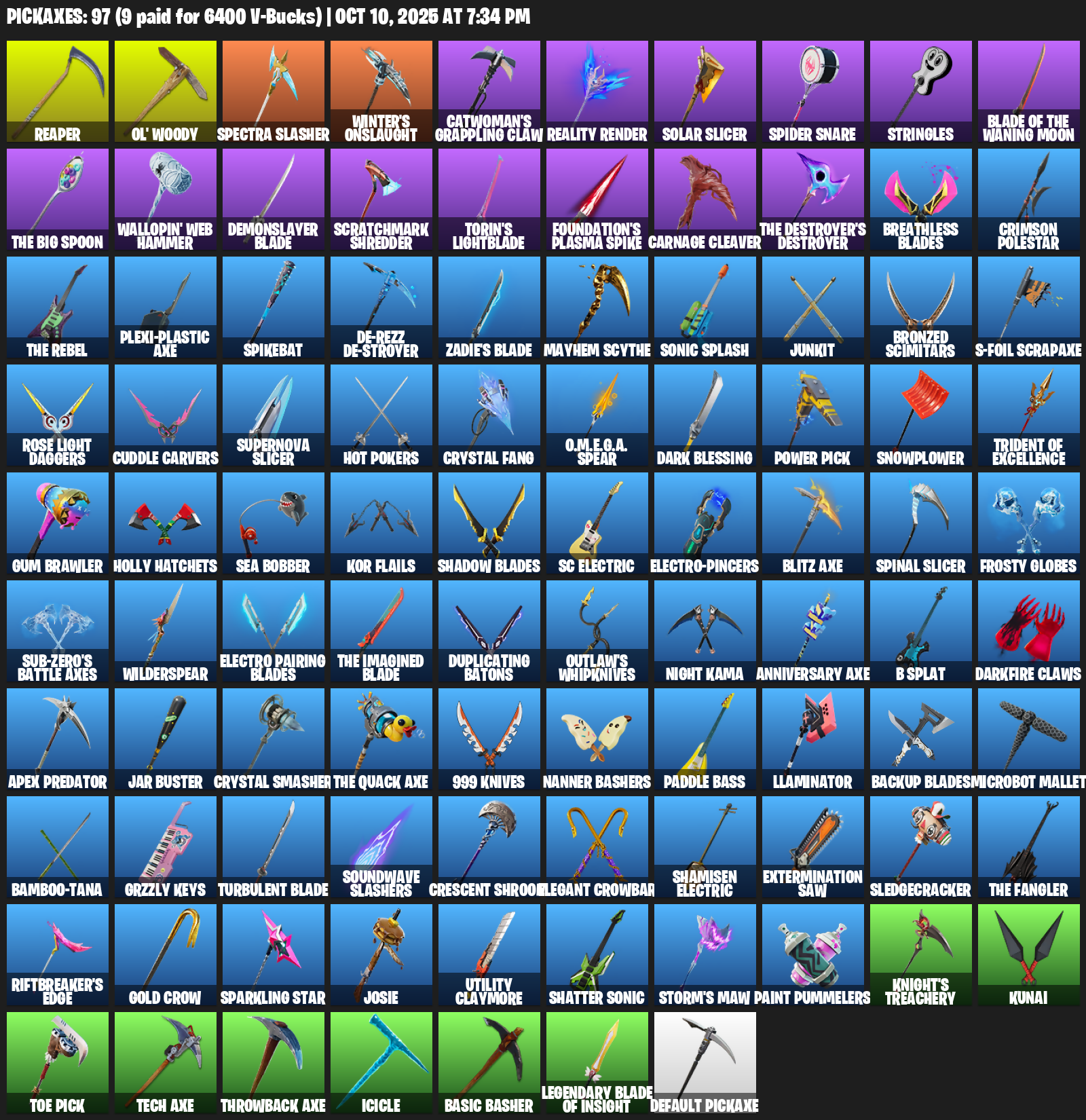 999 Knives, A Warrior Prepares, Anniversary Axe, Apex Predator, Arctic Adeline, B Splat, Backup Blades, Bamboo-Tana, Baron's Hoard, Basic Basher, Bike To Go, Black One X-Wing, Blade of the Waning Moon, Blitz Axe, Blitz Knight, Boogie Down, Bounty 'Brella, Breathless Blades, Bronzed Scimitars, Bubbloon, Bullet Rider, Carnage, Carnage Cleaver, Catwoman's Grappling Claw, Charlotte, Chemist's Cloudglider, Choice Knit, Clean Sweep, Cliffside Soarer, Cometbrella, Comfy Cats, Competitor's Time Brella, Crescent Shrool, Crimson Polestar, Crowning Achievement, Crystal Fang, Crystal Smasher, Cuddle Carvers, Cyclo Curl, D'Ark, Dance Moves, Dark Blessing, Dark Charger, Dark Symbiote, Darkfire Claws, De-Rezz De-Stroyer, Dealer's Deck, Default Pickaxe, Demonslayer Blade, Do The 'Split, Doze Dab, Dupli-Kate, Duplicates, Duplicating Batons, Eclipse Brella, Electro Pairing Blades, Electro-Pincers, Elegant Crowbar, Enchanted Lifebloom, Extermination Saw, Fabio Sparklemane, Fist Bump, Flapjack Flyer, Flashback Breakdown, Flavor-Dusted Sparklewings, Foundation's Plasma Spike, Fox Drifter, Frequency Flyer, Frost Squad, Frostburn, Frosty Globes, Gangnam Style, Glider, Gold Crow, Good Sportsmanship, Grzzly Keys, Guff Gringle, Gum Brawler, Gumbo, Gunn-Brella, Hand-Forged, Har-Har-Har!, Harlowe, Haven, Heart Sign, Holly Hatchets, Hot Pokers, Hype!, Icicle, Io Field Flyer, It's... You?, J.B. Chimpanski, Jar Buster, Jet Signals, Josie, Junkit, Klassic Kombat Crasher, Knight's Treachery, Kor, Kor Flails, Krisabelle, Kunai, Legendary Blade of Insight, Lil Split, Lil' Longboat, Lil' Monster, Lil' Prancer, Lil' Rover, Live From Haddonfield, Llaminator, Love It!, Lt. John Llama, Lunar Charge, Lunar Skyspan, Manic, Mask of Balance, Mayhem Scythe, Microbot Mallet, Microflip, Mogul Master, Mwahaha, Nailed It, Nanner Bashers, Night Kama, O.M.E.G.A. Spear, Ol' Woody, Omegarok, Outlaw's Whipknives, Paddle Bass, Paint Pummeler, Panda Parade, Plexi-Plastic Axe, Polar Peely, Popular Vibe, Power Pick, Punk Powerglider, Puppet's Prowl, Queen's Procession, Raider's Wayfarer, Ranker's Vaultbrella, Raven's Legion, Ready When You Are, Reality Render, Reaper, Red Robin's Wings, Redline Scout, Renegade Lynx, Rescue Board, Rezzblocks, Riftbreaker's Edge, Robo-Kevin, Rocket Science, Ronin, Rose Light Daggers, S-Foil Scrapaxe, SC Electric, Sandshark Driver, Scarlet Longboard, Scratchmark Shredder, Sea Bobber, Sentinel, Seven Glider, Seven Signet, Shadow Blades, Shadow Spar, Shake & Split, Shamisen Electric, Shanta, Shatter Sonic, Shogun 'Brella, Show 'Em Off, Sing Along, Skeleglider, Skerran, Slayer Juice Wrld, Sled Ready Guff, Sledgecracker, Snowmando, Snowplower, Solar Slicer, Sonic Splash, Soundwave Slashers, Sparkling Star, Spectra Knight, Spectra Slasher, Spider Snare, Spider-Man, Spikebat, Spinal Slicer, Storm's Maw, Stringles, Sub-Zero's Battle Axes, Sundae Glider, Supernova Slicer, Tagger's Groove, Take A 'Bow, Tech Axe, The Big Spoon, The Break, The Cube Queen, The Destroyer's Destroyer, The Dip, The Fangler, The Foundation, The Imagined Blade, The Quack Axe, The Rebel, The Rezzbrella, The Soaring Crescent, The Umbrella, The Vaultbrella, Throwback Axe, Time Brella, Toasty Roast, Toe Pick, Toona Fish, Toosie Slide, Torin, Torin's Lightblade, Trident of Excellence, Turbulent Blade, UNSC Spartan, Umbrella of the Last Reality, Utility Claymore, Utopia 'Brella, Vanguard Zadie, Visual's Glider, Wakandan Salute, Wallopin' Web Hammer, Web-Chute, Whale Sailer, White Tigerzord, Wilderspear, Winter Wing, Winter's Onslaught, Wintry Whirligig, Wooly Mammoth, Wyvern X77, Zadie's Blade