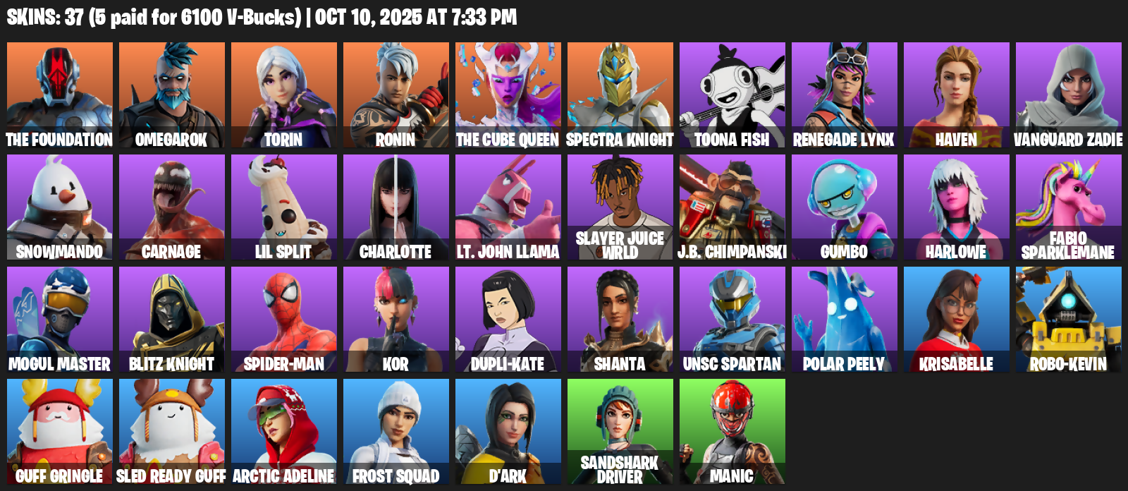 Slayer Juice WRLD | Carnage | Spider-Man | UNSC Spartan | Polar Peely | The Foundation | Omegarok | Torin | Ronin | The Cube Queen | Spectra Knight | Toona Fish | Renegade Lynx | Haven | Vanguard Zadie | Snowmando | Lil Split | Charlotte | Lt. John Llama | J.B. Chimpanski | Gumbo | Harlowe | Fabio Sparklemane | Mogul Master | Blitz Knight | Kor | Dupli-Kate | Shanta | Krisabelle | Robo-Kevin | Guff Gringle | Sled Ready Guff | Arctic Adeline | Frost Squad | D'Ark | Sandshark Driver | Manic