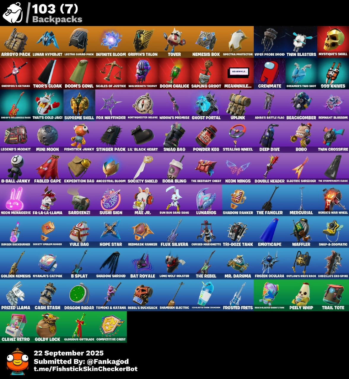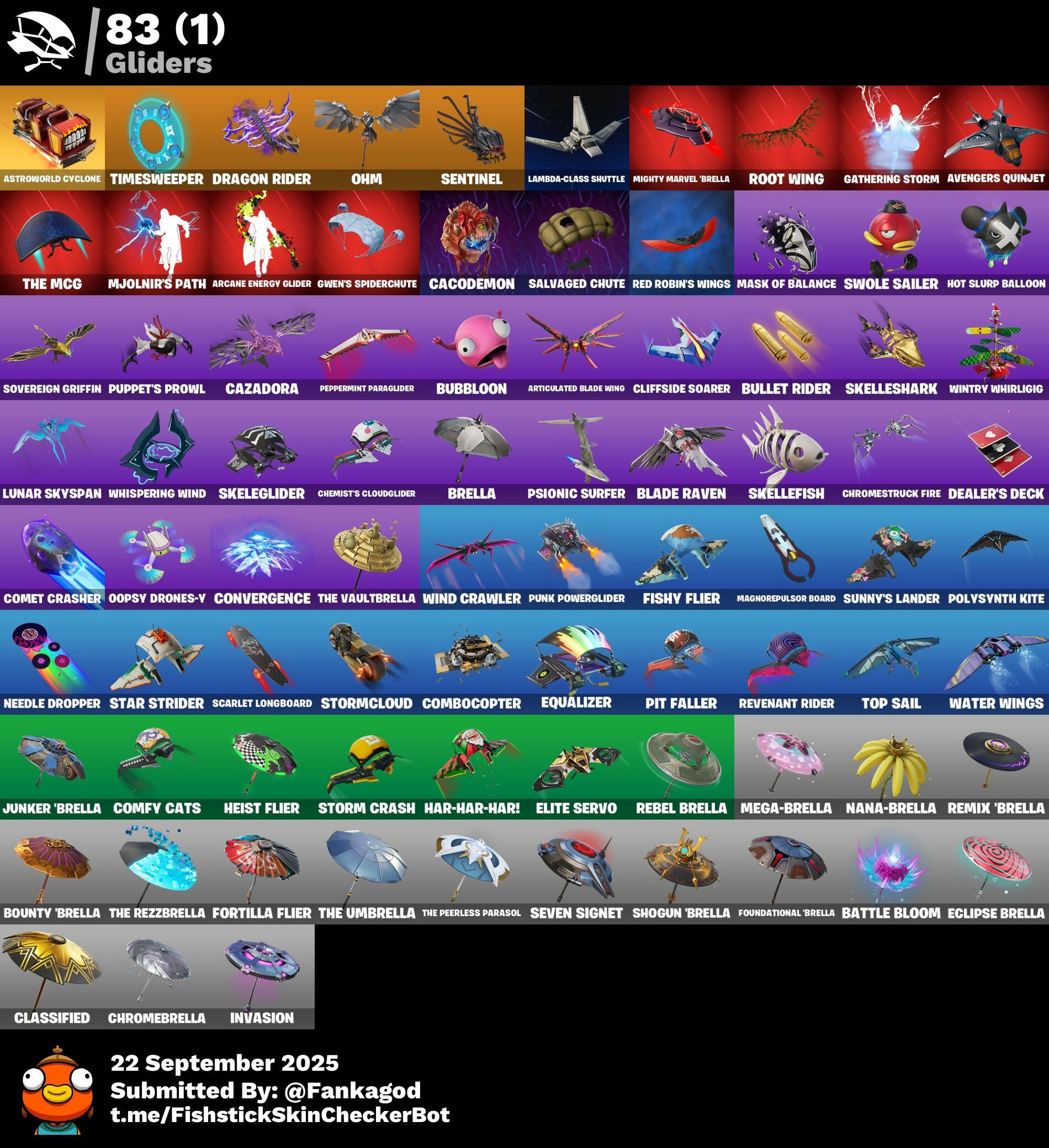 8-Ball Janky, 999 Knives, Adira, Adira's Battle Flag, Air Shredder, Amplitude, Ancestral Bloom, Aquaman, Aquaman's Trident, Arachrobatics, Arcane Energy Glider, Arctic Adeline, Arroyo Pack, Articulated Blade Wing, Astroworld Cyclone, Avengers Quinjet, B Splat, Backup Blades, Bananaxe, Bat Royale, Battle Bloom, Beach-Blasted Shark's Tank, Beachcomber, Bear Hug, Beep Beep, Behold!, Blade Of The Waning Moon, Blade Raven, Blowin' Up, Boba Bling, Bobo, Boogie Down, Bounty 'Brella, Brella, Bubbloon, Bullet Rider, Bun Bun Bang Bang, Bunsen Backburner, Bytes, Cacodemon, Call Me, Cash Stash, Cazadora, Championship Aura, Chemist's Cloudglider, Choice Knit, Chromebrella, Chromestruck Fire, Classified, Clawz Retro, Clean Sweep, Cliffside Soarer, Cold Furia, Combocopter, Comet Crasher, Comfy Cats, Competitive Crest, Convergence, Count It!, Crescent Shroom, Crewmate, Crimson Polestar, Crowning Achievement, Crystal Fang, Curling Iron, Cursed Marionette, Cybertronian Axe, Darth Vader, Daywalker's Kata, Dealer's Deck, Deep Dive, Designated Hitters, Dirtbike Challenge, Distraction Dance, Dive Knives, Doctor Doom, Dogg Treat, Doom Chalice, Doom's Cowl, Double Header, Double Tags, Dragon Radar, Dragon Rider, Dragon Rune Lance, Dreamer's Two-Shot, Dumbbell Driver, Eclipse Brella, Electric Shredder, Electro Pairing Blades, Elite Servo, Emoticape, Eon Blades, Epic Blade Of Floof, Equalizer, Evie, Expedition Bag, Fa-La-La-Llama, Fabled Cape, Face Palm, Fade, Felina, Felina's Claw, Fishbone Flayer, Fishstick Janky, Fishy Flier, Fist Bump, Flippin' Away, Flux Silvera, Foil Flex, Fortilla Flier, Foundational 'Brella, Fox Wayfinder, Frosted Frets, Frozen Oculara, Gathering Storm, Gentleman's Dab, Get Griddy, Ghost Portal, Gilded Morphic Blades, Glorious Giftblade, Godzilla's Exo-Spine, Golden Nemesis, Golden Scythe, Goldy Lock, Golf Clap, Griffin's Talon, Grim Axes, Groot, Groots Sap Axes, Grriz, Grrizzy Gooper, Gum Brawler, Gwen's Spiderchute, Gwenpool's Katanas, Hammers Of Justice, Hand Of Lightning, Har-Har-Har!, Have A Seat, Heist Flier, Hello Friend, Holiday Boxy, Holly Hatchets, Hope Star, Hordes War Wheel, Hot Marat, Hot Pokers, Hot Slurp Balloon, Howl, Humbug Slicer, Hypnot-Eyes, I Declare!, Ice-Blasted Snow Crunchem, Imperial March, Indiana Jones, Infinite Bloom, Invasion, It Is Finished, It's... You?, Jennifer Walters, Jet Signals, Joltara, Jules, Junker 'Brella, Keyed Up, Kit, Kittanas, Krisabelle, Lambda-Class Shuttle, Laser Focused, Last Forever, Lectro Guard Pack, Lectrostatic Impactor, Legend's Modkit, Legendary Blade Of Insight, Lennox Rose, Lil' Black Heart, Lil' Prancer, Lone Wolf Holster, Love It!, Lucky Lance, Lunar Defender, Lunar Hyperjet, Lunar Skyspan, Lunarios, Mae Jr., Magnorepulsor Board, Major Mancake, Make A Seat, Make It Rain, Malik, Manic, Martial Arts Master, Mask Of Balance, Meanwhile..., Mega-Brella, Meow Skulls, Mercurial, Microbot Mallet, Mighty Marvel 'Brella, Mini Moon, Mjolnir, Mjolnir's Path, Molten Max Axe, Mr. Daruma, Mystique, Mystique's Skull, Nana-Brella, Nanner Bashers, Needle Dropper, Nemesis Box, Neon Menagerie, Neon Wings, Night Kama, Northquester Deluxe, Nyanja's Catpak, O.M.E.G.A. Spear, Ocean, Ohm, Omg I Love It, Oopsy Drones-Y, Outlaw's Knife Rack, Outlaw's Whipknives, Pac-Brained, Pairing Blades, Paradigm (Reality-659), Peely Whip, Peppermint Paraglider, Pit Faller, Pizza Party, Planetary Vibe, Polar Peely, Polysynth Kite, Powder Keg, Power Claws, Premiere Poms, Prized Llama, Psionic Surfer, Punk Powerglider, Puppet's Prowl, Rage Quit, Raider's Relics, Raise The Roof, Rebel Brella, Rebel's Rucksack, Red Robin's Wings, Redmask Ranker, Regal Wave, Reliant Blades, Remix 'Brella, Remnant Blossom, Respect The Peace, Revenant Rider, Root Wing, Rose Light Daggers, Sabina, Salvaged Chute, Santa Dogg, Sapling Groot, Sardeenz!, Scales of Justice, Scarlet Defender, Scarlet Longboard, Scorecard, Scuba Jonesy, Secret Scimitars, Sentinel, Seven Signet, Shadow Ranker, Shadow Shroud, Shamisen Electric, Shogun 'Brella, Shooting Starstaff, Shout!, Show 'Em Off, Shuriken Spinner, Sigil Of The Empire, Siona, Skeleglider, Skellefish, Skelleshark, Skull Trooper, Slayer Juice Wrld, Sled Ready Guff, Sledgecracker, Smash O'-Lantern, Snap, Snap-A-Zoomatic, Snoop's Holladizzle Bass, Snoop's Walk, Snowplower, So Square, Society Emblem Ranker, Society Shield, Socks, Sovereign Griffin, Sparkling Star, Spectra Protector, Spider Snare, Spider-Gwen, Spinal Slicer, Staff Of Doom, Staff Stand, Standing Bow, Star Strider, Star Wand, Starfall, Steady, Stealing Wheel, Stinger Pack, Storm, Storm Crash, Stormcloud, Stormfarer, Stormshielder Blades, Stormy, Sunny's Lander, Supreme Shell, Sushi Sign, Swag Bag, Sweet Clementine, Sweet!, Swole Sailer, Synchronous Sai, Take The Cake, Take The Elf, That's Cold Jac!, The Ace, The Ashglow Blade, The Bestiary Chest, The Break, The Break Shot, The Destroyer's Destroyer, The Dip, The Eternal Edge, The Fangler, The King's Oath, The Mcg, The Nothing's Gift, The Peerless Parasol, The Rebel, The Rezzbrella, The Rick Dance, The Stormfarer's Cloak, The Takedown, The Umbrella, The Vaultbrella, Thor, Thor's Cloak, Throwback Axe, Tide Axes, Timesweeper, Tippy Tap, Toasty Roast, Tomoki & Katana, Top Sail, Tover, Trail Tote, Tri-ooze Tank, Turbulent Blade, Twin Blasters, Twin Crossfire, Twyn, Underworld Desdemona, Uplink, Utility Claymore, Verve, Viper Probe Droid, Vizion Strikers, Vulcan Salute, Waffler, Water Wings, Waterworks, Whipcrack, Whispering Wind, Widow's Promise, Wind Crawler, Wintry Whirligig, Without You, Wolverine, Wolverine's Trophy, Wrenchers, Yule Bag, Yulejacket