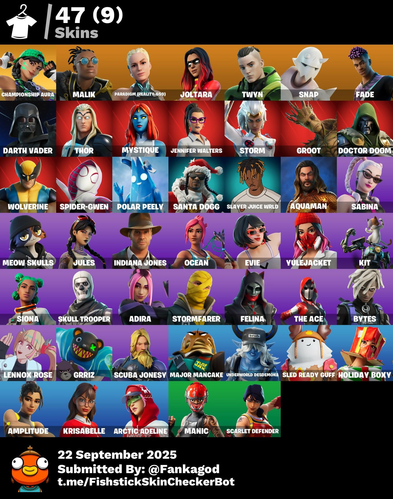 Santa Dogg | Slayer Juice WRLD | Storm | Mystique | Spider-Gwen | Thor | Jennifer Walters | Doctor Doom | Wolverine | Groot | Darth Vader | Aquaman | Polar Peely | Snap | Malik | Joltara | Twyn | Fade | Paradigm (Reality-659) | Lennox Rose | Ocean | Jules | Stormfarer | Grriz | Skull Trooper | Bytes | Yulejacket | Meow Skulls | Evie | Scuba Jonesy | Adira | The Ace | Indiana Jones | Sabina | Kit | Siona | Felina | Sled Ready Guff | Holiday Boxy | Krisabelle | Major Mancake | Underworld Desdemona | Amplitude | Arctic Adeline | Championship Aura | Manic | Scarlet Defender