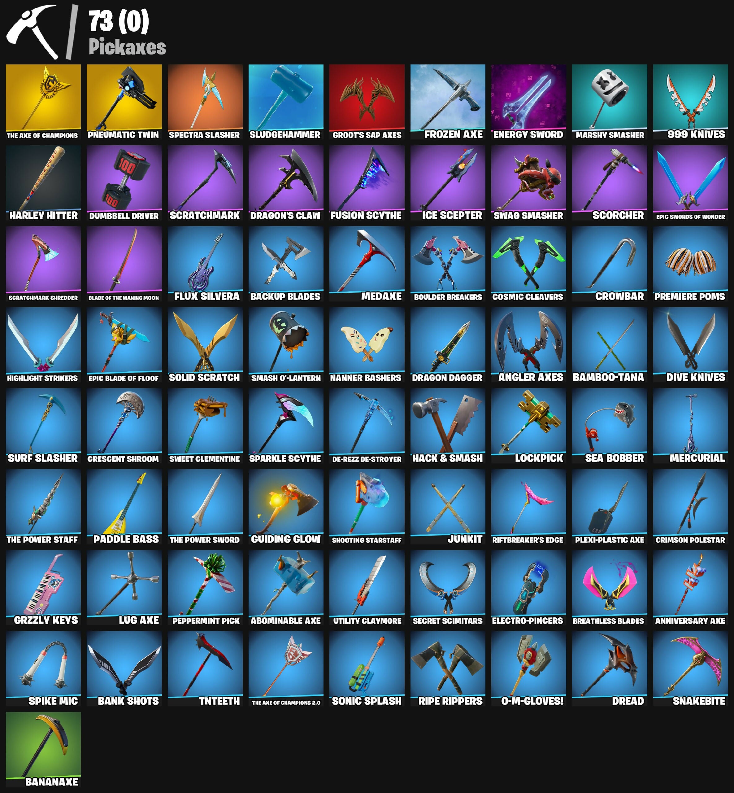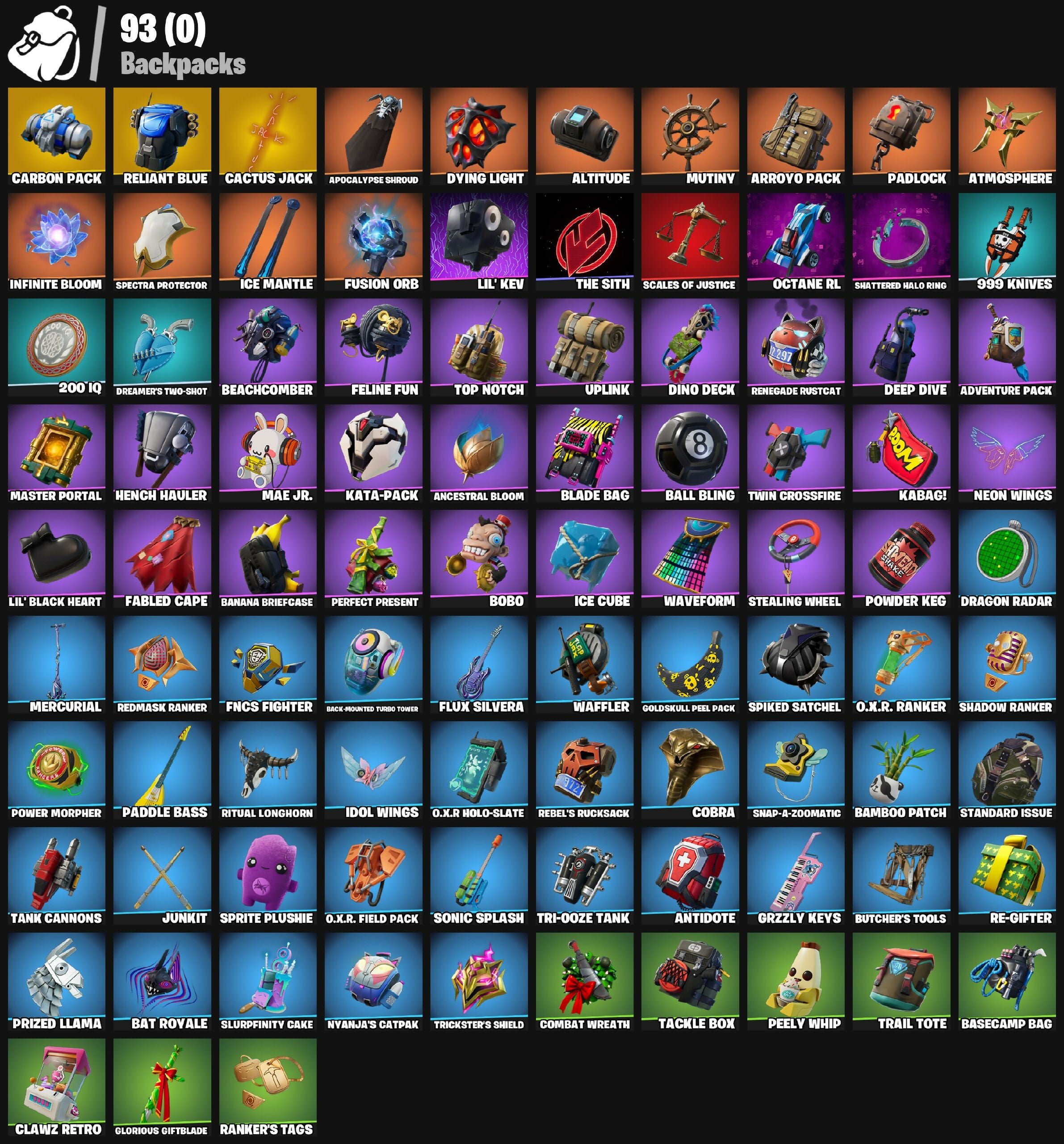 200 IQ, 8-Ball Vs Scratch, 999 Knives, Abominable Axe, Adventure Pack, Agent Patch, Agent Peely, Altitude, Ancestral Bloom, Angler Axes, Anniversary Axe, Antidote, Apocalypse Shroud, Arcana, Arroyo Pack, Astroworld Cyclone, Atmosphere, Back-Mounted Turbo Tower, Backup Blades, Ball Bling, Bamboo Patch, Bamboo-Tana, Banana Briefcase, Bananaxe, Bank Shots, Base Jumper, Basecamp Bag, Bat Royale, Battle Bloom, Battle Bus Balloon, Battle Gamer Mae, Beachcomber, Beep Beep, Big Haul, Bike To Go, Blackheart, Blade Bag, Blade of the Waning Moon, Blowing Bubbles, Bobo, Boing!, Bombs Away!, Boogie Down, Boulder Breakers, Breathless Blades, Brutus, Butcher's Tools, Cactus Jack, Call Me, Cameo Vs Chic, Carbon Commando, Carbon Pack, Cat Flip, Catalyst, Cinder, Classified, Clawz Retro, Clean Sweep, Cliffside Soarer, Coaxial Blue, Cobra, Combat Wreath, Competitor's Time Brella, Conga, Corrupted, Cosmic Cleavers, Crazy Eight, Crescent Shroom, Crimson Polestar, Crossfire, Crowbar, Crowning Achievement, Dabstand, Dark Engine, De-Rezz De-Stroyer, Deadpool, Deep Dive, Dino Deck, Dino Megazord, Dive Knives, Downpour, Downshift, Doze Dab, Dragon Dagger, Dragon Dagger's Song, Dragon Radar, Dragon Stance, Dragon's Claw, Dread, Dreamer's Two-Shot, Droop, Dumbbell Driver, Dying Light, Electro-Pincers, Ember, Energy Sword, Epic Blade of Floof, Epic Swords of Wonder, Equalizer, FNCS Fighter, Fabled Cape, Feline Fun, Flashback Breakdown, Flippin' Away, Flux Silvera, For O.X.R.!, Fortilla Flier, Foundational 'Brella, Fox Drifter, Free Flow, Frozen Axe, Fusion, Fusion Coil, Fusion Orb, Fusion Scythe, Gear Specialist Maya, General's War Table, Gentleman's Dab, Get Funky, Get Griddy, Glidurr, Glorious Giftblade, Gold, Goldskull Peel Pack, Golf Clap, Good Sportsmanship, Green Ranger, Grizzly Keys, Groot's Sap Axes, Ground Pound, Grzzly Keys, Guiding Glow, Hack & Smash, Harley Hitter, Heartspan, Hello Friend, Hench Hauler, High Five, Highlight Strikers, Hoodie, Hot Marat, Hula Hoopin', Hybrid, Hype!, I'm The Visual, Ice Cube, Ice Mantle, Ice Scepter, Idol Wings, Infinite Bloom, Jaywalking, Journey Vs Hazard, Joystick Jumper, Jubilation, Junk Bucket, Junkit, Kabag!, Kata-Pack, Keep It Mello, Knight's Helm, Lil Split, Lil' Black Heart, Lil' Ghost, Lil' Kev, Lil' Longboat, Lil' Zord Battle Mode, Llamacorn Express, Lockpick, Lockstep, Lt. Evergreen, Lt. Ripp Slade, Lug Axe, Lynx, Mae Jr., Major Mancake, Marshy Smasher, Master Mix, Master Portal, Medaxe, Meowscles, Mercurial, Metalmark, Mic Drop, Microflip, Mighty Marvel 'Brella, Millennium Falcon, Mutiny, Nana Nana, Nanner Bashers, Neon Wings, Nyanja's Catpak, O-M-Gloves!, O.X.R. 'Brella, O.X.R. Drifter, O.X.R. Field Pack, O.X.R. Holo-Slate, O.X.R. Ranker, Octane RL, Ollie, Onesie, Onyx Winter, Oopsy Drones-Y, Out West, Paddle Bass, Padlock, Panda Parade, Pandemonium, Paws & Claws, Peace Out, Peely, Peely Whip, Peppermint Pick, Perfect Present, Pit Faller, Plexi-Plastic Axe, Plunder, Pneumatic Twin, Point It Out, Powder, Powder Keg, Power Morpher, Premiere Poms, Prized Llama, Raider's Wayfarer, Ranker's Tags, Re-Gifter, Rebel Brella, Rebel's Rucksack, Redline Scout, Redmask Ranker, Regal Wave, Reliant Blue, Remedy Vs Toxin, Remix 'Brella, Renegade Lynx, Renegade Rustcat, Reporting For Duty, Rescue Board, Respect The Peace, Rickety Runner, Rift Rider, Riftbreaker's Edge, Ripe Rippers, Rippley Vs Sludge, Ritual Longhorn, Rox, Royale Air, Ruin, Salvaged Chute, Scales Of Justice, Scarlet Longboard, Scorcher, Scorecard, Scratchmark, Scratchmark Shredder, Sea Bobber, Secret Scimitars, Selbi, Sentinel, Sgt. Winter, Shadow Ranker, Sharpshooter, Shattered Halo Ring, Shimmer, Shooting Starstaff, Show 'Em Off, Side Hustle, Sidewinder, Skellefish, Sky Serpents, Sky Trawler, Skyward, Slayer Juice Wrld, Sludgehammer, Slurpfinity Cake, Smash O' Lantern, Snakebite, Snap-A-Zoomatic, Snoozefest, Snowfall, Snowshaker, So Square, Solid Scratch, Sonic Splash, Sparkle Scythe, Spectra Knight, Spectra Protector, Spectra Slasher, Spike Mic, Spiked Satchel, Spray Sail, Sprite Plushie, Stage 4, Stage 4 - No Ponytail, Stage 5, Stage 8, Standard Issue, Star Strider, Stealing Wheel, Storm Sail, Summit Striker, Sundae Glider, Surf Slasher, Survival Specialist, Swag Smasher, Sweet Clementine, Sweet!, Swole Sailer, Tackle Box, Tactical Sleigh, Take The Cake, Take The Elf, Tank Cannons, The Axe of Champions, The Axe of Champions 2.0, The Break Shot, The Ice King, The Mcg, The Power Staff, The Power Sword, The Prisoner, The Rezzbrella, The Sith, The Umbrella, Tie Whisper, Tilted Teknique, Tnteeth, Tntina, Top Notch, Tra La La, Trail Tote, Travis Scott, Treefall, Tri-Ooze Tank, Tribal, Trickster's Shield, Trilogy, Trog, Turbo Spin, Turk Vs Riptide, Twin Crossfire, Unsc Spartan, Uplink, Utility Claymore, Verve, Visual's Glider, Waffler, Waveform, Wavy T, Webrella, Wet Paint, White, White Tigerzord, Wild Blast, X-Lord, Yay!, Yond3r, Yoo-Mi, Zenith