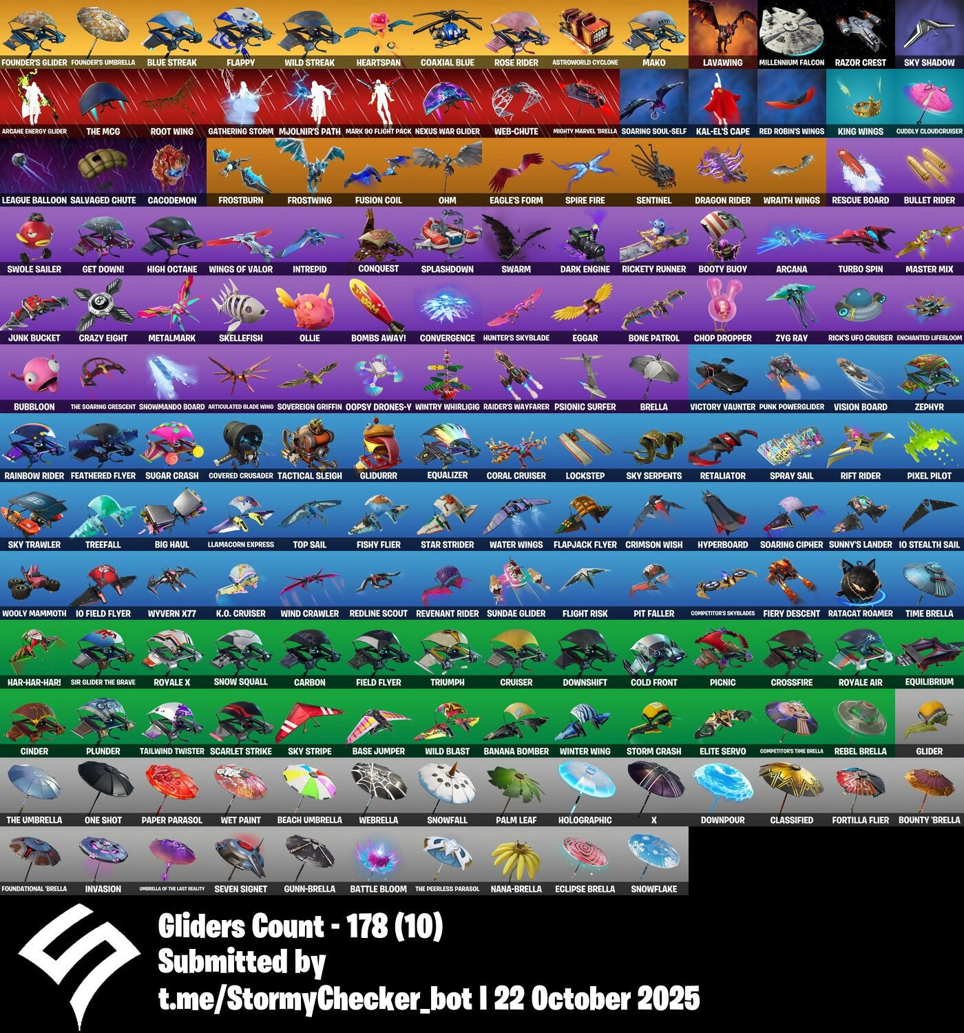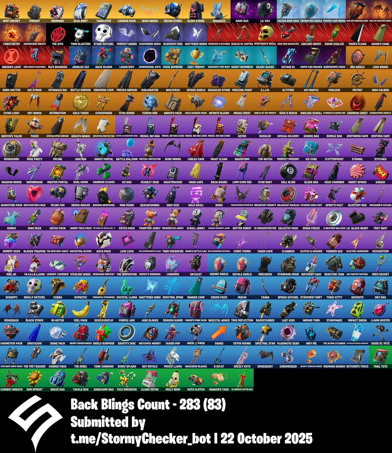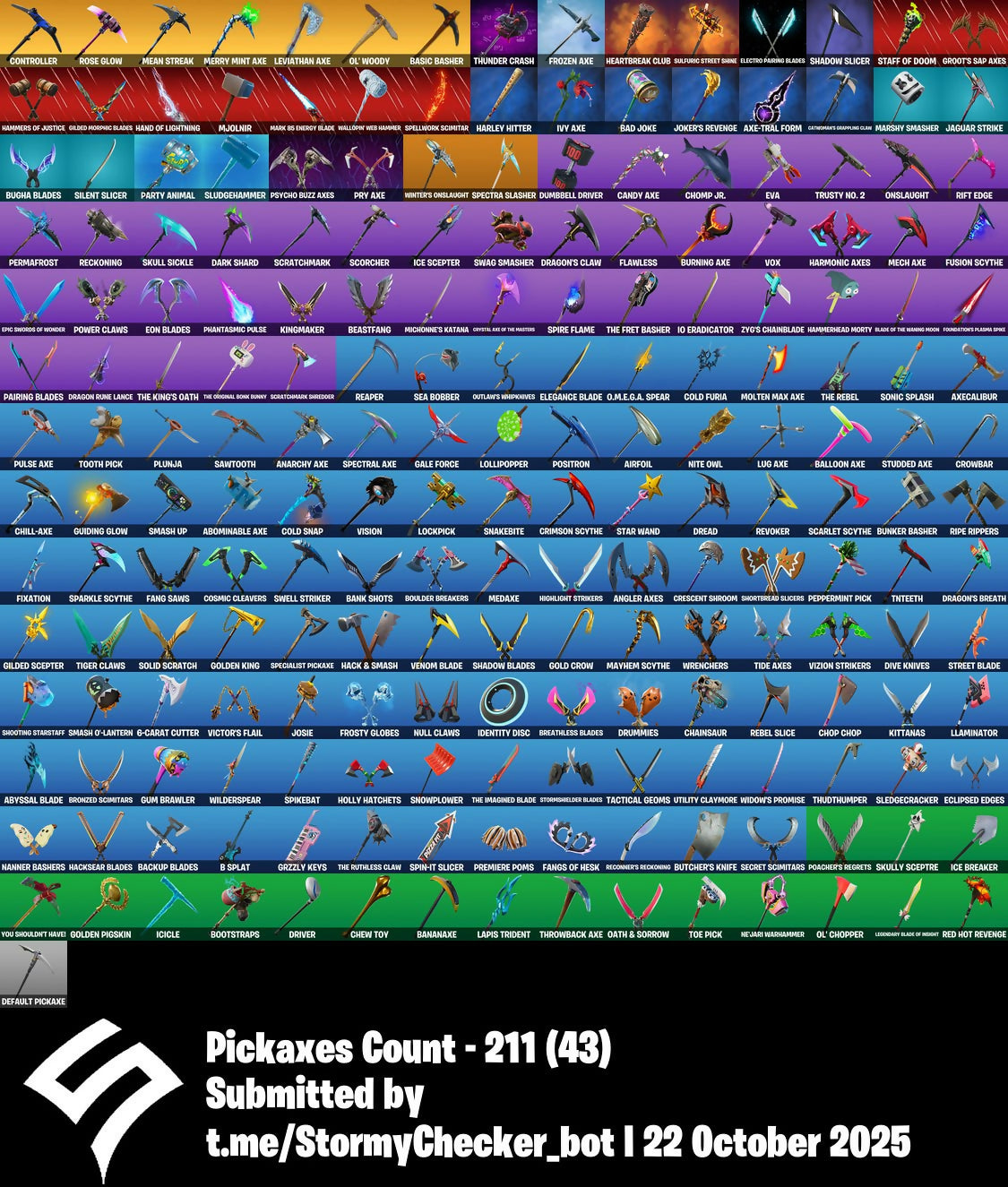 2020 Kickflip, 6-Carat Cutter, 8-Ball Janky, 8-Ball vs Scratch, A Warrior Prepares, A Weather Balloon, Abominable Axe, Absenz, Absolute Zero, Abyss, Abyssal Blade, Accusation, Adira, Adira's Battle Flag, Adventure Pack, Agent Jones, Agent Peely, Air Shredder, Airfoil, Alim, Alpine Ace (USA), Altitude, Anarchy Axe, Ancestral Bloom, Angler Axes, Antidote, Antonia, Apocalypse Shroud, Arcana, Arcane Energy Glider, Arctic Adeline, Arctic Assassin, Arroyo Pack, Articulated Blade Wing, Artifact, Assault Trooper, Astro, Astroworld Cyclone, Atmosphere, Aura, Aura Analyzer, Auto Clutch, Axe-tral Form, Axecalibur, Azarath Metrion Zinthos, B Splat, Bachi, Back Bloom, Back Board, Backstabber, Backtracker, Backup Blades, Bad Joke, Ball Bling, Balloon Axe, Banana Bomber, Banana Briefcase, Bananaxe, Band Pass, Bank Shots, Banner Cape, Base Jumper, Basecamp Bag, Basic Basher, Bat Royale, Battle Balloon, Battle Bloom, Battle Shroud, Battlehawk, Beach Jules, Beach Umbrella, Beachcomber, Bean Bag, Bear Hug, Beastfang, Beatzbunny, Beep Beep, Best Mates, Big Haul, Bike To Go, Billy Bounce, Birthday Cake, Black Stripe, Black Widow (Shown But), Blackheart, Blackout Bag, Blade Bag, Blade of the Waning Moon, Bladed Travpak, Blaze, Blitz Knight, Blizzabelle, Blowin' Up, Blowing Bubbles, Blue Fusion, Blue Shift, Blue Squire, Blue Streak, Blue Striker, Blue Team Leader, Blustery Bag, Bobo, Boing!, Bombs Away!, Bone Patrol, Boogie Down, Boomin', Boots 'N' Cats, Bootstraps, Booty Buoy, Boulder Breakers, Bounty 'Brella, Bracer, Brain Freeze, Brave Bag, Brawler, Breakaway, Breakdown, Breakfast Bounty, Breakneck, Breathless Blades, Brella, Bring It Around, Brite Bomber, BriteStorm Bomber, Bronzed Scimitars, Brseason1, Brutus, Bubloon, Buckler, Bugha, Bugha Blades, Bullet Rider, Bullseye, Bunker Basher, Bunker Jonesy, Bunya, Burgle Bag, Burning Axe, Busy, Butcher's Knife, Butcher's Tools, Butter Robot, C'Mere, Cacodemon, Calamity, Calculated, Call Me, Cameo vs Chic, Candy Axe, Capoeira, Carbide, Carbon, Carbon Commando, Carbon Pack, Cardistry, Cat Flip, Catalyst, Catastrophe, Catwoman's Grappling Claw, Celeste, Chain Cape, Chainsaur, Chainstick Pack, Chaos Agent, Charge Pack, Chew Toy, Chigusa, Chill-Axe, Choice Knit, Chomp Jr., Chop Chop, Chop Dropper, Chromeseed, Chromium, Chuck Pack, Chun-Li, Cinder, Classified, Clawbox, Clawz Retro, Clean Sweep, Clinical Crosser, Cloaked Shadow, Cluck, Cluck Strut, Clutch & Dagger, Coaxial Blue, Cobra, Coin Flip, Cold Front, Cold Furia, Cold Snap, Combat Tech Jules, Combat Wreath, Commando, Competitor's Skyblades, Competitor's Time Brella, Conga, Conquest, Controller, Convergence, Coral Cruiser, Cosmic Cleavers, Covered Crusader, Cozy Commander, Crack It, Crazy Eight, Crescent Shroom, Crimson Crest, Crimson Scythe, Crimson Wish, Crossfire, Crowbar, Crowning Achievement, Cruiser, Cryptic, Crystal, Crystal Axe of the Masters, Crystal Llama, Cubic Thorn, Cuddle Hearts, Cuddly Cloudcruiser, Curling Iron, Cyberdyne Salute, Cyclo Curl, DJ Yonder, Dab, Dabstand, Dagger Dance, Dance Moves, Dance Off, Dance Therapy, Dark Bag, Dark Bomber, Dark Engine, Dark Matter, Dark Shard, Dark Voyager, Dazzle, Deadfire, Deadpool, Deadpool's Katanas, Deep Dab, Deep Dive, Default Pickaxe, Demi, Diamond Diva, Diamond Hanz, Dice Roll, Dimensional Gate, Dino Deck, Dire, Dive Knives, Dizzie, Do The Split, Doctor Doom, Doctor Slone, Don't Start Now, Doom Chalice, Doom's Cowl, Downpour, Downshift, Doze Dab, Dragon Guard, Dragon Rider, Dragon Rune Lance, Dragon Stance, Dragon's Breath, Dragon's Claw, Dread, Dream, Dreamer's Two-Shot, Drift, Driver, Droop, Drummies, Dry Bag, Dual Kama, Dumbbell Driver, Dummy, Dusk, Dusk Wings, Dying Light, Dynamic Dribbler, Dynamo, Dynamo Gravy-Suit, E.L.I.M., Eagle's Form, Echo, Eclipse Brella, Eclipsed Edges, Eggar, Electric Shredder, Electro Pairing Blades, Elegance Blade, Elite Agent, Elite Servo, Ember, Emoticape, Enchanted Lifebloom, Endless Scroll, Enduring Cape, Enforcer, Envoy, Eon Blades, Epic Swords of Wonder, Equalizer, Equilibrium, Eternal, Eva, Evasive Maneuvers, Evie, Ex, Expert's Bonebag, Explorer Emilie, Extra Round, Fa-La-La-Llama, Fable, Fabled Cape, Fade, Fang Saws, Fangs of Hesk, Feathered Flyer, Featherweight, Feelin' Jaunty, Feline Fun, Field Flyer, Fierce, Fiery Descent, Finesse Finisher, Firestarter, Fish Thicc, Fishy Flier, Fiststick Janky, Fixation, Flaky Feast, Flamenco, Flapjack Flyer, Flappy, Flashback Breakdown, Flawless, Flight Risk, Flippin' Away, Floss, Flutterfrost, Focus, Fortilla Flier, Foundation's Plasma Spike, Foundational 'Brella, Foundations Mantle, Founder's Glider, Founder's Umbrella, Free Flow, Freezing Point, Frost Squad, Frostbite, Frostburn, Frostwing, Frosty Globes, Frozen Axe, Frozen Iron Cage, Frozen Love Ranger, Frozen Love Wings, Frozen Raven, Frozen Red Knight, Frozen Red Shield, Frozen Shroud, Fusion, Fusion Coil, Fusion Orb, Fusion Scythe, Gains!, Galactic Pack, Gale Force, Gathering Storm, Gear Specialist Maya, Gentleman's Dab, Get Down!, Get Funky, Get Griddy, Ghost Portal, Giddy-up, Gilded Morphic Blades, Gilded Scepter, Glider, Glidurr, Glorious Giftblade, Go Bag, Go Mufasa, Gold Crow, Gold Dagger Pack, Gold Token, Golden King, Golden Pigskin, Golf Clap, Good Ol' Pete, Goodie Bag, Gordo, Greebles, Griffin's Talon, Grimoire, Grizzly Keys, Groot, Groot's Sap Axes, Groove Jam, Grzzly Keys, Guard Pup, Guff Gringle, Guggimon, Guiding Glow, Guild, Gum Brawler, Gumbo, Gummy Sack, Gun Show, Gunn-Brella, Hack & Smash, Hack // Pack, Hacksear Blades, Hairpin, Hammerhead Morty, Hammers of Justice, Hand of Lightning, Har-Har-Har!, Harley Hitter, Harlowe, Harmonic Axes, Hatch Pack, Have A Seat, Haven, Haze, Headhunter Prime, Heartbreak Club, Heartbreak Ranger, Heartspan, Heidi, Hello Friend, Hench Hauler, Heron Stance Hero, High Caliber, High Five, High Octane, Highland Warrior, Highlight Strikers, Holiday Boxy, Holly Hatchets, Holo-Skull, Holographic, Hoop Master, Hope, Hot Marat, Hot Stuff, Hot Wings, Hula Hoopin', Human Bill, Hunter's