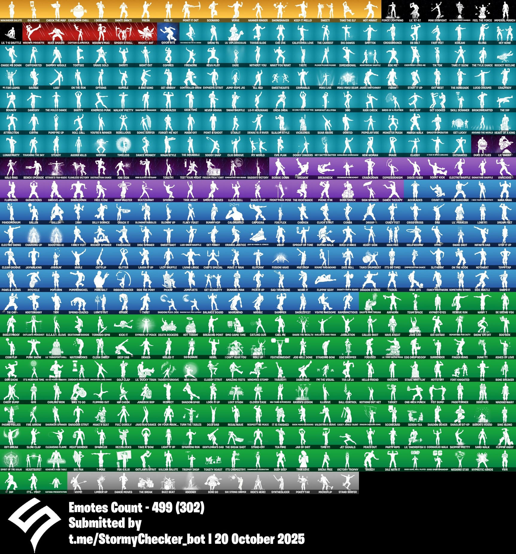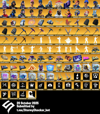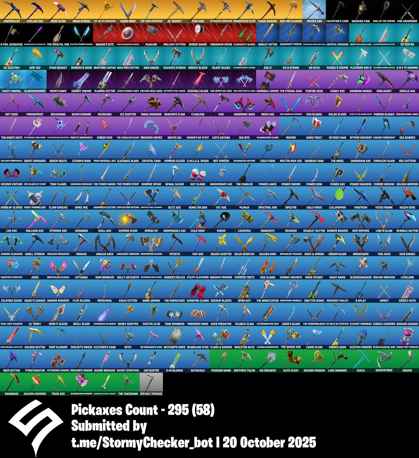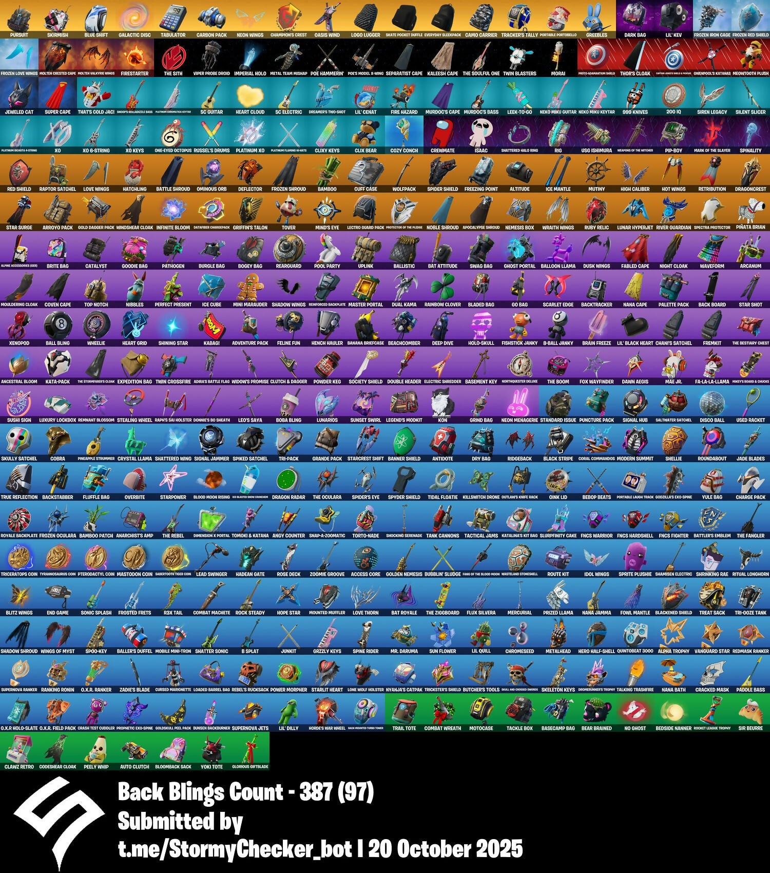 #1 Fan Llama, 10 Field Flyer, 2-Ply TP Hammer, 200 IQ, 8-Ball Janky, 8-Ball vs Scratch, 999 Knives, A Bar Song, A Tear In Space (Unlock), AFR, Abominable Axe, Access Core, Accolades, Adira, Adira's Battle Flag, Adventure Pack, Afterburn, Afterburn Guards, Afterparty, Agent Patch, Agent Peely, Agent Weaver, Agent Webb, Agora Hills, Ahsoka Tano, Air Horn, Air Shredder, All Red, Alpha Trophy, Alpine Ace (GER), Altitude, Amazing Feets, Amp Kai, Amp Zap, Anarchist's Amp, Ancestral Bloom, Angler Axes, Angry Counter, Anniversary Axe, Anomalyrifts, Antidote, Antonia, Apex Predator, Apocalypse Shroud, Apprentice Evie, Aquaman's Trident, Arcanum, Arctic Adeline, Arctica, Around The World, Arroyo Pack, Articulated Blade Wing, Artifact, Ascend!, Ashes Of Love, Ask Me!, Astra, Astroworld Cyclone, Attraction, Augury, Aura, Auto Clutch, Axe-O, B Splat, B.E.A.S.T. Glove, B.R.U.T.E. Gunner, B.R.U.T.E. Navigator, BB Belt, BMO Game Time, Back Board, Backstabber, Backtracker, Backup Blades, Bad Guy, Balance Board, Ball Bling, Ball Control, Baller, Baller's Duffel, Ballistic, Balloon Axe, Balloon Llama, Ballsy, Bamboo, Bamboo Patch, Bamboo-Tana, Banana Bomber, Banana Briefcase, Bananaxe, Banner Shield, Banner Trooper, Baron's Hoard, Base Jumper, Basecamp Bag, Basement Key, Basic Basher, Bat Attitude, Bat Royale, Batsickle, Battle Bloom, Battle Gamer Mae, Battle Shroud, Battlehawk, Battler's Emblem, Be Seeing You, Beach Umbrella, Beachcomber, Bear Brained, Bear Hug, Beartrapfoot, Beatdown Boogie, Beatzbunny, Beavis, Bebop, Bebop Beats, Bedside Manner, Beep Beep, Bench Upgrade, Bernie, Big Bite, Big Dawgs, Big Dill, Big Fan, Big Haul, Bike To Go, Billy Bounce, Birds Of A Feather, Bitey, Black Knight, Black One X-Wing, Black Ranger, Black Stripe, Blackened Shield, Blackheart, Blade of the Hemon Moon, Bladed Bag, Blaze, Blitz, Blitz 'Brella, Blitz Axe, Blitz Knight, Blitz Wings, Blood Moon Rising, Bloomback Sack, Blowin' Up, Blowing Bubbles, Blue Fusion, Blue Ranger, Blue Shift, Blue Streak, Blue Striker, Blue Team Leader, Board Breaker, Boba Bling, Boba Snack, Bogey Bag, Bold Stance, Bombs Away!, Bone Breaker, Bonejamin, Bones, Boo Box, Boogie Down, Boosting KI, Boot It, Booty Buoy, Boulder Breakers, Bouncy, Bounty 'Brella, Bow Go, Brain Freeze, Bratty, Bravo Leader, Break Free, Breakdown, Breakin', Breaking Point, Breaking Waves, Breakneck, Breakpoint, Breathless Blades, Breezy, Brella, Brilliant Cutters, Brite Bag, Brite Bomber, Brite Gunner, Brokenhearted, Brutus, Bubblin' Sludge, Bubbloon, Bug Punk Sunny, Bullet Rider, Bulletproof, Bullseye, Bunker Basher, Bunker Jonesy, Bunny Hop, Bunnywolf, Bunsen Backburner, Burgle Bag, Burnout, Butcher's Knife, Butcher's Tools, Butt-Head, Buzz Beat, Cacodemon, Cactus Club, Caffeinated, Calamity, Calculated, California Love, Call Me, Called Shout, Camo Carrier, Candy Axe, Capoeira, Captain America, Captain Llameirca, Carbide, Carbon Commando, Carbon Pack, Carmine Rosso, Casey Jones Taunt, Cassidy Quinn, Cat Flip, Catalyst, Catling Gun, Catwoman Comic Book Skin, Catwoman's Grappling Claw, Cauldron Chill, Cazadora, Chain's Satchel, Champion Surf Witch, Champion Thunder, Champion's Celebration, Champion's Crest, Chani, Charge Pack, Charging Up, Chase Me Down, Che Che, Check The Map, Chef's Special, Chemist's Cloudglider, Chest Bump, Chicken, Chill-Axe, Chrome Punk, Chromeseed, Chromium, Chrono Achievement, Cinder, Clang & Basher, Classified, Classy, Classy Strut, Claw-Chucks, Clawz Retro, Clean Groove, Clean Sweep, Cleansing Flame, Click Strut, Cliffside Soarer, Clik Groove, Clix, Clix Bear, Clixy Keys, Cloaked Shadow, Cloud Llama Board, Clover Case, Clutch, Clutch & Dagger, Coaxial Blue, Cobalt, Cobra, Codeshear Cloak, Coffin, Coin Flip, Cold Front, Cold Furia, Cold Snap, Combat Machete, Combat Wreath, Cometbrella, Comfy Cats, Comfy Chomps, Commander's Descent, Conducting Boo Brand, Conga, Conquest, Controller, Controller Crew, Convergence, Coral Commandos, Cornolio Walk, Corpines, Corrupted Voyager, Cosmic Cleavers, Count It!, Courtside Axo, Coven Cape, Covered Crusader, Cozy Conch, Crack It, Crackdown, Cracked Mask, Crash Test Cuddler, Crashbrella, Crazy Eight, Crazy Feet, Crazyboy, Crescent Shroom, Crewmate, Criminals, Criss Cross, Crossbounce, Crossfire, Crowbar, Crucible Blade, Cruiser, Crystal, Crystal Fang, Crystal Llama, Crystal Smasher, Cuddle Carvers, Cuddle Hearts, Cuddly Cloudcruiser, Cuff Case, Curling Iron, Cursed Marionette, Cyclo, Cyclone, DJ Yonder, Dabstand, Dalgona Destroyer, Dance Monkey, Dance Moves, Dance Therapy, Dancery, Danica, Dare, Dark Bag, Dark Bomber, Dark Charger, Dark Glyph, Darkfire Claws, Darth Vader, Davy's Pipe Organ, Dawn Aegis, Ddaku Defender, Deadpool, Dealer's Deck, Death Rockers, Death Star 'Brella, Deep Dab, Deep Dive, Default Pickaxe, Deflector, Delivery Diver, Deluxe Card Trick, Demi, Denial Is A River, Denied, Desdemona, Designated Hitters, Dice Roll, Dillë With It, Dimension Axe, Dimension X Portal, Dimensional, Dino Megazord, Dip, Dire, Dire Flyer, Disc Spinner, Disco Ball, Disco Baller, Disco Diva, Disco Fever, Discovery, Distraction Dance, Dive Knives, Diverge, Doggy Dingers, Donatello, Donnie's Bo Sheath, Donnie's Bo Staff, Doog Treat, Doom Brella, Doom Slayer, Double Draw, Double Header, Double_Trouble, Downpour, Downshift, Doze Dab, Dragon Dagger, Dragon Daois Song, Dragon Radar, Dragon Rider, Dragon Rune Lance, Dragon Stance, Dragon's Claw, Dragoncrest, Dragonhunter's Trophy, Dream, Dream Feet, Dreamer's Two-Shot, Drift, Driver, Drome Drifter, Droop, Dry Bag, Dual Kama, Duelist's Grace, Duff, Duke Of Flies, Dumbbell Driver, Dunk It!, Duplicating Batons, Dusk, Dusk Wings, Dusty, Eagle, Echo, Eclipse Brella, Eclipsed Edges, Egg Dropper, Egg Dropscoop, Electric Shredder, Electro Pairing Blades, Electro Shuffle, Electro Swing, Electro-Pincers, Elegance Blade, Elegant Crowbar, Elite Cleat, Elite Servo, Elite Zadie, Ember, Ember Pick, Emergency Raft, Emperor Palpatine, Empress Fan Dance, End Game, Endurance02, Energy Sword, E