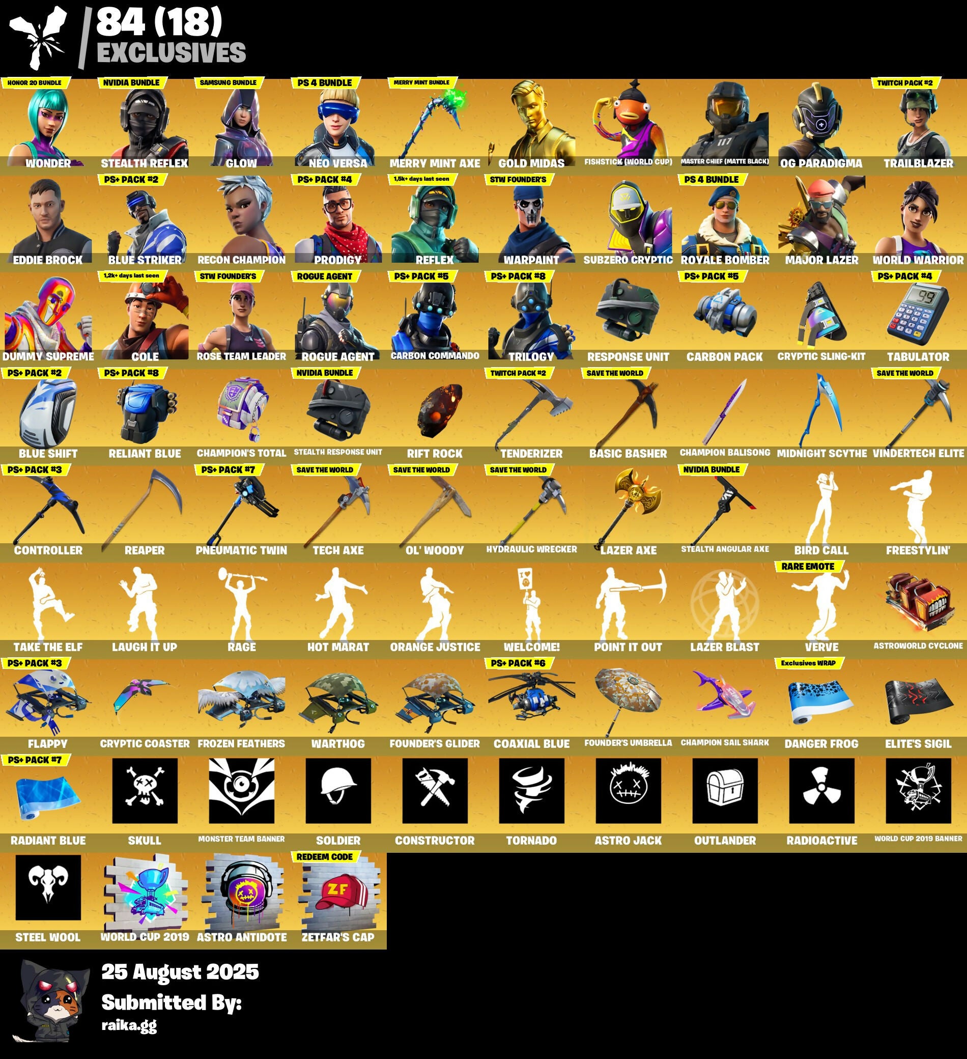 OG Fortnite Account☑️521 Skins☑️Wonder☑️Stealth Reflex☑️Royale Bomber️☑️Neo Versa️☑️Glow☑️Blue Striker☑️WC Fishstick☑️World Warrior☑️Twitch Prime☑️Recon Champion☑️Dummy Supreme☑️Gold Midas☑️Merry Mint Axe☑️Cold Snap☑️Driver☑️Freestylin'☑️Laugh it up☑️