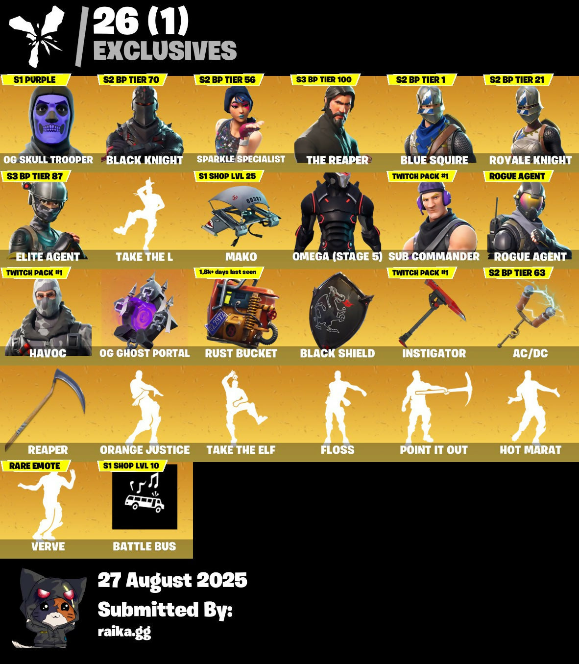 OG Fortnite Account☑️90 Skins☑️OG Skull Trooper (Purple)☑️Black Knight☑️Sparkle Specialist☑️The Reaper☑️Omega (Purple Lights)☑️Twitch Prime☑️Reaper Axe☑️Ice Breaker☑️Crowbar☑️Floss☑️Take the L☑️Mako☑️2,700 V-Bucks☑️