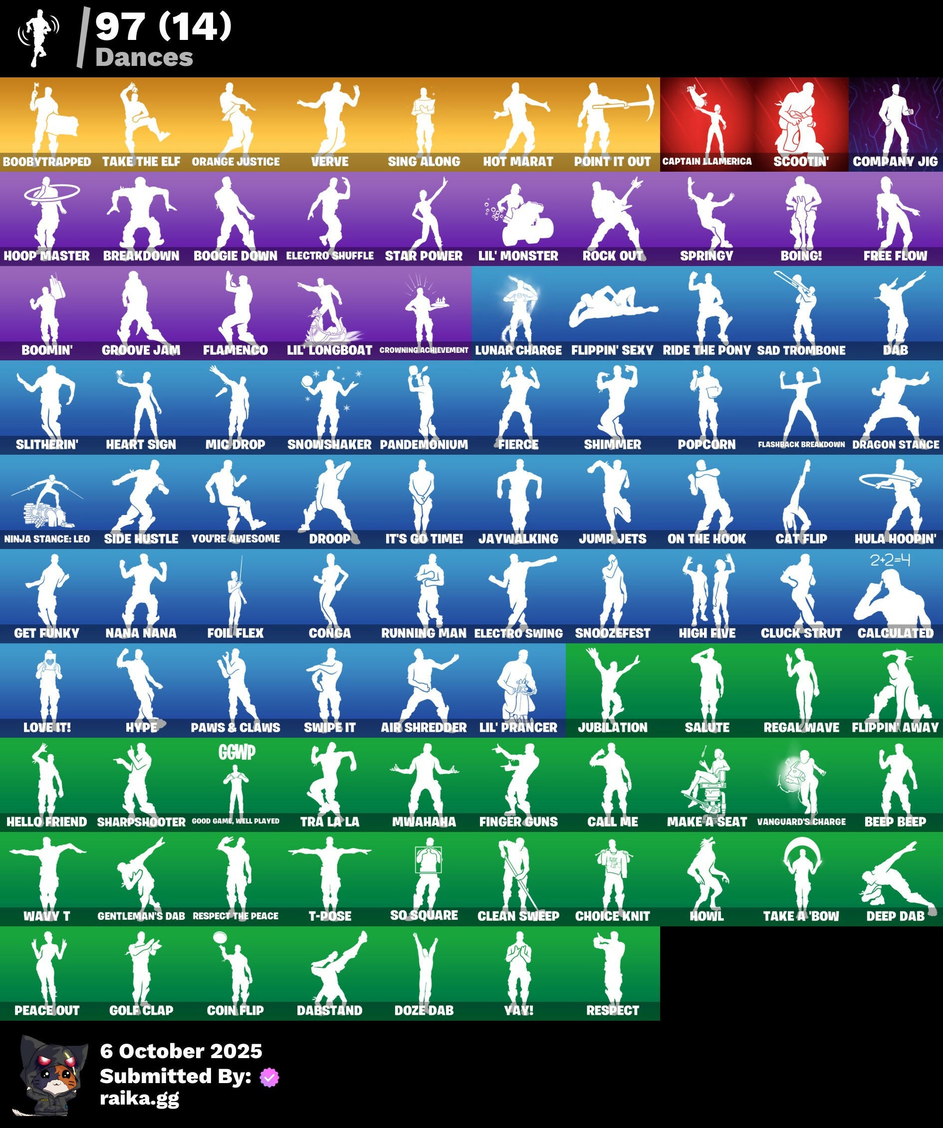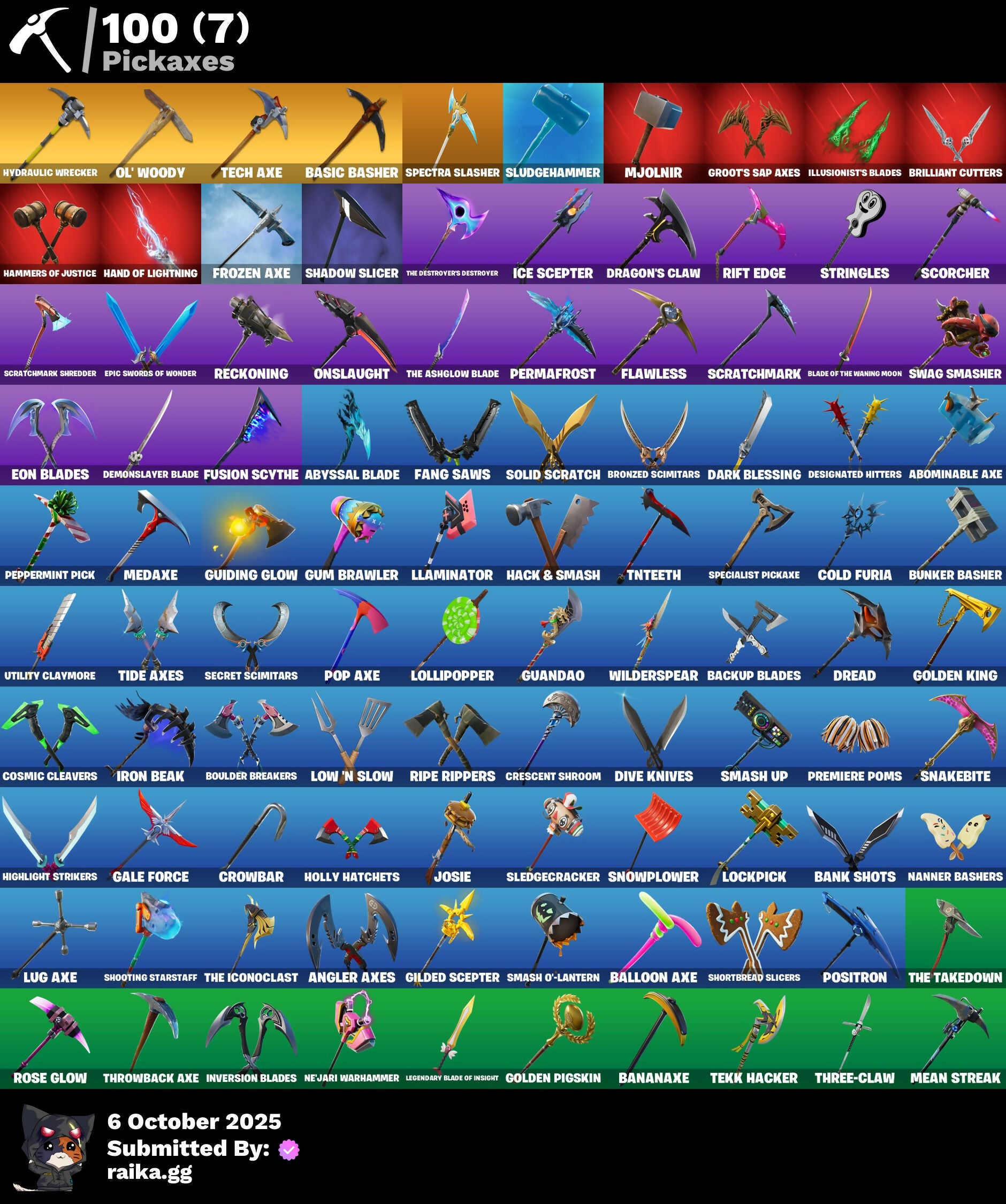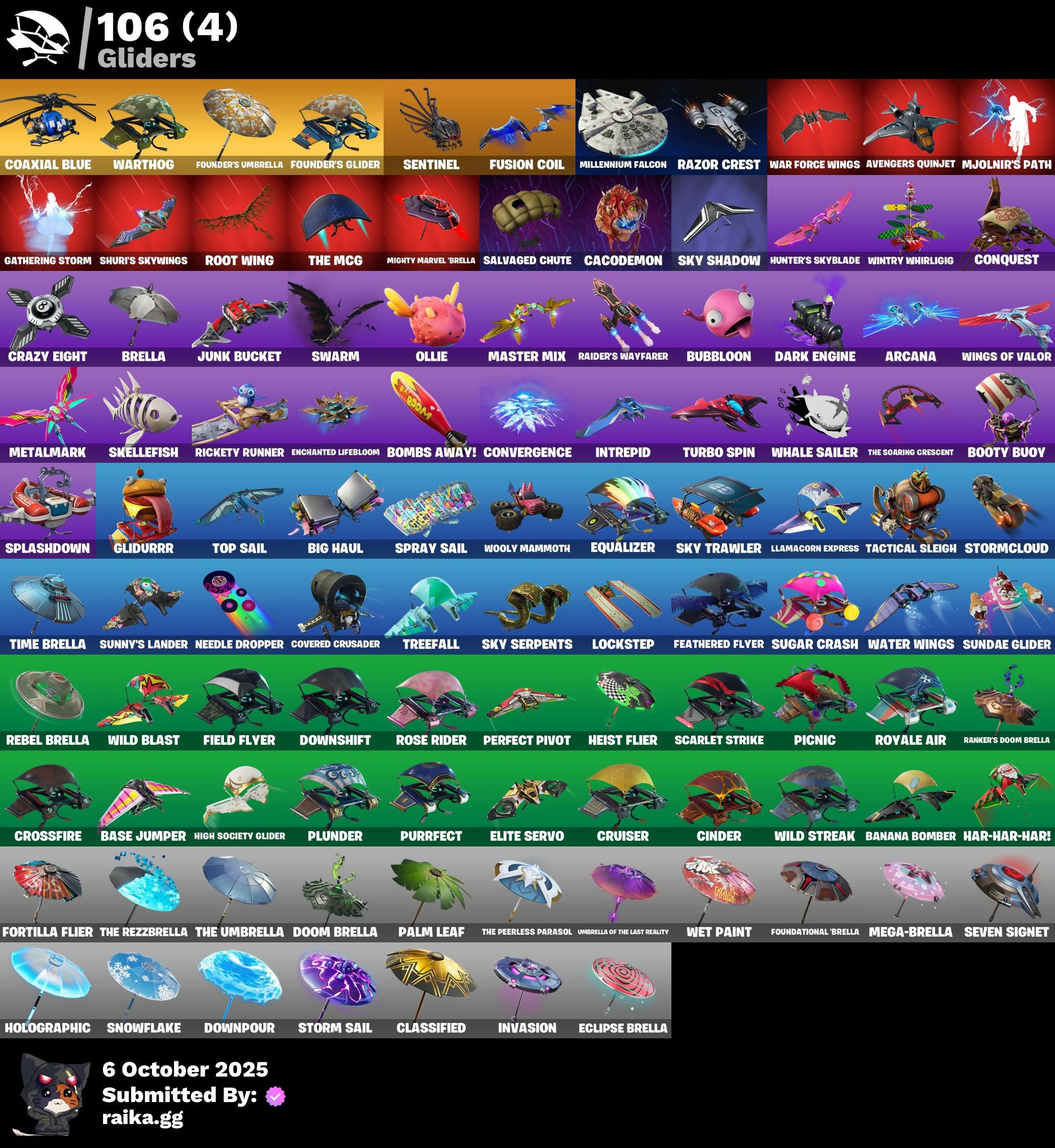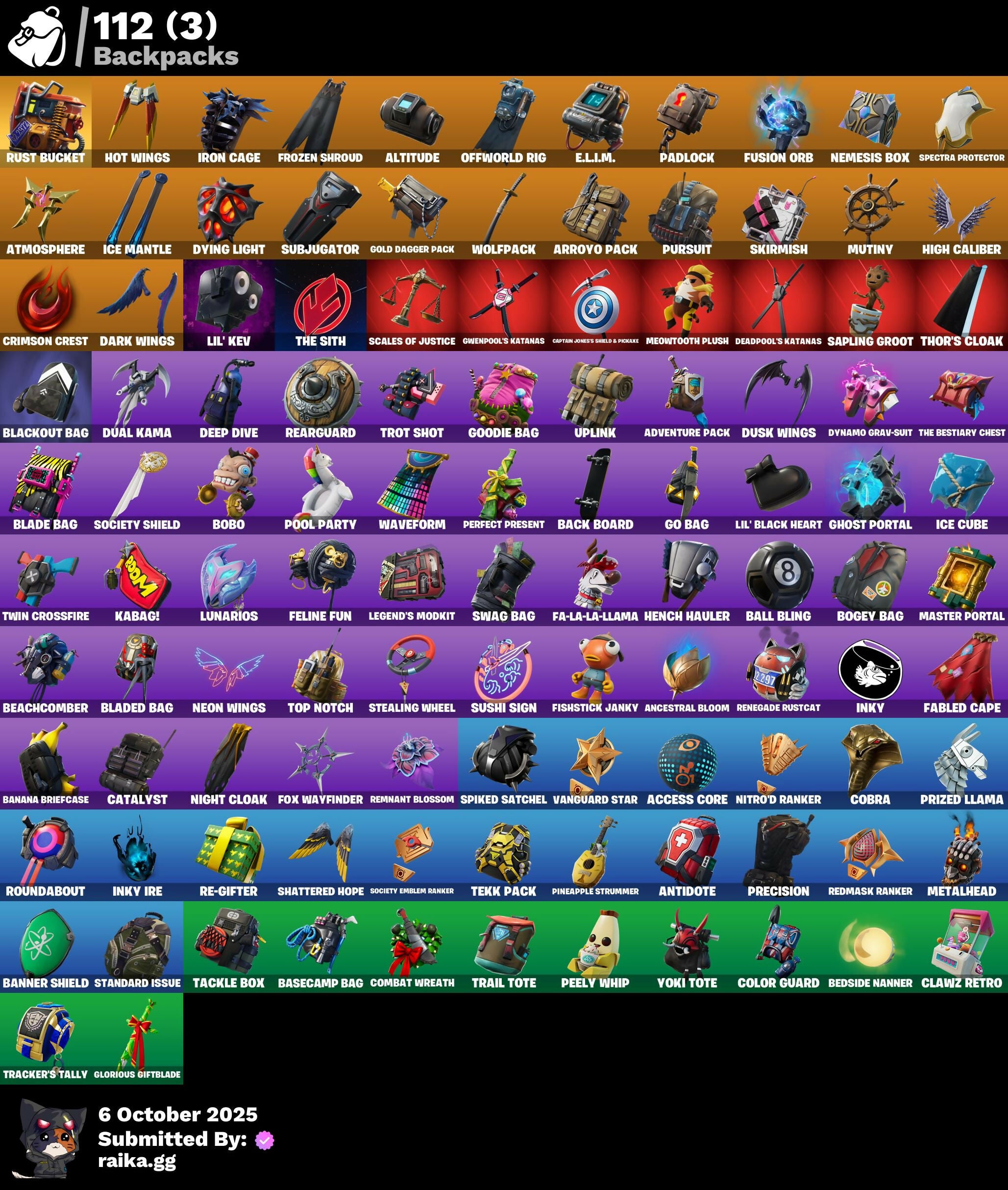 8-Ball vs Scratch, A.I.M., Abominable Axe, AbseNZ, Abyssal Blade, Access Core, Adventure Pack, Agent Peely, Air Shredder, Altitude, Ancestral Bloom, Angler Axes, Antidote, Arcana, Arctic Adeline, Arctic Assassin, Arroyo Pack, Assault Trooper, Atmosphere, Avengers Quinjet, Back Board, Backup Blades, Ball Bling, Balloon Axe, Banana Bomber, Banana Briefcase, Bananaxe, Bank Shots, Banner Shield, Base Jumper, Basecamp Bag, Basic Basher, Battlehawk, Beachcomber, Bedside Nanner, Beep Beep, Big Haul, Blackheart, Blackout Bag, Blade Bag, Blade of the Waning Moon, Bladed Bag, Blizzabelle, Bobo, Bogey Bag, Boing!, Bombs Away!, Boobytrapped, Boogie Down, Boomin', Booty Buoy, Boulder Breakers, Breakdown, Brella, Brilliant Cutters, Bronzed Scimitars, Brutus, Bubbloon, Bullseye, Bunker Basher, Bunker Jonesy, Cacodemon, Calamity, Calculated, Call Me, Cameo vs Chic, Captain Jones's Shield & Pickaxe, Captain Llamerica, Carbide, Cat Flip, Catalyst, Charlotte, Choice Knit, Cinder, Classified, Clawz Retro, Clean Sweep, Clinical Crosser, Cluck Strut, Coaxial Blue, Cobra, Coin Flip, Cold Furia, Color Guard, Combat Wreath, Company Jig, Conga, Conquest, Convergence, Cosmic Cleavers, Covered Crusader, Crazy Eight, Crescent Shroom, Crimson Crest, Crossfire, Crowbar, Crowning Achievement, Cruiser, D'Ark, DJ Yonder, Dab, Dabstand, Dark Blessing, Dark Engine, Dark Wings, Deadpool, Deadpool's Katanas, Deep Dab, Deep Dive, Demonslayer Blade, Designated Hitters, Dire, Dive Knives, Doom Brella, Downpour, Downshift, Doze Dab, Dragon Stance, Dragon's Claw, Dread, Drift, Droop, Dual Kama, Dusk, Dusk Wings, Dying Light, Dynamo Grav-Suit, E.L.I.M., Eclipse Brella, Electro Shuffle, Electro Swing, Elite Servo, Ember, Enchanted Lifebloom, Enforcer, Eon Blades, Epic Swords of Wonder, Equalizer, Fa-La-La-Llama, Fable, Fabled Cape, Fade, Fang Saws, Feathered Flyer, Feline Fun, Field Flyer, Fierce, Finger Guns, Fishstick Janky, Flamenco, Flashback Breakdown, Flawless, Flippin' Away, Flippin' Sexy, Foil Flex, Fortilla Flier, Foundational 'Brella, Founder's Glider, Founder's Umbrella, Fox Wayfinder, Free Flow, Frozen Axe, Frozen Shroud, Fusion, Fusion Coil, Fusion Orb, Fusion Scythe, Gale Force, Gathering Storm, Gear Specialist Maya, Gentleman's Dab, Get Funky, Ghost Portal, Giddy-Up, Gilded Scepter, Glidurrr, Glorious Giftblade, Go Bag, Gold Dagger Pack, Golden King, Golden Pigskin, Golf Clap, Good Game, Well Played, Goodie Bag, Groot, Groots Sap Axes, Groove Jam, Guandao, Guiding Glow, Gum Brawler, Gwenpool's Katanas, Hack & Smash, Hammers of Justice, Hand of Lightning, Har-Har-Har!, Hard Charger, Haven, Heart Sign, Heist Flier, Hello Friend, Hench Hauler, High Caliber, High Five, High Society Glider, Highlight Strikers, Holiday Boxy, Holly Hatchets, Holographic, Hoop Master, Hot Marat, Hot Wings, Howl, Hula Hoopin', Hunter's Skyblade, Huntress, Hybrid, Hydraulic Wrecker, Hype, Ice Cube, Ice Mantle, Ice Scepter, Illusionist's Blades, Inky, Inky Ire, Intrepid, Invasion, Inversion Blades, Iris, Iron Beak, Iron Cage, It's Go Time!, Jaywalking, Jennifer Walters, Josie, Journey vs Hazard, Jubilation, Jump Jets, Junk Bucket, Kabag!, Krisabelle, Kuno, Laguna, Legend's Modkit, Legendary Blade of Insight, Lil Split, Lil' Black Heart, Lil' Kev, Lil' Longboat, Lil' Monster, Lil' Prancer, Llamacorn Express, Llaminator, Lockpick, Lockstep, Lollipopoper, Love It!, Low 'N Slow, Lt. Evergreen, Lt. John Llama, Lug Axe, Lunar Charge, Lunarios, Luxe, Lynx, Make A Seat, Mancake, Mandalorian, Master Key, Master Mix, Master Portal, Mean Streak, Medaxe, Mega-Brella, Meowscles, Meowtooth Plush, Metalhead, Metamark, Mic Drop, Midas, Mighty Marvel 'Brella, Millennium Falcon, Mjolnir, Mjolnir's Path, Mutiny, Mwahaha, Nana Nana, Nanner Bashers, Ne'Jari Warhammer, Needle Dropper, Nemesis Box, Neon Wings, Night Cloak, Nightshade, Ninja Stance: Leo, Nitro'd Ranker, Ocean, Offworld Rig, Ol' Woody, Ollie, Omega, On The Hook, Onesie, Onslaught, Orange Justice, Padlock, Palm Leaf, Pandemonium, Paws & Claws, Peace Out, Peely, Peely Whip, Peppermint Pick, Perfect Pivot, Perfect Present, Permafrost, Picnic, Pineapple Strummer, Plunder, Point It Out, Polar Peely, Pool Party, Pop Axe, Popcorn, Positron, Powder, Precision, Premiere Poms, Prized Llama, Purrfect, Pursuit, Ragnarok, Raider's Wayfarer, Ranker's Doom Brella, Ravage, Raven, Razor Crest, Re-Gifter, Rearguard, Rebel Brella, Reckoning, Recon Specialist, Red Strike, Redline, Redmask Ranker, Reese, Regal Wave, Remedy vs Toxin, Remnant Blossom, Renegade Lynx, Renegade Rustcat, Respect, Respect The Peace, Rickety Runner, Ride The Pony, Rift Edge, Ripe Rippers, Rippley vs Sludge, Rock Out, Rogue Agent, Ronin, Rook, Root Wing, Rose Glow, Rose Rider, Rose Team Leader, Roundabout, Rox, Royale Air, Ruby Shadows, Ruin, Running Man, Rust Bucket, Sad Trombone, Salute, Salvaged Chute, Sapling Groot, Scales Of Justice, Scarlet Strike, Scootin', Scorcher, Scratchmark, Scratchmark Shredder, Scuba Jonesy, Secret Scimitars, Sentinel, Seven Signet, Sgt. Winter, Shadow Slicer, Shanta, Sharpshooter, Shattered Hope, Shimmer, Shooting Starstaff, Shortbread Slicers, Shuri's Skywings, Side Hustle, Sidewinder, Sing Along, Skellefish, Skirmish, Skull Trooper, Sky Serpents, Sky Shadow, Sky Trawler, Skye, Sled Ready Guff, Sledgecracker, Sledgehammer, Slitherin', Sludgehammer, Smash O'-Lantern, Smash Up, Snakebite, Snoozefest, Snowflake, Snowplower, Snowshaker, So Square, Society Emblem Ranker, Society Shield, Solid Scratch, Specialist Pickaxe, Spectra Knight, Spectra Protector, Spectra Slasher, Spiked Satchel, Splashdown, Spray Sail, Springy, Squad Leader, Standard Issue, Star Power, Stealing Wheel, Storm, Storm Sail, Stormcloud, Stringles, Subjugator, Sugar Crash, Summit Striker, Sun Strider, Sundae Glider, Sunny's Lander, Survival Specialist, Sushi Sign, Swag Bag, Swag Smasher, Swarm, Swipe It, T-Pose, Tackle Box, Tactical Sleigh, Take A 'Bow, Take The Elf, Tech Axe, Tekk Hacker, Tekk Pack, Teknique, The Ace, The Ashglow Blade, The Bestiary 