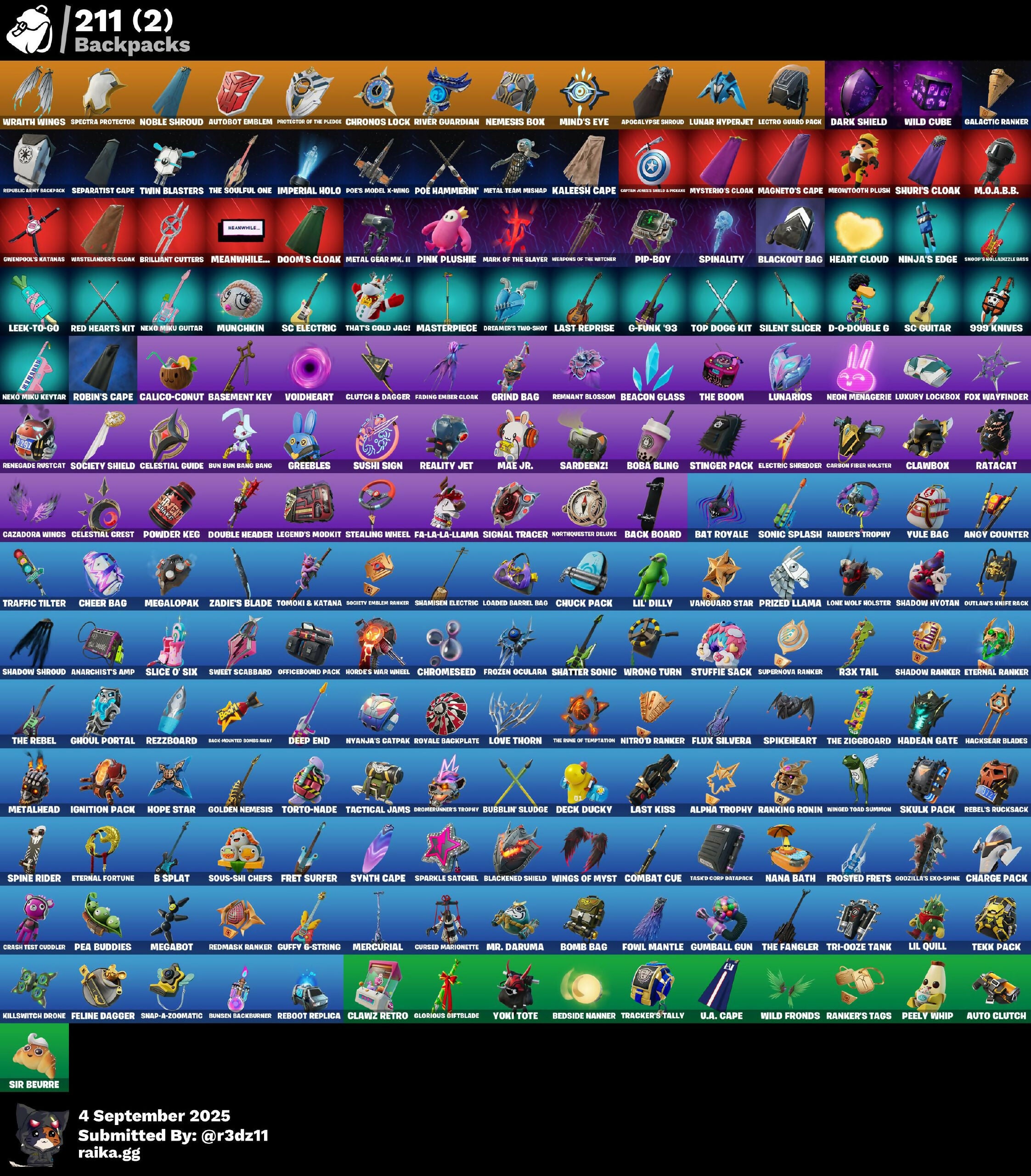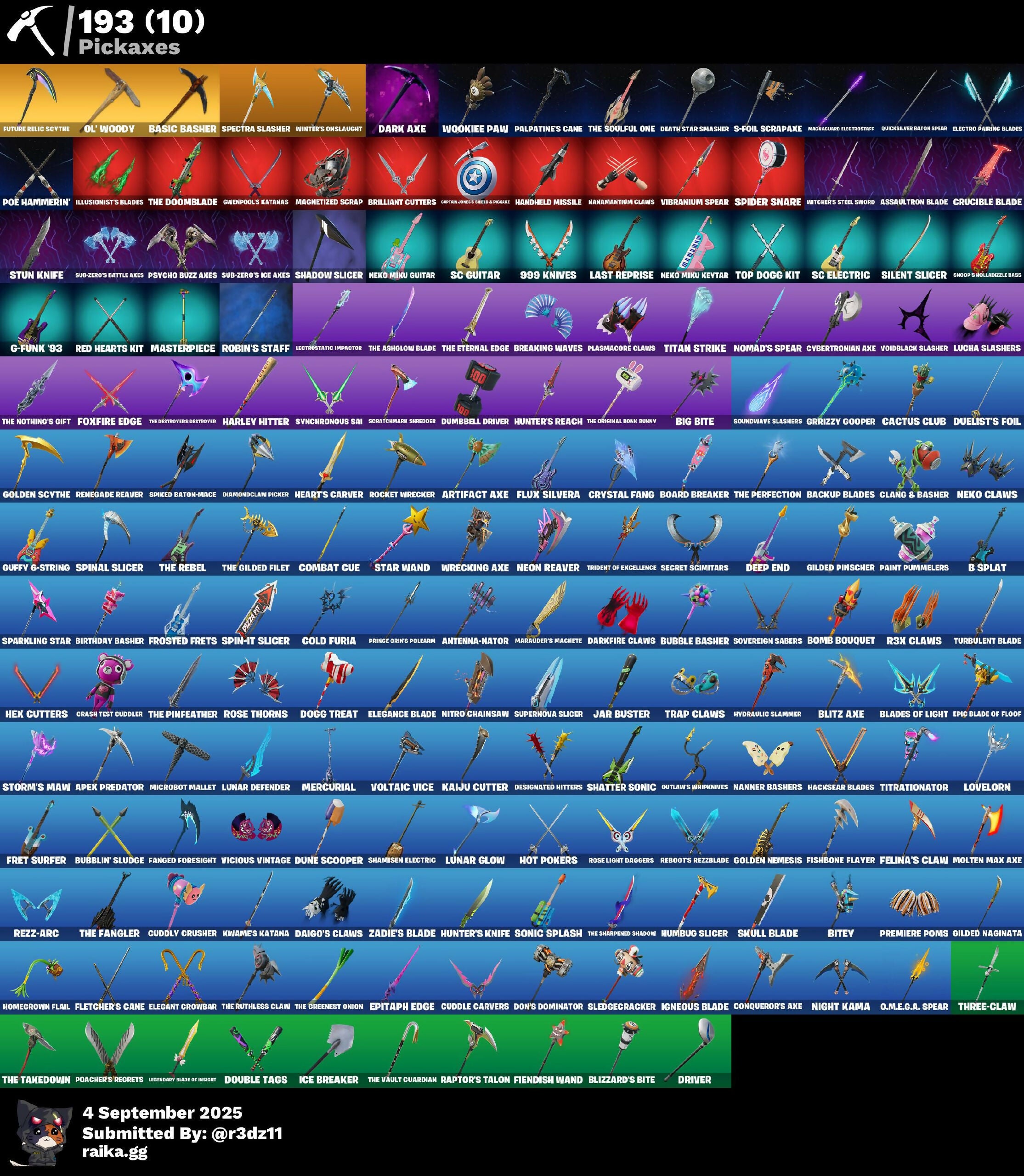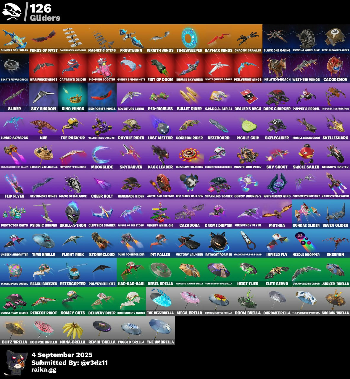 (Snikt!), 1-Ball, 999 Knives, Adventure Aerial, Aerial Assault Bomber, Aerial Assault Captain, Ahsoka Tano, Alpha Trophy, Anarchist's Amp, Angv Counter, Antenna-Nator, Antonia, Apex Predator, Apocalypse Shroud, Apprentice Evie, Arachrobatics, Arcane Research, Arctic Adeline, Arm The Pumpkin!, Artifact Axe, Ascension Nezumi, Assaultron Blade, Astrea, Astro Armor, Auto Clutch, Autobot Emblem, Aw, Shucks., Ayla Winn, B Splat, Back Board, Back-Mounted Bombs Away, Backup Blades, Balance Board, Baron's Hoard, Basement Key, Basic Basher, Bat Royale, Battle Blessing, Battle-Tested, Baymax Wings, Beach Breezer, Beacon Glass, Bear Hug, Beatzbunny, Bedside Nanner, Bernie, Bi-Han, Big Bite, Big Dill, Big Fan, Billy Bounce, Birdarang Flourish, Birthday Basher, Bitev, Black Knight T-60 Power Armor, Black One X-Wing, Black Panther (Shuri), Black Queen, Blackened Shield, Blackout Bag, Blades of Light, Blitz 'Brella, Blitz Axe, Blizzard's Bite, Board Breaker, Boba Bling, Boba Snack, Bomb Bag, Bomb Bouquet, Bone Breaker, Bones, Boogie Down, Bow Go, Breaking Waves, Brilliant Cutters, Bring It Around, Brite Hatsune Miku, Brite Moves, Brite Raider, Bubble Basher, Bubblegum Highwire, Bubblin' Sludge, Bullet Rider, Bullpen Brawler Dusty, Bullseye, Bun Bun Bang Bang, Bunsen Backburner, Burnoff, Buzzsaw Breacher, Bytes, Bytes (Lone Traveler), Cacodemon, Cactus Club, Calico-Conut, Called Shot, Camo War Machine, Captain Jones, Captain Llamerica, Captain Phasma, Captain's Glider, Captain-Jones's Shield & Pickaxe, Carbon Fiber Holster, Cassidy Quinn, Cauldron Chill, Cazadora, Cazadora Wings, Celestial Crest, Celestial Guide, Chalked Up 1-Ball, Chaos Director, Chaotic Crawler, Charge Pack, Cheer Bag, Cheer Bolt, Chef's Special, Chemist's Cloudglider, Chrome Punk, Chromebrella, Chromeseed, Chromestruck Fire, Chronos Lock, Chuck Pack, Clang & Basher, Claptrap, Classic Peelverine, Clawbox, Clawz Retro, Cliffside Soarer, Club President Helsie, Clutch & Dagger, Codsworth's Cleanup, Cold Furia, Collector Kado Thorne, Combat Cue, Combat Tech Jules, Comfy Cats, Commander's Descent, Competitor's Time Brella, Conqueror's Axe, Conqueror's Claim, Count It!, Crack It, Crash Test Cuddler, Crowning Achievement, Crucible Blade, Crystal Fang, Cuddle Carvers, Cuddle Team Sierra, Cuddle Team Specialist, Cuddly Crusher, Curling Iron, Cursed Marionette, Cybertronian Axe, D-O-Double G, Daigo, Daigo's Claws, Dali, Dali (Cosmic Legacy), Dancefloor Diva, Dark Axe, Dark Charger, Dark Jonesy, Dark Red Knight, Dark Shield, Dark Wild Card, Darkfire Claws, Dealer's Deck, Death Star Smasher, Deck Ducky, Deep End, Delivery Diver, Demon Hunter Hope, Designated Hitters, Diamond Throne, Diamondclaw Picker, Dice Roll, Die With A Smile, Die With A Smile Bruno, Dillinger The Gherk, Dirtbike Challenge, Disguise, Diva Fever, Do The 'Split, Dogg Treat, Don's Dominator, Doom, Doom Brella, Doom Slayer, Doom's Cloak, Doom's Domain, Double Header, Double Tags, Double-Barreled Boom Ballasts, Doze Dab, Dragonhearted 'Brella, Dramatic Flares, Dreamer's Two-Shot, Driver, Drome Drifter, Dromerunner's Trophy, Duelist's Card Trick, Duelist's Foil, Dumbbell Driver, Dummy, Dune Scooper, Durrr Taisho, Durrr Taisho (Cosmic Legacy), Dusk Knight, Dusty, Dynamo TNTOON-A, Dynamo Tntina, Eclipse Brella, Electric Shredder, Electro Pairing Blades, Electrostaff, Elegance Blade, Elegant Crowbar, Elite Servo, Emma Frost, Emperor Palpatine, Empress Fan Dance, Energized Godzilla, Epic Blade of Floof, Epitaph Edge, Era, Eren Jaeger, Eternal Fortune, Eternal Ranker, Explorer Emilie, Expressionism, Fa-la-la-llama, Fading Ember Cloak, Fang Dance, Fanged Foresight, Feel The Force, Felina, Felina's Claw, Feline Dagger, Fiendish Wand, Fire Show, Fireworks Salvo, Fish Thicc, Fishbone Flayer, Fist Bump, Fist Of Doom, Flaky Feast, Flashback Breakdown, Fletcher Kane, Fletcher's Cane, Flight Risk, Flip Flyer, Flux Silvera, Focus, Foil Flex, Force Lightning, Fowl Mantle, Fox Wayfinder, Foxfire Edge, Frequency Flyer, Fret Surfer, Front Page Pose, Frostburn, Frosted Frets, Frozen Oculara, Future Relic Scythe, G-Funk '93, Galactic Ranker, General Grievous, Geralt Of Rivia, Get Griddy, Get Out Of Your Mind, Get Schwifty, Ghoul Portal, Gilded Naginata, Gilded Pinscher, Glorious Giftblade, Godzilla Evolved, Godzilla's Exo-Spine, Golden Conqueror, Golden Nemesis, Golden Scythe, Grand Glacier Glider, Greebles, Grind Bag, Grriz, Grriz (Wild Beary Grriz), Grrizzy Gooper, Guardian Jade, Guffy 6-String, Gumball Gun, Gunslinger Outlaw Midas, Gwen's Spiderchute, Gwen-Step, Gwenpool, Gwenpool's Katanas, Hacksear Blades, Hadean Gate, Hand Signals, Handheld Missile, Hands Off!, Har-Har-Har!, Harbinger Armor Omegak0r, Harley Hitter, Haruka Of The Mask, Haruka of the Masks (Cosmic Legacy), Haylee Skye, Heart Chopper, Heart Cloud, Heartburst, Hearts Carver, Heist Flier, Helichopper, Hellfire Dance, Helsie, Hero Baymax, Hex Cutters, High Society Glider, Highwire, Holiday Boxy, Homegrown Flail, Hope, Hope Star, Horde's War Wheel, Horizon Rider, Hot Pokers, Hot Slurp Balloon, Humbug Slicer, Hunter's Knife, Hunter's Reach, Hydraulic Slammer, Hype!, Hypnot-Eyes, I Need You To Concentrate, I'm A Mystery, Ice Breaker, Ice Spice, Iconic Era, Igneous Blade, Igni Sign, Ignition Pack, Illusionist's Blades, Illusory Mysterio, Imani, Imperial Holo, In Da Party, Infield Fly, Inflate-A-Roach, Invisible Cut, It's Chemistry!, Jade, Jar Buster, Jet Signals, Joltara, Joss, Jubilation, Junker 'Brella, Kado Thorne, Kaiju Cutter, Kaleesh Cape, Keisha Cross, Kendo, Khaby Lame, Killswitch, Killswitch Drone, King Wings, Kintsugi Daigo, Knight Conqueror, Kwame, Kwame's Katana, LBC '93 Dogg, Lady Of Cranes, Lady of Cranes (Cosmic Legacy), Laser Focused, Last Kiss, Last Reprise, Leafy Longboardin', Lectro Guard Pack, Lectrostatic Impactor, Leek-to-Go, Legend's Modkit, Legendary Blade of Insight, Lennox Rose, Lightrider, Lil Quill, Lil Split, Lil' Dilly, Lil' Godzilla Attack, Lil' Longboat, Lil' Prancer, Lil' Resistance Bomber, Lil' T-6 Shuttle