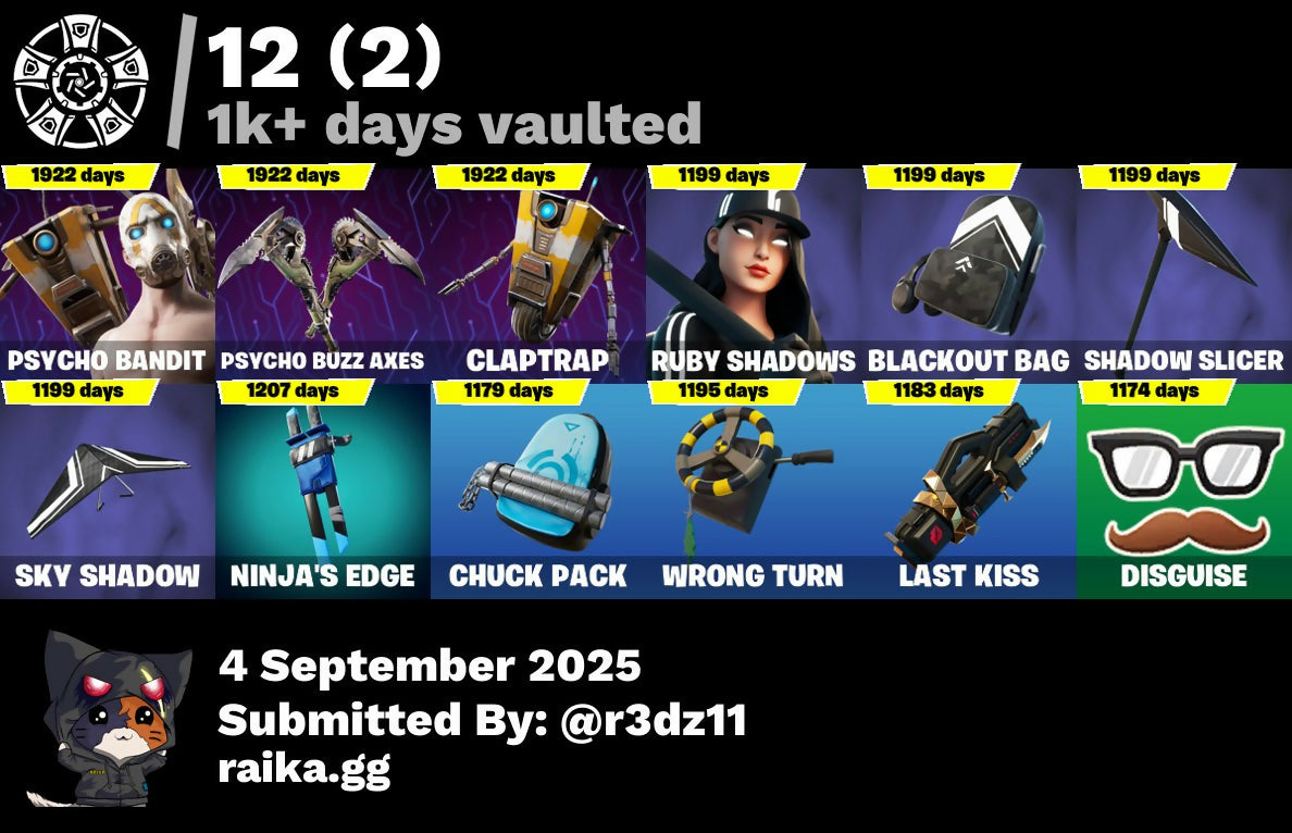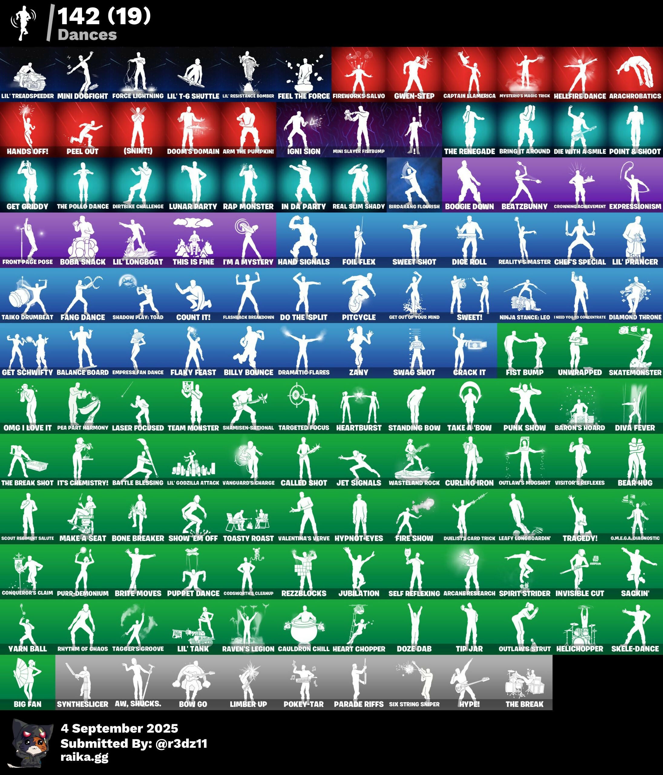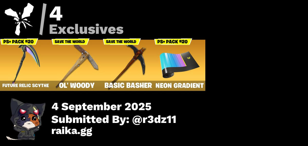 (Snikt!), 1-Ball, 999 Knives, Adventure Aerial, Aerial Assault Bomber, Aerial Assault Captain, Ahsoka Tano, Alpha Trophy, Anarchist's Amp, Angv Counter, Antenna-Nator, Antonia, Apex Predator, Apocalypse Shroud, Apprentice Evie, Arachrobatics, Arcane Research, Arctic Adeline, Arm The Pumpkin!, Artifact Axe, Ascension Nezumi, Assaultron Blade, Astrea, Astro Armor, Auto Clutch, Autobot Emblem, Aw, Shucks., Ayla Winn, B Splat, Back Board, Back-Mounted Bombs Away, Backup Blades, Balance Board, Baron's Hoard, Basement Key, Basic Basher, Bat Royale, Battle Blessing, Battle-Tested, Baymax Wings, Beach Breezer, Beacon Glass, Bear Hug, Beatzbunny, Bedside Nanner, Bernie, Bi-Han, Big Bite, Big Dill, Big Fan, Billy Bounce, Birdarang Flourish, Birthday Basher, Bitev, Black Knight T-60 Power Armor, Black One X-Wing, Black Panther (Shuri), Black Queen, Blackened Shield, Blackout Bag, Blades of Light, Blitz 'Brella, Blitz Axe, Blizzard's Bite, Board Breaker, Boba Bling, Boba Snack, Bomb Bag, Bomb Bouquet, Bone Breaker, Bones, Boogie Down, Bow Go, Breaking Waves, Brilliant Cutters, Bring It Around, Brite Hatsune Miku, Brite Moves, Brite Raider, Bubble Basher, Bubblegum Highwire, Bubblin' Sludge, Bullet Rider, Bullpen Brawler Dusty, Bullseye, Bun Bun Bang Bang, Bunsen Backburner, Burnoff, Buzzsaw Breacher, Bytes, Bytes (Lone Traveler), Cacodemon, Cactus Club, Calico-Conut, Called Shot, Camo War Machine, Captain Jones, Captain Llamerica, Captain Phasma, Captain's Glider, Captain-Jones's Shield & Pickaxe, Carbon Fiber Holster, Cassidy Quinn, Cauldron Chill, Cazadora, Cazadora Wings, Celestial Crest, Celestial Guide, Chalked Up 1-Ball, Chaos Director, Chaotic Crawler, Charge Pack, Cheer Bag, Cheer Bolt, Chef's Special, Chemist's Cloudglider, Chrome Punk, Chromebrella, Chromeseed, Chromestruck Fire, Chronos Lock, Chuck Pack, Clang & Basher, Claptrap, Classic Peelverine, Clawbox, Clawz Retro, Cliffside Soarer, Club President Helsie, Clutch & Dagger, Codsworth's Cleanup, Cold Furia, Collector Kado Thorne, Combat Cue, Combat Tech Jules, Comfy Cats, Commander's Descent, Competitor's Time Brella, Conqueror's Axe, Conqueror's Claim, Count It!, Crack It, Crash Test Cuddler, Crowning Achievement, Crucible Blade, Crystal Fang, Cuddle Carvers, Cuddle Team Sierra, Cuddle Team Specialist, Cuddly Crusher, Curling Iron, Cursed Marionette, Cybertronian Axe, D-O-Double G, Daigo, Daigo's Claws, Dali, Dali (Cosmic Legacy), Dancefloor Diva, Dark Axe, Dark Charger, Dark Jonesy, Dark Red Knight, Dark Shield, Dark Wild Card, Darkfire Claws, Dealer's Deck, Death Star Smasher, Deck Ducky, Deep End, Delivery Diver, Demon Hunter Hope, Designated Hitters, Diamond Throne, Diamondclaw Picker, Dice Roll, Die With A Smile, Die With A Smile Bruno, Dillinger The Gherk, Dirtbike Challenge, Disguise, Diva Fever, Do The 'Split, Dogg Treat, Don's Dominator, Doom, Doom Brella, Doom Slayer, Doom's Cloak, Doom's Domain, Double Header, Double Tags, Double-Barreled Boom Ballasts, Doze Dab, Dragonhearted 'Brella, Dramatic Flares, Dreamer's Two-Shot, Driver, Drome Drifter, Dromerunner's Trophy, Duelist's Card Trick, Duelist's Foil, Dumbbell Driver, Dummy, Dune Scooper, Durrr Taisho, Durrr Taisho (Cosmic Legacy), Dusk Knight, Dusty, Dynamo TNTOON-A, Dynamo Tntina, Eclipse Brella, Electric Shredder, Electro Pairing Blades, Electrostaff, Elegance Blade, Elegant Crowbar, Elite Servo, Emma Frost, Emperor Palpatine, Empress Fan Dance, Energized Godzilla, Epic Blade of Floof, Epitaph Edge, Era, Eren Jaeger, Eternal Fortune, Eternal Ranker, Explorer Emilie, Expressionism, Fa-la-la-llama, Fading Ember Cloak, Fang Dance, Fanged Foresight, Feel The Force, Felina, Felina's Claw, Feline Dagger, Fiendish Wand, Fire Show, Fireworks Salvo, Fish Thicc, Fishbone Flayer, Fist Bump, Fist Of Doom, Flaky Feast, Flashback Breakdown, Fletcher Kane, Fletcher's Cane, Flight Risk, Flip Flyer, Flux Silvera, Focus, Foil Flex, Force Lightning, Fowl Mantle, Fox Wayfinder, Foxfire Edge, Frequency Flyer, Fret Surfer, Front Page Pose, Frostburn, Frosted Frets, Frozen Oculara, Future Relic Scythe, G-Funk '93, Galactic Ranker, General Grievous, Geralt Of Rivia, Get Griddy, Get Out Of Your Mind, Get Schwifty, Ghoul Portal, Gilded Naginata, Gilded Pinscher, Glorious Giftblade, Godzilla Evolved, Godzilla's Exo-Spine, Golden Conqueror, Golden Nemesis, Golden Scythe, Grand Glacier Glider, Greebles, Grind Bag, Grriz, Grriz (Wild Beary Grriz), Grrizzy Gooper, Guardian Jade, Guffy 6-String, Gumball Gun, Gunslinger Outlaw Midas, Gwen's Spiderchute, Gwen-Step, Gwenpool, Gwenpool's Katanas, Hacksear Blades, Hadean Gate, Hand Signals, Handheld Missile, Hands Off!, Har-Har-Har!, Harbinger Armor Omegak0r, Harley Hitter, Haruka Of The Mask, Haruka of the Masks (Cosmic Legacy), Haylee Skye, Heart Chopper, Heart Cloud, Heartburst, Hearts Carver, Heist Flier, Helichopper, Hellfire Dance, Helsie, Hero Baymax, Hex Cutters, High Society Glider, Highwire, Holiday Boxy, Homegrown Flail, Hope, Hope Star, Horde's War Wheel, Horizon Rider, Hot Pokers, Hot Slurp Balloon, Humbug Slicer, Hunter's Knife, Hunter's Reach, Hydraulic Slammer, Hype!, Hypnot-Eyes, I Need You To Concentrate, I'm A Mystery, Ice Breaker, Ice Spice, Iconic Era, Igneous Blade, Igni Sign, Ignition Pack, Illusionist's Blades, Illusory Mysterio, Imani, Imperial Holo, In Da Party, Infield Fly, Inflate-A-Roach, Invisible Cut, It's Chemistry!, Jade, Jar Buster, Jet Signals, Joltara, Joss, Jubilation, Junker 'Brella, Kado Thorne, Kaiju Cutter, Kaleesh Cape, Keisha Cross, Kendo, Khaby Lame, Killswitch, Killswitch Drone, King Wings, Kintsugi Daigo, Knight Conqueror, Kwame, Kwame's Katana, LBC '93 Dogg, Lady Of Cranes, Lady of Cranes (Cosmic Legacy), Laser Focused, Last Kiss, Last Reprise, Leafy Longboardin', Lectro Guard Pack, Lectrostatic Impactor, Leek-to-Go, Legend's Modkit, Legendary Blade of Insight, Lennox Rose, Lightrider, Lil Quill, Lil Split, Lil' Dilly, Lil' Godzilla Attack, Lil' Longboat, Lil' Prancer, Lil' Resistance Bomber, Lil' T-6 Shuttle