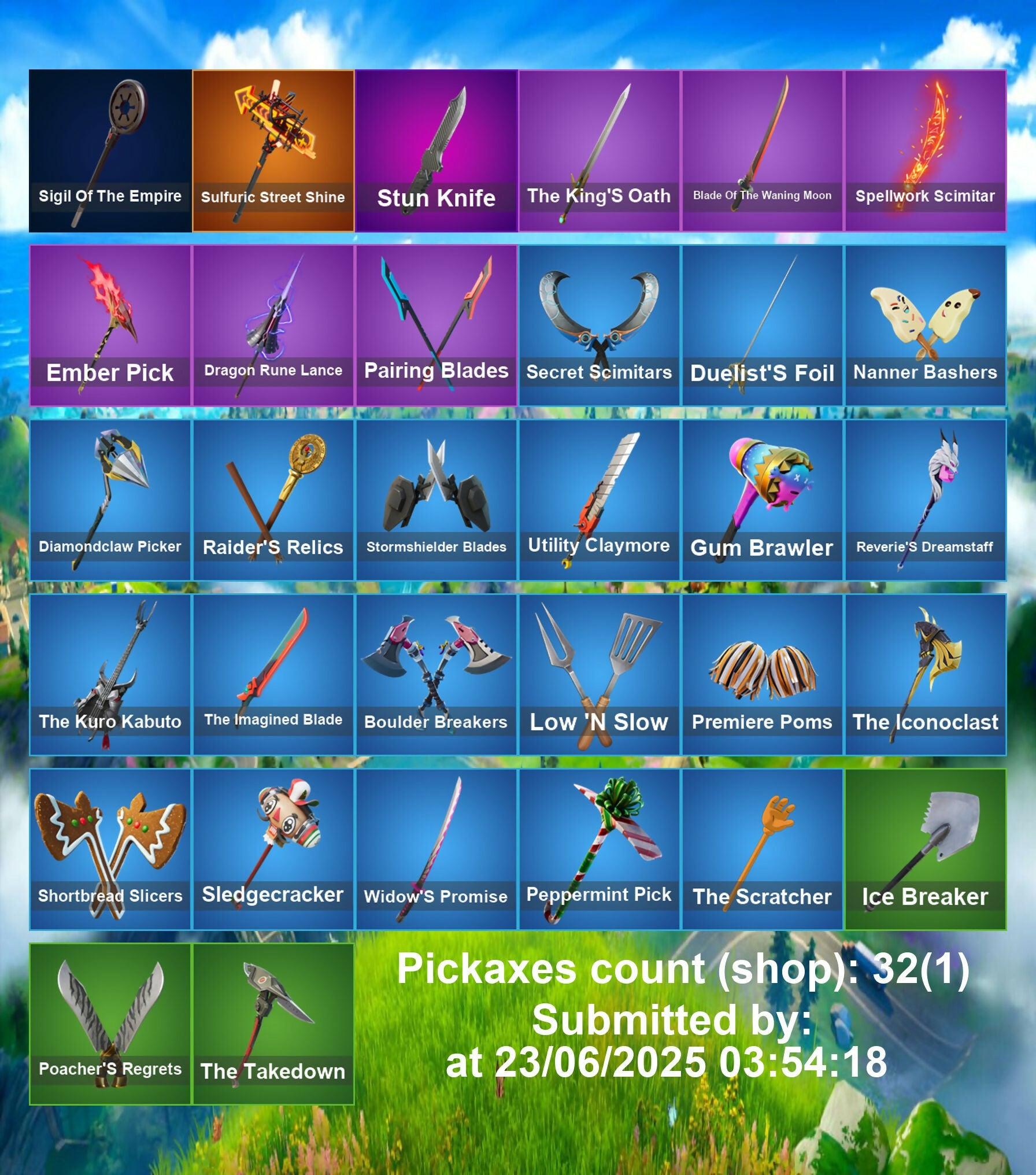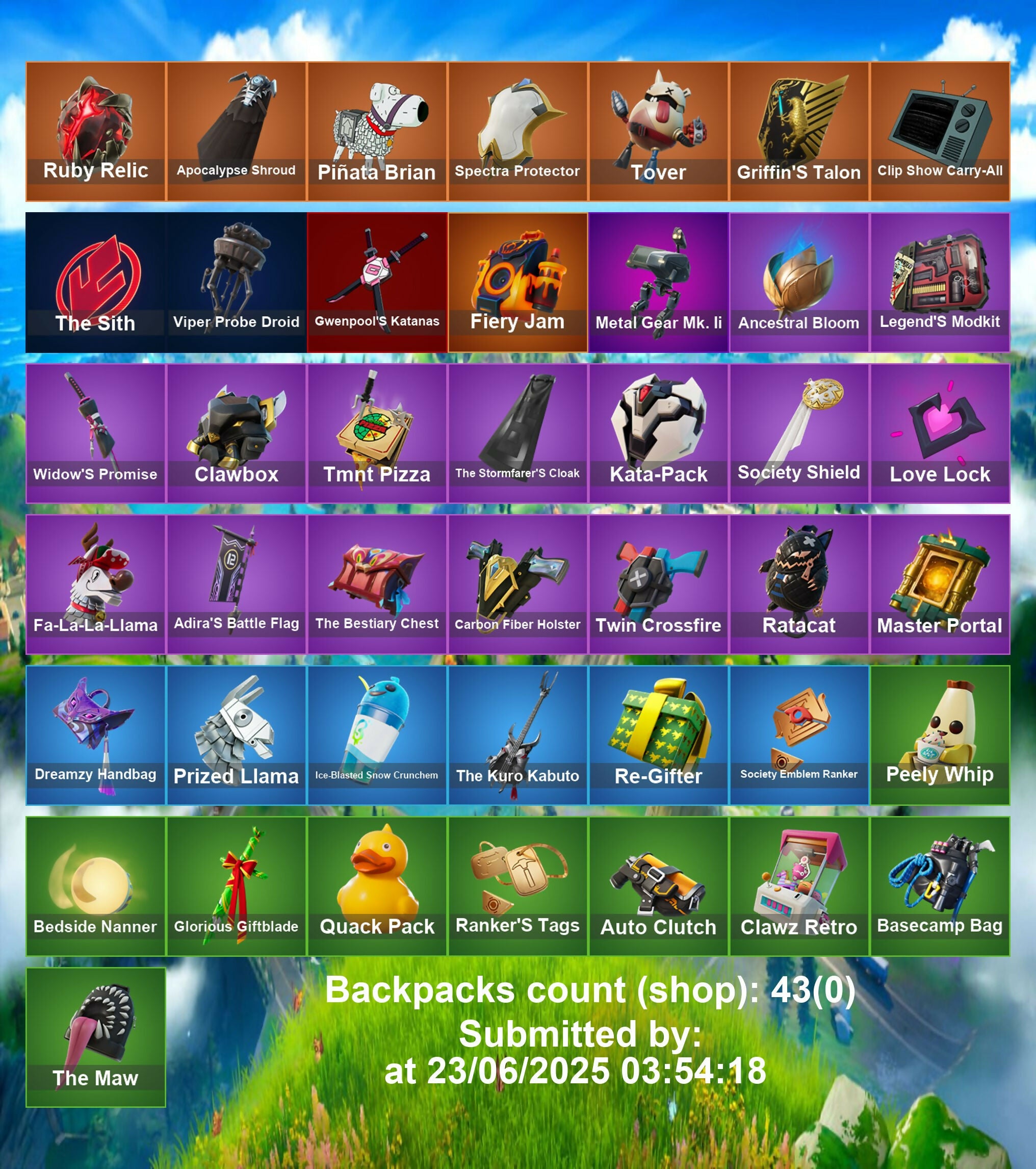 Adira, Adira'S Battle Flag, Ancestral Bloom, Apocalypse Shroud, Arctic Adeline, Arm The Pumpkin!, Auto Clutch, Basecamp Bag, Bedside Nanner, Blade Of The Waning Moon, Blowin' Up, Boobytrapped, Boogie Down, Boulder Breakers, Call Me, Carbon Fiber Holster, Card Drop, Clawbox, Clawz Retro, Clip Show Carry-All, Crowning Achievement, Cyclo Curl, Dagger Dance, Diamond Throne, Diamondclaw Picker, Doze Dab, Dragon Rune Lance, Dreamzy Handbag, Duelist's Foil, Ember Pick, Evie, Fa-La-La-Llama, Festival Phaedra, Fiery Jam, Foil Flex, Glorious Giftblade, Griffin'S Talon, Guff Gringle, Gum Brawler, Gwenpool'S Katanas, Heart Sign, Hello Friend, Holiday Boxy, Hope, I'm A Mystery, Ice Breaker, Ice-Blasted Snow Crunchem, Imperial March, It Is Finished, It's... You?, Kata-Pack, Knife Sharpener, Legend'S Modkit, Lil' Prancer, Love It!, Love Lock, Low 'N Slow, Lt. Evergreen, Malik, Master Portal, Metal Gear Mk. Ii, Montague, Nanner Bashers, Ninja Stance: Donnie, Ninja Stance: Leo, Ninja Stance: Mikey, Ninja Stance: Raph, Nisha, Oscar, Pairing Blades, Peely Whip, Peppermint Pick, Peter Griffin, Piñata Brian, Poacher's Regrets, Popular Vibe, Premiere Poms, Prized Llama, Quack Pack, Raider's Relics, Ranker'S Tags, Ratacat, Re-Gifter, Respect The Peace, Reverie, Reverie's Dreamstaff, Ruby Relic, Runway Racer, Sabina, Secret Scimitars, Shortbread Slicers, Shuriken Spinner, Sigil Of The Empire, Sled Ready Guff, Sledgecracker, Snap, Snowshaker, Society Emblem Ranker, Society Shield, Solid Snake, Spectra Protector, Spellwork Scimitar, Steady, Stormfarer, Stormshielder Blades, Stun Knife, Sulfuric Street Shine, Surfin' Bird, Tectonic Komplex, The Bestiary Chest, The Iconoclast, The Imagined Blade, The King's Oath, The Kuro Kabuto, The Maw, The Scratcher, The Sith, The Stormfarer'S Cloak, The Takedown, Tmnt Pizza, Tover, Twin Crossfire, Utility Claymore, Valeria, Vengeance Jones, Viper Probe Droid, Widow's Promise, Winterfest Bushranger, Wooly Warrior
