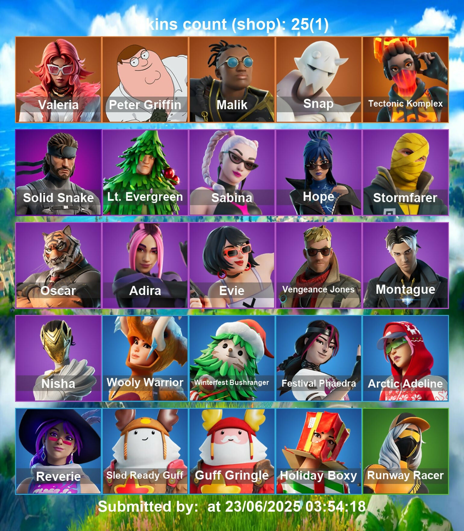 [PC] 25 skins | Valeria | Peter Griffin | Malik | Snap | Tectonic Komplex | Solid Snake | Lt. Evergreen | Sabina | Hope | Stormfarer | Oscar | Adira | 900 VB