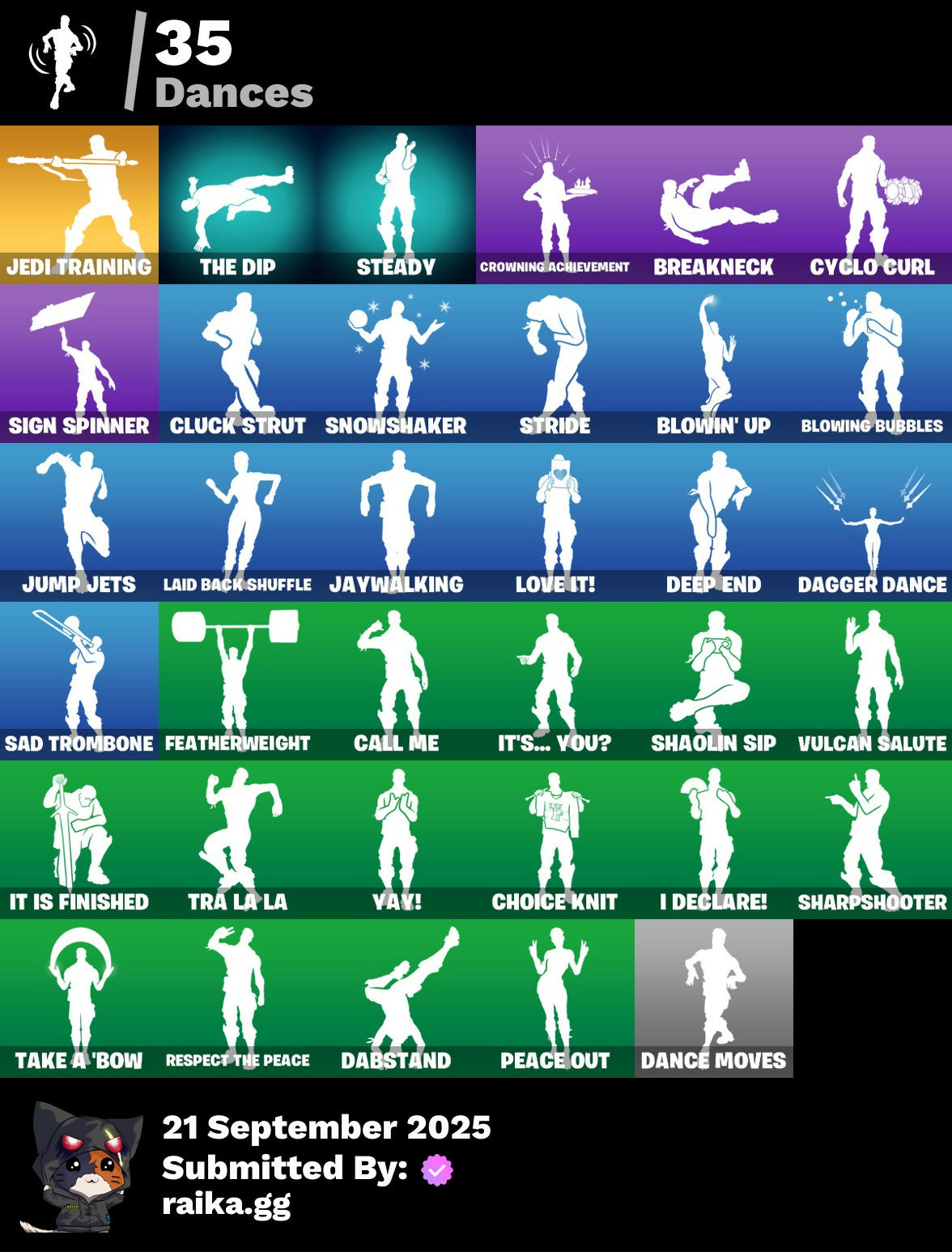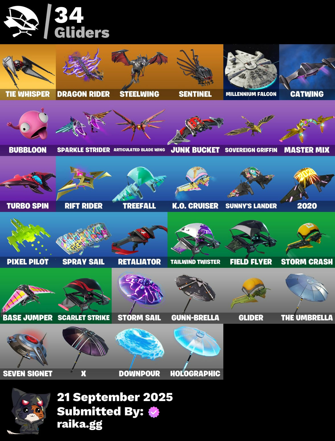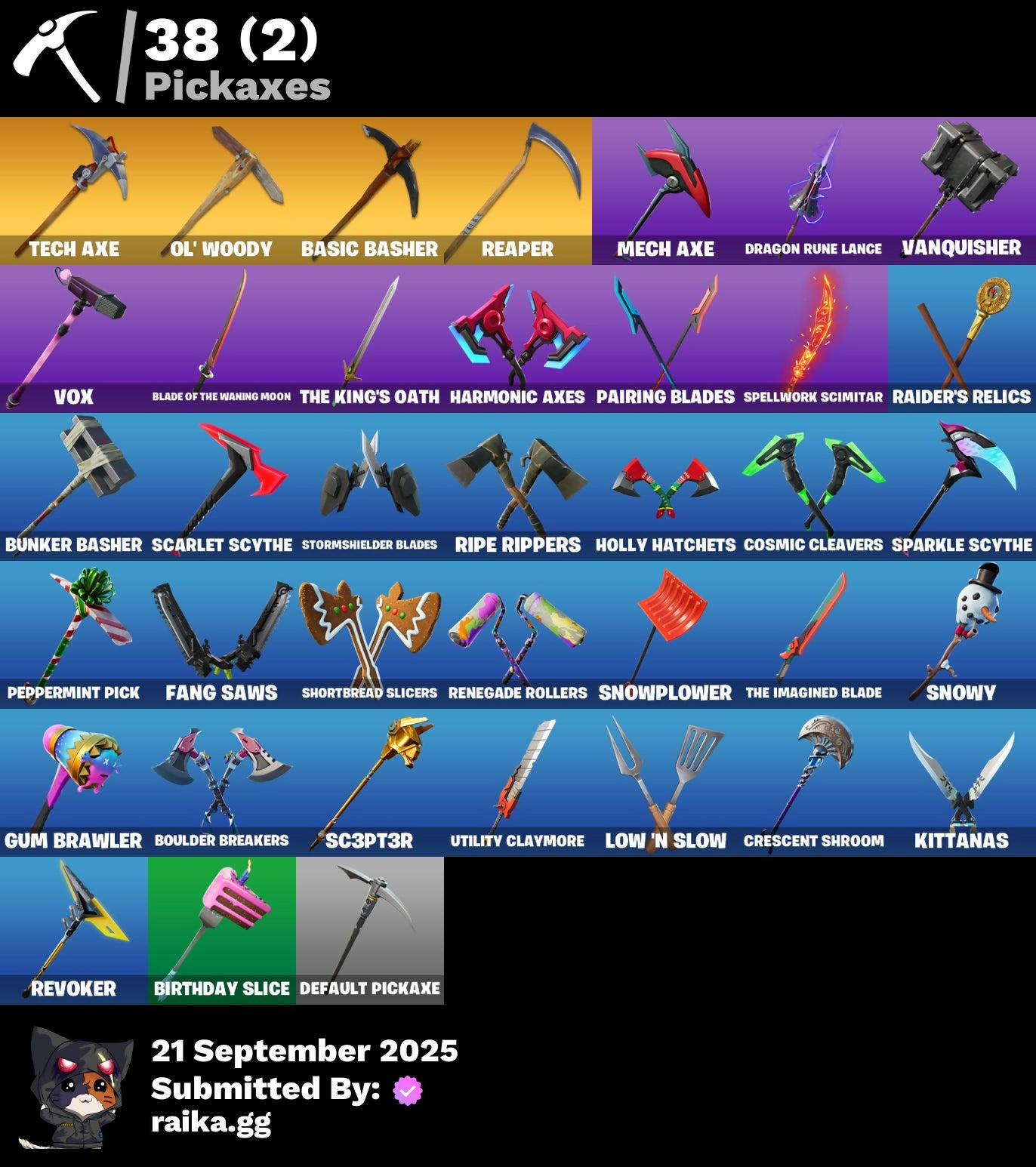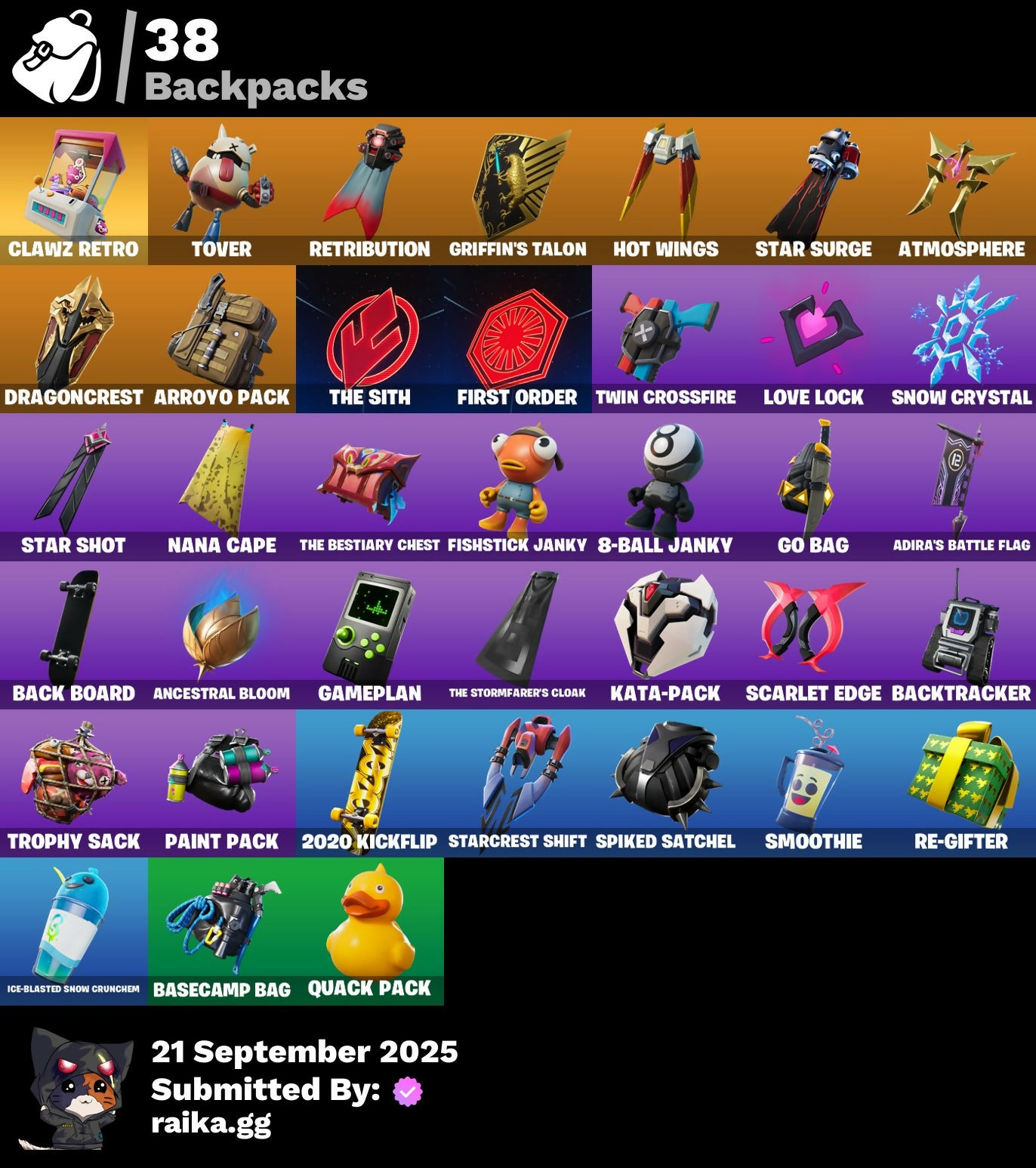 2020, 2020 Kickflip, 8-Ball Janky, Adira, Adira's Battle Flag, Ancestral Bloom, Arroyo Pack, Articulated Blade Wing, Atmosphere, Back Board, Backtracker, Base Jumper, Basecamp Bag, Basic Basher, Birthday Slice, Blade Of The Waning Moon, Blowin' Up, Blowing Bubbles, Boulder Breakers, Breakneck, Bubloon, Bunker Basher, Bunker Jonesy, Call Me, Catalyst, Catwing, Choice Knit, Clawz Retro, Cluck Strut, Cosmic Cleavers, Crescent Shroom, Crowning Achievement, Cyclo Curl, Dabstand, Dagger Dance, Dance Moves, Deep End, Default, Default Pickaxe, Demi, Downpour, Dragon Rider, Dragon Rune Lance, Dragoncrest, Eternal Voyager, Evie, Fang Saws, Featherweight, Field Flyer, First Order, Fishstick Janky, Gameplan, Glider, Go Bag, Griffin's Talon, Gum Brawler, Gunn-Brella, Hard Charger, Harmonic Axes, Holly Hatchets, Holographic, Hot Wings, I Declare!, Ice-Blasted Snow Crunchem, It Is Finished, It's... You?, Jaywalking, Jedi Training, Jump Jets, Junk Bucket, K.O. Cruiser, Kata-Pack, Kittanas, Laid Back Shuffle, Love It!, Love Lock, Low 'N Slow, Lt. Evergreen, Malik, Master Mix, Mech Axe, Millennium Falcon, Nana Cape, Ol' Woody, Paint Pack, Pairing Blades, Peace Out, Peppermint Pick, Pixel Pilot, Polar Peely, Quack Pack, Raider's Relics, Re-Gifter, Reaper, Renegade Rollers, Respect The Peace, Retaliator, Retribution, Revoker, Rift Rider, Ripe Rippers, Rox, Sad Trombone, Sc3pt3r, Scarlet Edge, Scarlet Scythe, Scarlet Strike, Sentinel, Seven Signet, Shaolin Sip, Sharpshooter, Shortbread Slicers, Sign Spinner, Singularity, Smoothie, Snap, Snow Crystal, Snowplower, Snowshaker, Snowy, Sovereign Griffin, Sparkle Scythe, Sparkle Strider, Sparkle Supreme, Spellwork Scimitar, Spiked Satchel, Spray Sail, Star Shot, Star Surge, Starcrest Shift, Stash'd, Steady, Steelwing, Storm Crash, Storm Sail, Stormfarer, Stormshielder Blades, Stratus, Stride, Sunny's Lander, Tailwind Twister, Take A 'Bow, Tech Axe, The Bestiary Chest, The Dip, The Imagined Blade, The King's Oath, The Scientist, The Sith, The Stormfarer's Cloak, The Umbrella, Tie Whisper, Tilted Teknique, Tover, Tra La La, Treefall, Trophy Sack, Turbo Spin, Twin Crossfire, Ultima Knight, Utility Claymore, Vanquisher, Vega, Vendetta, Vond3r, Vox, Vulcan Salute, Wooly Warrior, X, X-Lord, Yay!