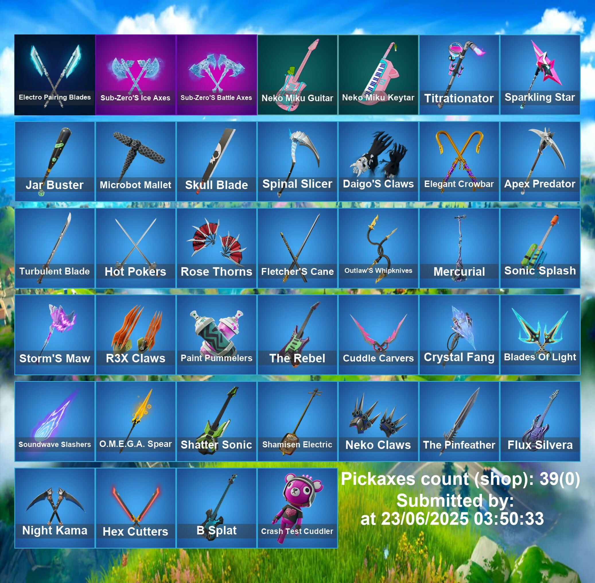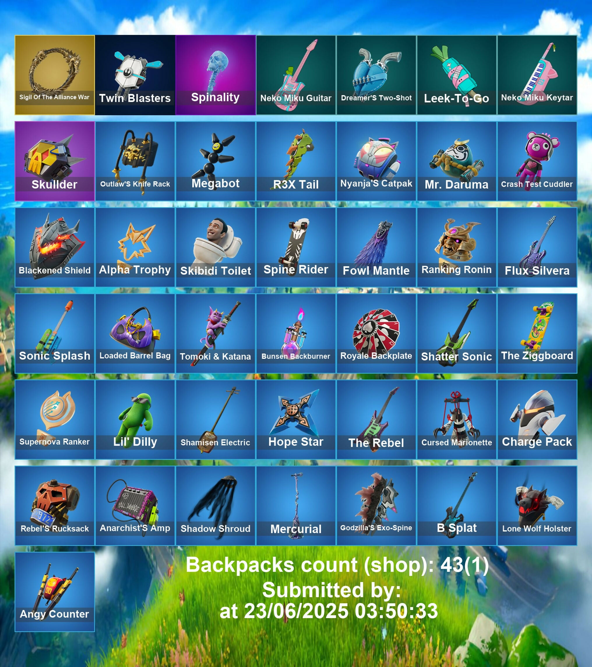 Alpha Trophy, Anarchist's Amp, Angy Counter, Apex Predator, Apprentice Evie, B Splat, Baron'S Hoard, Battle Blessing, Big Dill, Blackened Shield, Blades Of Light, Bone Breaker, Bones, Bunsen Backburner, Carmine Rosso, Cassidy Quinn, Charge Pack, Crash Test Cuddler, Crowning Achievement, Crystal Fang, Cuddle Carvers, Cursed Marionette, Daigo, Daigo'S Claws, Dill With It, Dreamer's Two-Shot, Duelist'S Card Trick, Dusk Knight, Electro Pairing Blades, Elegant Crowbar, Feel The Force, Fist Bump, Fletcher Kane, Fletcher'S Cane, Flux Silvera, Fowl Mantle, Front Page Pose, Frozen Treat Cart, Godzilla Evolved, Godzilla's Exo-Spine, Hero Baymax, Hex Cutters, Hope Star, Hot Pokers, Invisible Cut, It'S Chemistry!, Jade, Jar Buster, Jet Signals, Joss, Keisha Cross, Kendo, Leek-To-Go, Lil' Dilly, Lil' Godzilla Attack, Loaded Barrel Bag, Lone Wolf Holster, Loot Stash, Mecha R3X, Megabot, Mercurial, Microbot Mallet, Mr. Daruma, Neko Claws, Neko Hatsune Miku, Neko Miku Guitar, Neko Miku Keytar, Night Kama, Nyangelica, Nyanja, Nyanja's Catpak, O.M.E.G.A. Spear, Outlaw Midas, Outlaw'S Mugshot, Outlaw'S Strut, Outlaw'S Whipknives, Outlaw's Knife Rack, Paint Pummalers, Power Punk, Punk Show, Puppet Dance, R3X Claws, R3X Tail, Ranking Ronin, Raven'S Legion, Reaper'S Showtime, Rebel Oro, Rebel's Rucksack, Rose Thorns, Royale Backplate, Sabrina Carpenter, Shadow Blade Hope, Shadow Shroud, Shamisen Electric, Shamisen-Sational, Shatter Sonic, Show 'Em Off, Sigil Of The Alliance War, Sir Raven, Six String Sniper, Skibidi Toilet, Skull Blade, Skullder, Sonic Splash, Soundwave Slashers, Sparkle Diva, Sparkling Star, Spinal Slicer, Spinality, Spine Rider, Spirit Strider, Storm'S Maw, Storm-Wild Raven, Sub-Zero (Mk3), Sub-Zero'S Battle Axes, Sub-Zero'S Ice Axes, Supernova Ranker, Syntheslicer, Tagger'S Groove, The Break, The Night Rose, The Pinfeather, The Rebel, The Ziggboard, Titrationator, Tomoki & Katana, Tragedy!, Trailblazer Tai, True Love, Turbulent Blade, Twin Blasters, Valentina, Valentina'S Verve, Yarn Ball