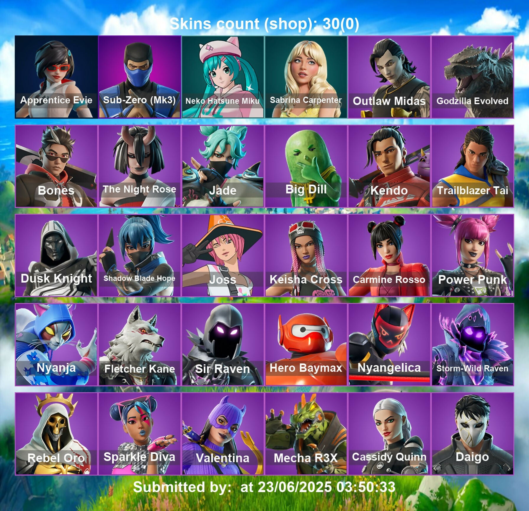 [PC] 30 skins | Apprentice Evie | Sub-Zero (MK3) | Neko Hatsune Miku | Sabrina Carpenter | Outlaw Midas | Godzilla Evolved | Bones | The Night Rose | 300 VB