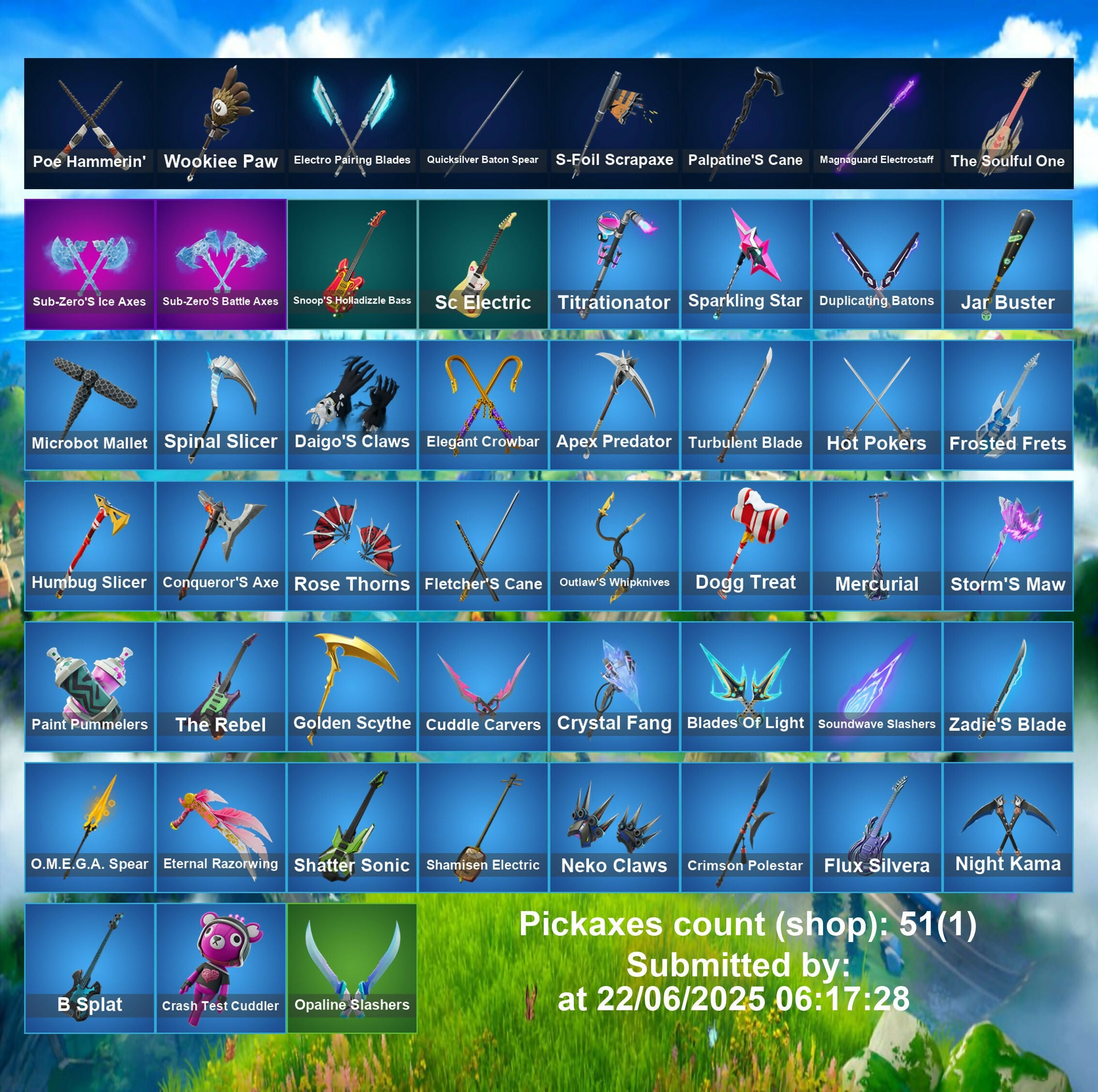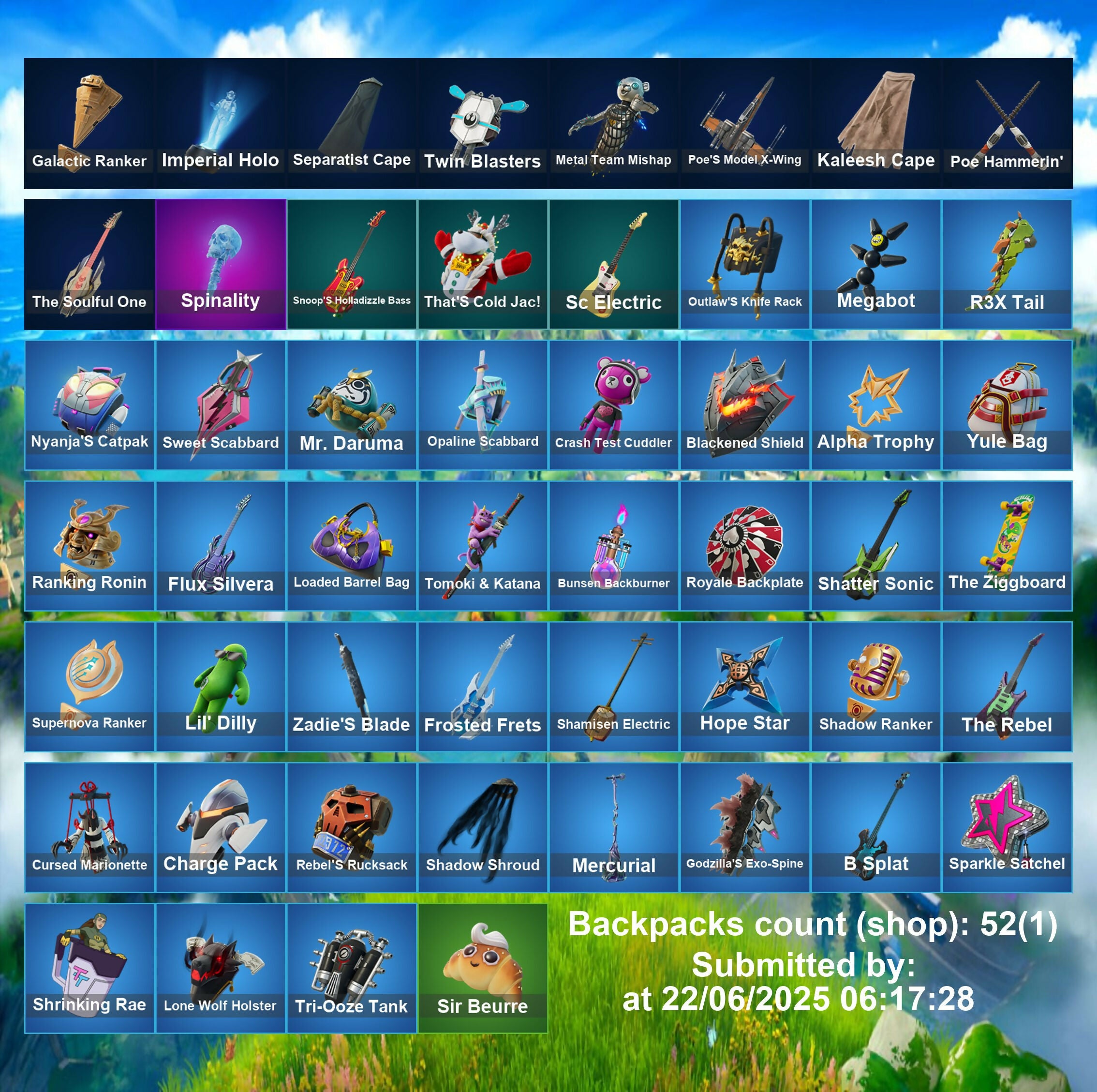Alpha Trophy, Apex Predator, Apprentice Evie, Aura, B Splat, Baron'S Hoard, Battle Blessing, Big Dill, Blackened Shield, Blades Of Light, Boogie Down, Bunsen Backburner, Cassidy Quinn, Charge Pack, Conqueror'S Axe, Conqueror'S Claim, Crash Test Cuddler, Crimson Polestar, Crowning Achievement, Crystal Fang, Cuddle Carvers, Cuddle Team Specialist, Cursed Marionette, Daigo, Daigo'S Claws, Dill With It, Diva Fever, Dogg Treat, Duelist'S Card Trick, Dupli-Kate, Duplicating Batons, Duplikates, Electro Pairing Blades, Elegant Crowbar, Emperor Palpatine, Eternal Razorwing, Feel The Force, Fist Bump, Fletcher Kane, Fletcher'S Cane, Flux Silvera, Frosted Frets, Frozen Treat Cart, Galactic Ranker, General Grievous, Godzilla Evolved, Godzilla'S Exo-Spine, Golden Scythe, Heart Chopper, Hero Baymax, Hope Star, Hot Pokers, Humbug Slicer, Imperial Holo, Invisible Cut, Iridia Vayne, It'S Chemistry!, Jade, Jar Buster, Jet Signals, Joss, Kaleesh Cape, Keisha Cross, Kendo, Knight Conqueror, Lil' Dilly, Lil' Godzilla Attack, Lil' Resistance Bomber, Loaded Barrel Bag, Lone Wolf Holster, Magnaguard Electrostaff, Megabot, Mercurial, Metal Team Mishap, Microbot Mallet, Mini Dogfight, Mr. Daruma, Neko Claws, Night Kama, Nyanja, Nyanja'S Catpak, O.M.E.G.A. Spear, Opaline Scabbard, Opaline Slashers, Origami Battalion, Outlaw Midas, Outlaw'S Knife Rack, Outlaw'S Mugshot, Outlaw'S Strut, Outlaw'S Whipknives, Paint Pummellers, Palpatine'S Cane, Poe Dameron, Poe Hammerin', Poe'S Model,X-Wing, Puppet Dance, Quicksilver Baton Spear, R3X Tail, Ranking Ronin, Raven'S Legion, Rebel'S Rucksack, Rose Thorns, Royale Backplate, S-Foil Scrapaxe, Santa Dogg, Sc Electric, Separatist Cape, Shadow Blade Hope, Shadow Ranker, Shadow Shroud, Shamisen Electric, Shamisen-Sational, Shatter Sonic, Show 'Em' Off, Showtime, Shrinking Rae, Sir Beurre, Snoop'S Holladizzle Bass, Soundwave Slashers, Sparkle Diva, Sparkle Satchel, Sparkling Star, Spinal Slicer, Spinality, Spirit Strider, Storm'S Maw, Sub-Zero (Mk3), Sub-Zero'S Battle Axes, Sub-Zero'S Ice Axes, Supernova Ranker, Sweet Scabbard, Tagger'S Groove, That'S Cold Jac!, The Break, The Break Shot, The Night Rose, The Rebel, The Soulful One, The Ziggboard, Titrationator, Tomoki & Katana, Tri-Ooze Tank, Turbulent Blade, Twin Blasters, Valentina, Valentina'S Verve, Vanguard Zadie, Wookiee Paw, Wookiee Team Leader, Yarn Ball, Yule Bag, Yulejacket, Zadie'S Blade