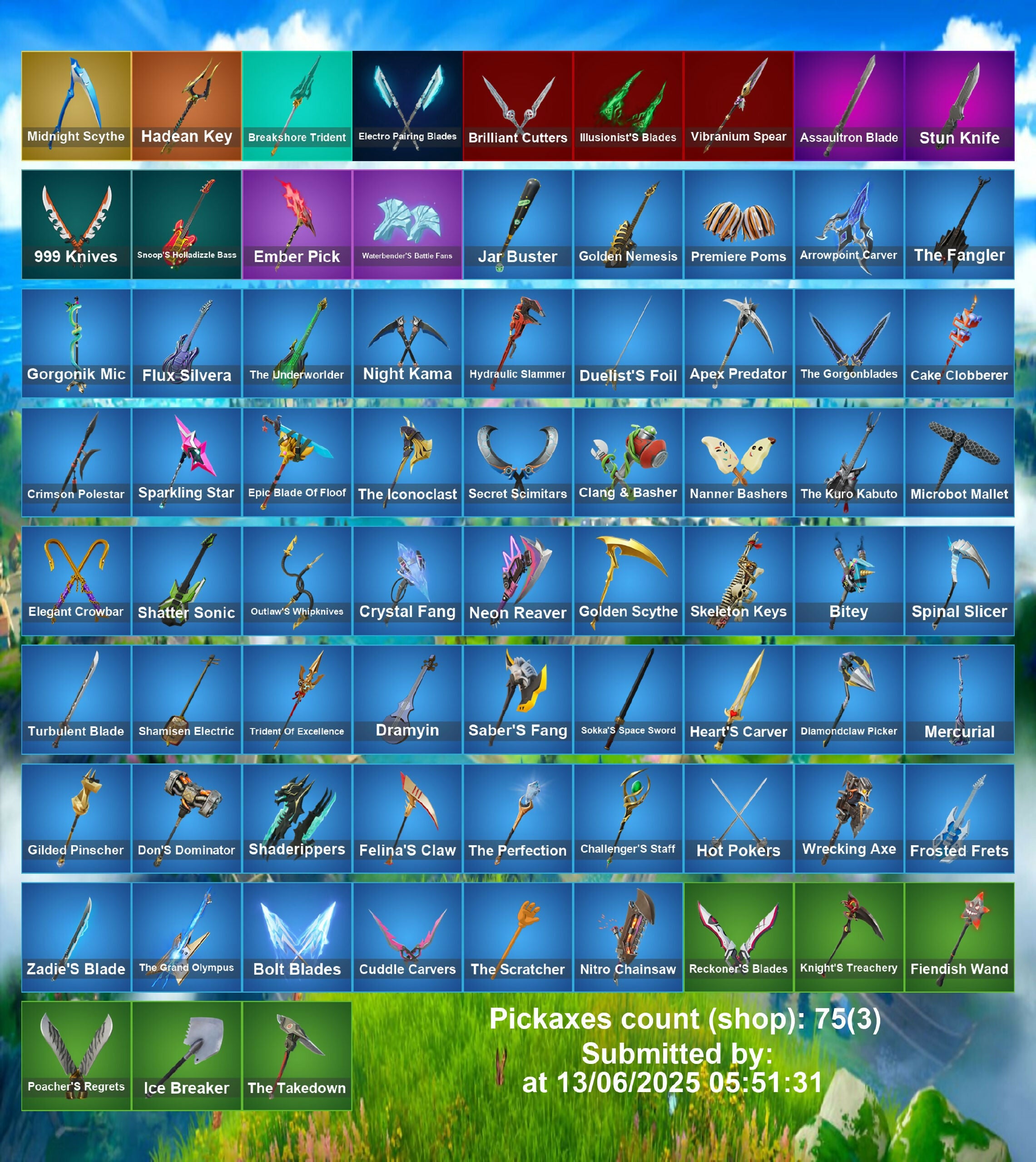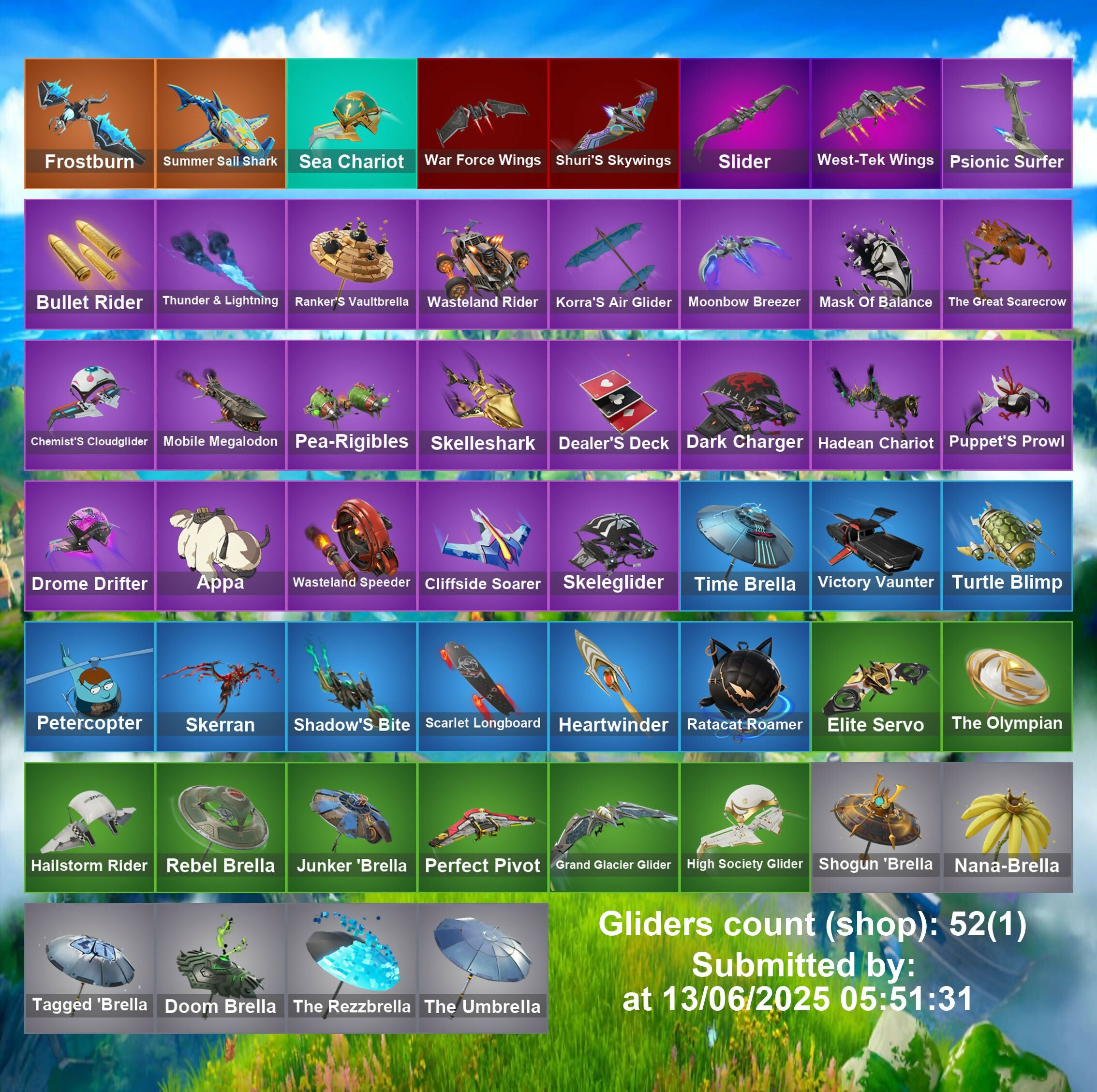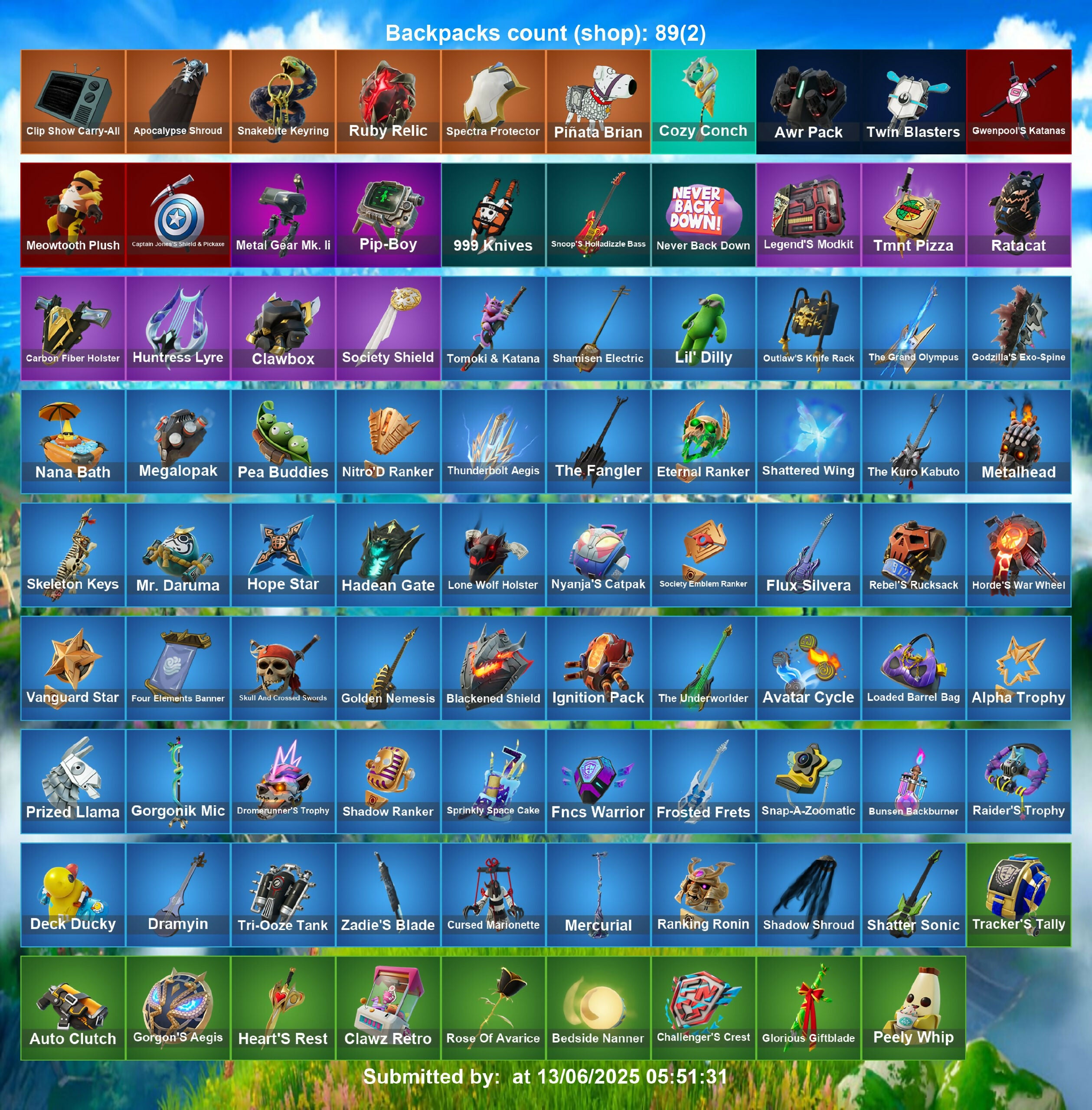 999 Knives, Alpha Trophy, Apex Predator, Aphrodite, Apocalypse Shroud, Appa, Arrowpoint Carver, Artemis, Assaultron Blade, Auto Clutch, Avatar Cycle, Avatar's Flourish, Awr Pack, Back On 74, Balanced, Baron's Hoard, Bedside Nanner, Bitey, Black Knight T-60 Power Armor, Blackened Shield, Blazing Fire Cerberus, Bolt Blades, Boogie Down, Breakshore Trident, Brilliant Cutters, Brite Moves, Brite Raider, Bullet Rider, Bunsen Backburner, Burning Ambition Valeria, Cake Clobberer, Captain Jones's Shield & Pickaxe, Captain Llamerica, Carbon Fiber Holster, Card Drop, Cauldron Chill, Cerberus, Challenger'S Crest, Challenger's Staff, Champion Siren, Chemist's Cloudglider, Clang & Basher, Clawbox, Clawz Retro, Cliffside Soarer, Clip Show Carry-All, Codsworth's Cleanup, Conch Call, Cozy Conch, Crimson Polestar, Crowning Achievement, Crystal Fang, Cuddle Carvers, Cursed Marionette, Dark Charger, Dawn Duelist Nisha, Dealer's Deck, Deck Ducky, Diamond Throne, Diamondclaw Picker, Don's Dominator, Doom Brella, Doze Dab, Dramyin, Dream, Drome Drifter, Dromerunner'S Trophy, Duelist's Foil, Egg Drop Scoop, Electro Pairing Blades, Elegant Crowbar, Elite Servo, Elysian Artemis, Ember Pick, Epic Blade Of Floof, Eternal Ranker, Evil Plan, Fancy Peter Griffin, Felina, Felina's Claw, Fiendish Wand, Fire Show, Fist Bump, Flux Silvera, Fncs Warrior, Foil Flex, Four Elements Banner, Frostburn, Frosted Frets, Get Griddy, Gilded Pinscher, Glorious Giftblade, Godzilla's Exo-Spine, Golden Nemesis, Golden Scythe, Gorgon'S Aegis, Gorgonik Mic, Grand Glacier Glider, Gwenpool's Katanas, Hadean Chariot, Hadean Gate, Hadean Key, Hades, Hailstorm Rider, Heart'S Rest, Heart's Carver, Heartwinder, High Society Glider, Holiday Boxy, Hope, Hope Star, Horde'S War Wheel, Hot Pokers, Huntmaster Saber, Huntress Lyre, Hydraulic Slammer, I'm A Mystery, Ice Breaker, Ignition Pack, Illusionist's Blades, Immortal Form, Immortal Zeus, Jar Buster, Jet Signals, Junker 'Brella, Knife Sharpener, Knight's Treachery, Korra, Korra's Air Glider, Legend's Modkit, Lil' Dilly, Loaded Barrel Bag, Lone Wolf Holster, Magmatic Poseidon, Make A Seat, Mask Of Balance, Me & You, Medusa, Megalo Don, Megalopak, Meowtooth Plush, Mercurial, Metal Gear Mk. Ii, Metalhead, Microbot Mallet, Midnight Scythe, Mobile Megalodon, Montague, Moonbow Breezer, Moongazer, Moonlit Mystery, Mr. Daruma, My Cabbages!, Nana Bath, Nana-Brella, Nanner Bashers, Neon Reaver, Never Back Down, Nick Eh 30, Night Hunter Scarr, Night Kama, Ninja Stance: Donnie, Ninja Stance: Leo, Ninja Stance: Mikey, Ninja Stance: Raph, Nisha, Nitro Chainsaw, Nitro Fusion Megalo Don, Nitro'D Ranker, Nog Ops, Nyanja'S Catpak, Old Snake, Oscar, Outlaw's Knife Rack, Outlaw's Whipknives, Oxide Rust, Par Patroller, Parade Riffs, Pea Buddies, Pea Part Harmony, Pea-Rigibles, Peabody, Peely Whip, Perfect Pivot, Peter Griffin, Petercopter, Pinata Brian, Pip-Boy, Poacher's Regrets, Popular Vibe, Poseidon, Premiere Poms, Prized Llama, Psionic Surfer, Puppet's Prowl, Rage Quit, Raider'S Trophy, Ranker's Vaultbrella, Ranking Ronin, Ratacat, Ratacat Roamer, Rebel Brella, Rebel's Rucksack, Reckoner's Blades, Ringmaster Scarr, Rose Of Avarice, Rough Cut Montague, Ruby Relic, Runway Racer, Rust, Saber's Fang, Say So, Scarlet Defender, Scarlet Longboard, Sea Chariot, Secret Scimitars, Serpentine Summoning, Shadebox, Shaderippers, Shadow Ranker, Shadow Shroud, Shadow's Bite, Shamisen Electric, Shatter Sonic, Shattered Wing, Shock Brawler Oscar, Shogun 'Brella, Shout!, Show 'Em Off, Shuri's Skywings, Skeleglider, Skeleton Keys, Skelleshark, Skerran, Skull And Crossed Swords, Slayer Juice Wrld, Slider, Slow Clap, Slurp Peabody, Snakebite Keyring, Snap-A-Zoomatic, Snoop's Holladizzle Bass, Snoop's Holodizzle Bass, Society Emblem Ranker, Society Shield, Sokka's Space Sword, Solid Snake, Sparkling Star, Spectra Protector, Spinal Slicer, Sprinkly Space Cake, Stone Sorceress Medusa, Stun Knife, Summer Sail Shark, Surfin' Bird, Sweet Swing, T-60 Power Armor, Tagged 'Brella, Take A 'Bow, Tempest Flight, The Break, The Break Shot, The Fangler, The Gorgonblades, The Grand Olympus, The Great Scarecrow, The Iconoclast, The Kuro Kabuto, The Machinist, The Olympian, The Perfection, The Rezzbrella, The Scratcher, The Squabble, The Takedown, The Umbrella, The Underworlder, Thunder & Lightning, Thunderbolt Aegis, Time Brella, Tmnt Pizza, Tomoki & Katana, Tracker'S Tally, Tri-Ooze Tank, Trident Of Excellence, Turbulent Blade, Turtle Blimp, Twin Blasters, Underground Jones, Valeria, Vanguard Star, Vanguard's Charge, Vengeance Jones, Vibranium Spear, Victory Vaunter, War Force Wings, Wasteland Rider, Wasteland Rock, Wasteland Speeder, Waterbender's Battle Fans, West-Tek Wings, Winterfest Bushranger, Wrecking Axe, You Think You're The King?, Zadie's Blade, Zeus