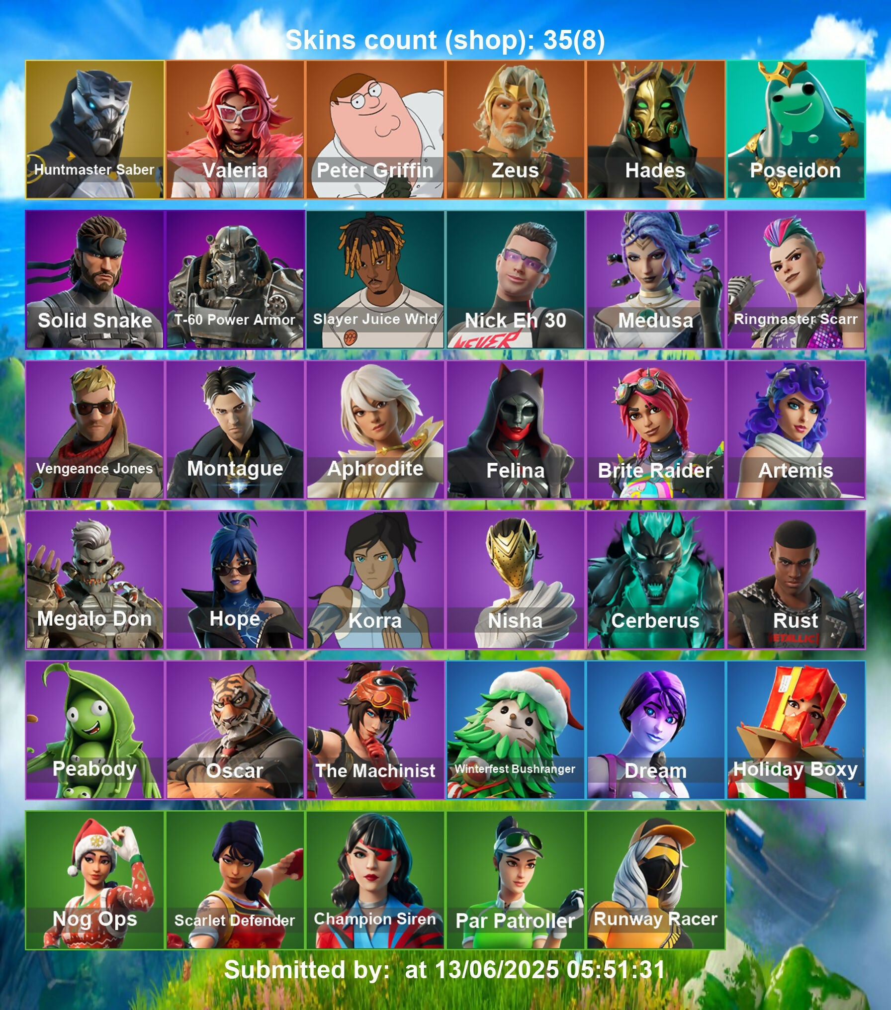 [PC] 35 skins | Huntmaster Saber | Valeria | Peter Griffin | Zeus | Hades | Poseidon | Solid Snake | T-60 Power Armor | Slayer Juice WRLD | 100 VB