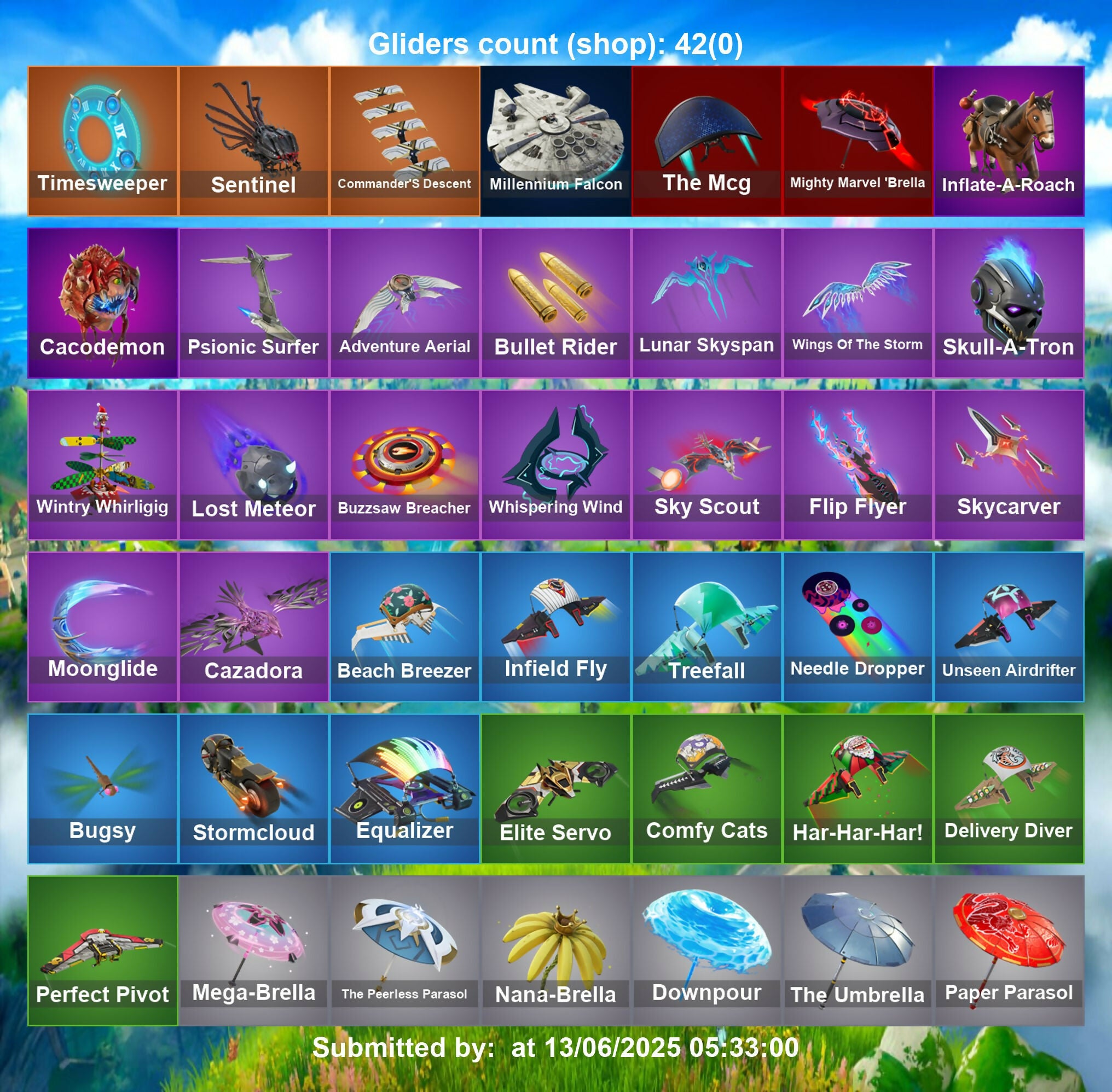 Adventure Aerial, Arctic Adeline, Ascension Nezumi, Astro Armor, Balance Board, Beach Breezer, Boba Snack, Bubblegum Highwire, Bugsy, Bullet Rider, Bullpen Brawler Dusty, Buzzsaw Breacher, Cacodemon, Call Me, Called Shot, Cazadora, Chef'S Special, Choice Knit, Clean Sweep, Cloud Striker, Club President Helsie, Comfy Cats, Commander's Descent, Count It!, Crowning Achievement, Delivery Diver, Doom Slayer, Downpour, Dramatic Flares, Dusty, Elite Servo, Empress Fan Dance, Equalizer, Era, Eren Jaeger, Expressionism, Fang Dance, Flip Flyer, Flippin' Away, Furmidable Meowscles, Gentleman'S Dab, Geralt Of Rivia, Get Out Of Your Mind, Guitar Walk, Har-Har-Har!, Helsie, Highwire, Holiday Boxy, Hypnot-Eyes, I Need You To Concentrate, Iconic Era, Igni Sign, Imani, Infield Fly, Inflate-A-Roach, Krisabelle, Lil' Prancer, Lorenzo, Lost Meteor, Love It!, Lt. Evergreen, Lunar Party, Lunar Skyspan, Magmatic Mizuki, Make A Seat, Mariposa, Massai, Mega-Brella, Mighty Marvel 'Brella, Millennium Falcon, Mini Slayer Fistbump, Mizuki, Moonglide, Mystica, Nana-Brella, Needle Dropper, Nezumi, Nolan Chance, Optimus Prime, Paper Parasol, Perfect Pivot, Polar Peely, Psionic Surfer, Purradise Meowscles, Relik, Renzo The Destroyer, Respect The Peace, Rian, Rococo Cloak-O, Santa Dogg, Scout Regiment Salute, Selene, Self Reflexing, Sentinel, Sing Along, Skull-A-Tron, Sky Scout, Skycarver, Sled Ready Guff, Snowshaker, Standing Bow, Stealth Stray, Stormcloud, Stray, Sunlit Selene, Swag Shot, Sweet Shot, Taiko Drumbeat, The Ageless, The Ageless Champion, The Mcg, The Peerless Parasol, The Umbrella, This Is Fine, Thrasher Massai, Thunder, Timesweeper, Toasted Coconut, Trace, Treefall, Underworld Desdemona, Unseen Airdrifter, Viper School, Whispering Wind, Wings Of The Storm, Winterfest Bushranger, Wintersong Mystica, Wintry Whirligig, Wooly Warrior