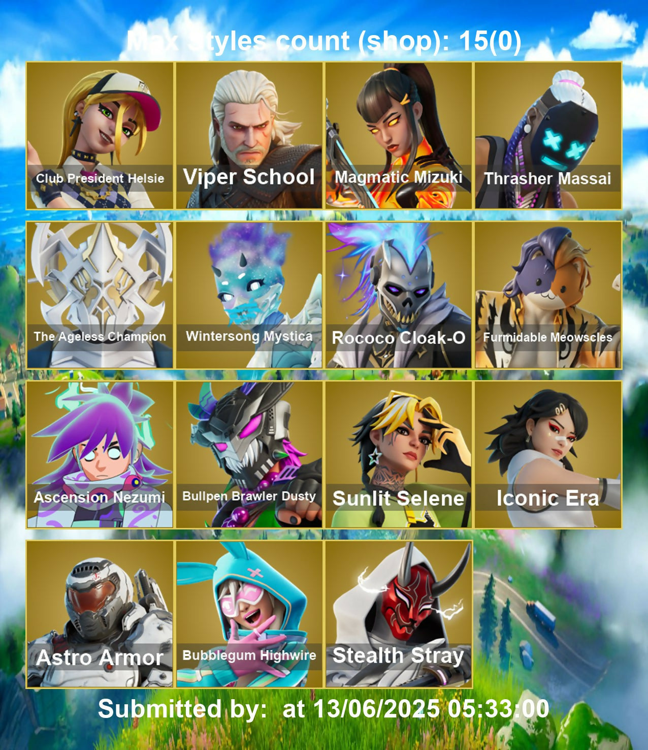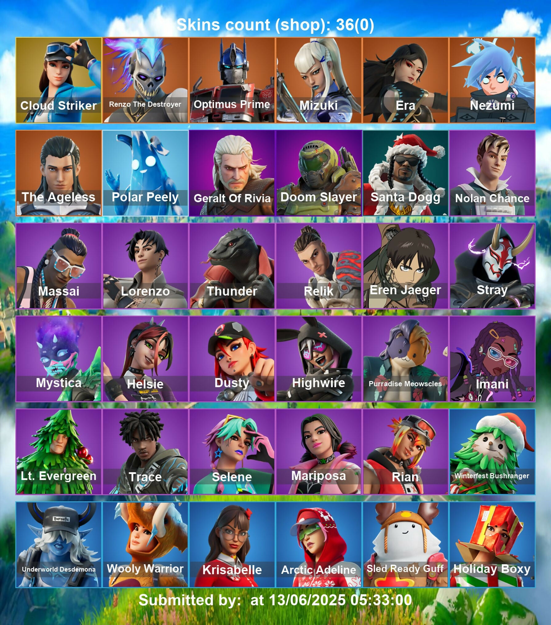 [PC] 36 skins | Cloud Striker | Renzo the Destroyer | Optimus Prime | Mizuki | Era | Nezumi | The Ageless | Polar Peely | Geralt of Rivia | 350 VB