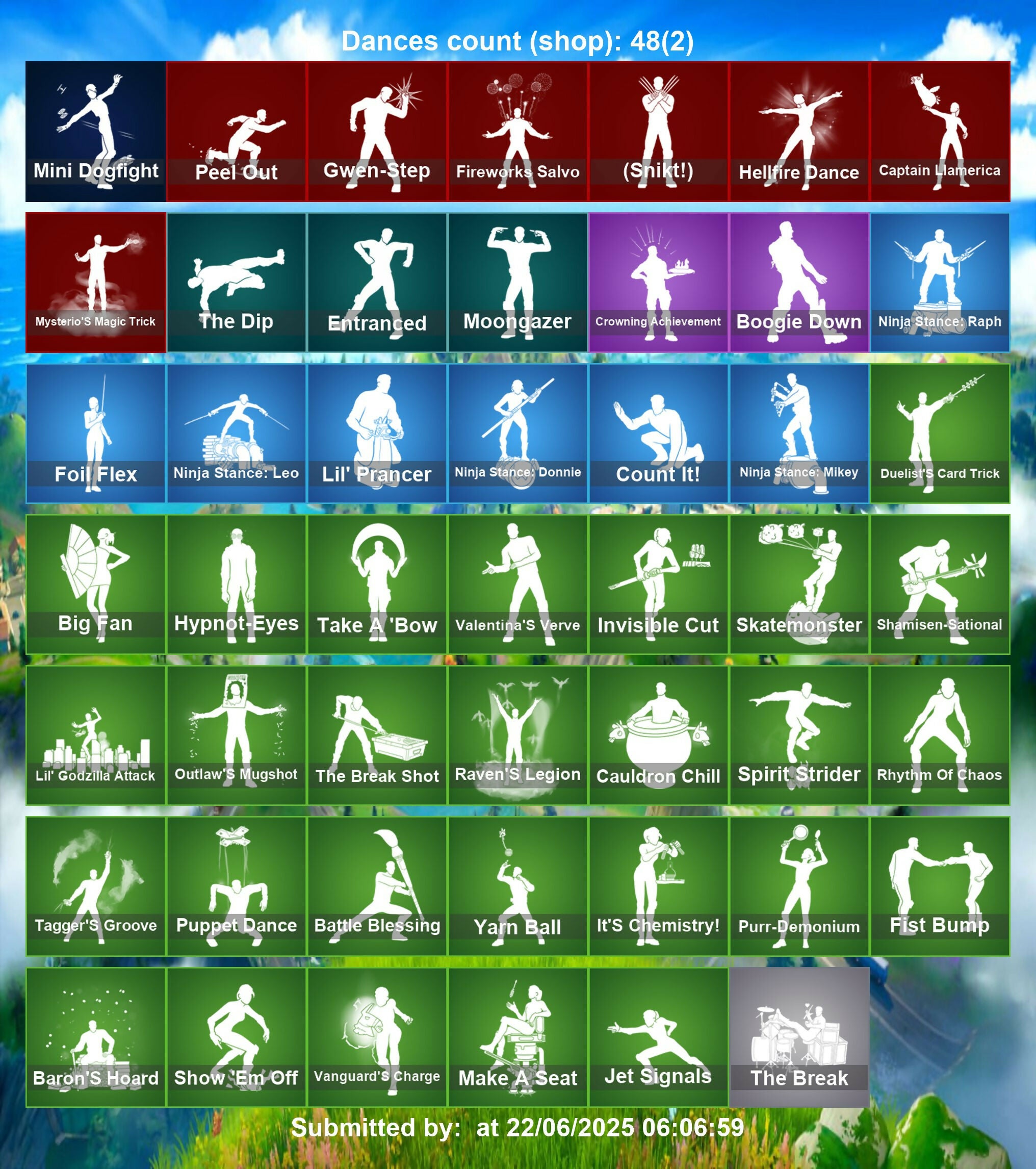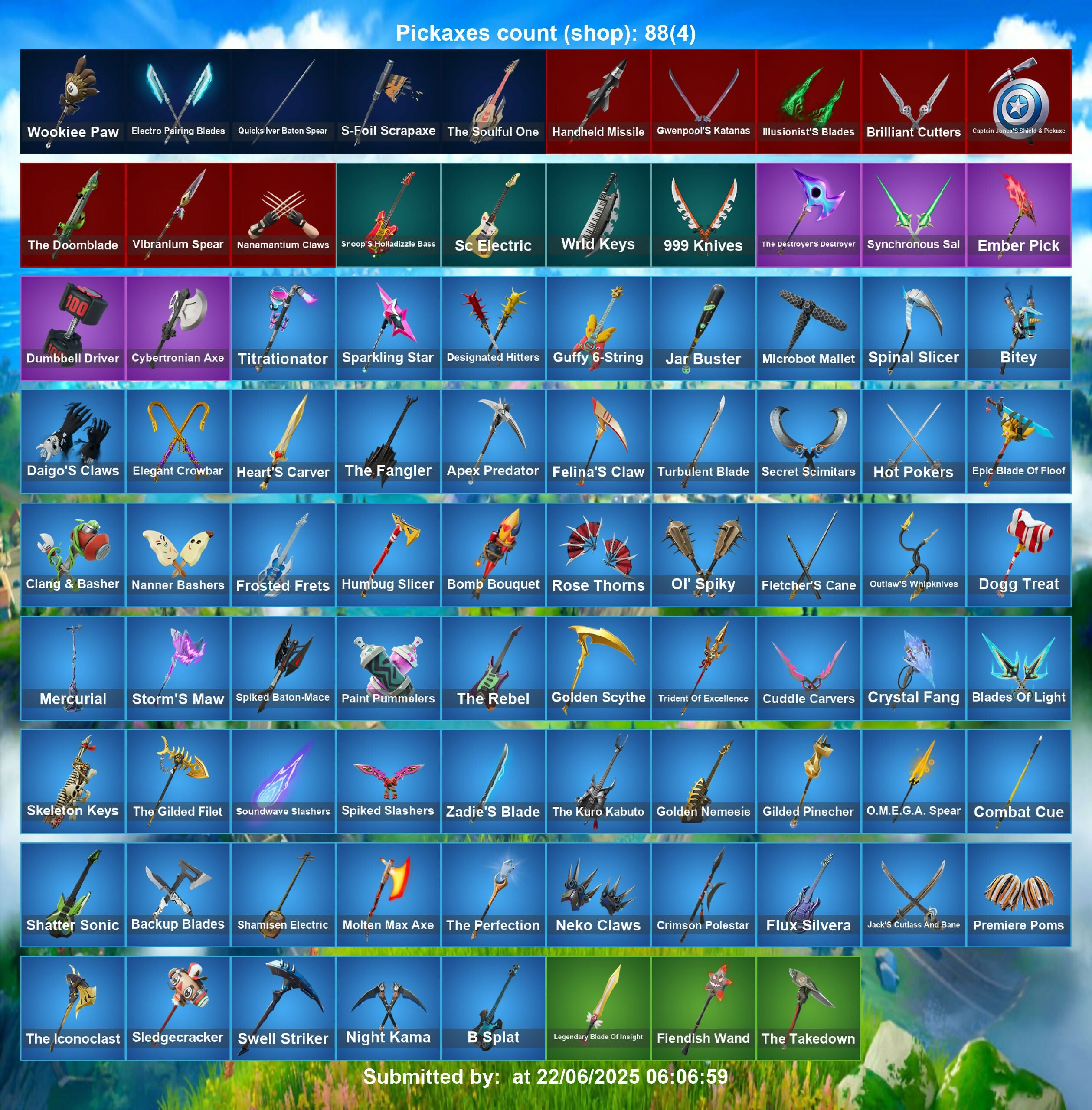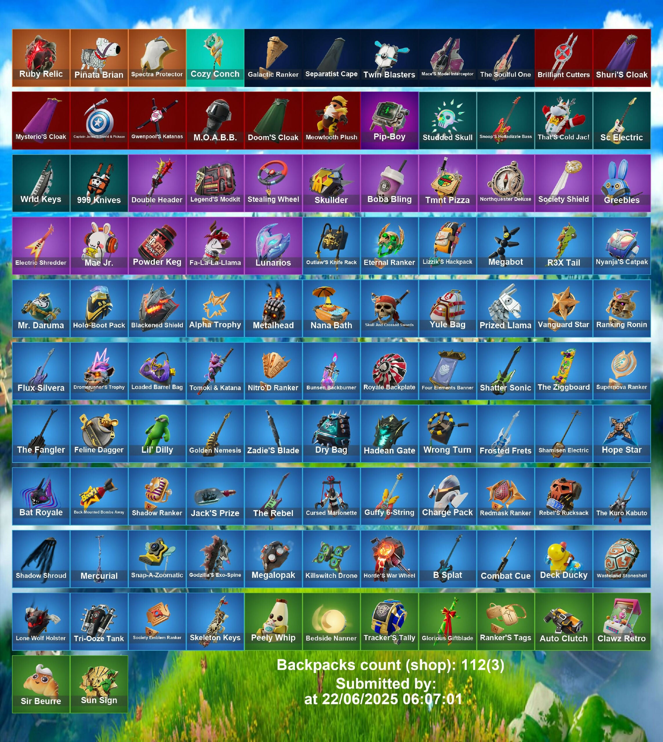 (Snikt!), 1-Ball, 999 Knives, Alpha Trophy, Apex Predator, Arctic Adeline, Auto Clutch, B Splat, Back-Mounted Bombs Away, Backup Blades, Baron's Hoard, Bat Royale, Battle Blessing, Bedside Nanner, Big Dill, Big Fan, Bitey, Blackened Shield, Blades Of Light, Boba Bling, Bomb Bouquet, Boogie Down, Brilliant Cutters, Bunsen Backburner, Captain Jones, Captain Jones'S Shield & Pickaxe, Captain Llamerica, Cassidy Quinn, Cauldron Chill, Chaos Director, Charge Pack, Clang & Basher, Clawz Retro, Combat Cue, Count It!, Cozy Conch, Crimson Polestar, Crowning Achievement, Crystal Fang, Cuddle Carvers, Cursed Marionette, Cybertronian Axe, Daigo, Daigo'S Claws, Deck Ducky, Designated Hitters, Dogg Treat, Doom, Doom'S Cloak, Double Header, Dromrunner'S Trophy, Dry Bag, Duelist's Card Trick, Dumbbell Driver, Dummy, Dynamo Tntina, Electric Shredder, Electro Pairing Blades, Elegant Crowbar, Ember Pick, Emma Frost, Entranced, Epic Blade Of Floof, Eternal Ranker, Explorer Emilie, Fa-La-La-Llama, Felina, Felina'S Claw, Feline Dagger, Fiendish Wand, Fireworks Salvo, Fist Bump, Fletcher Kane, Fletcher'S Cane, Flux Silvera, Foil Flex, Four Elements Banner, Frosted Frets, Galactic Ranker, Gilded Pinscher, Glorious Giftblade, Godzilla Evolved, Godzilla'S Exo-Spine, Golden Nemesis, Golden Scythe, Greebles, Guffy 6-String, Gwen-Step, Gwenpool, Gwenpool'S Katanas, Hadean Gate, Handheld Missile, Heart'S Carver, Hellfire Dance, Hero Baymax, Holiday Boxy, Holo-Boot Pack, Hope Star, Horde'S War Wheel, Hot Pokers, Humbug Slicer, Hypnot-Eyes, Illusionist'S Blades, Invisible Cut, It's Chemistry!, Jack'S Cutlass And Bane, Jack'S Prize, Jade, Jar Buster, Jet Signals, Joss, Juice Wrld, Kendo, Killswitch Drone, Legend'S Modkit, Legendary Blade Of Insight, Lil' Dilly, Lil' Godzilla Attack, Lil' Prancer, Lizzik, Lizzik'S Hackpack, Loaded Barrel Bag, Lone Wolf Holster, Lunarios, M.O.A.B.B., Mace'S Model Interceptor, Mae Jr., Make A Seat, Megabot, Megalopak, Meowdas, Meowtooth Plush, Mercurial, Metalhead, Microbot Mallet, Mini Dogfight, Molten Max Axe, Moongazer, Mr. Dappermint, Mr. Daruma, Mysterio, Mysterio'S Cloak, Mysterio's Magic Trick, Nana Bath, Nanamantium Claws, Nanner Bashers, Neko Claws, Night Kama, Ninja Stance: Donnie, Ninja Stance: Leo, Ninja Stance: Mikey, Ninja Stance: Raph, Nitro'D Ranker, Northquester Deluxe, Nyanja, Nyanja'S Catpak, O.M.E.G.A. Spear, Ol' Spiky, Outlaw Midas, Outlaw'S Knife Rack, Outlaw'S Whipknives, Outlaw's Mugshot, Paint Pummellers, Peel Out, Peelverine, Peely Whip, Pinata Brian, Pip-Boy, Powder Keg, Premiere Poms, Prized Llama, Puppet Dance, Purr-Demonium, Quicksilver Baton Spear, R3X Tail, Ranker'S Tags, Ranking Ronin, Raven's Legion, Rebel'S Rucksack, Redmask Ranker, Rhythm Of Chaos, Rose Thorns, Royale Backplate, Ruby Relic, S-Foil Scrapaxe, Santa Dogg, Sc Electric, Secret Scimitars, Separatist Cape, Shadow Blade Hope, Shadow Ranker, Shadow Shroud, Shamisen Electric, Shamisen-Sational, Shatter Sonic, Show 'Em Off, Shuri, Shuri'S Cloak, Sir Beurre, Skatemonster, Skeleton Keys, Skull And Crossed Swords, Skullder, Slayer Juice Wrld, Sled Ready Guff, Sledgecracker, Snap-A-Zoomatic, Snoop'S Holdadizzle Bass, Snoop'S Holodizzle Bass, Society Emblem Ranker, Society Shield, Soundwave Slashers, Sparkling Star, Spectra Protector, Spiked Baton-Mace, Spiked Slashers, Spinal Slicer, Spirit Strider, Stealing Wheel, Storm'S Maw, Studded Skull, Sun Sign, Supernova Ranker, Swell Striker, Synchronous Sai, Tagger's Groove, Take A 'Bow, That'S Cold Jac!, The Break, The Break Shot, The Destroyer'S Destroyer, The Dip, The Doomblade, The Fangler, The Gilded Filet, The Iconoclast, The Kuro Kabuto, The Night Rose, The Perfection, The Rebel, The Soulful One, The Takedown, The Ziggboard, Titrationator, Tmnt Pizza, Tomoki & Katana, Tracker'S Tally, Trailblazer Tai, Tri-Ooze Tank, Trident Of Excellence, Turbulent Blade, Twin Blasters, Undercover Skye, Valentina, Valentina's Verve, Vanguard Star, Vanguard's Charge, Vibranium Spear, War Machine, Wasteland Stoneshell, Wavebreaker, Winterfest Bushranger, Wookiee Paw, Wrld Keys, Wrong Turn, Yarn Ball, Yule Bag, Yulejacket, Zadie'S Blade