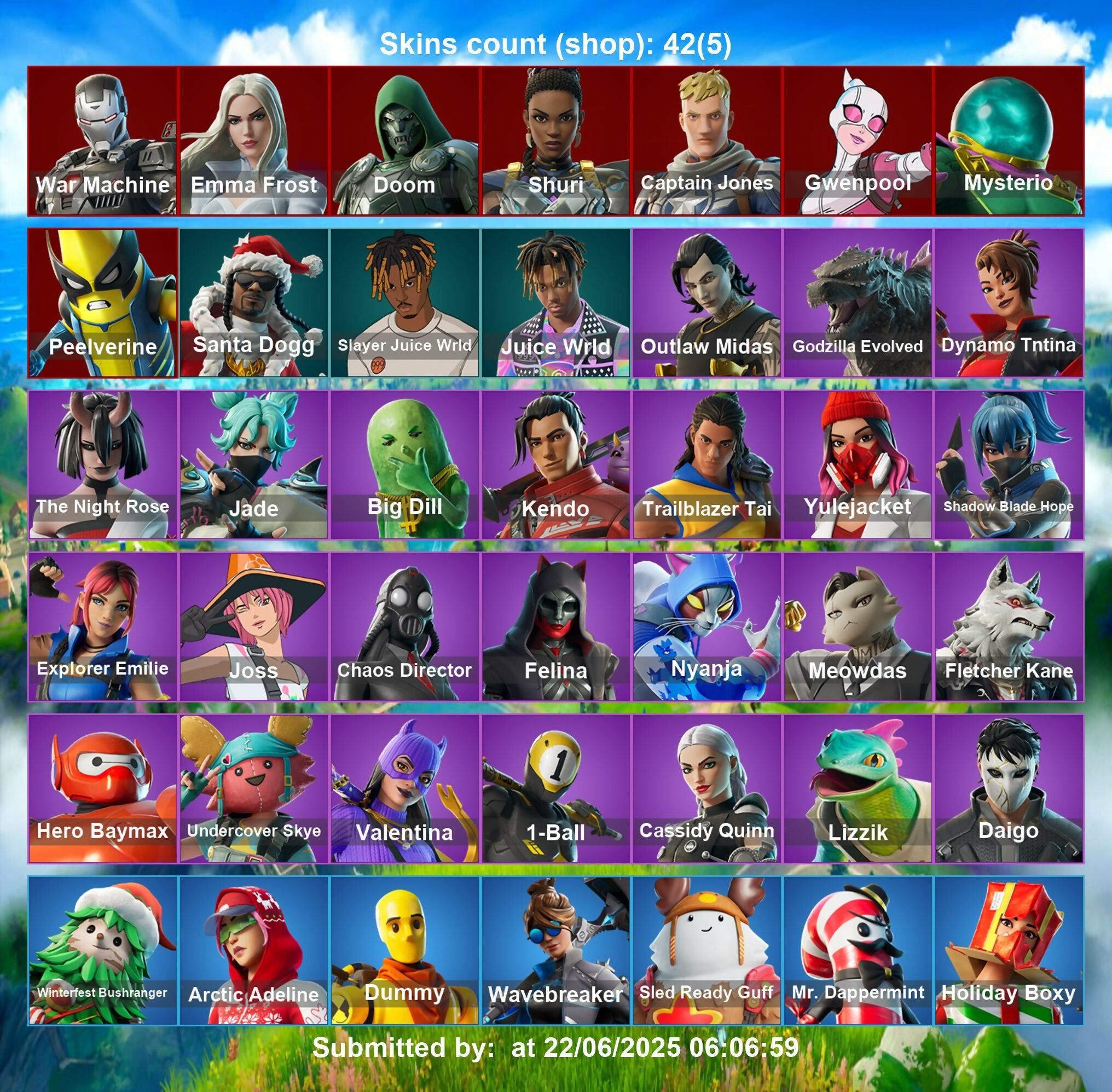 [PC] 42 skins | War Machine | Emma Frost | Doom | Shuri | Captain Jones | Gwenpool | Mysterio | Peelverine | Santa Dogg | Slayer Juice WRLD | 200 VB