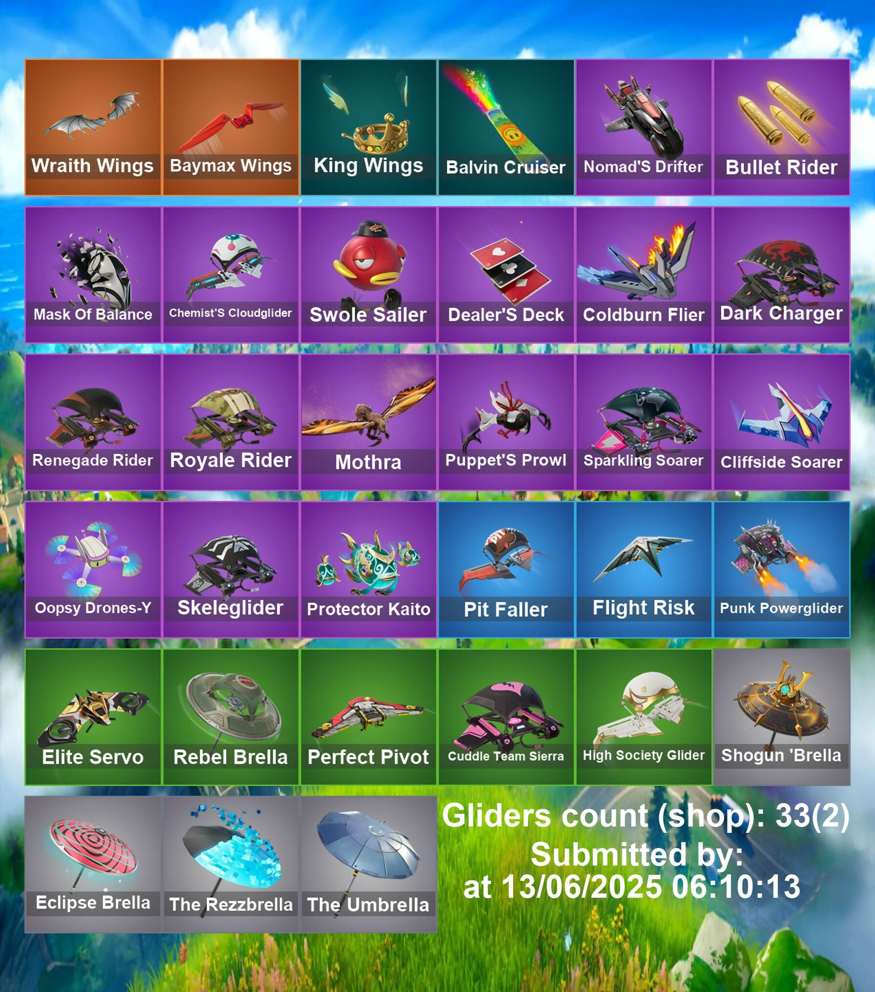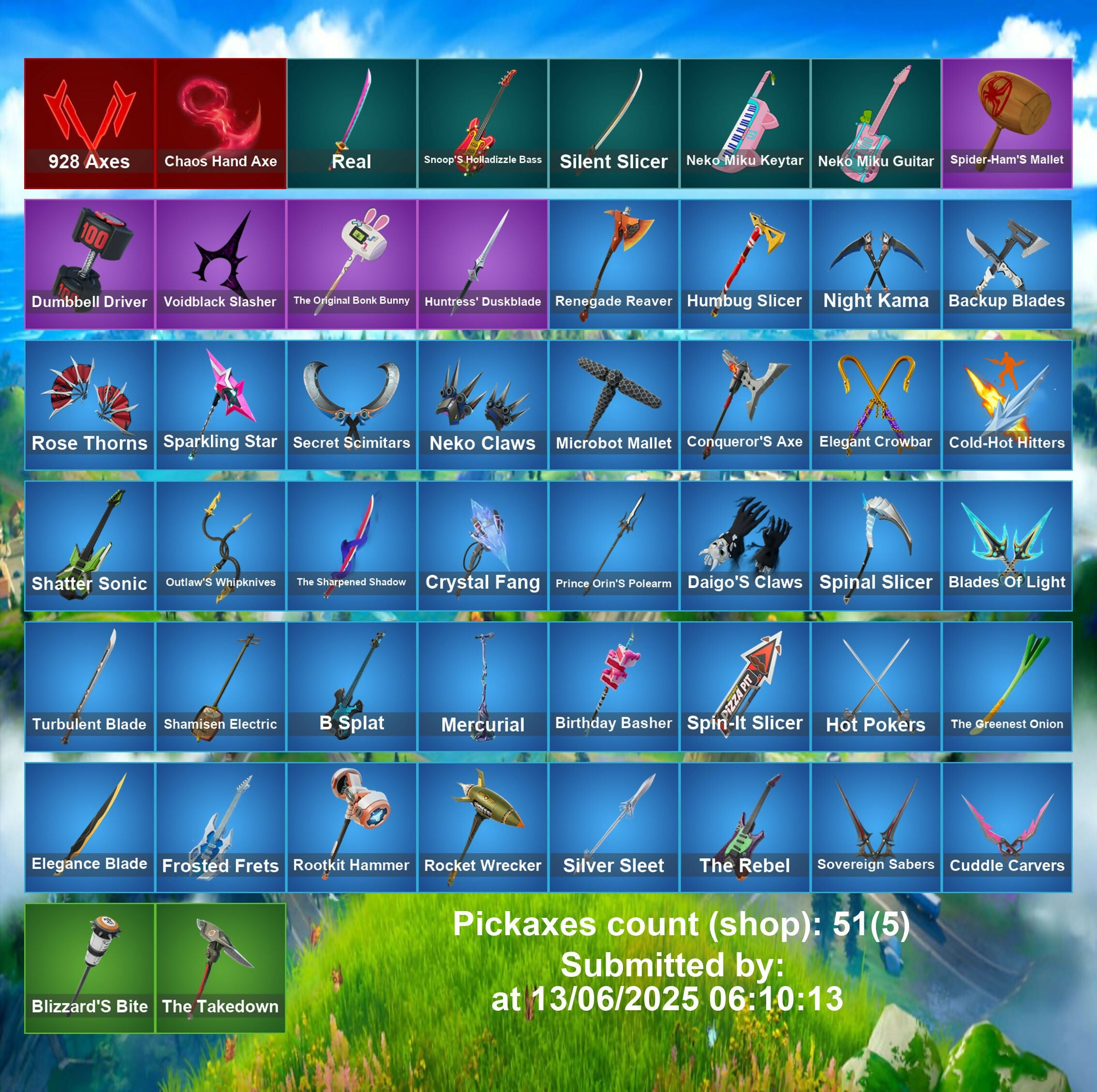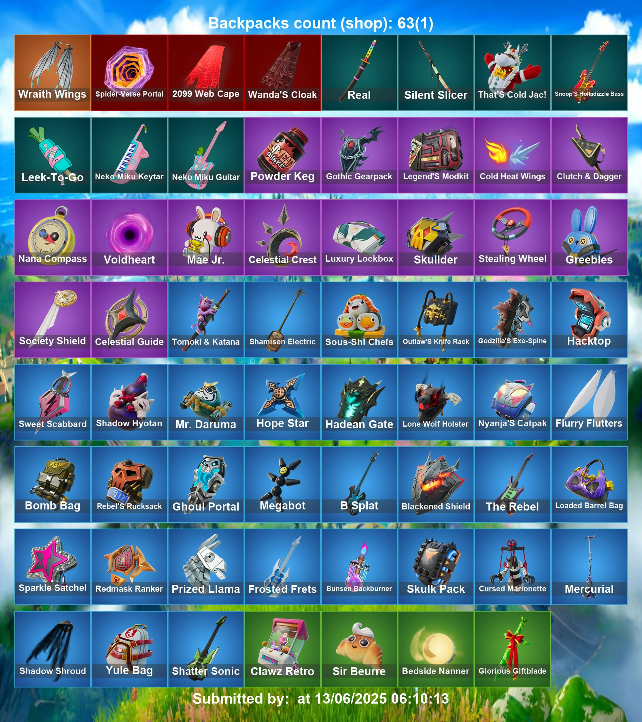 2099 Web Cape, 928 Axes, Adventure Peely, Aerial Assault Bomber, Aerial Assault Captain, Antonia, Astrea, B Splat, Backup Blades, Balletic, Balvin Cruiser, Baron's Hoard, Baymax Wings, Beatzbunny, Bedside Nanner, Birthday Basher, Blackened Shield, Blades Of Light, Blizzard's Bite, Bomb Bag, Brite Hatsune Miku, Bullet Rider, Bunsen Backburner, Celestial Crest, Celestial Guide, Chaos Hand Axe, Chemist's Cloudglider, Clawz Retro, Cliffside Soarer, Clutch & Dagger, Cold Heat Wings, Cold-Hot Hitters, Coldburn Flier, Collector Kado Thorne, Conqueror's Axe, Conqueror's Claim, Crack It, Crowning Achievement, Crystal Fang, Cuddle Carvers, Cuddle Team Sierra, Cuddle Team Specialist, Cursed Marionette, Daigo, Daigo's Claws, Dancefloor Diva, Dark Charger, Dealer's Deck, Demon Hunter Hope, Dice Roll, Diva Fever, Dumbbell Driver, Durrr Taisho, Eclipse Brella, Elegance Blade, Elegant Crowbar, Elite Servo, Energized Godzilla, Explorer Emilie, Fish Thicc, Fist Bump, Flaky Feast, Flight Risk, Flurry Flutters, Foil Flex, Front Page Pose, Frosted Frets, Ghoul Portal, Glorious Giftblade, Godzilla Evolved, Godzilla'S Exo-Spine, Gothic Gearpack, Greebles, Guardian Jade, Hacktop, Hadean Gate, Half-Cold Half-Hot, Haruka Of The Masks, Haxsaur, Hayseed, Heart Chopper, Hero Baymax, High Society Glider, Holiday Boxy, Hope Star, Hot Pokers, Humbug Slicer, Huntress' Duskblade, In Da Party, Invisible Cut, It's a Vibe, J Balvin, Jade, Jet Signals, Kado Thorne, Kendo, Khaby Lame, King Wings, Kintsugi Daigo, Knight Conqueror, Leek-To-Go, Legend'S Modkit, Lil' Godzilla Attack, Lil' Tank, Loaded Barrel Bag, Lone Wolf Holster, Lucky Nyanja, Luxury Lockbox, Mae, Mae Jr., Mask Of Balance, Megabot, Mercurial, Microbot Mallet, Miku Live, Mothra, Mr. Dappermint, Mr. Daruma, Nana Compass, Neko Claws, Neko Hatsune Miku, Neko Miku Guitar, Neko Miku Keytar, Night Kama, Nolan Chance, Nomad's Drifter, Nyanja, Nyanja'S Catpak, Oopsy Drones-Y, Outlaw'S Knife Rack, Outlaw's Whipknives, Perfect Pivot, Pickin', Piper Pace, Pit Faller, Pitcycle, Point & Shoot, Polar Team Specialist, Powder Keg, Prince Orin, Prince Orin's Polearm, Princess Lexa, Prized Llama, Protector Kaito, Psychic Energy Manipulation, Punk Powerglider, Puppet Dance, Puppet's Prowl, Put'er There, Racer Kendo, Raven Team Syd, Real, Rebel Brella, Rebel'S Rucksack, Redmask Ranker, Renegade Racer, Renegade Reaver, Renegade Rebel, Renegade Rider, Rocket Wrecker, Rootkit Hammer, Rose Thorns, Royale Rider, Samurai Baymax, Santa Dogg, Scarlet Witch, Secret Scimitars, Shadow Blade Hope, Shadow Hyotan, Shadow Shroud, Shamisen Electric, Shamisen-Sational, Shatter Sonic, Shimmerdusk, Shogun 'Brella, Shoto Todoroki, Show 'Em Off, Silent Slicer, Silver Sleet, Sir Beurre, Six String Sniper, Skele-Dance, Skeleglider, Skulk Pack, Skull Commander, Skullder, Snoop'S Holdadizzle Bass, Snoop's Holladizzle Bass, Snowdancer, Society Shield, Sous-Shi Chefs, Sovereign Sabers, Sparkle Diva, Sparkle Satchel, Sparkling Soarer, Sparkling Star, Spider-Ham's Mallet, Spider-Man (Miles Morales), Spider-Man 2099, Spider-Verse Portal, Spin-It Slicer, Spinal Slicer, Spirit Strider, Stealing Wheel, Sweet Scabbard, Swole Sailer, Syntheslicer, That's Cold Jac!, The Break, The Greenest Onion, The Night Rose, The Original Bonk Bunny, The Rebel, The Rezzbrella, The Sharpened Shadow, The Takedown, The Umbrella, Tomoki & Katana, Traditional Khaby, Trailblazer Tai, Turbulent Blade, Voidblack Slasher, Voidheart, Wanda'S Cloak, Winterfest Bushranger, Wraith Commander, Wraith Wings, Yarn Ball, Yule Bag, Yulejacket