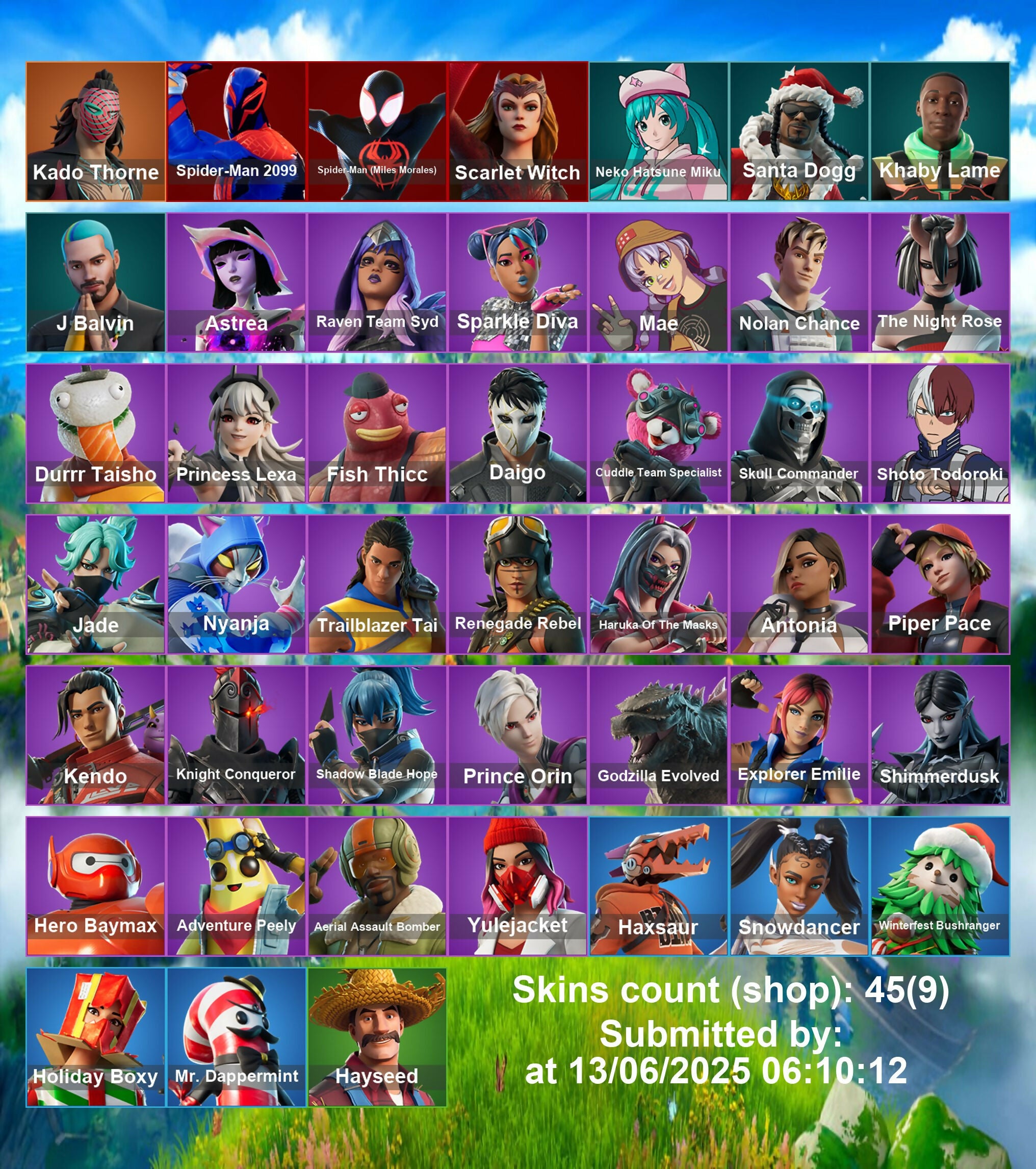 [PC] 45 skins | Kado Thorne | Spider-Man 2099 | Spider-Man (Miles Morales) | Scarlet Witch | Neko Hatsune Miku | Santa Dogg | Khaby Lame | J Balvin | 100 VB