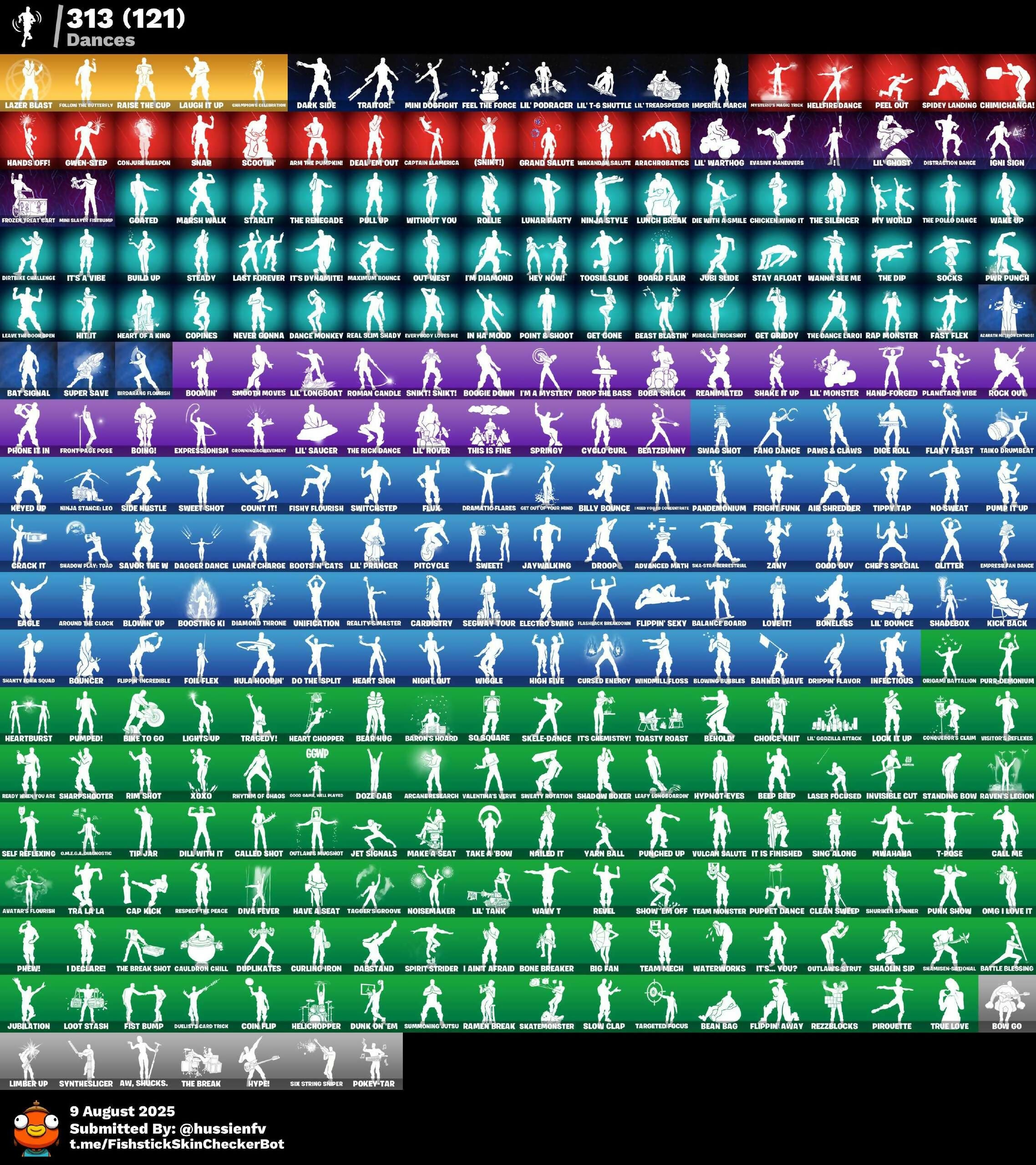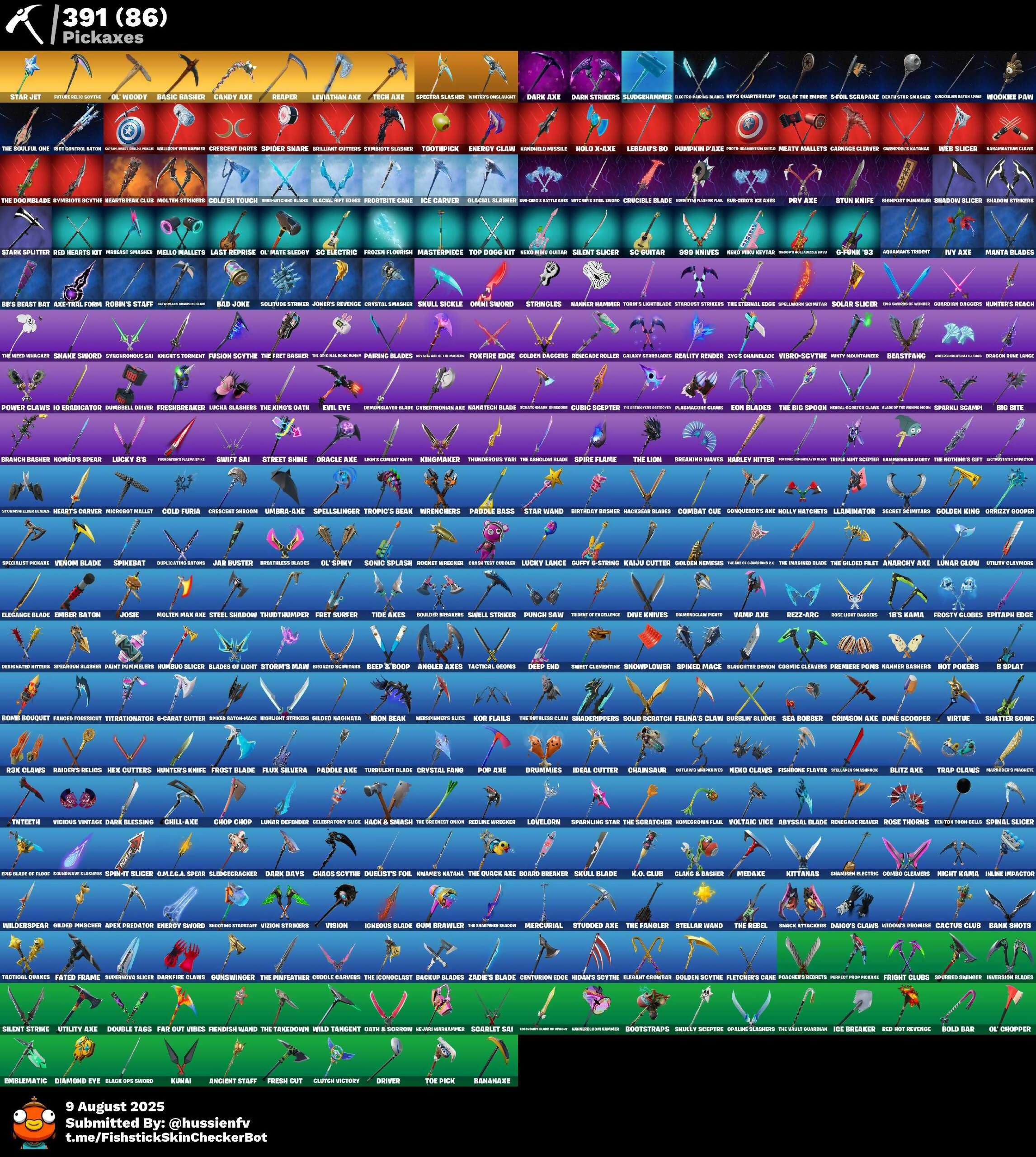 (Snikit!), 18's Kama, 999 Knives, Abseinz, Abstrakt, Abyssal Blade, Acrobachriots, Adira, Adira (Battle Mask), Advanced Math, Aerial Assault Captain, Agent Jones, Agent Jones (Jump 31), Agent Peely, Ahsoka Tano, Air Shredder, Airhead, All-Hallows Steve, Anarchy Axe, Ancient Staff, Andre, Angler Axes, Ant-Man, Ant-Tonio, Antonia, Apex Predator, Aphrodite, Apprentice Evie, Aquaman, Aquaman’s Trident, Arachne Couture, Arachnid Tote, Arcane Research, Arctic Adeline, Ark, Ark Wings, Arm The Pumpkin, Around The Clock, Ascension Nezumi, Aspen, Astro Armor, Atlantican Firestick, Aura, Avatar's Flourish, Aw, Shucks., Axe-Trail Form, Ayida, Azariah Whitworth, B Splat, B.R.U.T.E. Gunner, BB's Beast Bat, Baby Gingy, Backup Blades, Bad Joke, Balance Board, Bananaxe, Bank Shots, Banner Trooper, Banner Wave, Baron's Hoard, Barr-Witching Blades, Basic Basher, Basquiat's Tuxedo, Bassai, Bat Signal, Battle Balloon, Battle Blessing, Battle Shroud, Battle-Tested, Batty Pack, Beach Bomber, Bean Bag, Bear Brained, Bear Hug, Beast Blastin', Beast Boy, Beastclaws Blades, Beastfang, Beatzbunny, Beef Boss, Beep 'n' Boop, Beep Beep, Behold!, Bernie, Bi-Han, Big Bite, Big Dill, Big Fan, Bike To Go, Billy Bounce, Bird Raring Flourish, Birthday Basher, Black Hole, Black Manta, Black Ops Sword, Black Stripe, Blackout Bag, Blade of the Wandering Moon, Blades of Light, Blaze, Blitz Axe, Blizzard Bomber, Blowin' Up, Blowing Bubbles, Board Breaker, Board Flair, Boba Snack, Boing!, Bold Bar, Bomb Bouquet, Bone Breaker, Boneless, Bones, Boogie Down, Boomin', Boosting Ki, Bootsin' Cats, Bootstraps, Bop Go, Boulder Breakers, Bouncer, Branch Basher, Branded Brawler, Branded Brigadier, Breaking Waves, Breakpoint, Brilliant Cutters, Brim-Notching Blades, Brite Board, Brite Hatsune Miku, Broadsword Shredder, Bronzed Scimitars, Brutus, Bubblin' Sludge, Build Up, Bullpen Brawler Dusty, Bullseye, Burgle Bag, Burnoff, Bytes, Bytes (Lone Traveler), Cactus Club, Call Me, Called Shot, Cameo vs Chic, Candy Axe, Cap Kick, Captain America, Captain America’s Shield Picker, Captain Blamerica, Captain Jones, Captain Phasma, Cardistry, Carmine Rosso, Carnage, Carnage (Maximum), Carnage Cleaver, Cassidy Quinn, Castaway Jonesy, Catalyst, Cattapultas Steelpunk Clan, Cauldron Chill, Celebratory Slice, Centurion, Centurion Edge, Cerberus, Chainsaur, Chalked Up 1-Ball, Champion's Celebration, Champion's Rucksack, Chaos Director, Chaos Scythe, Charlotte, Charlotte (Golden Rune), Chef's Special, Chica Was Here, Chicken Wing It, Chill-Axe, Chimichanga!, Chloe Kim, Choice Knit, Chop Chop, Chrome Punk, Chuck Pack, Chun-Li, Clang & Basher, Clark Kent, Clark Kent (Superman), Clean Sweep, Clinical Crosser, Club President Helsie, Clubs, Cluck, Cluck (Slurpy), Clutch Victory, Codename E.L.F., Coin Flip, Cold Dagger Pack, Cold Furia, Cold'en Touch, Collector Kado Thorne, Color Crush, Combat Cue, Combat Tech Jules, Combo Cleavers, Conjure Weapon, Conqueror's Claim, Conqueror’s Axe, Contract Giller, Cool Grey, Copines, Cosmic Cleavers, Couch Titan, Count It!, Cozy Chomps, Cozy Commander, Crack It, Crash Test Clubber, Crescent Darts, Crescent Shroom, Crewmate, Crimson Axe, Crowned Rex, Crucible Blade, Cryo Chamber, Cryptic Coaster, Cryptic Sling-Kit, Crystal, Crystal Axe of the Masters, Crystal Fang, Crystal Smasher, Crz-8, Cubic Scepter, Cuddle Carvers, Cuddlepool, Cuddlepools Bow, Cuff Case, Curling Iron, Cursed Energy, Cybertronian Axe, Cyborg Team Specialist, Cyclo Curl, D'Dark, Dabstand, Dagger Dance, Daigo, Daigo’s Claws, Dance Monkey, Dancefloor Diva, Danger Zone, Danica, Dark Axe, Dark Blessing, Dark Days, Dark Jonesy, Dark Power Chord, Dark Red Knight, Dark Side, Dark Strikers, Dark Wild Card, Dark Wings, Darkfire Claws, Darth Vader, Dead Card, Deadfire, Deadpool, Deadpool Unmasked, Deal 'Em Out, Deal'Em Cassidy Quinn, Death Star Smasher, Deep End, Deep Fried, Deep Sea Destroyer, Demon Hunter Hope, Demon Wind Shuriken, Demonslayer Blade, Derby Dynamo, Designated Hitters, Diamond Diva, Diamond Eye, Diamond Star, Diamond Throne, Diamondclaw Pickaxe, Diamonds, Dice Roll, Die With A Smile, Different Tasty Snack, Dill With It, Dillinger The Gherk, Dirtbike Challenge, Disguise, Distraction Dance, Diva Fever, Dive Knives, Do The Split, Doctor Slone, Doctor Slone (Prismatic), Doctor Strange, Doctor Strange (Stealth Silver), Doom, Doom 2099, Doom Slayer, Double Tags, Doublecross, Doze Dab, Dragon Rune Lance, Dramatic Flares, Dream, Drippin' Flavor, Drippy Drift, Driver, Droop, Drop The Bass, Drummies, Dual Kama, Duelist's Card Trick, Duelist’s Foil, Dumbbell Driver, Dummy Supreme, Dune Scooper, Dunk On 'Em, Dupl-Kate, Duplicating Batons, Duplikates, Durrr Taisho, Duske Knight, Dusty, Dyed Breeze, Dynamic Dribbler, Dynamo, Dynamo Tntina, Dynamo Tntoon-A, Eagle, Echo, Eddie Brock, Electro Fishing Blades, Electro Swing, Elegance Blade, Elegant Coronar, Ember Baton, Emblematic, Emma Frost, Empressian Dance, Energized Godzilla, Energy Claw, Energy Sword, Eon Blades, Epic Blade of Frozo, Epic Swords of Wonder, Epitaph Edge, Era, Erisa, Erisa (Stealth Silver), Eternal Wanderer, Evasive Maneuvers, Everslice Bass, Everybody Loves Me, Evie, Evie (Summer Strider), Evil Eye, Evolving Flashing Flail, Exploding Axis, Explorer Emilie, Expressionism, Fabio Sparkleflame (Golden Rune), Fabio Sparklemane, Fade, Fang Dance, Fanged Foresight, Far Out Vibes, Fast Flex, Fate, Fated Frame, Feel The Force, Felina, Felina's Claw, Fiendish Wand, Finesse Finisher, Firebreather's Daypack, Firestarter, Fish Thicc, Fishbone Flayer, Fishstick, Fishy Flourish, Fist Bump, Flaky Feast, Flashback Breakdowm, Fletcher Kane, Fletcher’s Cane, Flippin' Away, Flippin' Incredible, Flippin' Sexy, Floral Shell, Fluffle Bag, Flux, Flux Silvera, Fncs Renegade, Focus, Foil Flex, Follow The Butterflv, Follow The Butterfly, Fortnite Zero Gravity Slams, Founder's Plasma Spike, Foxfire Edge, Fresh Aura, Fresh Cut, Freshbreaker, Fret Surfer, Fright Clubs, Fright Funk, Front Page Pose, Frost Blade, Frost