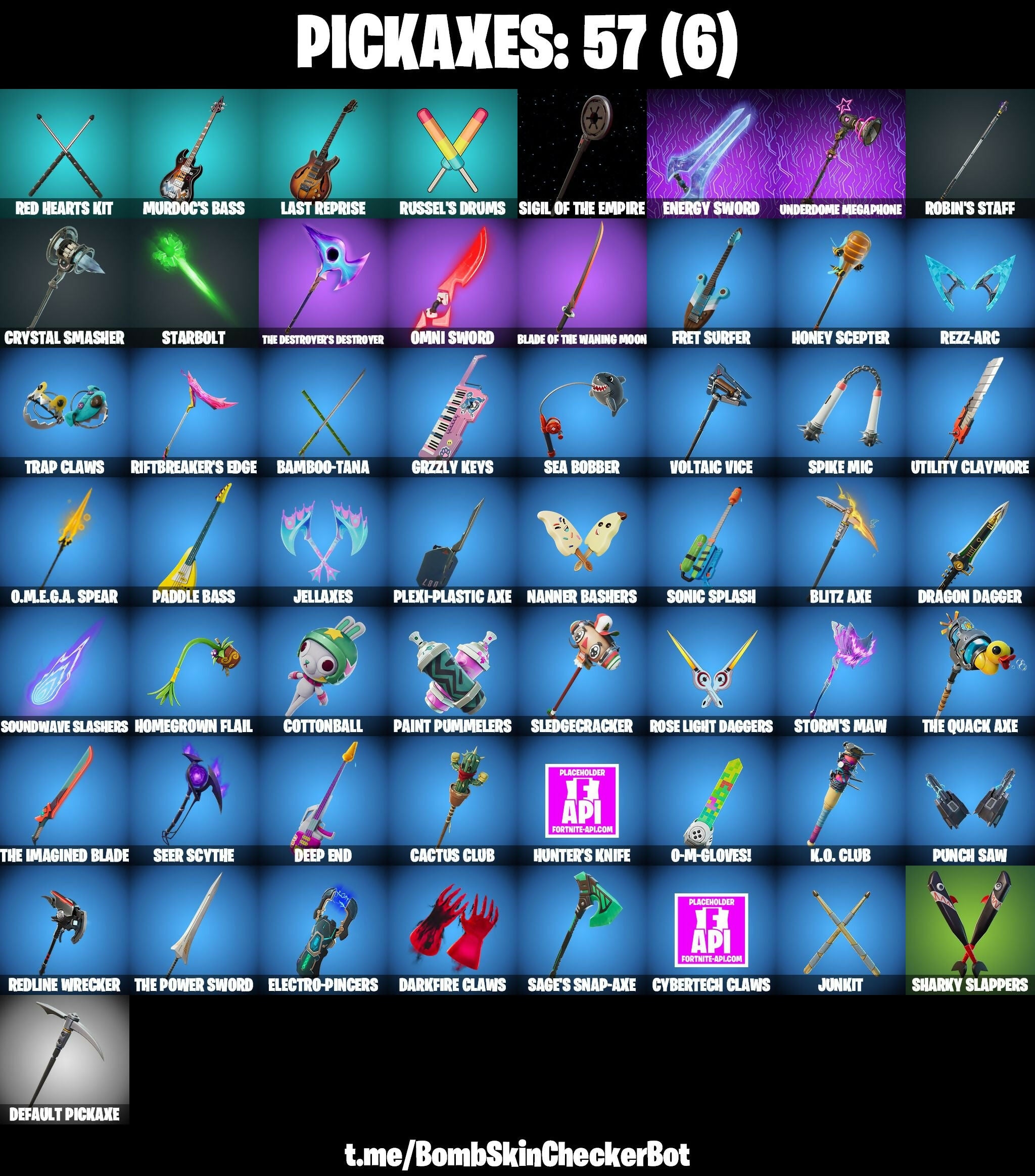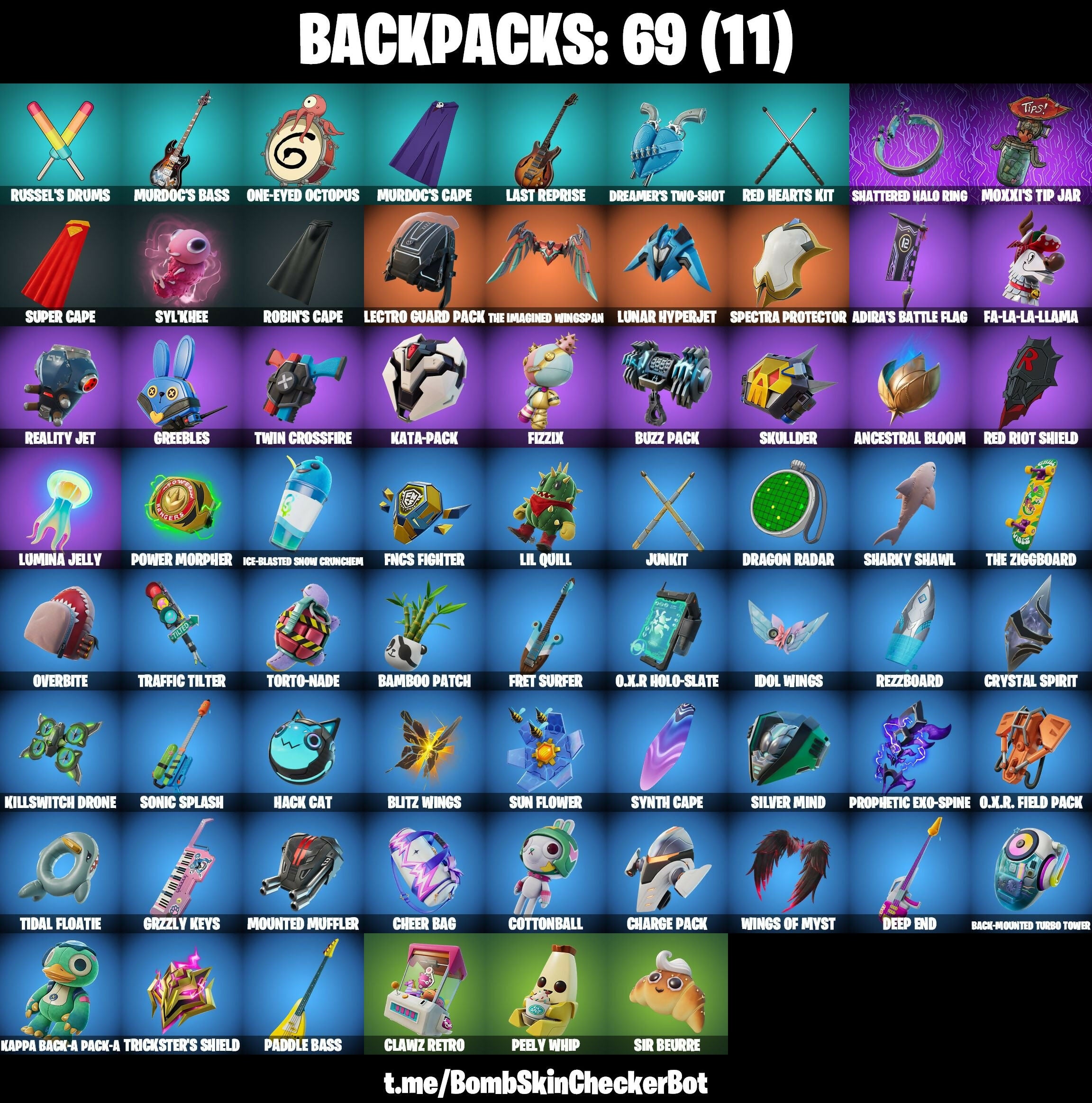 Adira's Battle Flag, Agent Patch, Ancestral Bloom, Arcane Research, Arctic Adeline, Attraction, Augury, Aura, Aw, Shucks., Back-Mounted Turbo Tower, Bamboo Patch, Bamboo-Tana, Battle Bloom, Battle Gamer Mae, Bernie, Bike To Go, Birdarang Flourish, Blade Of The Waning Moon, Blitz 'Brella, Blitz Axe, Blitz Knight, Blitz Wings, Boogie Down, Bulma, Buzz Beat, Buzz Pack, Cactus Club, Chain Surfer, Charge Pack, Cheer Bag, Cheer Bolt, Chillest Vibe Rider, Clawz Retro, Codi Cottontail, Comfy Cats, Comfy Chomps, Cottonball, Cozy Chomps, Crowning Achievement, Crystal Smasher, Crystal Spirit, Cybertech Claws, Cyclo Curl, Daily Flight, Dance Moves, Danica, Darkfire Claws, Deep End, Default Pickaxe, Die With A Smile, Die With A Smile Bruno, Don't Start Now, Dragon Dagger, Dragon Dagger's Song, Dragon Radar, Dreamer's Two-Shot, Eijiro Kirishima, Electro-Pincers, Energy Sword, Etheria, Explorer Emilie, Fa-La-La-Llama, Fizzix, Fncs Fighter, For O.X.R.!, Fox Drifter, Frequency Flyer, Fret Surfer, General's War Table, Ghost Monks, Glider, Good Sportsmanship, Greebles, Green Ranger, Grizzly Keys, Gunnar, Hack Cat, Har-Har-Har!, Haylee Skye, Homegrown Flail, Honey Scepter, Hunter's Knife, Hype!, I'm The Visual, Ice-Blasted Snow Crunchem, Idol Wings, Imperial March, It Is Finished, Jella, Jellaxes, Joystick Jumper, Junkit, K.O. Club, K.O. Cruiser, Kappa Back-A Pack-A Trickster's Shield, Kata Tech Burstwing, Kata-Pack, Kiara K.O., Killswitch, Killswitch Drone, Last Reprise, Leafy Longboardin', Lectro Guard Pack, Liar, Lightrider, Lil Quill, Lil' Diplodoculus, Lil' Ducky Train, Lil' Ghost, Lil' Prancer, Lil' Submarine, Love It!, Lt. Ripp Slade, Lumina Jelly, Lunar Hyperjet, Lunar Skyspan, Mad Moxxi, Masterpiece Bubble, Microflip, Morgan Myst, Mounted Muffler, Moxxi's Lip Service, Moxxi's Tip Jar, Mr. Dappermint, Murdoc, Murdoc's Bass, Murdoc's Cape, Nanner Bashers, Neko-rx1, Nemia, O-M-Gloves!, O.M.E.G.A. Aerial, O.M.E.G.A. Diagnostic, O.M.E.G.A. Spear, O.M.E.G.A. Suit Alpha, O.X.R Field Pack, O.X.R Holo-Slate, O.X.R. Drifter, Omni Sword, One-Eyed Octopus, Onyx Winter, Overbite, Paddle Bass, Paint Pummeler's, Panda Parade, Peely Whip, Plexi-Plastic Axe, Polly, Power Morpher, Prophetic Exo-Spine, Punch Saw, Reality Jet, Red Hearts Kit, Red Riot Shield, Red Robin's Wings, Redline Racer, Redline Scout, Redline Wrecker, Reporting For Duty, Rescue Board, Rescue Run, Rezz-Arc, Rezzblocks, Rezzboard, Rift Break, Riftbreaker's Edge, Riftreaver Drift, Robin, Robin's Cape, Robin's Staff, Rose Light Daggers, Russel, Russel's Drums, Sage, Sage's Snap-Axe, Sail Shark, Sea Bobber, Seer Scythe, Segway Tour, Selbi, Seven Glider, Seven Signet, Sharky Shawl, Sharky Slappers, Shattered Halo Ring, Sigil Of The Empire, Silver Mind, Sir Beurre, Skullder, Sledgecracker, Sonic Splash, Soundwave Slashers, Spectra Protector, Spike Mic, Starbolt, Starfire, Starfire's Flourish, Storm Crash, Storm's Maw, Street Wave Teknique, Sun Flower, Super Cape, Super Save, Superfast Jellyfish, Superman, Syl'khee, Synth Cape, Synth Step, Synthwave, Tagger's Groove, Take A' Bow, Targeted Focus, The Destroyer's Destroyer, The Imagined, The Imagined Blade, The Imagined Wingspan, The Power Sword, The Quack Axe, The Umbrella, The Visitor (Reality Unknown), The Ziggboard, Tidal Floatie, Tide Strider, Torto-Nade, Traffic Tilter, Trailblazer Tai, Trap Claws, Tsuki 2.0, Twin Crossfire, Underdome Megaphone, Unsc Spartan, Utility Claymore, Utopia 'Brella, Visitor's Reflexes, Visual's Glider, Voltaic Vice, White Tigerzord, Wings of Myst, Wintry Whirligig, Without You, Yoo-mi, Ziggy