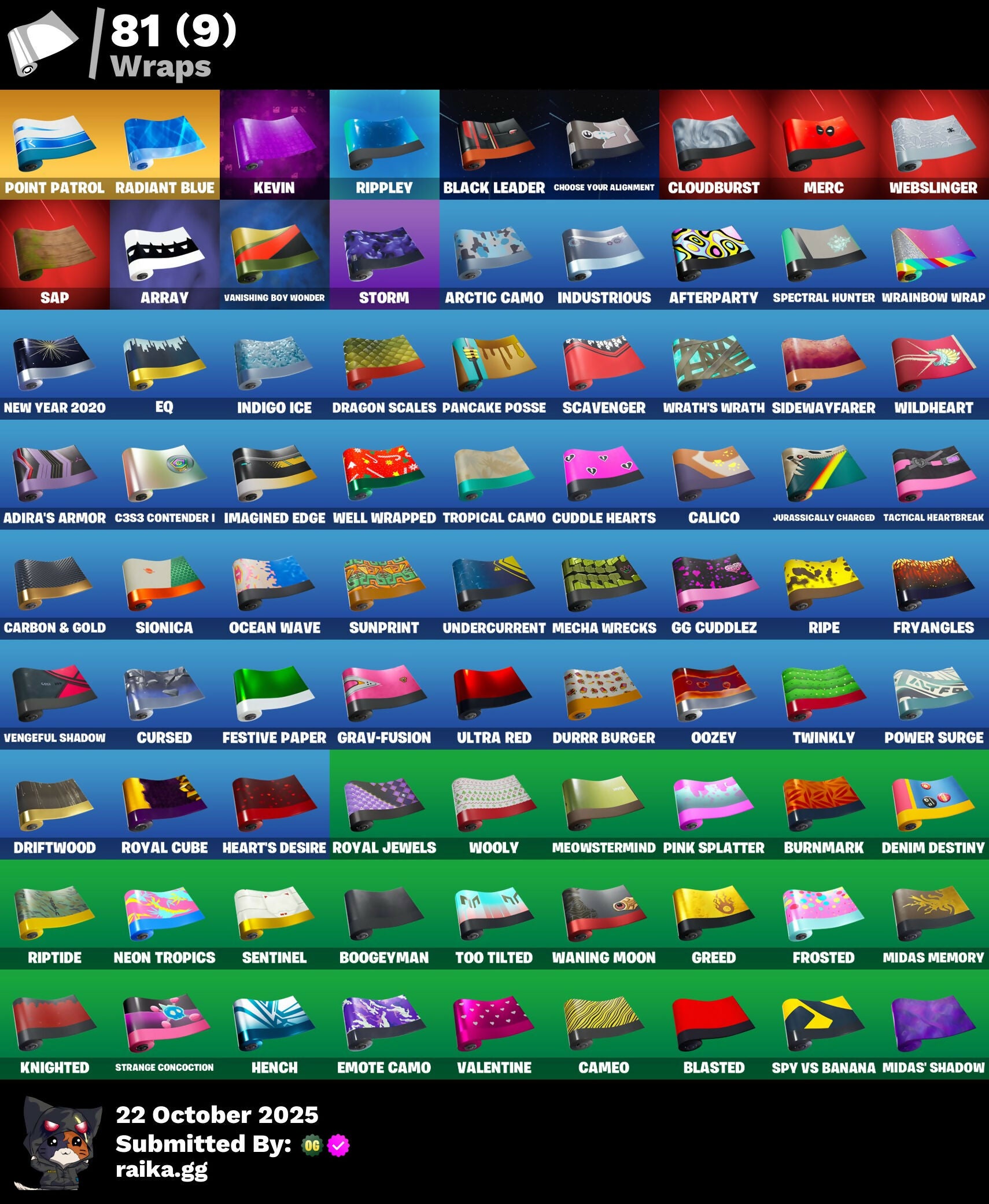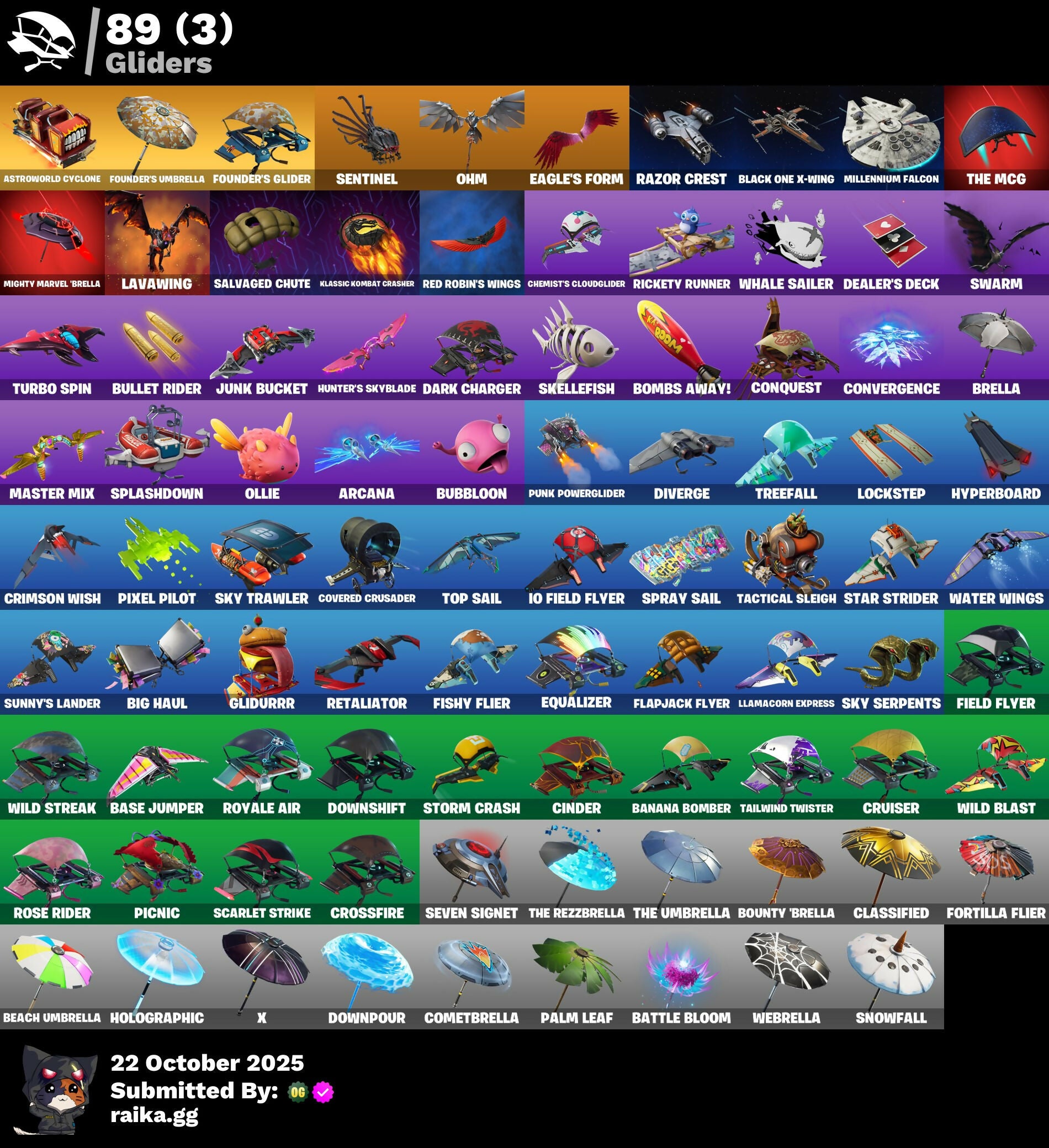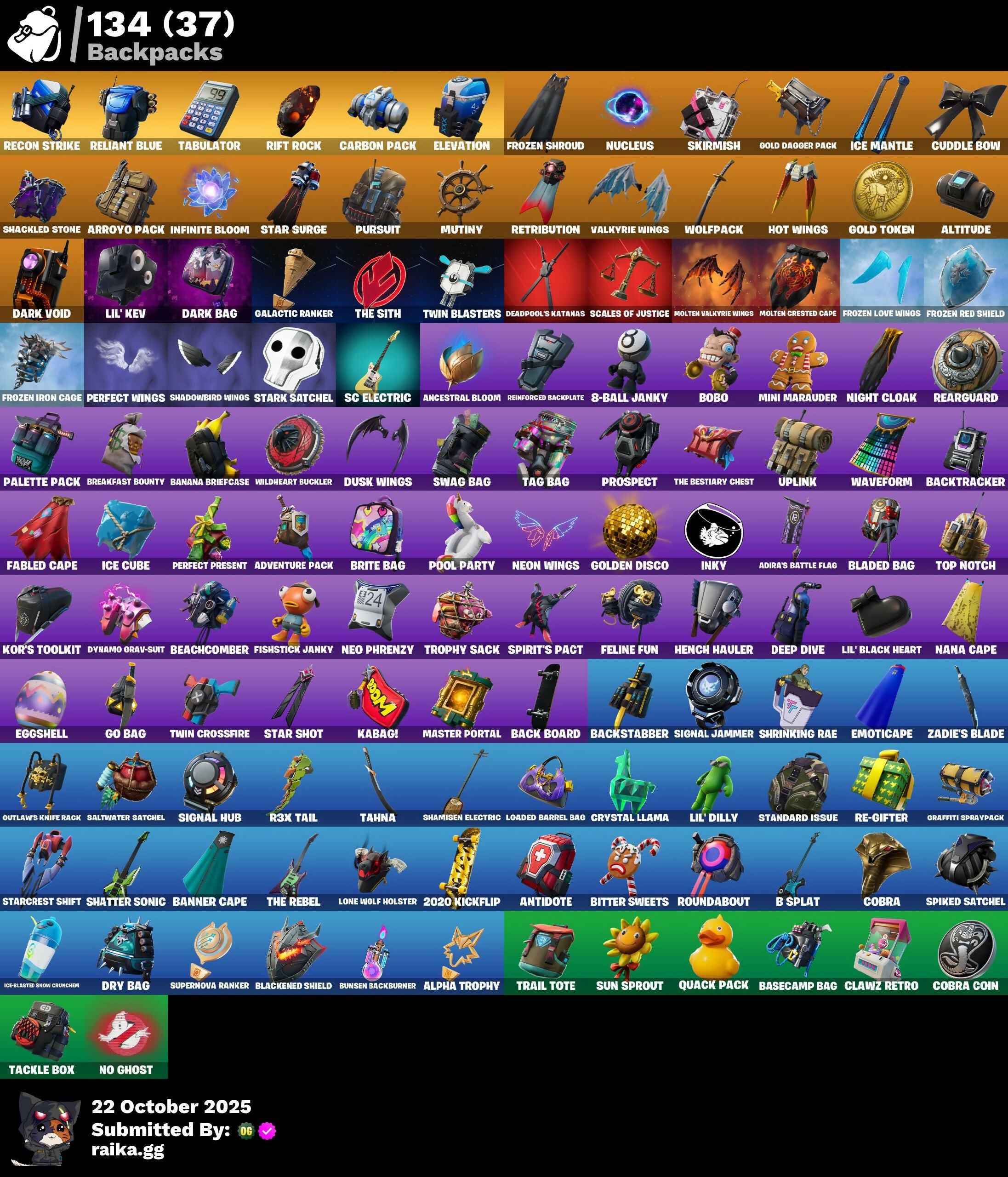 2020 Kickflip, 8-Ball Janky, Abominable Axe, Abstrakt, Adira's Armor, Adira's Battle Flag, Adventure Pack, Aerosol Hammer, Afterparty, Agent Peely, Air Shredder, Alpha Trophy, Altitude, Amazing Cube, Ancestral Bloom, Angler Axes, Antidote, Apex Predator, Apprentice Evie, Arcana, Arctic Camo, Armature, Array, Arroyo Pack, Assault Trooper, Astro Jack, Astroworld Cyclone, B Splat, B.R.U.T.E. Gunner, Back Board, Backlash, Backstabber, Backtracker, Balloon Axe, Banana Bomber, Banana Briefcase, Bananaxe, Banner Cape, Baron's Hoard, Base Jumper, Basecamp Bag, Basic Basher, Battle Bloom, Beach Umbrella, Beachcomber, Beastfang, Beep Beep, Behold!, Big Haul, Billy Bounce, Bitter Sweets, Black Leader, Black One X-Wing, Blackened Shield, Blackheart, Blade of the Waning Moon, Bladed Bag, Blasted, Blitz Axe, Blizzabelle, Blowing Bubbles, Bobo, Bombs Away!, Boogeyman, Boogie Down, Boomin', Bootstraps, Boulder Breakers, Bounty 'brella, Breakdown, Breakfast Bounty, Breaking Point, Breakneck, Breakpoint, Breathless Blades, Breezy, Brella, Brite Bag, Brite Gunner, Brush Your Shoulders, Bubbloon, Bullet Rider, Bunker Basher, Bunker Jonesy, Bunny Brawler, Bunsen Backburner, Burnmark, C3S3 Contender I, Calamity, Calculated, Calico, Call Me, Cameo, Carbon & Gold, Carbon Commando, Carbon Pack, Cat Flip, Catalyst, Charlotte, Chemist's Cloudglider, Choice Knit, Cinder, Classified, Clawz Retro, Clean Groove, Clean Sweep, Cloud Striker, Cloudburst, Cluck Strut, Cobalt, Cobra, Cobra Coin, Coin Flip, Cometbrella, Conga, Conquest, Constructor, Convergence, Cookie Cutter, Cosmic Cleavers, Covered Crusader, Crescent Shroom, Crimson Scythe, Crimson Wish, Crossfire, Crowbar, Crowning Achievement, Cruiser, Crystal Llama, Cuddle Bow, Cuddle Carvers, Cuddle Hearts, Cuddle Team Leader, Cursed, DJ Yonder, Dabstand, Dark Bag, Dark Bomber, Dark Charger, Dark Vanguard, Dark Void, Deadfire, Deadpool, Deadpool's Katanas, Dealer's Deck, Death Star Smasher, Deep Dab, Deep Dive, Demi, Demonslayer Blade, Denim Destiny, Dire, Dive Knives, Diverge, Downpour, Downshift, Dragon Scales, Dragon Stance, Dragon's Claw, Drift, Driftwood, Driver, Droop, Dry Bag, Duplicating Batons, Durrr Burger, Dusk, Dusk Wings, Dynamo, Dynamo Grav-Suit, EQ, Eagle's Form, Eggshell, Electro Pairing Blades, Electro Shuffle, Electro Swing, Elegant Crowbar, Elevation, Ember, Emote Camo, Emoticae, Eon Blades, Epic Swords of Wonder, Equalizer, Eternal Voyager, Fable, Fabled Cape, Face Palm, Fade, Featherweight, Feel The Force, Feline Fun, Festive Paper, Field Flyer, Fishstick Janky, Fishy Flier, Flamenco, Flapjack Flyer, Flippin' Away, Focused, Fortilla Flier, Founder's Glider, Founder's Umbrella, Free Flow, Fresh Cut, Frosted, Frozen Axe, Frozen Iron Cage, Frozen Love Ranger, Frozen Love Wings, Frozen Raven, Frozen Red Knight, Frozen Red Shield, Frozen Shroud, Fry Angles, Funk Ops, GG Cuddlez, Galactic Ranker, Galaxy Scout, Gear Specialist Maya, Gentleman's Dab, Get Funky, Giddy-Up, Gilded Scepter, Gingerbread Raider, Glidurrr, Go Bag, Gold Brutus, Gold Dagger Pack, Gold Digger, Gold Midas, Gold Token, Golden Disco, Golden King, Golf Clap, Graffiti Spraypack, Grav-Fusion, Greed, Groots Sap Axes, Ground Pound, Guiding Glow, Gum Brawler, Hack & Smash, Hand-Forged, Harmonic Axes, Have A Seat, Heart Sign, Heart's Desire, Hello Friend, Hench, Hench Hauler, High Five, Holly Hatchets, Holographic, Honor Guard, Hot Marat, Hot Pokers, Hot Stuff, Hot Wings, Hunter's Skyblade, Huntress, Hybrid, Hyperboard, Ice Breaker, Ice Cube, Ice Mantle, Ice Scepter, Ice-Blasted Snow Crunch, Imagined Edge, Indigo Ice, Industrious, Inferno, Infinite Bloom, Infinite Dab, Inky, Iris, Island Vibes, It Is Finished, It's Go Time!, It's... You?, Jar Buster, Jaywalking, Jolly Jammer, Josie, Journey vs Hazard, Jubilation, Jules, Jump Jets, Junk Bucket, Jurassically Charged, Kabag!, Keep It Mello, Kevin, Keyed Up, Kit, Kittanas, Klassic Kombat Crasher, Knighted, Kondor, Kor's Toolkit, Krisabelle, Laid Back Shuffle, Lavawing, Lexa, Lil' Black Heart, Lil' Dilly, Lil' Kev, Lil' Resistance Bomber, Llamacorn Express, Loaded Barrel Bag, Lockpick, Lockstep, Lone Wolf Holster, Love It!, Low 'N Slow, Lt. Evergreen, Lucky, Lug Axe, Lynx, Mancake, Mandalorian, Manic, Marika, Marked Marauder, Marsh Walk, Master Mix, Master Portal, Mave, Mean Streak, Mech Axe, Mecha Wrecks, Meowscles, Meowstermind, Merc, Merry Marauder, Mic Drop, Midas Memory, Midas' Shadow, Mighty Marvel 'brella, Millennium Falcon, Mind Blown, Mini Marauder, Molten Battle Hound, Molten Crested Cape, Molten Valkyrie, Molten Valkyrie Wings, Munitions Expert, Mutiny, Nana Cape, Nana Nana, Ne'Jari Warhammer, Neo Phrenzy, Neo Versa, Neon Tropics, Neon Wings, New Year 2020, Night Cloak, Nightshade, Nitelite, No Ghost, No Sweat, Nucleus, O.M.E.G.A. Spear, Oath & Sorrow, Ocean, Ocean Wave, Ohm, Ol' Woody, Ollie, Onesie, Oozey, Orange Justice, Outlander, Outlaw's Knife Rack, Outlaw's Whipknives, Palette Pack, Palm Leaf, Pancake Posse, Pandemonium, Par Patroller, Party Hips, Pastel, Paws & Claws, Peace Out, Peely, Peppermint Pick, Perfect Point, Perfect Present, Perfect Shadow, Perfect Wings, Permafrost, Picnic, Pink Splatter, Pixel Pilot, Plunja, Pneumatic Twin, Point It Out, Point Patrol, Point Patroller, Poised Playmaker, Polar Peely, Pool Party, Pop Axe, Powder, Power Claws, Power Surge, Prodigy, Prospect, Pumpernickel, Punk Powerglider, Pursuit, Quack Pack, R3X Tail, Radiant Blue, Rage Quit, Ragnarok, Raise The Roof, Rambunctious, Raven's Legion, Rawr, Razor Crest, Re-Gifter, Ready When You Are, Rearguard, Reckoning, Recon Ranger, Recon Strike, Red Jade, Red Robin's Wings, Red Strike, Redline, Reese, Regal Wave, Reinforced Backplate, Reliant Blue, Remedy vs Toxin, Renegade, Respect The Peace, Retaliator, Retribution, Revoker, Rickety Runner, Ride The Pony, Rift Edge, Rift Rock, Ripe, Ripe Rippers, Rippley, Rippley vs Sludge, Riptide, Rook, Rose Glow, Rose Rider, Rose Team Leader, Roundabout, Rox, Royal Cube, Royal Jewels, Royale Air, Running Man, Rus