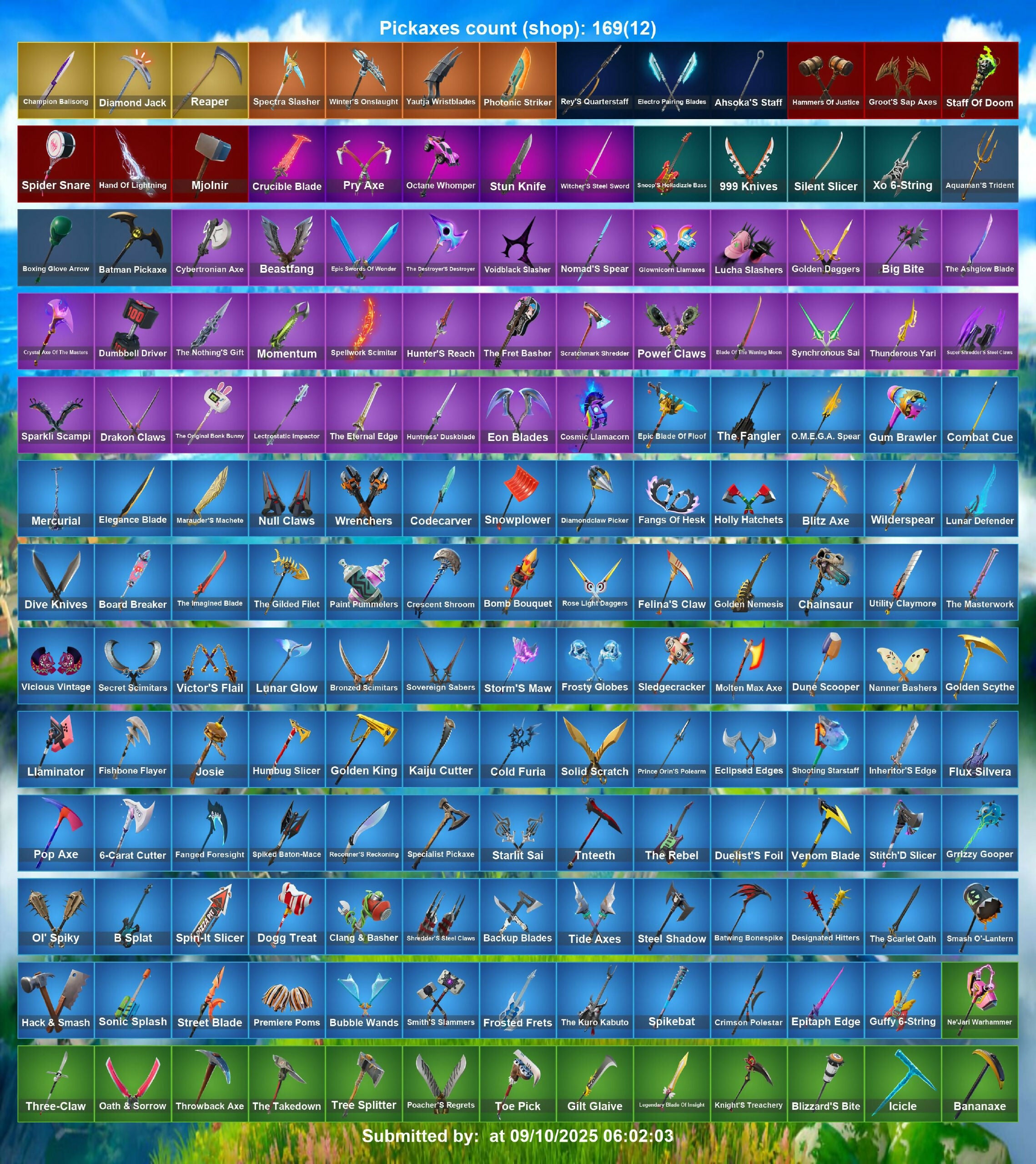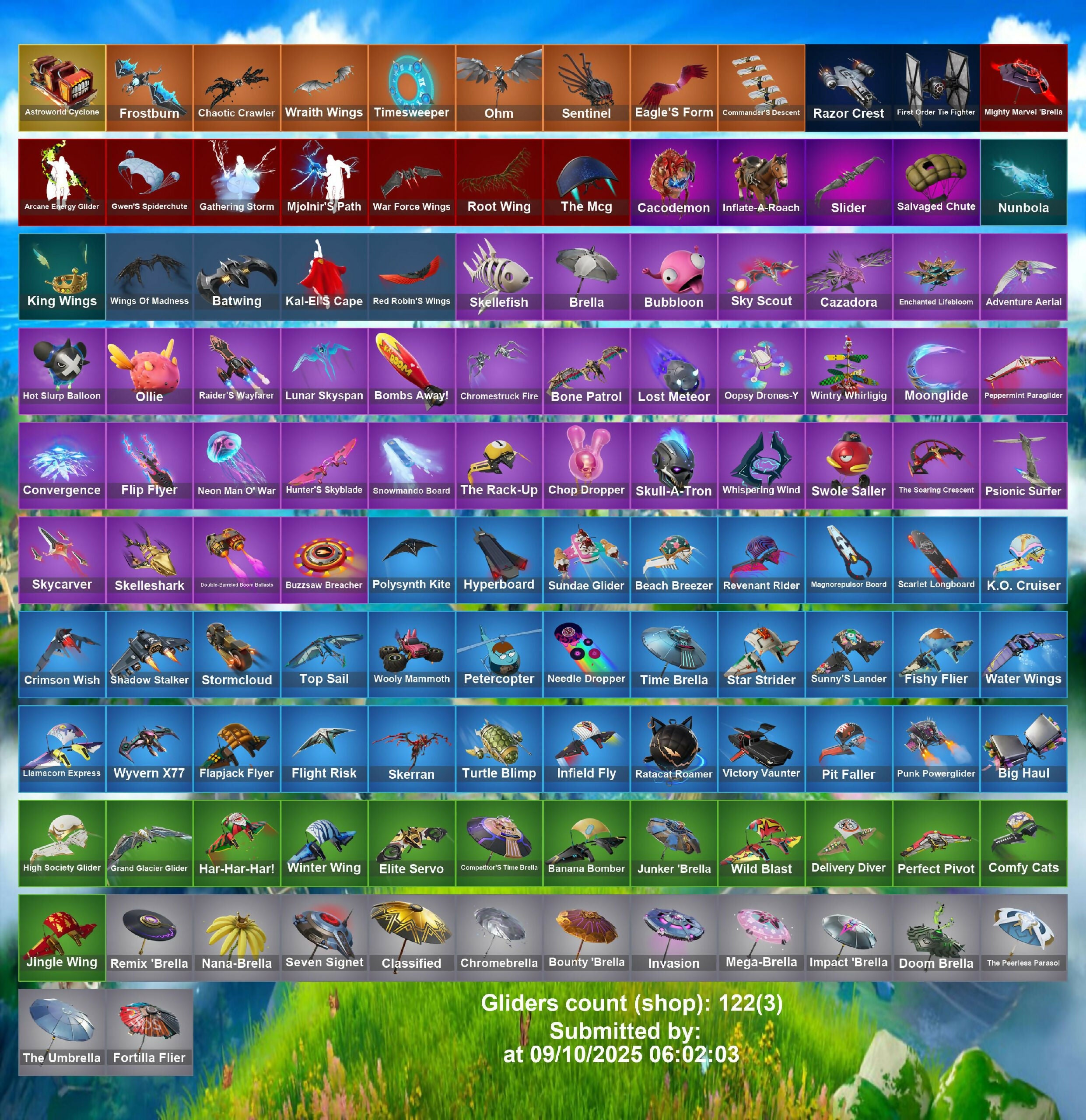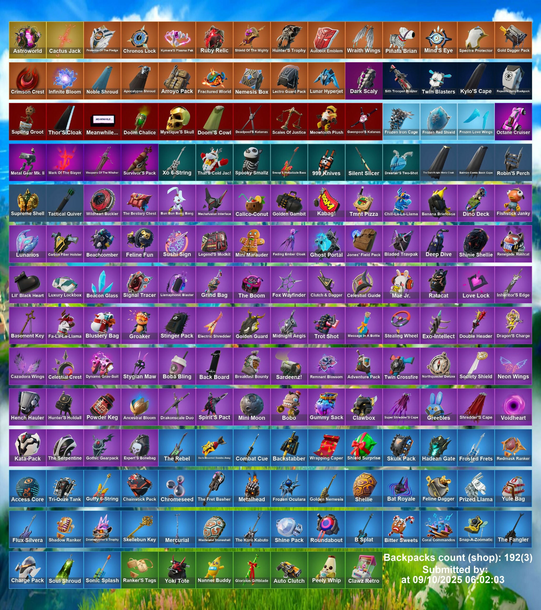 1-Ball, 6-Carat Cutter, 999 Knives, A Warrior Prepares, Access Core, Adventure Aerial, Adventure Pack, Agent Jones, Agent Peely, Ahsoka Tano, Ahsoka'S Staff, Air Horn, Air Shredder, Ancestral Bloom, Antonia, Apocalypse Shroud, Aquaman, Aquaman'S Trident, Arachrobatics, Arcane Energy Glider, Arctic Adeline, Arroyo Pack, Astrea, Astro Jack, Astroworld, Astroworld Cyclone, Auto Clutch, Autobot Emblem, Ayida, B Splat, Back Board, Backstabber, Backup Blades, Balance Board, Banana Bomber, Banana Briefcase, Bananaxe, Basement Key, Bat Royale, Batman Comic Book Cape, Batman Comic Book Outfit, Batman Pickaxe, Battle Call, Battle Prep, Battle Prep: Super, Batwing, Batwing Bonespike, Beach Breezer, Beachcomber, Beacon Glass, Bear Hug, Beastfang, Beep Beep, Big Bite, Big Fan, Big Haul, Bitter Sweets, Black Mounted Bombs Away, Blade Of The Waning Moon, Bladed Traypak, Blitz Axe, Blizzard'S Bite, Blustery Bag, Board Breaker, Boba Bling, Boba Snack, Bobo, Bomb Bouquet, Bombs Away!, Bone Patrol, Boneless, Boogie Down, Boomin', Bounty 'Brella, Boxing Glove Arrow, Breakfast Bounty, Breezabelle, Brella, Bronzed Scimitars, Brutus, Bubble Wands, Bubbloon, Bun Bun Bang Bang, Buzzsaw Breacher, Bytes, Cacodemon, Cactus Jack, Calico-Conut, Call Me, Called Shot, Carbon Fiber Holster, Cardistry, Cazadora, Cazadora Wings, Celestial Crest, Celestial Guide, Chainsaur, Chainstick Pack, Champion Balisong, Chaos Director, Chaotic Crawler, Charge Pack, Chef'S Special, Chess Master, Chili-La-La-Llama, Choice Knit, Chop Dropper, Chrome Punk, Chromebrella, Chromeseed, Chromestruck Fire, Chronos Lock, Clang & Basher, Classified, Clawbox, Clawz Retro, Clean Sweep, Clutch & Dagger, Codecarver, Coin Flip, Cold Furia, Combat Cue, Comfy Cats, Commander's Descent, Competitor'S Time Brella, Convergence, Coral Commandos, Cosmic Llamacorn, Count It!, Crack It, Crescent Shroom, Crimson Crest, Crimson Polestar, Crimson Wish, Crowning Achievement, Crucible Blade, Crystal Axe Of The Masters, Cybertronian Axe, Cyclo Curl, Dagger Dance, Dahlia, Dark Rex, Dark Scaly, Dark Side, Deadpool, Deadpool's Katanas, Deep Dive, Delivery Diver, Designated Hitters, Diamond Diva, Diamond Jack, Diamond Throne, Diamondclaw Picker, Dice Roll, Dino Deck, Dirtbike Challenge, Dive Knives, Do The 'Split, Doctor Doom, Dogg Treat, Doom Brella, Doom Chalice, Doom Slayer, Doom's Cowl, Double Header, Double Up, Double-Dambled Doom Ballasts, Doze Dab, Dragon's Charge, Drakon Claws, Drakon Steel Hybrid, Drakonscale Duo, Dramatic Flares, Dreamer's Two-Shot, Droamrunner's Trophy, Duelist'S Foil, Dumbbell Driver, Dune Scooper, Dusty, Dutch, Dynamo Gravi-Suit, Dynamo Tntina, Eagle's Form, Eclipsed Edges, Electric Shredder, Electro Pairing Blades, Elegance Blade, Elite Servo, Enchanted Lifebloom, Eon Blades, Epic Blade Of Floof, Epic Swords Of Wonder, Epitaph Edge, Era, Evasive Maneuvers, Exo-Intellect, Expert's Bonebag, Explorer Emilie, Expressionism, Fa-La-La-Llama, Fade, Fading Ember Cloak, Fanged Foresight, Fangs Of Hesk, Felina, Felina'S Claw, Feline Dagger, Feline Fun, First Order Tie Fighter, Fish Thicc, Fishbone Flayer, Fishstick Janky, Fishy Flier, Flaky Feast, Flapjack Flyer, Flashback Breakdown, Flight Risk, Flip Flyer, Flippin' Away, Flux Silvera, Foil Flex, Fortilla Flier, Fox Wayfinder, Fractured World, Frigid Foregoer, Frost Squad, Frostburn, Frosted Frets, Frosty Globes, Frozen Iron Cage, Frozen Love Ranger, Frozen Love Wings, Frozen Oculara, Frozen Raven, Frozen Red Knight, Frozen Red Shield, Galaxia, Gathering Storm, Gear Specialist Maya, Geralt Of Rivia, Get Griddy, Get Out Of Your Mind, Ghost Portal, Gildhart, Gilt Glaive, Gingerbread Raider, Glorious Giftblade, Glownicorn Llamaxes, Gold Dagger Pack, Gold Midas, Golden Daggers, Golden Gambit, Golden Guard, Golden King, Golden Nemesis, Golden Scythe, Good Game, Well Played, Gothic Gearpack, Grand Glacier Glider, Grand Salute, Greebles, Green Arrow, Grind Bag, Groaker, Groot, Groot'S Sap Axes, Grriz, Grrizzy Gooper, Guff Gringle, Guffy 6-String, Gum Brawler, Gummy Sack, Gwen's Spiderchute, Gwenpool's Katanas, Hack & Smash, Hadean Gate, Hammers Of Justice, Hand Of Lightning, Har-Har-Har!, Have A Seat, Haven, Heart Of A King, Heartburst, Helsie, Hench Hauler, High Society Glider, Holiday Boxy, Holly Hatchets, Hope, Hot Slurp Balloon, Humbug Slicer, Hunter'S Reach, Hunter's Holdall, Hunter's Skyblade, Hunter's Trophy, Huntress' Duskblade, Hyperboard, Hypnot-Eyes, I'm A Mystery, Icicle, Igni Sign, Imani, Impact 'Brella, Infield Fly, Infinite Bloom, Inflate-A-Roach, Inheritor'S Edge, Invasion, Iris, Jack O'Sassin, Jellie, Jennifer Walters, Jingle Wing, Jones' Field Pack, Joni The Red, Josie, Jules, Jump Around, Junker 'Brella, K.O. Cruiser, Kabag!, Kado Thorne, Kaiju Cutter, Kal-El's Cape, Kata-Pack, Keleritas, Keyed Up, Khaby Lame, King Wings, Kit, Knight'S Treachery, Kondor, Krisabelle, Kylo Ren, Kylo's Cape, Kymera, Kymera's Plasma Pak, Lana Llane, Lara Croft, Laser Focused, Lectro Guard Pack, Lectrostatic Impactor, Legend's Modkit, Legendary Blade Of Insight, Lennox Rose, Lexa, Lil Split, Lil' Black Heart, Lil' Longboat, Lil' Monster, Lil' Prancer, Lil' Saucer, Lil' T-6 Shuttle, Llamacorn Express, Llamaphonic Blaster, Llaminator, Lorenzo, Lost Meteor, Love It!, Love Lock, Lt. John Llama, Lucha Slashers, Lumi Jellie, Lunar Charge, Lunar Defender, Lunar Glow, Lunar Hyperjet, Lunar Party, Lunar Skyspan, Lunarios, Luxury Lockbox, Mae, Mae Jr., Magnorepulsor Board, Make A Seat, Make It Plantain, Mancake, Mandalorian, Marauder'S Machete, Marigold, Mariposa, Mark Of The Slayer, Mashed Potato, Massai, Master Of Puppets, Mave, Meanwhile..., Mechafusion Interface, Mega-Brella, Members Only, Menace, Meow Skulls, Meowdas, Meowscles, Meowtooth Plush, Mercurial, Merry Marauder, Message In A Bottle, Metal Gear Mk. Ii, Metalhead, Midnight Aegis, Mighty Marvel 'Brella, Mind's Eye, Mini Marauder, Mini Moon, Mini Slayer Fistbump, Mjolnir, Mjolnir's Path, Molten Max Axe, Momentum, Montague, Moonglide, Mr. Dappermint, Mwahaha