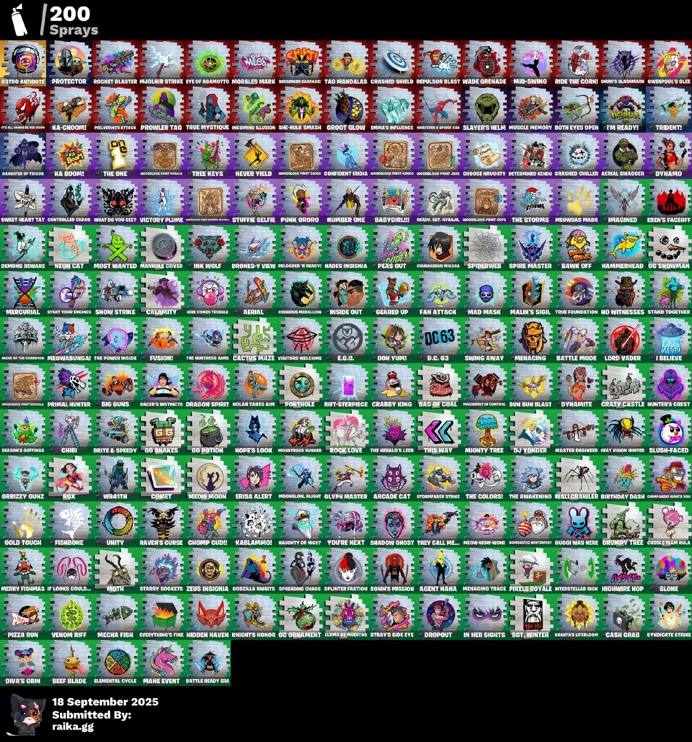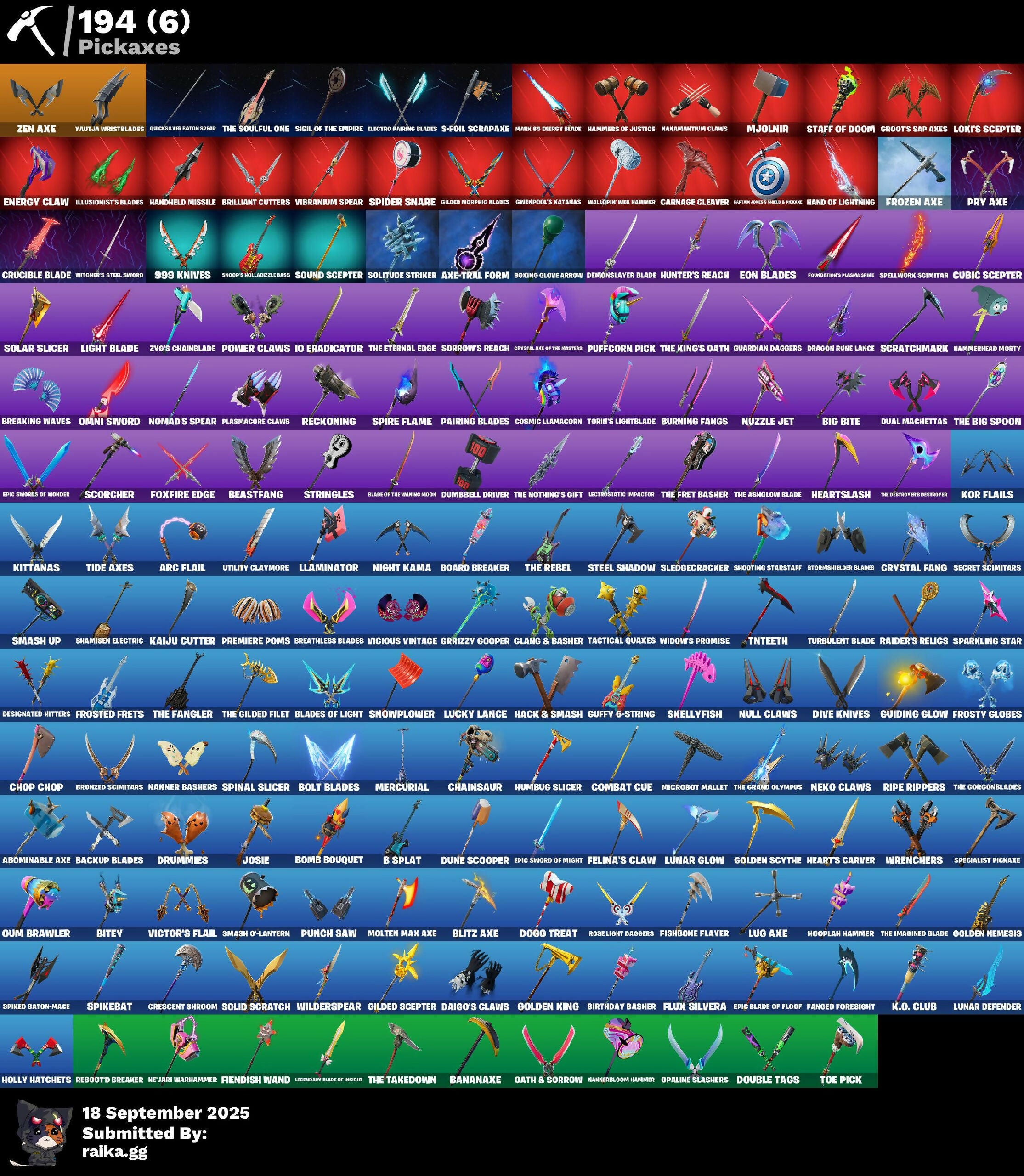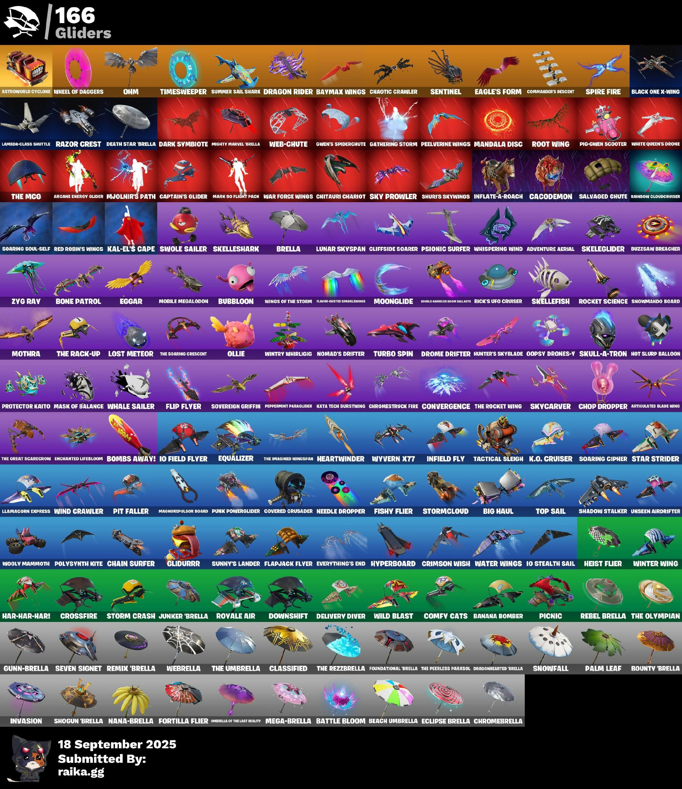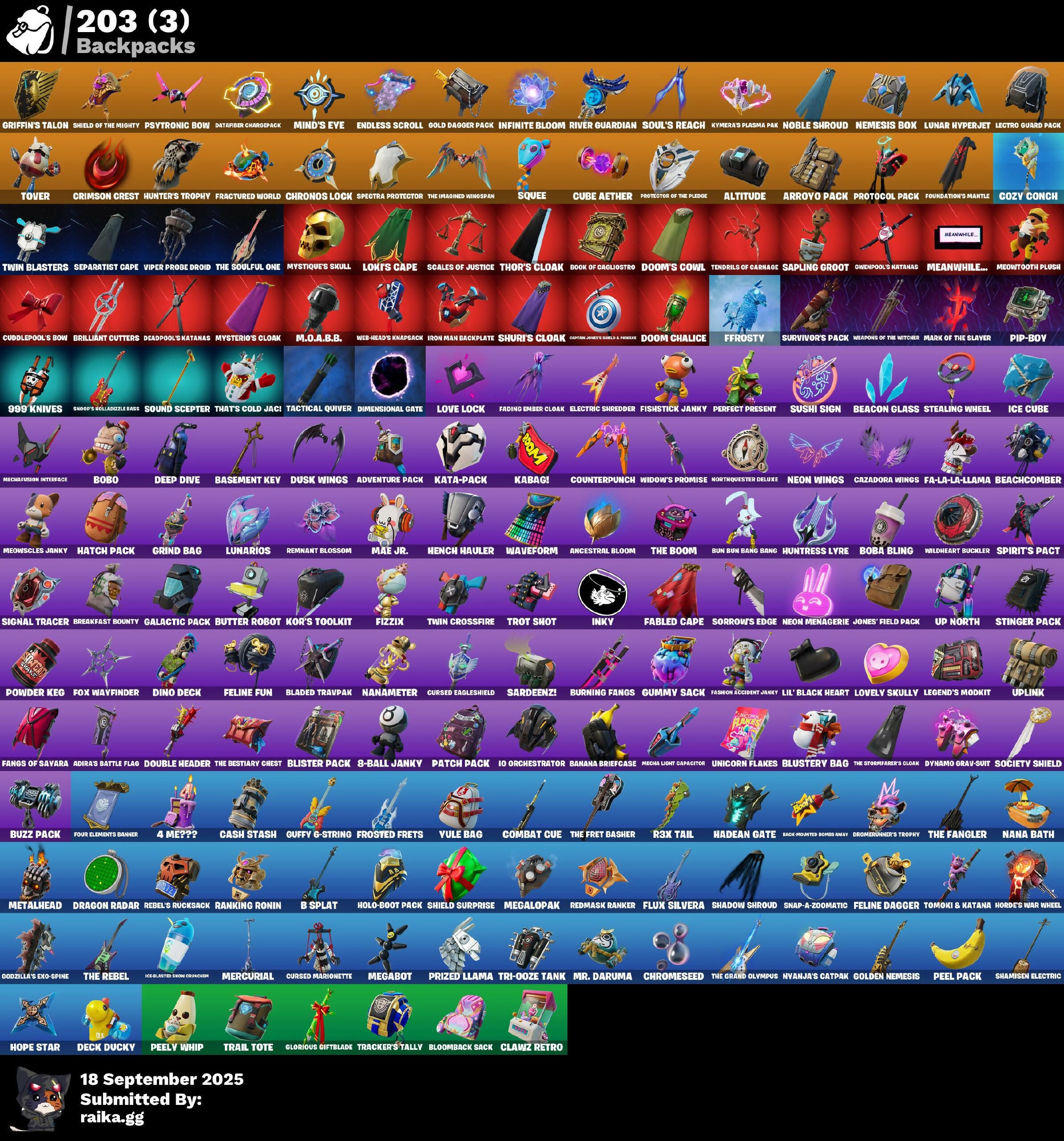 (Snikt!), 1-Ball, 10 Orchestrator, 2.0's Revenge, 2Vggy, 4 Me???, 8-Ball Janky, 999 Knives, A Warrior Prepares, Abduction, Abominable Axe, Acolyte's Curse, Adira, Adira's Armor, Adira's Battle Flag, Adventure Aerial, Adventure Pack, Aerial, Aerial Classic, Aerial Swagger, Agent Jones, Agent Jones (Jump 31), Agent Nana, Agent Peely, Air Shredder, All I Want For Christmas Is You, All-Nighter, Alli, Altitude, Ancestral Bloom, Aquaman, Arachrobatics, Arc Flail, Arcade Cat, Arcane Energy Glider, Arcane Steel, Arctic Adeline, Arctic Camo, Arroyo Pack, Articulated Blade Wing, Astro Antidote, Astro Armor, Astro Jack, Astroworld Cyclone, Axe-tral Form, Azarath Metrion Zinthos!, B Splat, Babygirl!!, Back Haunted Radio-Mant, Backup Blades, Bag Of Coal, Balance Board, Banana Bomber, Banana Briefcase, Bananaxe, Banner, Banner Icon, Baseball, Basement Kev, Bat, Battle Bloom, Battle Mode, Battle Ready Era, Bawk Off, Baymax Wings, Beach Chair, Beach Umbrella, Beachcomber, Beacon Glass, Beamers, Bean Bag, Bear Hug, Beastfang, Beef Blade, Beep Beep, Berserker Barrage, Big Bite, Big Guns, Big Haul, Billy Bounce, Birthday Basher, Birthday Dash, Bitey, Black Hole, Black Leader, Black One X-Wing, Black Panther (Shuri), Blade Of The Waning Moon, Bladed Travpak, Blades Of Light, Blasted, Blister Pack, Blitz Axe, Bloomback Sack, Blowin' Up, Blustery Bag, Board Breaker, Boba Bling, Boba Snack, Bobo, Bolt Blades, Bomb Bouquet, Bombastio Winterfest, Bombs Away!, Bone Patrol, Boogie Down, Book Of Cagliostro, Boomin', Boots 'N' Cats, Both Eyes Open, Bounty 'Brella, Boxing Glove Arrow, Breakfast Bounty, Breaking Waves, Breathless Blades, Brella, Brilliant Cutters, Brite & Speedy, Bronzed Scimitars, Bruno Mars, Brutus, Bubloon, Bun Bun Bang Bang, Bun Bun Blast, Burning Fangs, Burning UFO, Butter Robot, Buttoned Up, Buzz Pack, Buzzer Beater, Buzzsaw Breacher, Bye Bye Bye, Bytes, Bytes (Lone Traveler), Bytes' Sigil, Cacodemon, Cactus Maze, Calamity, Calamity Stage 5, Calico, Call Me, Called Shot, Campfire, Cap K.O., Captain America's Shield & Penance, Captain America's Shield & Pickaxe, Captain Jones, Captain Llamerica, Captain's Glider, Cardistry, Carnage, Carnage (Maximum), Carnage Cleaver, Cash Grab, Cash Stash, Cat's Paw, Catflip, Cattitude, Cauldron Chill, Cazadora Wings, Cerberus Bite, Cerberus Medallion, Chain Surfer, Chainsaur, Chalked Up 1-Ball, Chaos Directive, Chaos Director, Chaotic Crawler, Charlotte, Charlotte (Golden Rune), Charlotte's Logo, Chef's Special, Chibi, Chicken Wing It, Chitauri Chariot, Choice Knit, Chomp Cub!!, Choose Naughty, Chop Chop, Chop Dropper, Choppy, Chrome Marked, Chrome Punk, Chromebrella, Chromeseed, Chromestruck Fire, Chronos Lock, Clang & Basher, Classic Age, Classified, Clawz Retro, Clean Sweep, Cliffside Soarer, Cloudburst, Club President Helsie, Cluck, Cluck (Slurpy), Clucking Mad, Coin Flip, Combat Cue, Comet, Comfy Cats, Commander's Descent, Confetti, Confident Iridia, Conjure Weapon, Contour Camo, Controlled Chaos, Convergence, Corrosive Stripe, Cosmic Llamacorn, Cosmic Sun, Counterpunch, Courageous Mikasa, Covered Crusader, Cowboy Chat, Cozy Conch, Cozy Holidays, Crabby King, Crashed Chiller, Crashed Shield, Crazy Castle, Crescent Shroom, Crimson Crest, Crimson Wish, Crossfire, Crowning Achievement, Crucible Blade, Crystal Axe Of The Masters, Crystal Fang, Cube Aether, Cube Marking, Cubed, Cubic Scepter, Cuddle Mech, Cuddle Team Hula, Cuddlepool, Cuddlepool's Bow, Cuddlepools Bow, Cursed Eagleshield, Cursed Marionette, Cyclo Curl, D.C. 63, DJ Yonder, Dagger Dance, Daigo, Daigo's Claws, Daisies, Dark Symbiote, Darth Shader, Darth Vader, Databird Chargepack, Datafiber Chargedpax, Daughter Of Trigon, Deadpool, Deadpool Unmasked, Deadpool's Katanas, Death Star 'Brella, Deck Ducky, Deep Dive, Deep Future, Deimos, Delivery Diver, Demons Beware, Demonslayer Blade, Denim Destiny, Designated Hitters, Destroyer Signature, Determined Kendo, Dice, Dimensional Camo, Dimensional Gate, Dino Deck, Diva's Grin, Dive Knives, Division, Doctor Doom, Doctor Doom (God Emperor), Doctor Slone, Doctor Strange, Dogg Treat, Dolphin, Doom Chalice, Doom Slayer, Doom's Cowl, Doomed Echo, Double Header, Double Tags, Double-Barreled Boom Ballasts, Downshift, Dragon Radar, Dragon Rider, Dragon Rune Lance, Dragon Rune Lances, Dragon Spirit, Dragonheart 'Brella, Drombringer's Trophy, Drome Drifter, Drones-V View, Dropout, Drummies, Dual Machettas, Dumbbell Driver, Dune Scooper, Durrr Burger, Dusk Wings, Dusty, Dyna-Boom!, Dynamite, Dynamo, Dynamo Grav-Suit, Dynamo Tntina, Dynamo Tntoon-A, E.G.O., Eagle's Form, Easter Egg, Eclipse Brella, Eggar, Electric Shredder, Electro Pairing Blades, Electrostatic Impactor, Elemental Cycle, Emma Frost, Emma's Influence, Enchanted Lifebloom, Endless Scroll, Energy Claw, Eon Blades, Epic Blade Of Floof, Epic Sword Of Might, Epic Swords Of Wonder, Equalizer, Era, Eren Jaeger, Eren's Faceoff, Erisa, Erisa (Stealth Silver), Erisa Alert, Erisa's Crest, Escapees, Evasive Maneuvers, Everything's End, Everything's Fine, Evie, Evolved Heat Ray, Exile's Emblem, Expressionism, Eye Of Agomotto, Fa-La-La-Llama, Fabio Sparklemane, Fabio Sparklemane (Golden Rune), Fable, Fabled Cape, Fade, Fading Ember Cloak, Fan Attack, Fanged Foresight, Fangs Of Savara, Fashion Accident Janky, Felina, Felina's Claw, Feline Dagger, Feline Fun, Ferocious, Festive Paper, Ffrosty, Fiendish Wand, Fireworks Salvo, Fish Hook, Fishbone, Fishbone Flaver, Fishstick Janky, Fishy Flier, Fist, Fist Bump, Fizzix, Flapjack Flyer, Flavor-Dusted Sparklelings, Flip Flyer, Flippin' Away, Floating Island, Flood, Flux Silvera, Foil Flex, Forsaken Eye, Fortilla Flier, Foundation's Mantle, Foundation's Plasma Spike, Foundational, Foundational 'Brella, Four Elements Banner, Fox Wayfinder, Foxfire Edge, Fractured World, Freedom Wheels, Frost Squad, Frosted Frets, Frosty Globes, Frozen Axe, Fryangles, Fusion!, GG Ornament, GG Potion, GG Snakes, GG Snowman, Galactic Pack, Galaxia, Gathering Storm, Gear Specialist Maya, Geared U