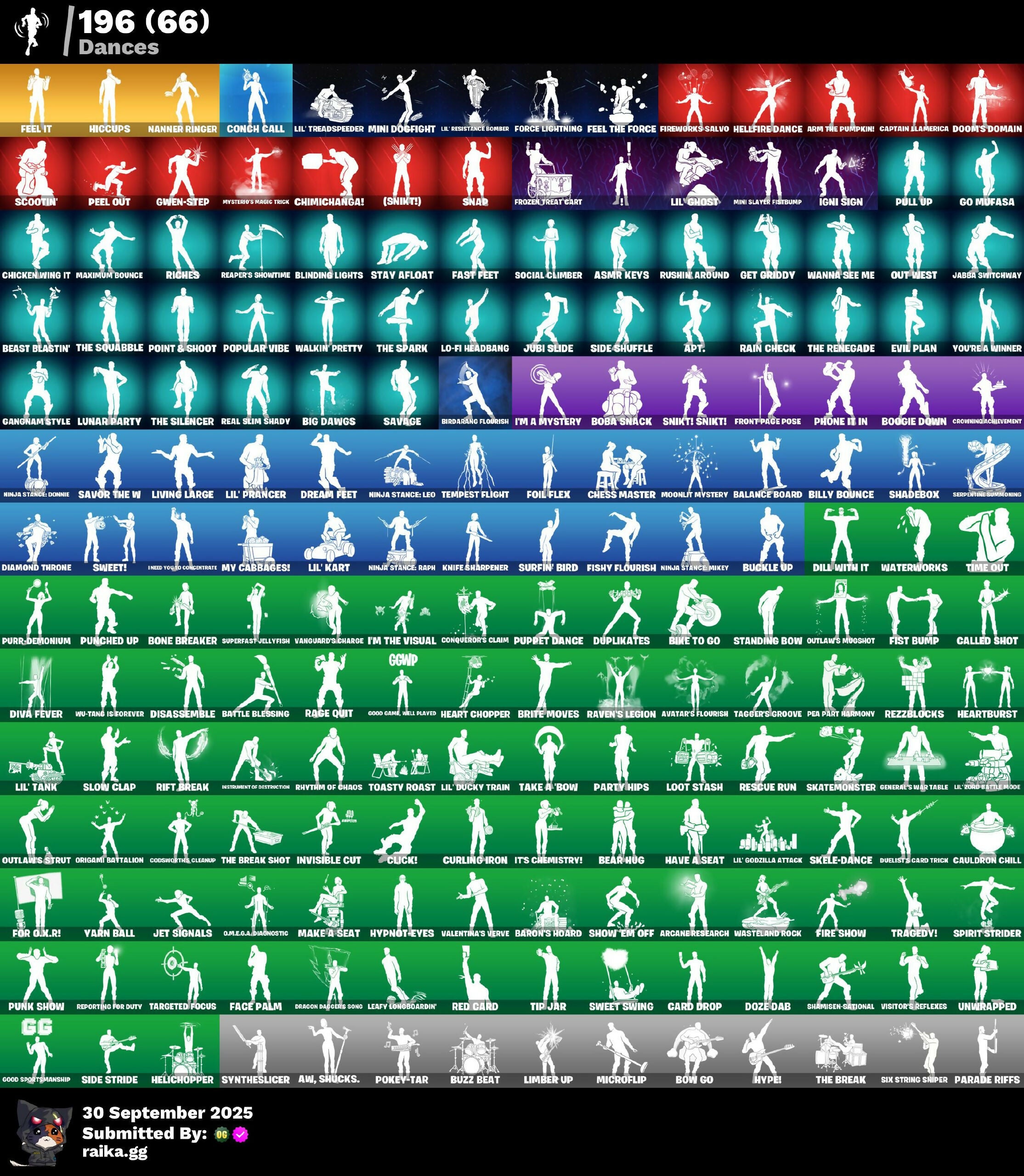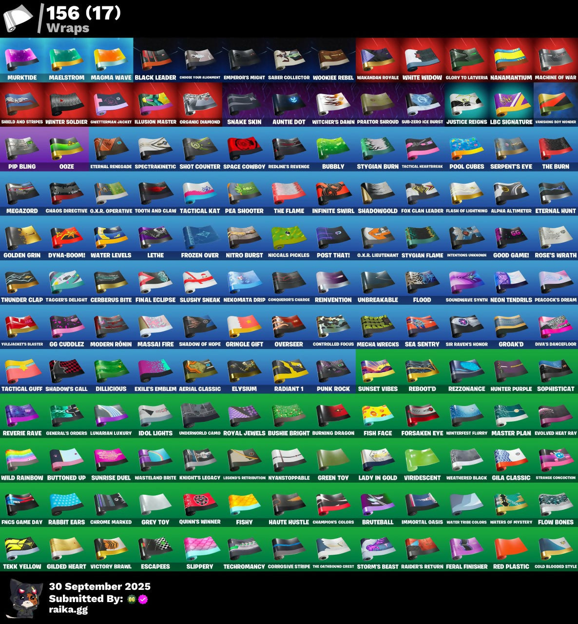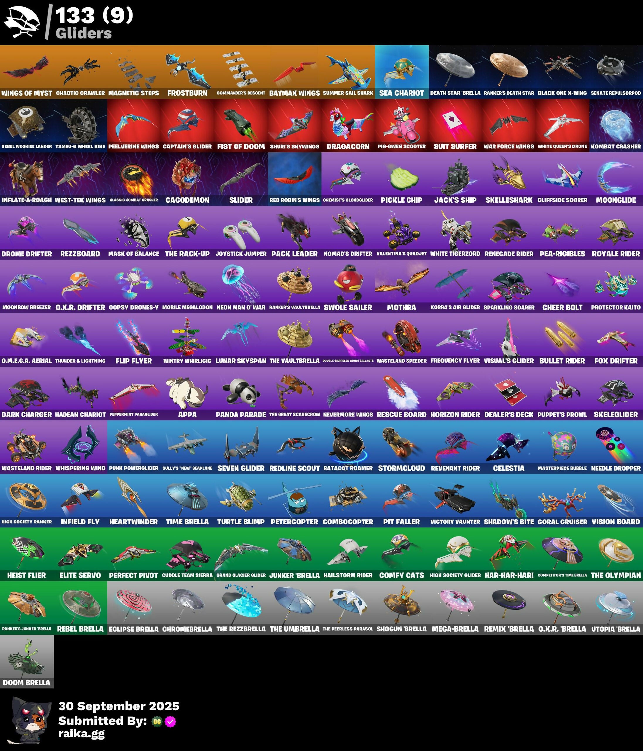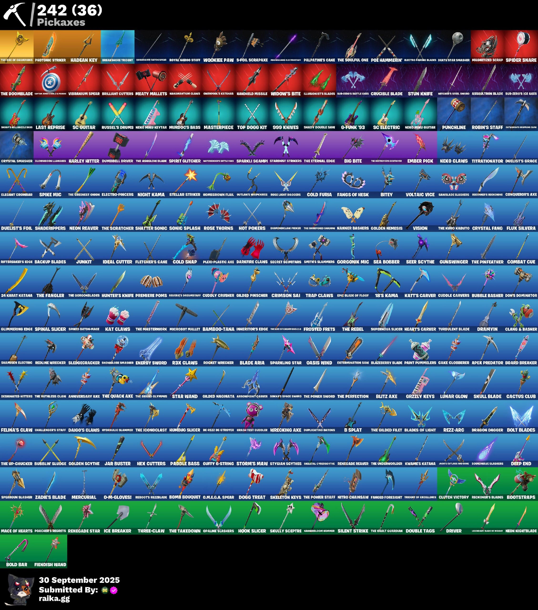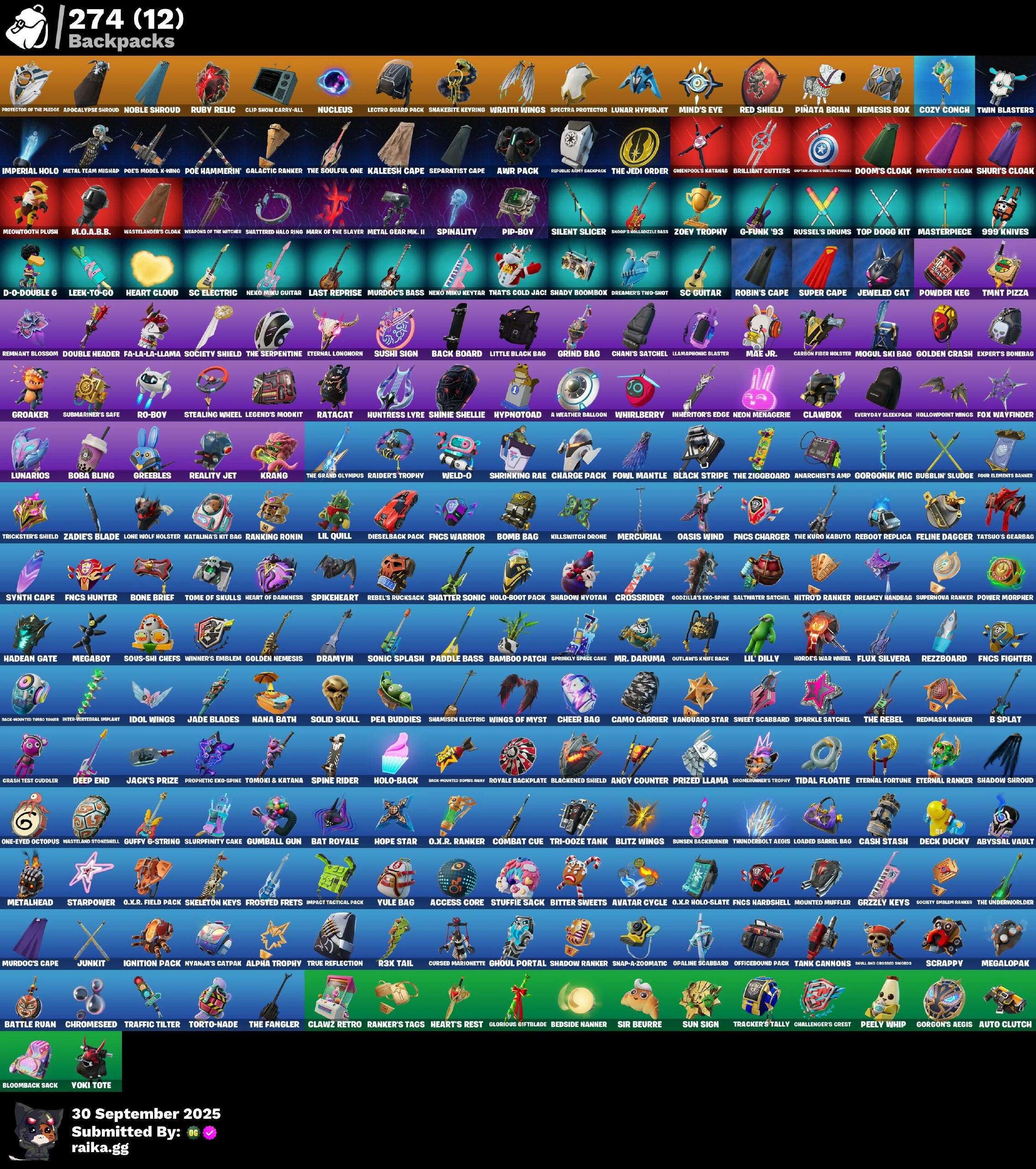 (Snikt!), 1-Ball, 18's Kama, 24 Karat Katana, 999 Knives, A Goat, A Weather Balloon, ASMR Keys, AWR Pack, Abyssal Vault, Access Core, Aerial Assault Bomber, Aerial Classic, Agent Patch, Alpha Altimeter, Alpha Trophy, Amplitude, Anarchist's Amp, Andy Fancerson, Angry Counter, Anniversary Axe, Apex Predator, Aphrodite, Apocalypse Shroud, Appa, Apprentice Evie, Apt., Arcane Research, Arctic Adeline, Arm The Pumpkin!, Arrowpoint Carver, Artemis, Assaultron Blade, Augury, Auntie Dot, Aura, Auto Clutch, Avatar Cycle, Avatar's Flourish, Aw, Shucks., Ayla Winn, B Splat, Back Board, Back-Mounted Jiggly Boombox, Backlash, Backup Blades, Balance Board, Bamboo Patch, Bamboo-Tana, Baron's Hoard, Bat Royale, Battle Blessing, Battle Gamer Mae, Battle Ruan, Baymax Wings, Bear Hug, Beast Blastin', Bedside Nanner, Bernie, Big Bite, Big Dawgs, Big Dill, Bike To Go, Billy Bounce, Birdarang Flourish, Bitey, Bitter Sweets, Black Leader, Black One X-Wing, Black Stripe, Blackened Shield, Blade Aria, Blades of Light, Blazeberry Blade, Blinding Lights, Blitz Axe, Blitz Wings, Bloomback Sack, Board Breaker, Boba Bling, Boba Snack, Bold Bar, Bolt Blades, Bomb Bag, Bomb Bouquet, Bone Breaker, Bone Brief, Bones, Boogie Down, Bootstraps, Bow Go, Brainstorm, Breakshore Trident, Brilliant Cutters, Brite Moves, Brite Raider, Bruteball, Bubble Basher, Bubblin' Sludge, Bubbly, Buckle Up, Bugha, Bullet Rider, Bullseye, Bunsen Backburner, Burning Dragon, Burnoff, Bushie Bright, Buttoned Up, Buzz Beat, Cacodemon, Cactus Club, Cake Clobberer, Called Shot, Camo Carrier, Captain Clamerica, Captain Jones, Captain Jones's Globe, Captain Jones's Shield & Pickaxe, Captain Phasma, Captain's Glider, Card Drop, Carmine Rosso, Carson Fiber Holster, Cash Stash, Cassidy Quinn, Catwoman Comic Book Outfit, Catwoman's Grappling Claw, Cauldron Chill, Celestia, Cerberus, Cerberus Bite, Challenger's Crest, Challenger's Staff, Champion Kyra, Champion Sparkplug, Champion Stash'd, Champion's Colors, Chani, Chani's Satchel, Chaos Directive, Chaos Director, Chaotic Crawler, Charge Pack, Cheer Bag, Cheer Bolt, Chemist's Cloudglider, Chess Master, Chicken Wing It, Chimichanga!, Chrome Marked, Chrome Punk, Chromebrella, Chromeseed, Cipher, Clang & Basher, Clawbox, Clawz Retro, Click!, Cliffside Soarer, Clip Show Carry-All, Clutch Victory, Codsworth's Cleanup, Cold Blooded Style, Cold Furia, Cold Snap, Color Crush, Combat Cue, Combocopter, Comfy Cats, Commander's Descent, Competitor's Time Brella, Conch Call, Conqueror's Axe, Conqueror's Charge, Conqueror's Claim, Controlled Focus, Coral Cruiser, Corrosive Stripe, Cozy Conch, Crash Test Cuddler, Crimson Sai, Crossrider, Crowning Achievement, Crucible Blade, Crystal Fang, Crystal Smasher, Cuddle Carvers, Cuddle Team Sierra, Cuddle Team Specialist, Cuddly Crusher, Curling Iron, Cursed Marionette, D-O-Double G, Daigo, Daigo's Claws, Dali, Danica, Dark Charger, Dark Doggo, Darkfire Claws, De-Rezz De-Stroyer, Dealer's Deck, Death Star 'Brella, Death Star Smasher, Deck Ducky, Deep End, Designated Hitters, Diamond Throne, Diamondclaw Picker, Die with a Smile Bruno, Dieselback Pack, Dill With It, Dillicious, Dino Megazord, Disassemble, Diva Fever, Diva's Dancefloor, Dogg Treat, Don's Dominator, Doom, Doom Brella, Doom Slayer, Doom's Cloak, Doom's Domain, Double Header, Double Tags, Double-Barreled Boom Ballasts, Doze Dab, Dragacorn, Dragon Dagger, Dragon Dagger's Song, Dramyin, Dream Feet, Dreamer's Two-Shot, Dreamyx Handbag, Driver, Drome Drifter, Droneburner's Trophy, Duelist's Card Trick, Duelist's Foil, Duelist's Grace, Dumbbell Driver, Dupli-Kate, Duplicating Batons, Duplikates, Durrr Taisho, Dusk Knight, Dusty, Dyna-Boom!, Dynamo Tntina, Echo, Eclipse Brella, Electro Pairing Blades, Electro-Pincers, Elegant Crowbar, Elite Servo, Elysium, Ember Pick, Emma Frost, Emperor Palpatine, Emperor's Might, Energy Sword, Epic Blade of Floof, Escapees, Eternal Fortune, Eternal Hunt, Eternal Longhorn, Eternal Ranker, Eternal Renegade, Everyday Sleeppack, Evil Plan, Evolved Heat Ray, Exile's Emblem, Experts Bonebag, Explorer Emilie, Extermination Saw, FNCS Charger, FNCS Fighter, FNCS Game Day, FNCS Hardshell, FNCS Hunter, FNCS Warrior, Fa-La-La-Llama, Face Palm, Fanged Foresight, Fangs of Hesk, Fashion Banshee, Fast Feet, Feel It, Feel The Force, Felina, Felina's Claw, Feline Dagger, Feral Finisher, Fiendish Wand, Final Eclipse, Fire Show, Fireworks Salvo, Fish Face, Fishstick, Fishy, Fishy Flourish, Fist Bump, Fist of Doom, Flash Of Lightning, Fletcher Kane, Fletcher's Cane, Flip Flyer, Flood, Flow Bones, Flux Silvera, Foil Flex, For O.X.R.!, Force Lightning, Forsaken Eye, Four Elements Banner, Fowl Mantle, Fox Clan Leader, Fox Drifter, Fox Wayfinder, Frequency Flyer, Frontpage Pose, Frostburn, Frosted Frets, Frozen Over, Frozen Treat Cart, G-Funk '93, GG Cuddlez, Galactic Ranker, Galaxy Scout, Gangnam Style, General Grievous, General's Orders, General's War Table, Geralt of Rivia, Get Griddy, Ghenpooi's Katanas, Ghoul Portal, Gila Classic, Gilded Heart, Gilded Naginata, Gilded Pinscher, Gingerbread Raider, Glimmering Edge, Glorious Giftblade, Glory To Latveria, Glownicorn Llamaxes, Go Mufasa, Godzilla Evolved, Godzilla's Exo-Spine, Gold Blooded Ace, Golden Crash, Golden Gear Midas, Golden Grin, Golden Nemesis, Golden Scythe, Good Game!, Good Game, Well Played, Good Sportsmanship, Gorgon's Aegis, Gorgonik Mic, Grand Glacier Glider, Greebles, Green Ranger, Green Toy, Grey Toy, Grind Bag, Gringle Gift, Grizzly Keys, Groak'd, Groaker, Grzzly Keys, Guff Gringle, Guffy 6-String, Guffy G-String, Gumball Gun, Gunslinger Calamity, Gunswinger, Gwen-Step, Gwendpool's Katanas, Gwenpool, Gwettermann Jacket, Hadean Chariot, Hadean Gate, Hadean Key, Hades, Hailstorm Rider, Handheld Missile, Har-Har-Har!, Harley Hitter, Haruka of The Masks, Haute Hustle, Have A Seat, Haylee Skye, Heart Chopper, Heart Cloud, Heart of Darkness, Heart's Carver, Heart's Rest, Heartburst, Heartwinder, Heist Flier, Helichopper, Hellfire Dance, Helsie, Her