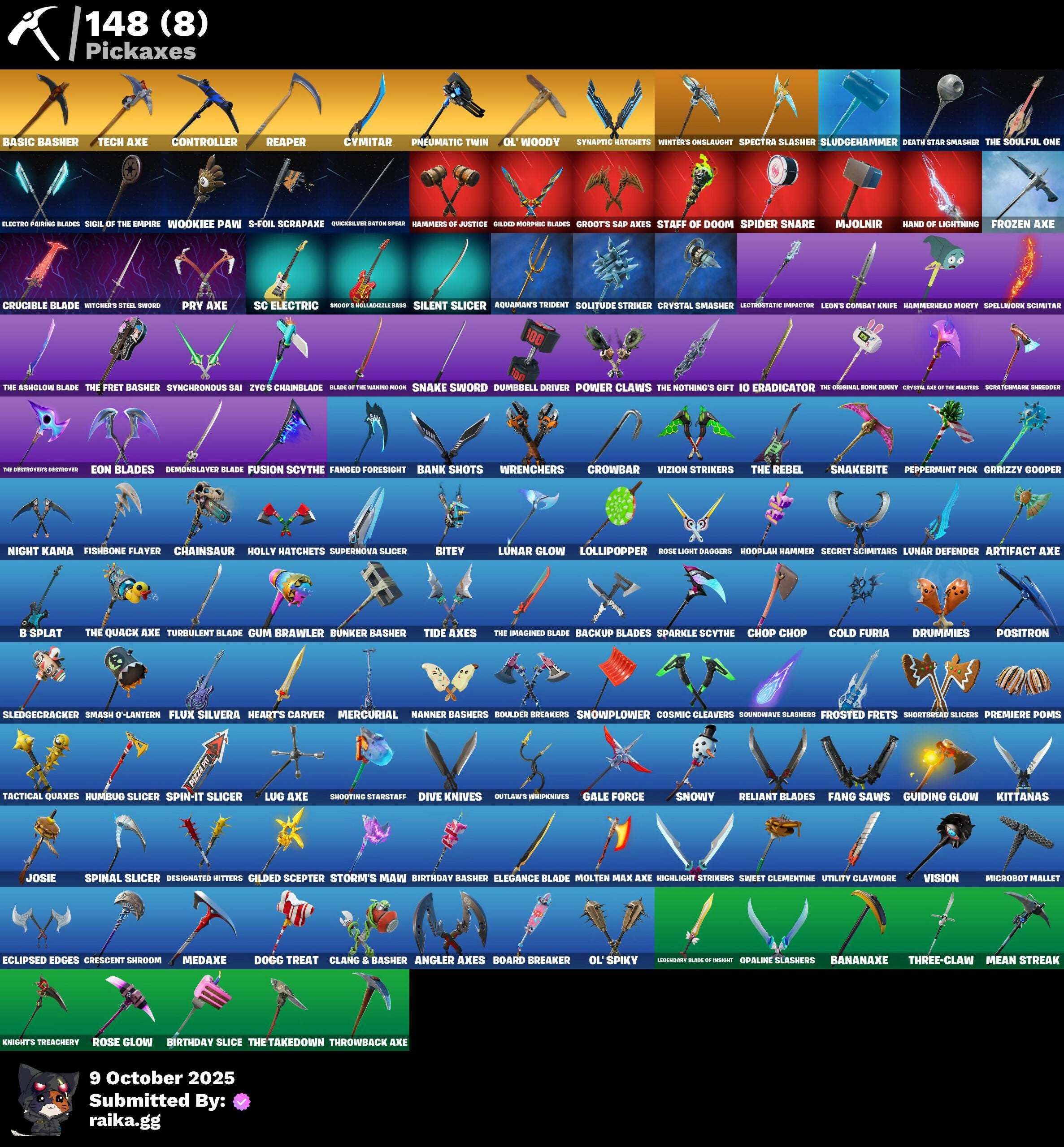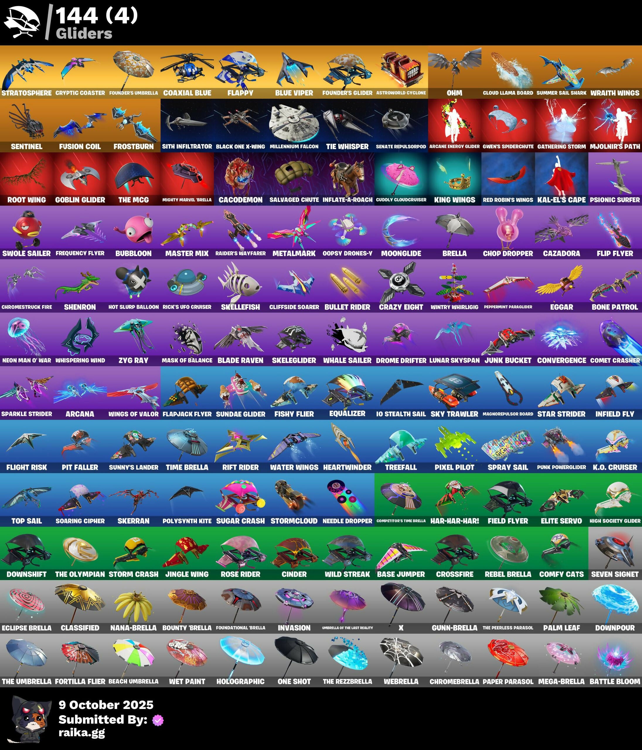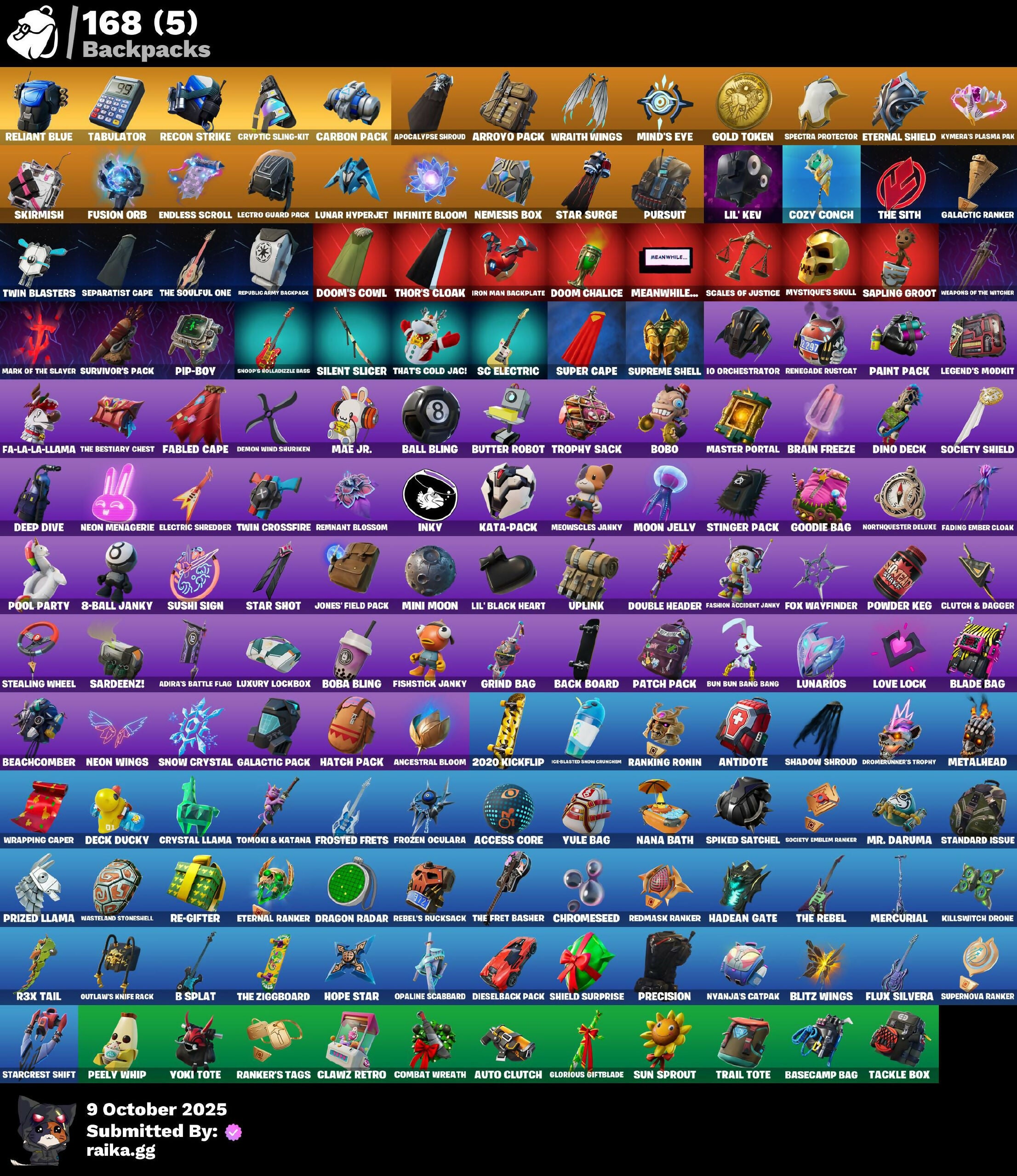 2020 Kickflip, 8-Ball Janky, 8-Ball vs Scratch, Access Core, Adira's Battle Flag, Agent Jones, Air Shredder, Ancestral Bloom, Angler Axes, Antidote, Antonia, Apocalypse Shroud, Aquaman, Aquaman's Trident, Arachrobatics, Arcana, Arcane Energy Glider, Arctic Adeline, Arroyo Pack, Artifact Axe, Astroworld Cyclone, Aura, Auto Clutch, B Splat, Back Board, Backup Blades, Balance Board, Ball Bling, Bananaxe, Bank Shots, Base Jumper, Basecamp Bag, Basic Basher, Bat Signal, Battle Bloom, Battlehawk, Beach Umbrella, Beachcomber, Bean Bag, Beep Beep, Billy Bounce, Bim Bam Boom, Birthday Basher, Birthday Slice, Bitey, Black One X-Wing, Blade Bag, Blade Of The Waning Moon, Blade Raven, Blitz Wings, Blowing Bubbles, Blue Viper, Board Breaker, Boba Bling, Bobo, Boing!, Bone Patrol, Boogie Down, Boosting Ki, Boots'N'Cats, Boulder Breakers, Bounty 'Brella, Brain Freeze, Breaking Point, Breakneck, Brella, Bubbloon, Build Up, Bullet Rider, Bun Bun Bang Bang, Bunker Basher, Business Hips, Butter Robot, Bytes, Cacodemon, Call Me, Cameo vs Chic, Carbide, Carbon Commando, Carbon Pack, Cardistry, Catalyst, Cazadora, Chainsaur, Charging Up, Charlotte, Choice Knit, Chop Chop, Chop Dropper, Chrome Punk, Chromebrella, Chromeseed, Chromestruck Fire, Cinder, Clang & Basher, Classified, Clawz Retro, Clean Sweep, Cliffside Soarer, Clinical Crosser, Cloud Llama Board, Cluck, Clutch & Dagger, Coaxial Blue, Cold Furia, Combat Wreath, Comet Crasher, Comfy Cats, Competitor's Time Brella, Controller, Convergence, Cosmic Cleavers, Count It!, Cozy Conch, Crack It, Crazy Boy, Crazy Eight, Crescent Shroom, Crossfire, Crowbar, Crowning Achievement, Crucible Blade, Cryptic Coaster, Cryptic Sling-Kit, Crystal, Crystal Axe Of The Masters, Crystal Llama, Crystal Smasher, Cuddly Cloudcruiser, Curling Iron, Cyclo Curl, Cymitar, Dabstand, Dagger Dance, Death Star Smasher, Deck Ducky, Deep Dive, Demon Wind Shuriken, Demonslayer Blade, Designated Hitters, Dice Roll, Dieselback Pack, Dino Deck, Dirtbike Challenge, Dive Knives, Do The Split, Doctor Doom, Doctor Slone, Dogg Treat, Doom Chalice, Doom Slayer, Doom's Cowl, Double Header, Downpour, Downshift, Doze Dab, Dragon Radar, Drome Drifter, Drome Runner's Trophy, Droop, Drummies, Dumbbell Driver, Dusty, Eclipse Brella, Eclipsed Edges, Eggar, Electric Shredder, Electro Pairing Blades, Electro Swing, Elegance Blade, Elite Servo, Endless Scroll, Eon Blades, Equalizer, Eternal Knight, Eternal Ranker, Eternal Shield, Eternal Voyager, Evasive Maneuvers, Fa-La-La-Llama, Fabled Cape, Fade, Fading Ember Cloak, Fang Saws, Fanged Foresight, Fashion Accident Janky, Featherweight, Field Flyer, Fish Thicc, Fishbone Flayer, Fishstick Janky, Fishy Flier, Fist Bump, Flaky Feast, Flapjack Flyer, Flappy, Flashback Breakdown, Flight Risk, Flip Flyer, Flippin' Away, Flux Silvera, Foil Flex, Fortilla Flier, Foundational Brella, Founder's Glider, Founder's Umbrella, Fox Wayfinder, Frequency Flyer, Frostburn, Frosted Frets, Frozen Axe, Frozen Oculiara, Full Tilt, Fusion, Fusion Coil, Fusion Orb, Fusion Scythe, GGWP, Galactic Ranker, Gale Force, Gathering Storm, Gentleman's Dab, Geralt of Rivia, Get Griddy, Gilded Morphic Blades, Gilded Scepter, Glorious Giftblade, Goblin Glider, Gold Token, Golf Clap, Good Game, Well Played, Good Guy, Goodie Bag, Grind Bag, Groot, Groot's Sap Axes, Ground Pound, Grriz, Grrrizzy Gooper, Guggimon, Guiding Glow, Gum Brawler, Gunn-Brella, Gwen's Spiderchute, Hadean Gate, Hammerhead Morty, Hammers Of Justice, Hand Of Lightning, Hand-Forged, Har-Har-Har!, Hatch Pack, Have A Seat, Heart's Carver, Heartwinder, Hello Friend, High Five, High Society Glider, Highlight Strikers, Holiday Boxy, Holly Hatchets, Holographic, Hooplah Hammer, Hope Star, Hot Marat, Hot Slurp Balloon, Hot Stuff, Hula Hoopin', Humbug Slicer, Hypnot-Eyes, I Declare!, IO Eradicator, IO Orchestrator, IO Stealth Sail, Ice-Blasted Snow Crunchrum, Igni Sign, Imperial March, In Da Party, Infield Fly, Infinite Bloom, Inflate-A-Roach, Inkv, Introducing..., Invasion, Iridia Vayne, Iron Man Backplate, It Is Finished, It's... You?, Jabba Switchway, Jackie, Jaywalking, Jennifer Walters, Jet Signals, Jingle Wing, Joey, Jones' Field Pack, Josie, Journey vs Hazard, Jules, Junk Bucket, K.O. Cruiser, Kado Thorne, Kal-El's Cape, Kata-Pack, Keyed Up, Khaby Lame, Kick Back, Killswitch Drone, King Wings, Kit, Kittanas, Knight's Treachery, Krisabelle, Kymera, Kymera's Plasma Pak, Lara Croft, Laser Focused, Lectro Guard Pack, Lectrostatic Impactor, Legend's Modkit, Legendary Blade Of Insight, Lennox Rose, Leon's Combat Knife, Lil Split, Lil' Black Heart, Lil' Kev, Lil' Longboat, Lil' Podracer, Lil' Prancer, Lil' Saucer, Lollipopper, Love It!, Love Lock, Lt. Evergreen, Lug Axe, Lunar Defender, Lunar Glow, Lunar Hyperjet, Lunar Party, Lunar Skyspan, Lunarios, Luxury Lockbox, Mae, Mae Jr., MagNorepulsor Board, Make A Seat, Mariana, Mark of the Slayer, Mask Of Balance, Massai, Master Mix, Master Portal, Mean Streak, Meanwhile..., Medaxe, Mega-Brella, Meow Skulls, Meowscles Janky, Mercurial, Metalhead, Metalmark, Microbot Mallet, Mighty Marvel 'Brella, Millennium Falcon, Mind Blown, Mind's Eye, Mini Dogfight, Mini Moon, Mini Slayer Fistbump, Mjolnir, Mjolnir's Path, Molten Max Axe, Moon Jelly, Moonglide, Mr. Daruma, Mystique, Mystique's Skull, Nana Bath, Nana-Brella, Nanner Bashers, Needle Dropper, Nemesis Box, Neo's Bullet Time, Neon Man O' War, Neon Menagerie, Neon Wings, Nezumi, Night Kama, Ninja Style, No Sweat, Nolan Chance, Northquester Deluxe, Nyanja's Catpak, Ocean, Ohm, Ol' Spiky, Ol' Woody, Omegarok, Omg I Love It, One Shot, Oopsy Drones-V, Opaline Scabbard, Opaline Slashers, Orange Justice, Origami Battalion, Outlaw's Knife Rack, Outlaw's Whipknives, Paint Pack, Palm Leaf, Paper Parasol, Paradigm (Reality-689), Party Hips, Patch Pack, Peely Whip, Peppermint Paraglider, Peppermint Pick, Pip-Boy, Piper Pace, Pirouette, Pit Faller, Pitcycle, Pixel Pilot, Planetary Vibe, Pneumatic Twin, Point & Shoot, Point Patroller, Polar Peely, Polysy