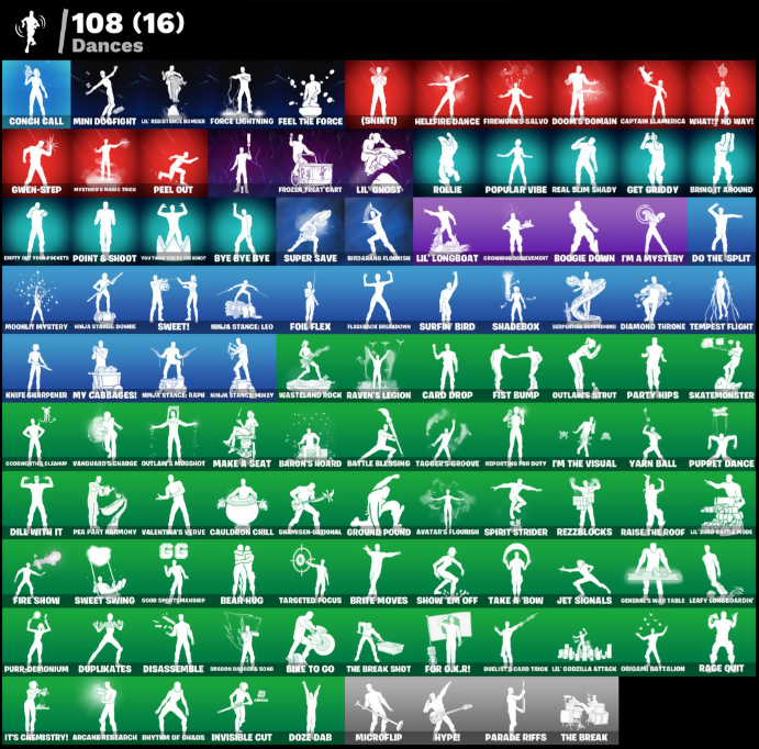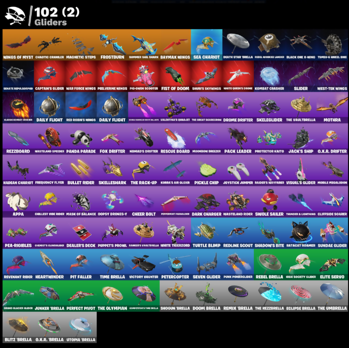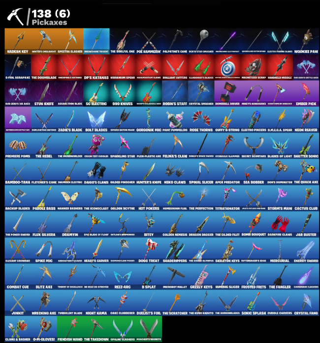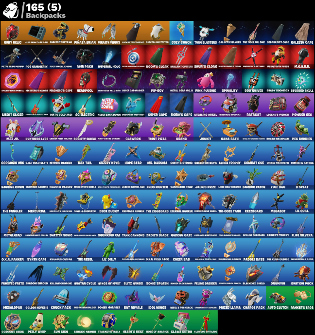 1-Ball, 4300s Shadows’ Edge, 999 Knives, 9C Electric, AWR Pack, Agent Patch, Alpha Trophy, Apex Predator, Aphrodite, Apocalypse Shroud, Appa, Apprentice Evie, Arcane Research, Arrowpoint Carver, Artemis, Assaulttron Blade, Auto Clutch, Avatar Cycle, Avatar's Flourish, Axe's Outlawing Handle, B Splat, B-Rzzz GB-Stroyer, B-Splat, Backup Blades, Bamboo Patch, Bamboo-Tana, Baron's Hoard, Bat Royale, Battle Blessing, Battle Gamer Mac, Baymax Wings, Bear Hug, Big Dill, Birdaring Flourish, Bite To Go, Bitey, Black One X-Wing, Blackened Shield, Blacksmith Hulk Emerald, Blades Of Light, Blitz 'Brella, Blitz Axe, Blitz Wings, Bolt Blades, Bomb Bouquet, Boo Radley, Boogie Down, Breaksword Trident, Brilliant Cutters, Brilliant Guitars, Bring It Around, Brite Moves, Brite Raider, Bug Punk Sunny, Bullet Rider, Bullet's Card Trick, Bumble Ranker, Bye Bye Bye, Cactus Club, Cake Clobberer, Captain America's Shield, Captain Blamerica, Captain Jones, Captain's Glider, Carbon Fiber Roller, Card Drop, Cassidy Quinn, Cauldron Chill, Centipede’s Katana, Cerberus, Chaos Director, Chaotic Crawler, Charge Pack, Cheer Bao, Cheer Bolt, Chemist's Cloudglider, Chillest Vibe Rider, Chuck Pack, Chun-Li, Clang & Basher, Classed Bouncer Beta, Clawbox, Clawz Retro, Cliffside Soarer, Clip Show Carry-All, Cobalt Test Coupe, Combat Cue, Competitor's Time Brella, Conch Call, Cosworth Cleaned, Cozy Conch, Crash Test Double, Crossbones Bat Wings, Crystal Fang, Crystal Smasher, Cuddle Carvers, Cursed Marionette, DP's Katanas, Daigo, Daigo's Claws, Daily Flight, Dark Charger, Darkfire Claws, Deadpool (P&L Skin), Dealer's Deck, Death Star 'Brella, Death Star Smasher, Deck Ducky, Diamond Throne, Diamondclaw Picker, Dilly With It, Dino Megazord, Disassemble, Division Officers Salvo, Do The Split, Dogc Treat, Don's Dominator, Doom, Doom Brella, Doom's Domain, Doom’s Cloak, Doze-Dab, Dragon Dagger, Dramvin, Dramyin, Dreamers Two-Gun, Drome Drifter, Duelist's Foil, Dumbbell Driver, Dupli-Kate, Duplicated Batons, Duplicates, Dusk Knight, Dynamo Tntina, Eclipse Brella, Electro Fang's Claws, Electro-Pincers, Elegant Crowbar, Elite Servo, Ember Pick, Emma Frost, Emperor Palpatine, Energy Sword, Epic Blade Of Floof, Eternal Ranker, FNCS Fighter, Feel The Force, Felina, Felina's Claw, Feline Dagger, Fiendish Wand, Fire Show, Fireworks Salvo, Fist Bump, Fist Of Doom, Flashback Breakdown, Fletcher Kane, Fletcher's Cane, Flux Silvera, Focus, Foil Flex, For O.M.R.!, Force Lightning, Fox Drifter, Frequency Flyer, Fron Elements Badge, Frostburn, Frosted Frets, Frozen Treat Cart, Galactic Planner, General Grievous, Generals WIP Table, Get Griddy, Gilded Pinscher, Glorious Giftblade, Godzilla Evolved, Golden Gauntlet Gold Rider Wings, Golden Nemesis, Golden Scythe, Good Sportsmanship, Gorgonik Aegis, Gorgonik Mic, Gouzella’s DCO-4 Rifle, Grand Glacier Glider, Green Ranger, Grizzly Keys, Ground Pound, Guffy G-String, Gwen-Step, Gwenpool, Hadean Chariot, Hadean Gate, Hadean Key, Hades, Handheld Missile, Haylee Skye, Headpool, Heart's Carver, Heartwinder, Heart’s Rest, Hellfiredance, Hero Baymax, High Society Glider, Holiday Boxy, Homegrown Flail, Hope, Hope Star, Hordes Ride Wolf, Hot Pokers, Humbug Slicer, Hunter's Knife, Huntress Lyre, Hydraulic Slammer, Hype!, I'm A Mystery, I'm The Visual, Idol Wings, Ignition Pack, Illusionist's Blades, Imperial Holo, Invisible Cut, Iridia Vayne, It's Chemistry!, Jack's Ship, Jack’s Prize, Jade, Jar Buster, Jet Signals, Joltara, Joss, Joystick Jumper, Juice Wrld, Junker 'Brella, Junkit, Junkt, Kaleesh Cape, Keisha Cross, Kendo, Killjoy’s Portal, Killswitch, Killswitch Drone, Klassiq Kombat Crasher, Knife Sharpener, Kombat Crasher, Korra, Korra's Air Glider, Krang, Leafy Longboardin', Legend’s Modkit, Lightrider, Lil Quill, Lil Split, Lil' Ghost, Lil' Godzilla Attack, Lil' Longboat, Lil' Robo Beta Mode, Lil’ Dilly, Lore Wolf Master, Lt. Ripp Slade, M.O.A.B.B., Mae Jr., Magnetic Steps, Magnetized Scrap, Magneto, Magneto’s Cape, Make A Seat, Mask Of Balance, Medusa, Megabot, Megalo Don, Megalopak, Meowdas, Mercurial, Metal Gear Mk. II, Metal Team Message, Metalhead, Mezatootie Pulse, Michelangelo, Microbot Mallet, Microhowl Electronics, Micropilf, Mikey’s Boom & Chucks, Mini Dogfight, Mobile Megalodon, Montague, Moonbow Breezer, Moonlit Mystery, Morgan Myst, Mothra, Mr. Daruma, My Cabbages!, Mysterio, Mysterio’s Cloak, Nana Bath, Nanakumatun Claws, Nanner Bashers, Neko Claws, Neon Reaver, Never Back Down, Nick Eh 30, Night Kama, Nisha, Nitro Ranker, Nomad's Drifter, Nyanja, Nyanjas Catpaw, O-M-Gloves!, O.X.R Holo-Slate, O.X.R. Brella, O.X.R. Drifter, O.X.R. Field Pack, O.X.R. Ranker, Omega Spear, Omegarok, Onyx Winter, Oopsy Drones-V, Opaline Scabbard, Opaline Slashers, Original Battalion, Oscar, Outlaw Midas, Outlaw's Modshot, Outlaw's Strut, Outlaw's Whisperiness, Outlaw’s Knife Rack, Pack Leader, Paddle Bass, Paint Pummeler, Palpatine's Cane, Panda Parade, Parade Riffs, Party Hips, Pea Buddies, Pea Part Harmony, Pea-Rigibles, Peabody, Peel Out, Peelverine, Peelverine Wings, Peely Whip, Peppermint Paraglider, Perfect Pivot, Peter Griffin, Petercopter, Pickle Chip, Pig-owen Scooter, Pinata Brian, Pink Plushie, Pip-Boy, Pit Faller, Plum-Plastic Axe, Pochahri's Regrets, Poe Dameron, Point & Shoot, Pole Hammer'n, Pole Hammerin’, Popular Vibe, Port’s Model X-Wing, Poseidon, Powder Keg, Power Morpher, Premiere Poms, Prized Llama, Protector Kaito, Punk Powerglider, Puppet Dance, Puppet's Prowl, Pure-Demonium, Quick-Cell Ion Blaster, R3X Tail, Rage Quit, Raider's Wayfarer, Raider’s Trophy, Raise The Roof, Ranker's Vaultbrella, Ranker’s Tags, Ranking Ronin, Ratcat, Ratcat Roamer, Raven's Legion, Real Slim Shady, Rebel Brella, Rebel Wookie Lander, Rebels Rucksack, Red Robin's Wings, Redline Scout, Redmask Ranker, Remix 'Brella, Renegade Lynx, Renegade Raider, Renegade Rustcat, Reporting For Duty, Rescue Board, Revenant Rider, Rezz-Arc, Rezzblocks, Rezzboard, Rhythm Of Chaos, Riftbreaker's E