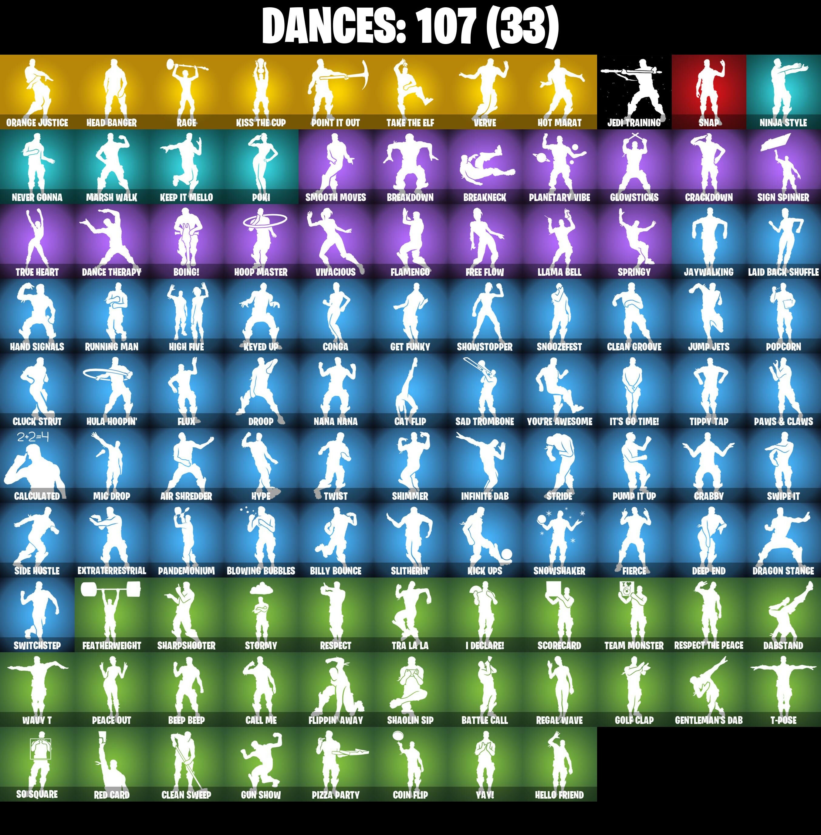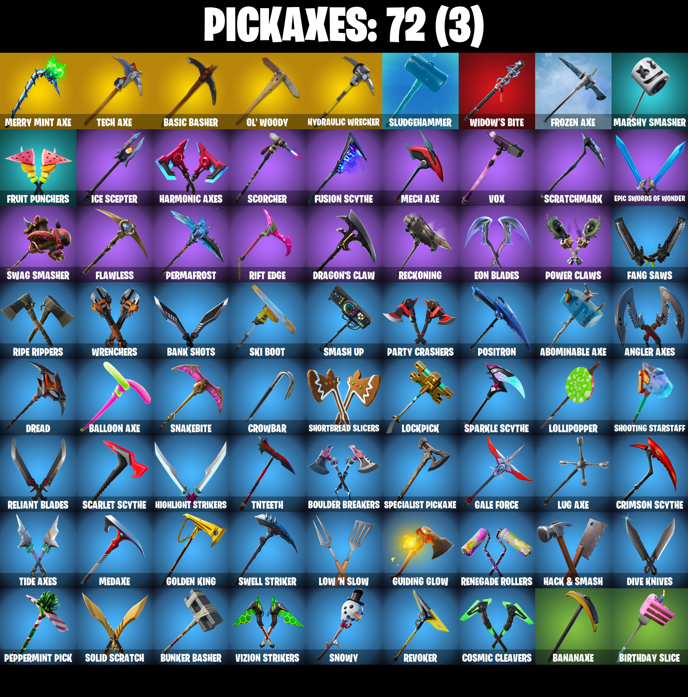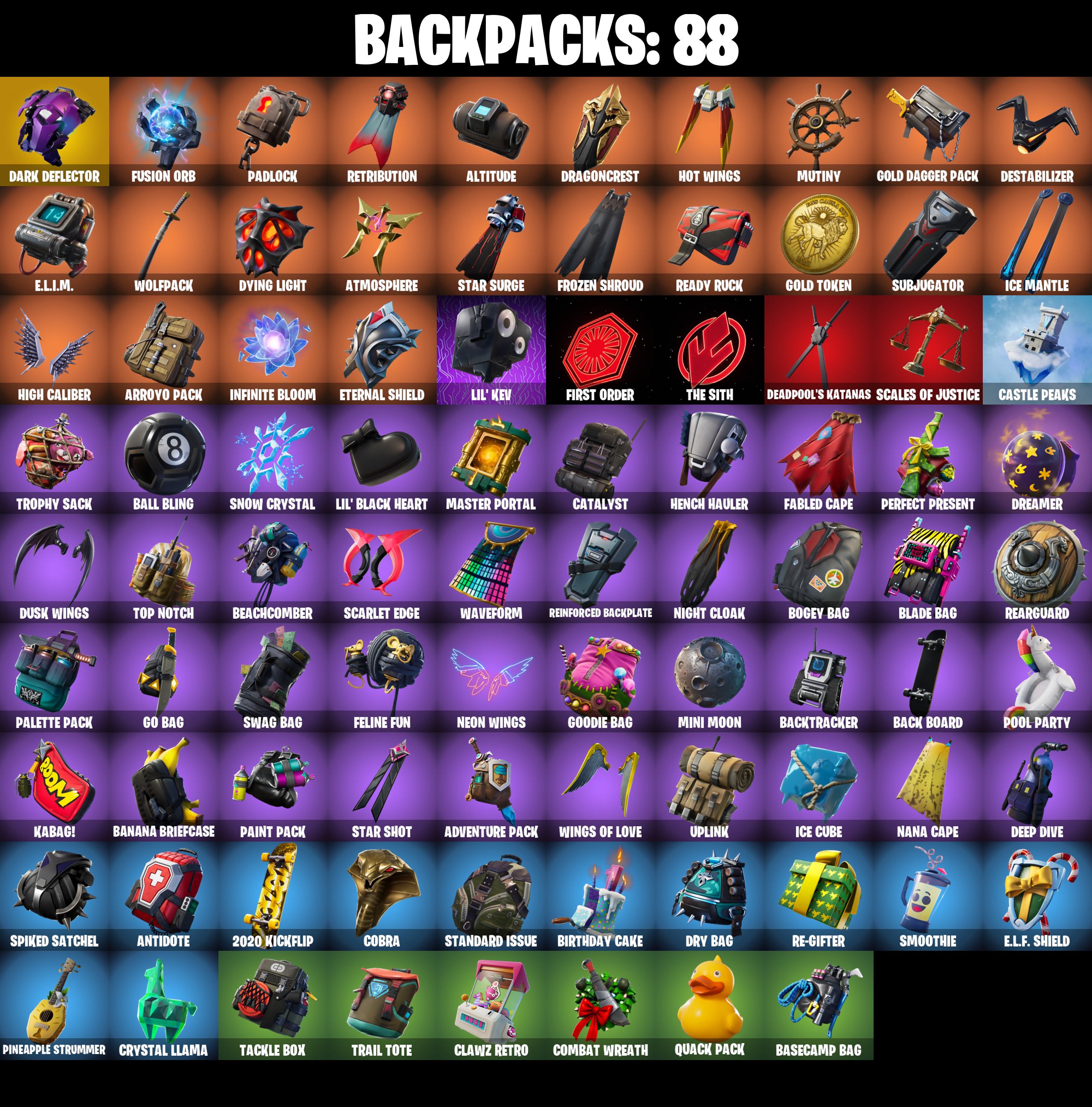 2020, 2020 Kickflip, 4-Keyed Up, 8-Ball Vs Scratch, A.I.M., Abominable Axe, Adventure Pack, Agent Peely, Air Shredder, Altitude, Angler Axes, Antidote, Arroyo Pack, Astroworld Cyclone, Atmosphere, Avengers Quinjet, Back Board, Backtracker, Ball Bling, Balloon Axe, Banana Bomber, Banana Briefcase, Bananaxe, Bank Shots, Base Jumper, Basecamp Bag, Basic Basher, Battle Call, Battlehawk, Beach Umbrella, Beachcomber, Beep Beep, Big Haul, Billy Bounce, Birthday Cake, Birthday Slice, Black Werewolf, Blackheart, Blackheart (Stage 8), Blade Bag, Blade Raven, Blowing Bubbles, Bogey Bag, Boing!, Bombs Away!, Booty Buoy, Boulder Breakers, Breakdown, Breakneck, Brella, Brutus, Bullseye, Bunker Basher, Bunker Jonesy, Calamity, Calamity Stage 5, Calculated, Call Me, Cameo Vs Chic, Carbide, Castle Peaks, Cat Flip, Catalyst, Catalyst (Overcharged), Cinder, Classified, Clawz Retro, Clean Groove, Clean Sweep, Cluck Strut, Cobalt, Cobra, Codename E.L.F., Coin Flip, Combat Wreath, Comet Crasher, Conga, Conquest, Convergence, Cosmic Cleavers, Covered Crusader, Crabby, Crackdown, Crazy Eight, Crimson Scythe, Crossfire, Crowbar, Cruiser, Crystal Llama, Dabstand, Dance Therapy, Dark Deflector, Dark Engine, Dark Vertex, Deadpool, Deadpool Unmasked, Deadpool's Katanas, Deep Dive, Deep End, Demi, Destabilizer, Dire, Dive Knives, Dj Yonder, Downpour, Downshift, Dragon Stance, Dragon's Claw, Dragoncrest, Dread, Dreamer, Drift, Drift Stage 5, Droop, Dry Bag, Dusk, Dusk Wings, Dying Light, E.L.F. Shield, E.L.I.M., Ember, Enforcer, Eon Blades, Epic Swords Of Wonder, Equalizer, Eternal Knight, Eternal Shield, Eternal Voyager, Extraterrestrial, Fable, Fabled Cape, Fade, Fang Saws, Featherweight, Feline Fun, Field Flyer, Fierce, First Order, Fishy Flier, Flamenco, Flawless, Flippin' Away, Flux, Fortilla Flier, Free Flow, Frozen Axe, Frozen Fishstick, Frozen Nog Ops, Frozen Shroud, Fruit Punchers, Fusion, Fusion Coil, Fusion Orb, Fusion Scythe, Gale Force, Gear Specialist Maya, Gentleman's Dab, Get Funky, Giddy-Up, Glidurr, Glow, Glowsticks, Go Bag, Gold Dagger Pack, Gold Midas, Gold Token, Golden King, Golf Clap, Goodie Bag, Guiding Glow, Gun Show, Hack & Smash, Hand Signals, Harmonic Axes, Hazard, Head Banger, Hello Friend, Hench Hauler, High Caliber, High Five, Highlight Strikers, Holographic, Hoop Master, Hot Marat, Hot Wings, Hula Hoopin', Huntress, Hybrid, Hybrid (Stage 4), Hydraulic Wrecker, Hype, I Declare!, Ice Cube, Ice King (Gold), Ice Mantle, Ice Scepter, Inferno, Infinite Bloom, Infinite Dab, It's Go Time!, Jaywalking, Jedi Training, Journey Vs Hazard, Jules, Jump Jets, Junk Bucket, Kabag!, Keep It Mello, Kick Ups, Kiss The Cup, Kit, Laguna, Laid Back Shuffle, Lil' Black Heart, Lil' Kev, Llama Bell, Llamacorn Express, Lockpick, Lockstep, Lollipopper, Low 'N Slow, Lt. Evergreen, Lug Axe, Luxe, Luxe (Gold Clothing), Lynx, Lynx (Stage 4 - No Ponytail), Marsh Walk, Marshmello, Marshy Smasher, Masked, Master Key, Master Key (Masked), Master Mix, Master Portal, Mech Axe, Medaxe, Mello Rider, Meowscles, Merry Mint Axe, Metalmark, Mic Drop, Mighty Marvel 'Brella, Millennium Falcon, Mini Moon, Mutiny, Nana Cape, Nana Nana, Neon Wings, Never Gonna, Night Cloak, Nightshade, Ninja Style, Nite Flight, Oblivion, Ocean, Ohm, Ol' Woody, Ollie, One Shot, Onesie, Onesie (Winter), Orange Justice, Padlock, Paint Pack, Palette Pack, Palm Leaf, Pandemonium, Party Crashers, Paws & Claws, Peace Out, Peely, Peppermint Pick, Perfect Present, Permafrost, Picnic, Pineapple Strummer, Pixel Pilot, Pizza Party, Planetary Vibe, Plunder, Point It Out, Poki, Pool Party, Popcorn, Positron, Powder, Powder (White), Power Claws, Pump It Up, Quack Pack, Rage, Ragnarok, Ragnarok (No Shoulder Pad), Re-Gifter, Ready Ruck, Rearguard, Reckoning, Red Card, Redline, Regal Wave, Reinforced Backplate, Reliant Blades, Remedy (Purple), Remedy Vs Toxin, Renegade Rollers, Respect, Respect The Peace, Retaliator, Retribution, Revoker, Rickety Runner, Rift Edge, Rift Rider, Ripe Rippers, Rippley Vs Sludge, Riptide, Rogue Agent, Rook, Rox, Rox (Stage 5), Royale Air, Ruin, Running Man, Sad Trombone, Scales of Justice, Scarlet Edge, Scarlet Scythe, Scarlet Strike, Scorcher, Scorecard, Scratch (Virus), Scratchmark, Scuba Jonesy, Sentinel, Sentinel (Dark), Sgt. Green Clover, Sgt. Winter, Sgt. Winter Headgear, Shaolin Sip, Sharpshooter, Shimmer, Shooting Starstaff, Shortbread Slicers, Showstopper, Side Hustle, Sidewinder, Sidewinder (Dark), Sign Spinner, Singularity, Singularity (Stage 3), Siona, Skellefish, Ski Boot, Sky Serpents, Sky Trawler, Skye, Sledgehammer, Slitherin', Sludgehammer, Slumber, Smash Up, Smooth Moves, Smoothie, Snakebite, Snap, Snoozefest, Snow Crystal, Snowfall, Snowshaker, Snowy, So Square, Solid Scratch, Sorana, Sparkle Scythe, Sparkle Supreme, Sparkle Supreme (Bob Cut), Specialist Pickaxe, Spiked Satchel, Splashdown, Spray Sail, Springy, Stage 4, Standard Issue, Star Shot, Star Strider, Star Surge, Steelwing, Stoneheart, Storm Sail, Stormy, Stratus, Stratus (Red), Stride, Subjugator, Sugar Crash, Summit Striker, Sun Strider, Swag Bag, Swag Smasher, Swarm, Swell Striker, Swipe It, Switchstep, T-Pose, Tackle Box, Tactical Sleigh, Tailwind Twister, Take The Elf, Team Monster, Tech Axe, Teknique, The Ace, The Brat, The Devourer, The Ice King, The McG, The Prisoner, The Scientist, The Sith, The Umbrella, Tide Axes, Tie Whisper, Tilted Teknique, Tilted Teknique (Hoodie), Tippy Tap, Tnteeth, Tntina, Top Notch, Top Sail, Tra La La, Trail Tote, Treefall, Trog, Trog (Tribal), Trophy Sack, True Heart, Turbo Spin, Turk Vs Riptide, Twist, Ultima Knight, Uplink, Vega, Vega (Teal), Vendetta, Vendetta (Stage 6), Verve, Vivacious, Vizion Strikers, Vox, Water Wings, Wavebreaker, Waveform, Wavy T, Webrella, Wet Paint, Whiplash, Widow's Bite, Wild Blast, Wilde, Wingman, Wings Of Valor, Wings of Love, Winter's Thorn, Wolfpack, Wooly Warrior, Wrenchers, X, X-Lord, X-Lord (Scavenger), Xev, Y0nd3r, Yay!, Yee-Haw!, Yond3r (Crown), You're Awesome, Zenith, Zenith (Stage 4),